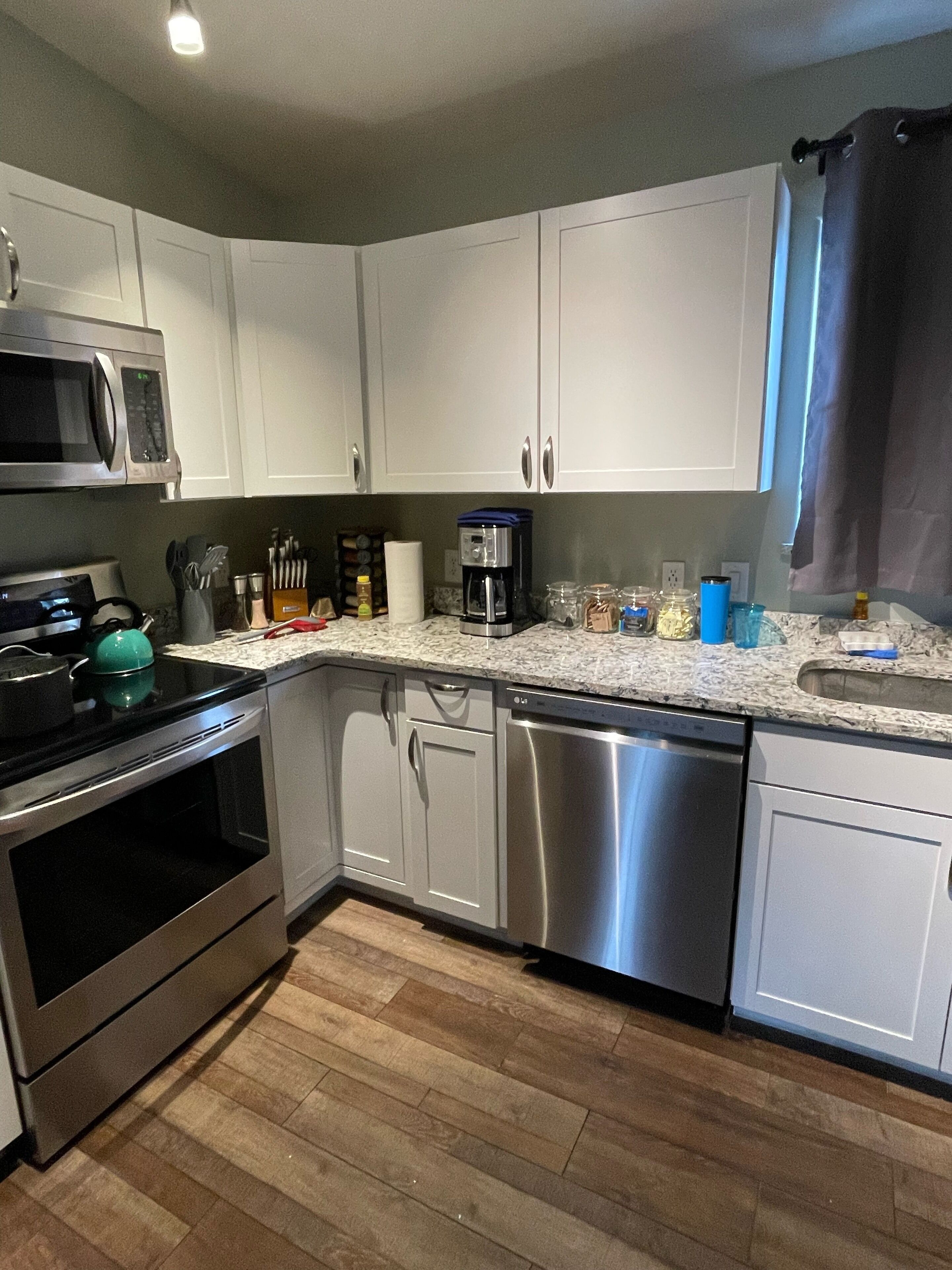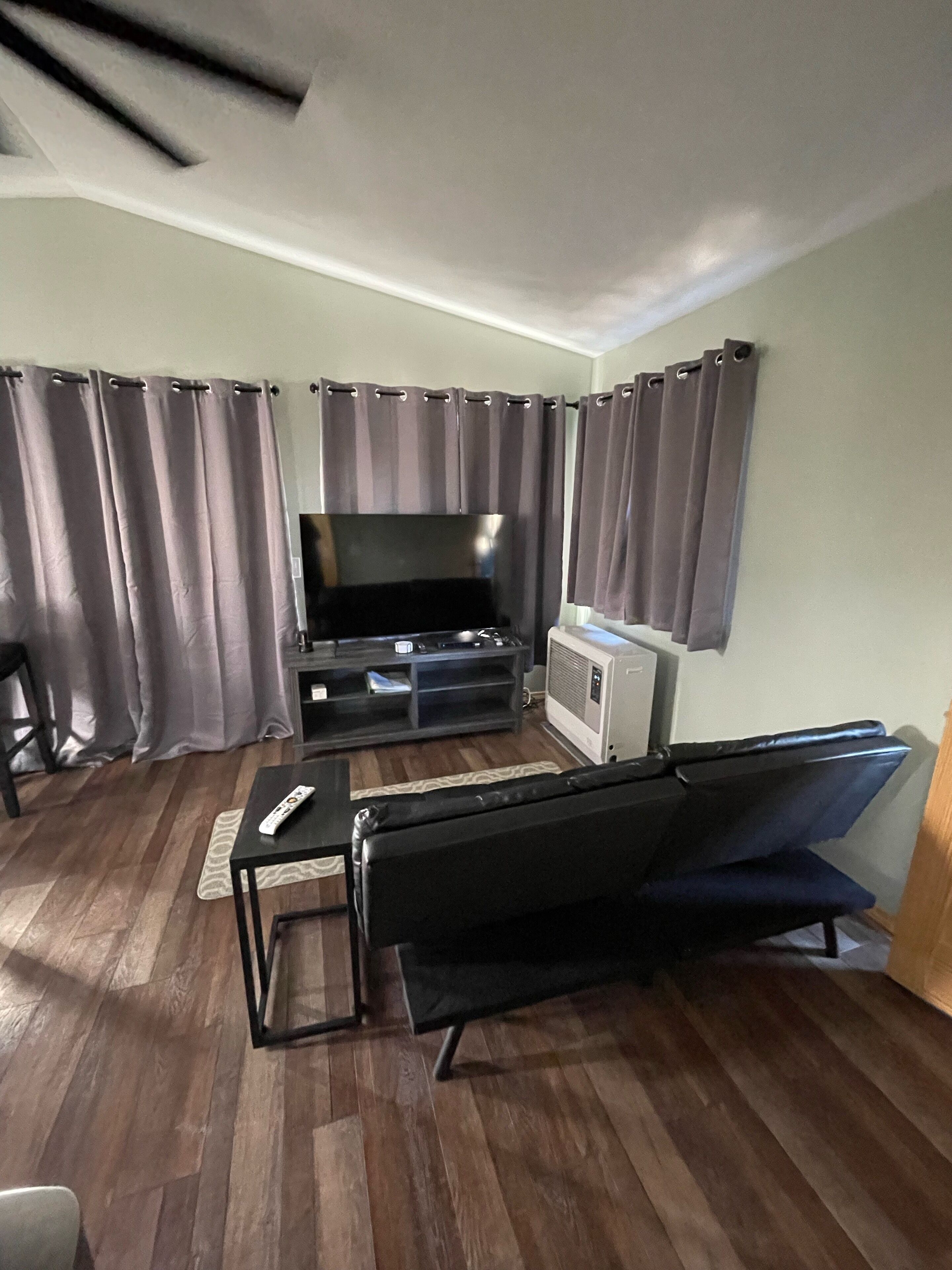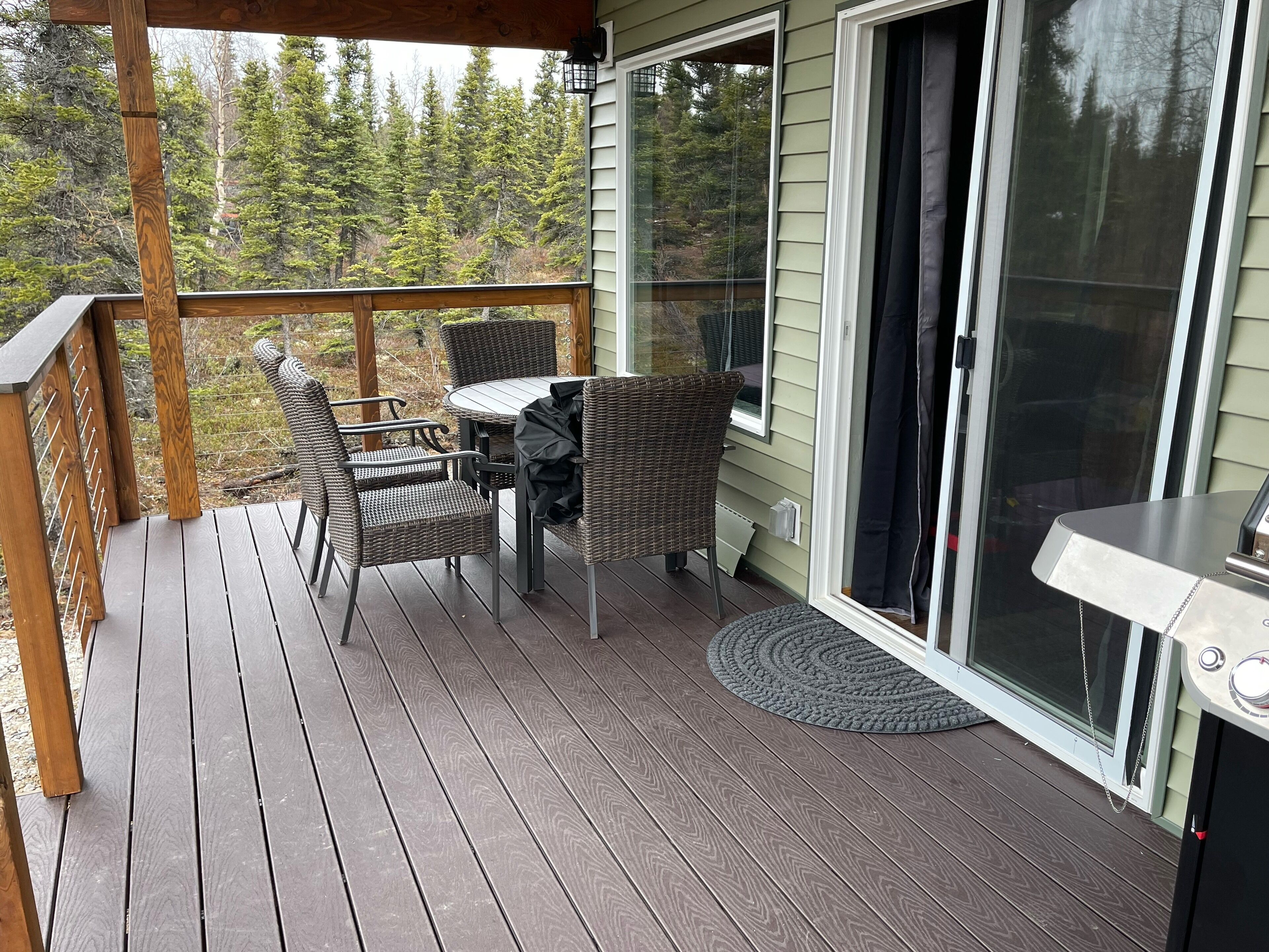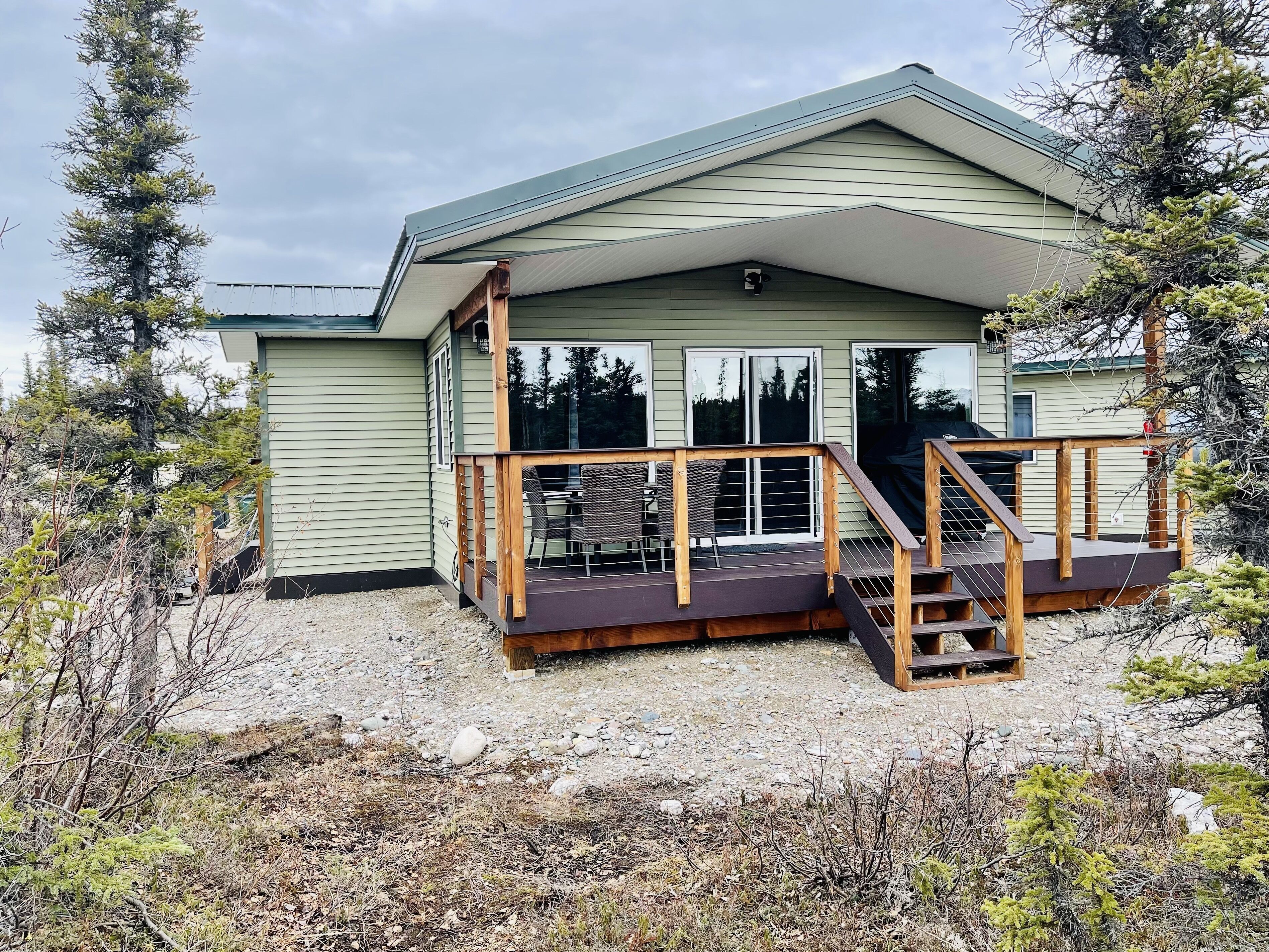 " The Cottage at Dry Creek" #2 Located 14 miles north of the visitor center of Denali National Park, this newly built 1 bedrooms, one bath cottage accommodates four people comfortably. The bedroom has queen size bed with a memory foam mattress, quality linens, a nice size closet, dresser and night stands with plenty of USB ports to charge your phones and portable computer devices.The bedroom has a ceiling fan for summer days and thermal black-out curtains for those short summer nights. The bathroom has sink, a tiled walk-in shower and great water pressure. Body wash, shampoo, conditioner, body lotion and a hair dryer are provided for your convenience. Hand and bath towels are provided.The Cottage is equipped with a full size stacked washer and dryer along with laundry detergent and fabric softener for your use. An iron and ironing board are also available in the cottage.The kitchen includes a full size refrigerator with filtered water and ice maker; an electric stove, convection oven and microwave as well as a dishwasher. The counter height table area for 4 and outside seating with 4 chairs & table. The Cottage’s small appliances include a coffee maker, toaster, tea pot, blender, electric hand mixer, waffle maker, rice cooker/steamer and a full complement of pots, pans and baking dishes. You’ll have all the needed cooking utensils to cook a simple meal or a gourmet feast if you choose. The kitchen has a full assortment of everyday spices, condiments in the refrigerator and a variety of sweeteners for your included coffee and tea. Service for 4 of flatware, dishes and glassware will make serving any meal a pleasure. So you can enjoy the wonderful Alaskan outdoors while you’re our guest “The Cottage at Dry Creek” has a spacious covered 20ft by 8ft wide deck equipped with a gas BBQ grill and table & chairs. The hand-railed staircase and deck allows you watch the awe inspiring sunrises and sunsets. From September to March the deck is an excellent viewing area to watch and photograph the Northern Lights. If you feel a chill, you can still enjoy the view from the comfort of the living room looking through the patio door and large picture windows. Moose, lynx, red fox and rabbits can frequently be seen in the surrounding area. The living room has a futon sofa sleeper, end tables with lamps and a 65” High Definition Television. You’ll be able to enjoy watching a variety of specialty television apps as well as satellite television with local Alaskan channels so you can always be informed of the changing weather. With windows throughout the living room, kitchen and dining areas, a large ceiling fan will provide that fresh, open air feeling.For the winter vacationer, when entering the cottage, you’ll pass through an arctic vestibule where you can remove your coats, jackets and shoes. Upon entering you’ll find the cottage is well insulated and equipped with a Toyo heater as well as baseboard electric heaters in the bedrooms and bathroom, if you need a little extra warmth. Outside outlets and extension cords are available for your vehicle in the event a “plug in” is required. The Cottage @ Dry Creek #2 is:500 sq ft of interior space160 sq ft of covered patio One bedroom and one bath Full size fully equipped kitchen Full size washer-dryer Satellite television, Wi-Fi and Internet LTE/4G in the surrounding area Gas Barbeque Grill.The cottage will accommodate 2 adults comfortably. The living room has a futon sleeper sofa. This is a good option for vacationers who don’t mind having the one adult or two small children as additional guests. We have strict no smoking policy and no pet policy in the cottage and on the property.