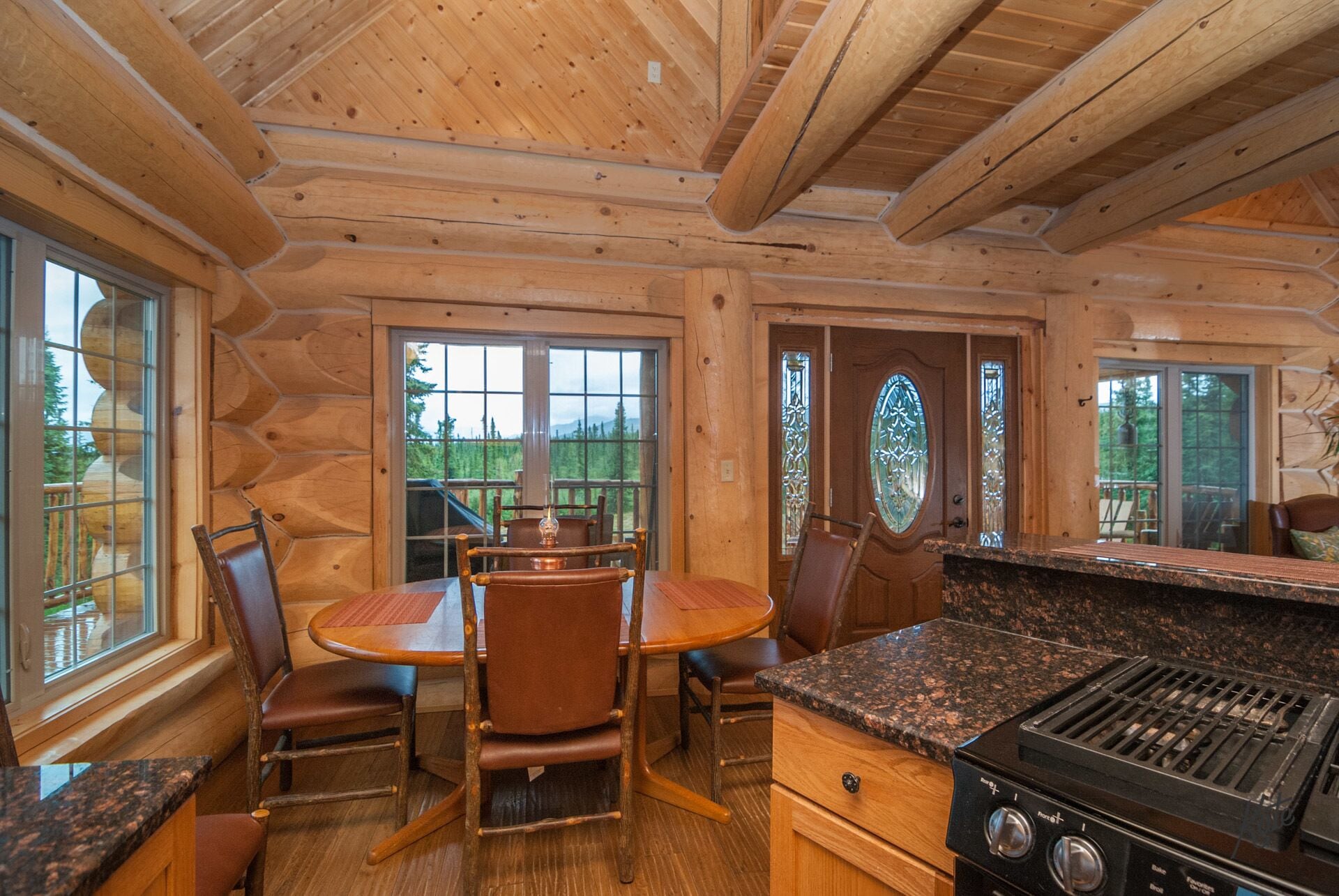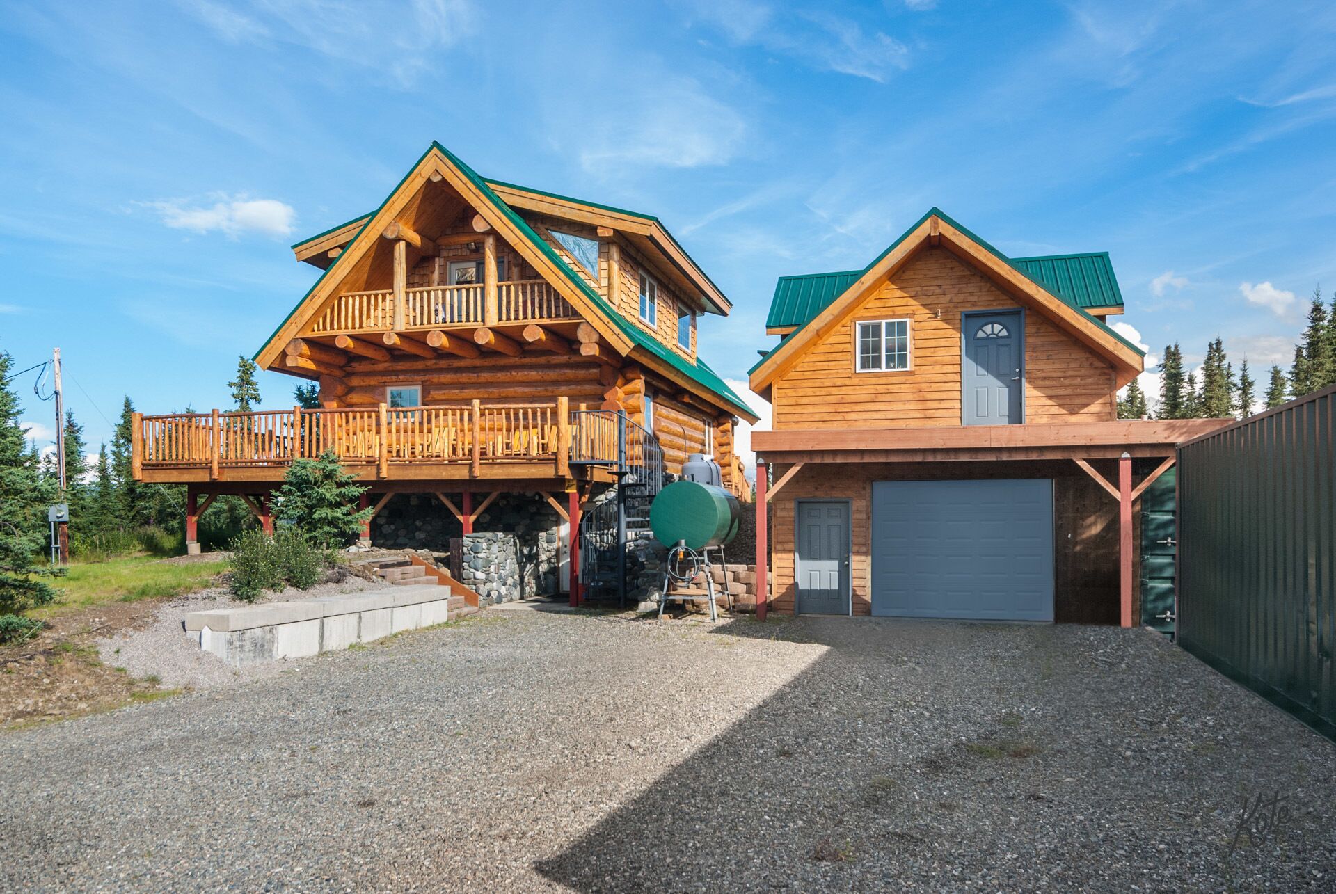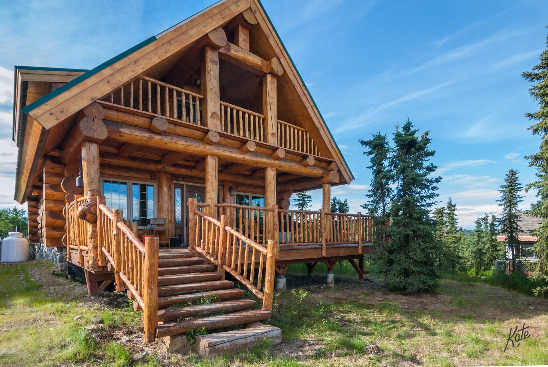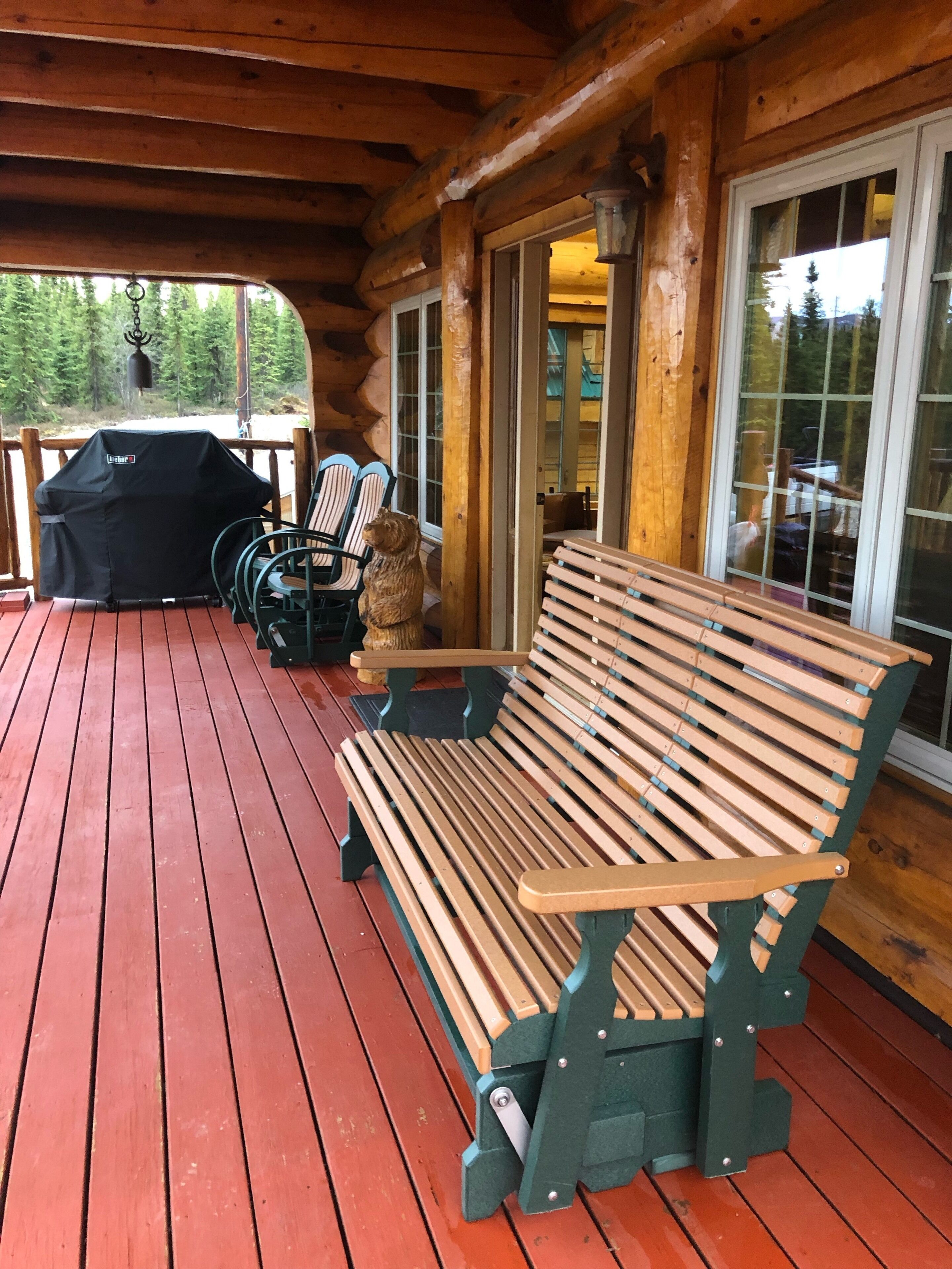 Denali only 17 miles away! Outdoor grill, washer/dryer, jacuzzi tub w/view Experience true Alaska in this amazing 2 bedroom, 2 bath upscale custom built log cabin. It is only a short distance (approximately 17 miles) from Denali National Park. This rental is truly a unique and a special place to enjoy your next vacation getaway. As soon as you drive in you are immediately greeted by the expansive wrap around deck with plenty of Adirondack chairs to take in the amazing view. On the main level you'll find the adjoining living room with a fully equipped kitchen, dining space, cozy bedroom and full bath with stackable up-to-date washer & dryer. Take a short walk upstairs and you’ll enter the open floor plan with spacious office area, charming king bedroom area, walk in closet, private balconies and full bath with separate shower & Jacuzzi tub. The basement is fully furnished and carpeted, with another full living room set, tv entertainment area, two queen sleeper sofas, and kids play area. Your stay will be complete as we provide fresh linens, complimentary coffee, and extensive movie/book selection.