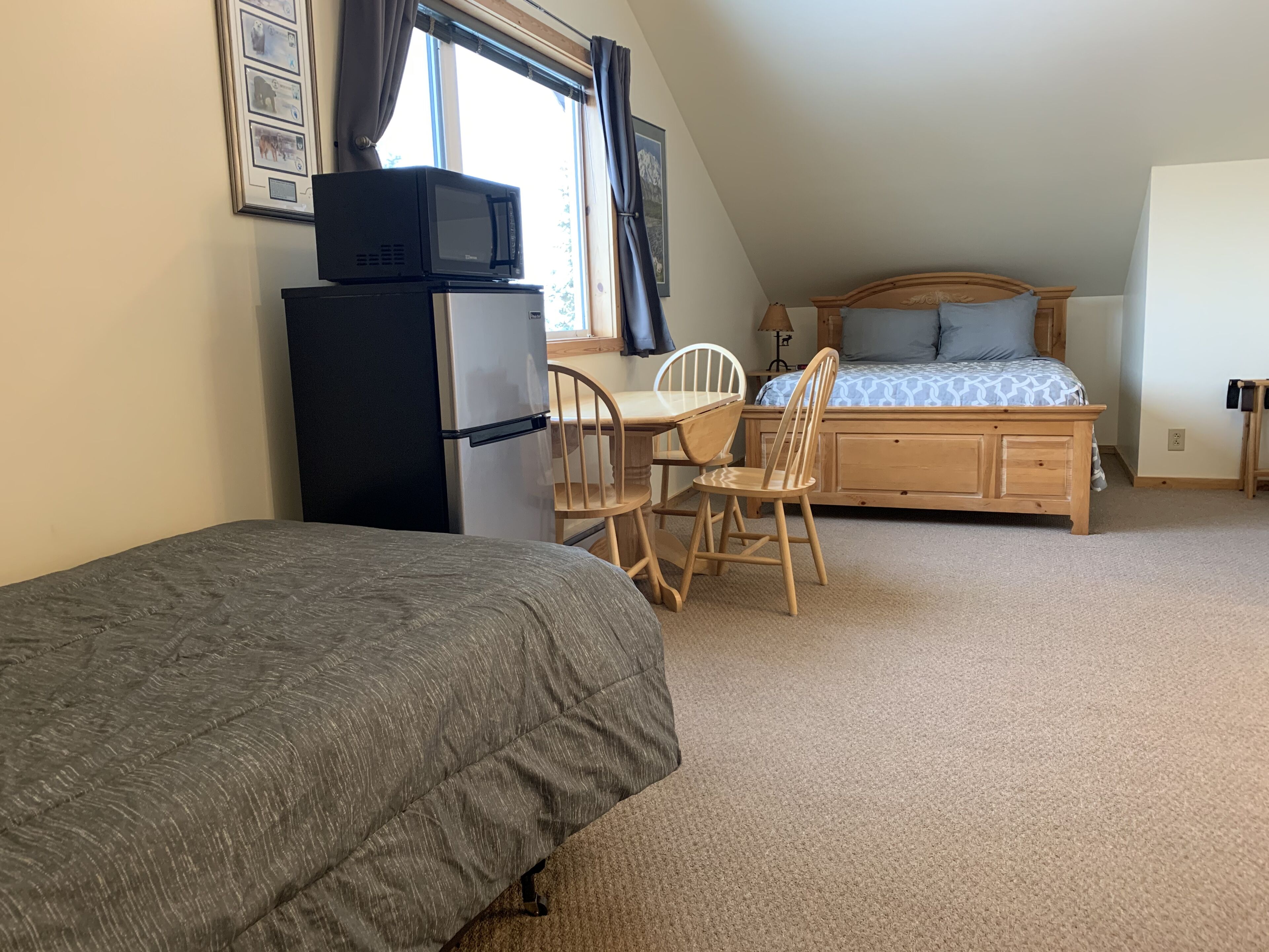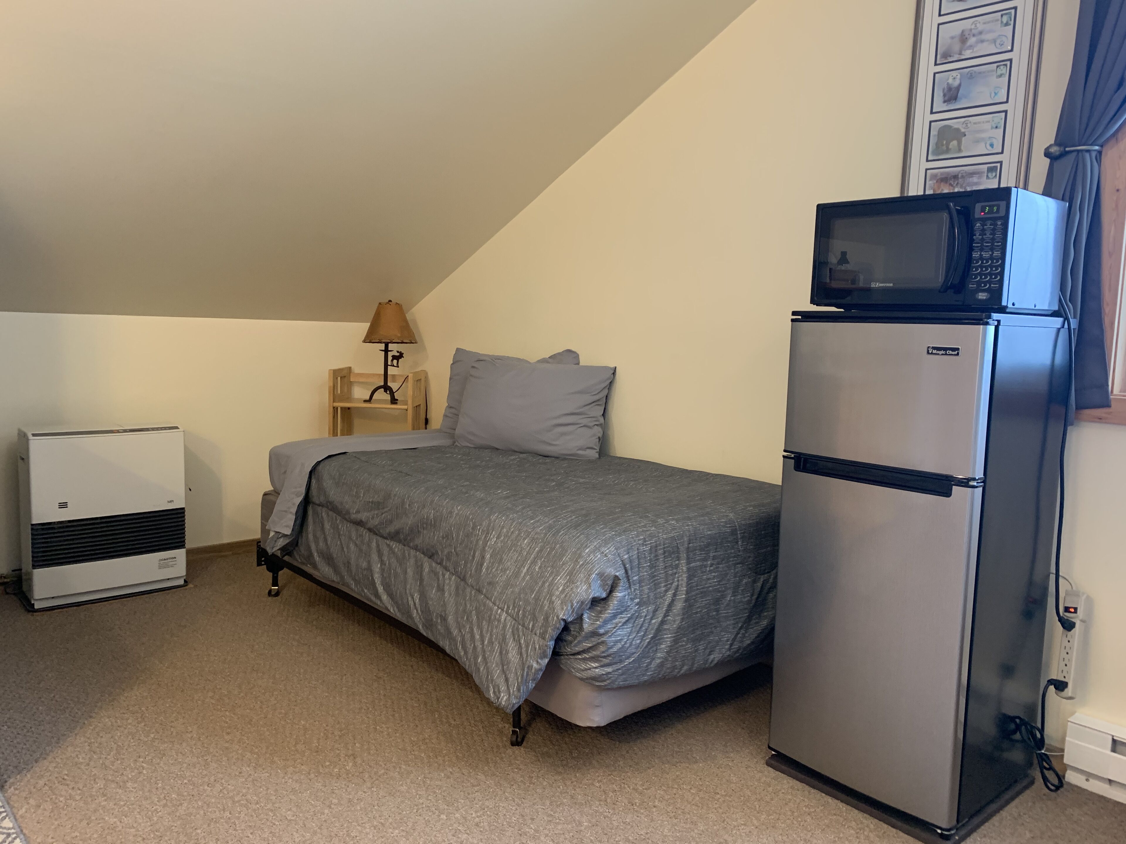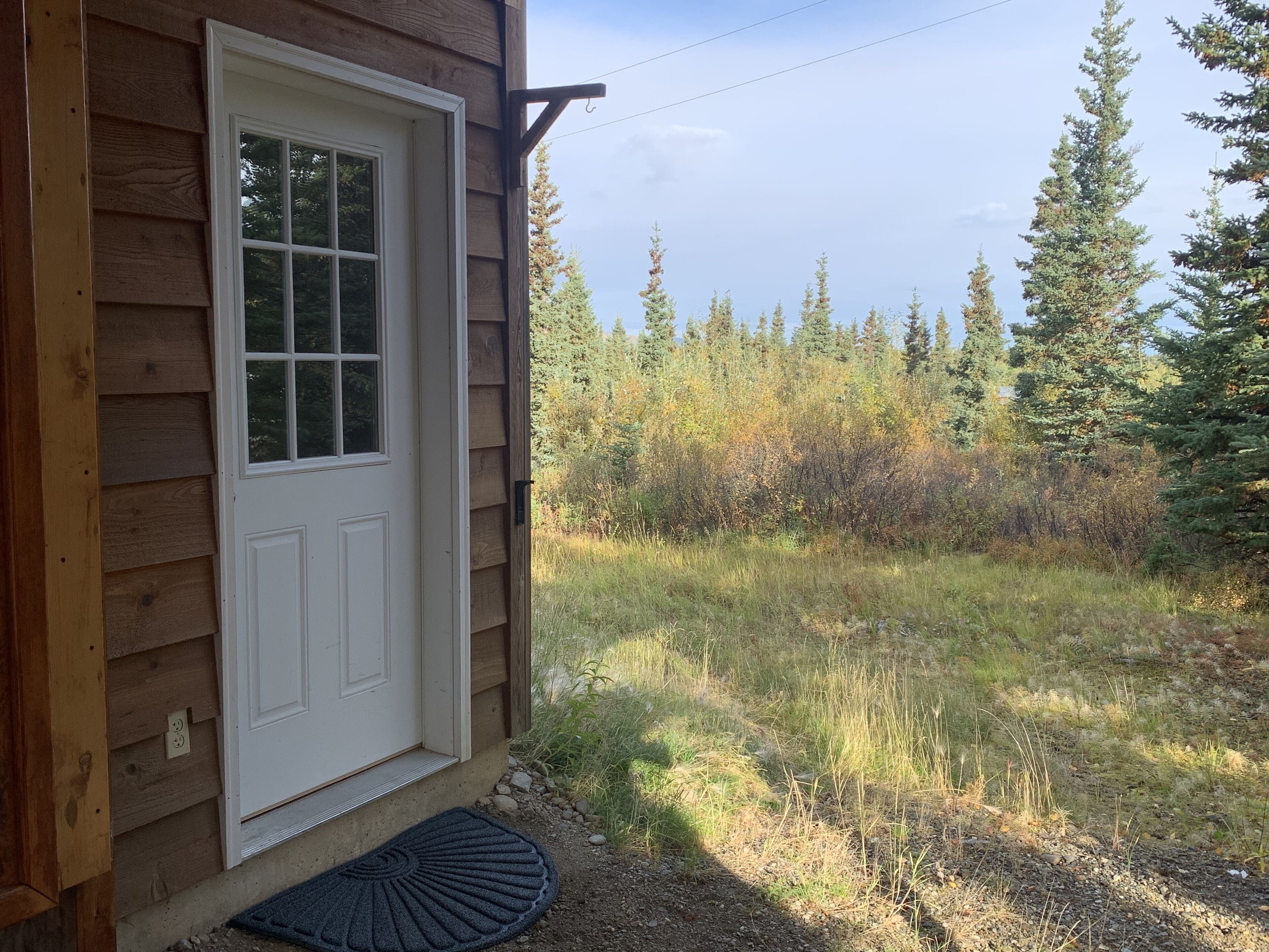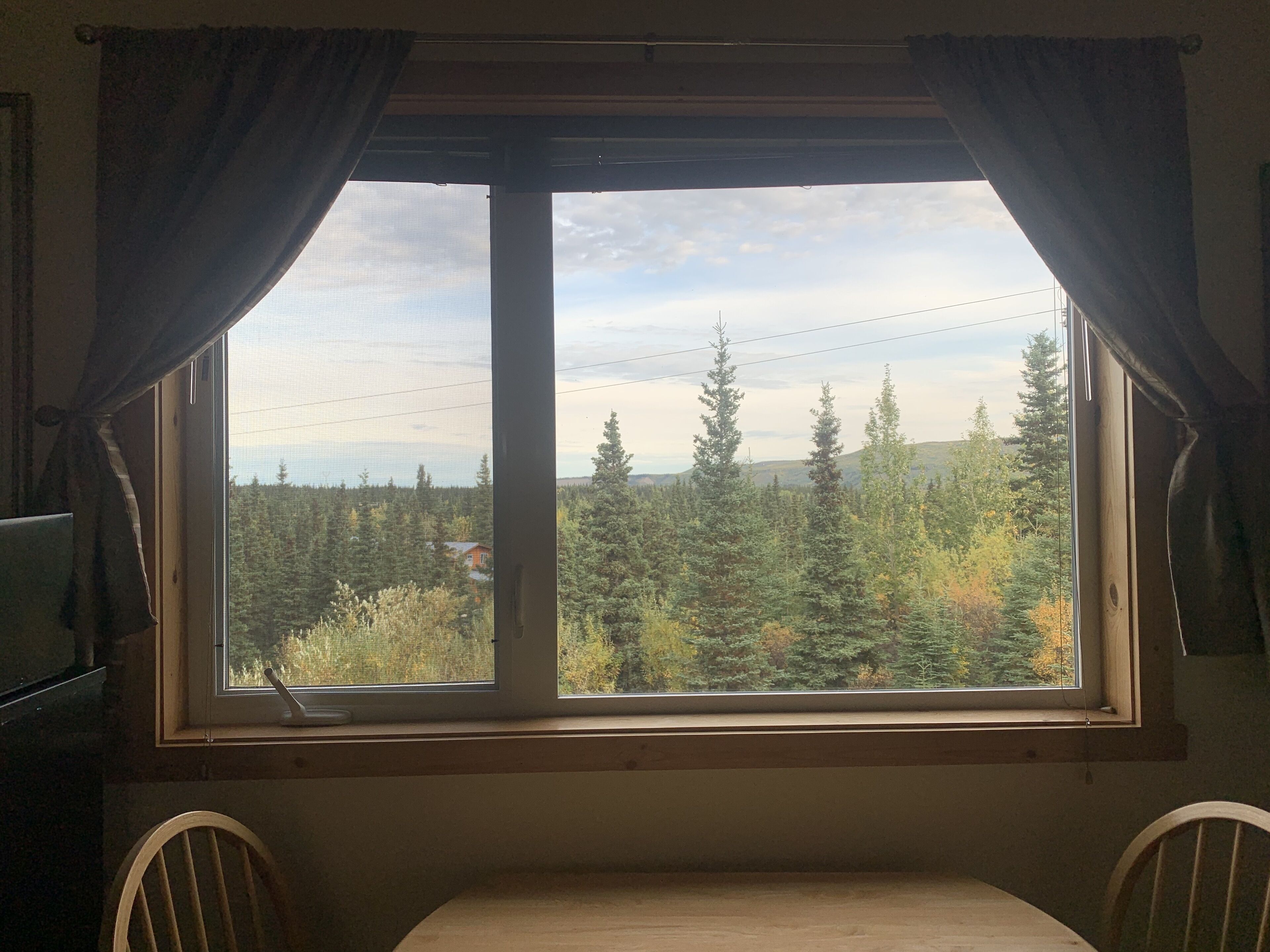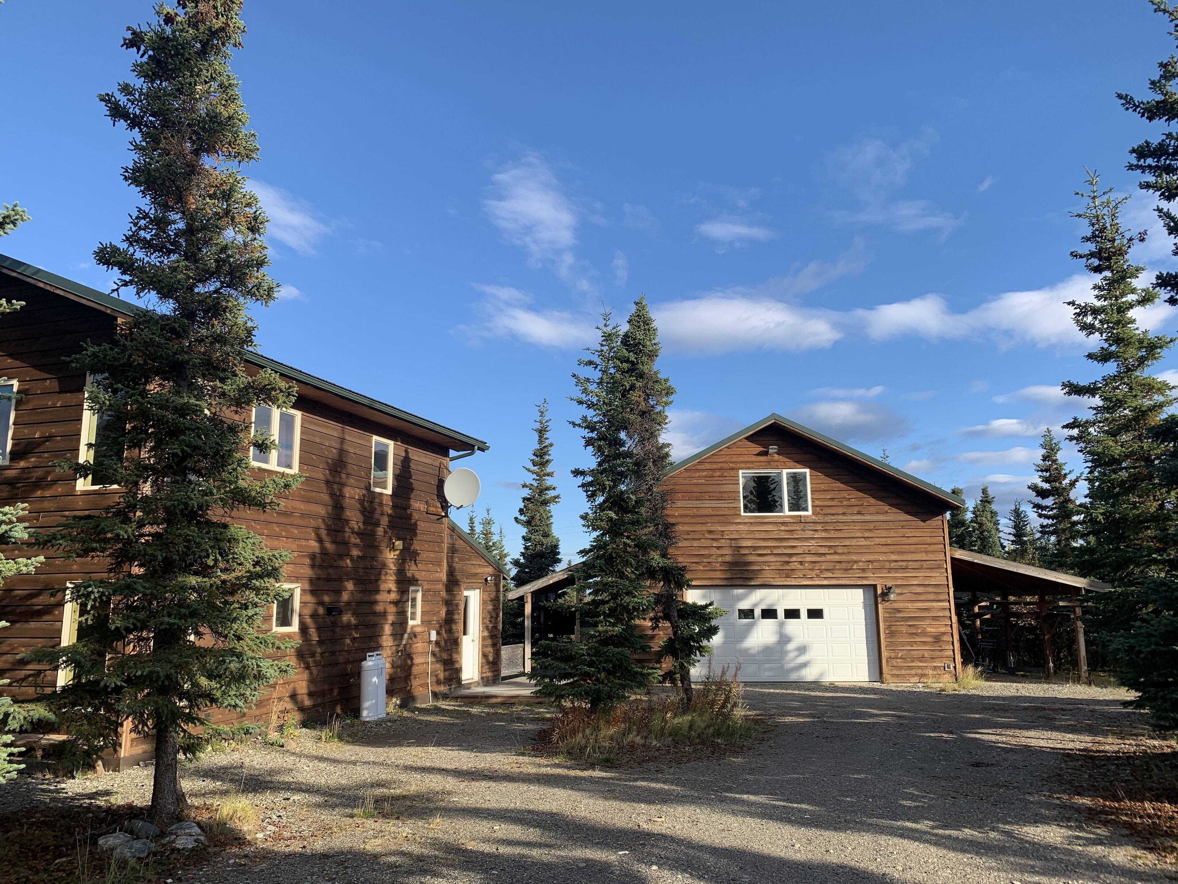 Cozy & Convenient Studio with Kitchenette Stay in comfort in the cozy Lynx Den. This second floor suite has amazing open views above the trees facing north for prime aurora viewing in winter and exceptional scenery year round. Den includes a kitchenette and private bathroom with shower. The property is located at the end of a road in a quiet neighborhood on just over 2 acres.This one room den has one queen bed and one twin bed with sleeping space for up to 3 people. The kitchenette features a large mini fridge with freezer, microwave oven, toaster, coffee maker, 2 burner stovetop, pots & pans, and plates & glasses. Private bathroom with shower and fresh towels are provided.Stair use is *required*. This is one of two units above the garage with shared driveway and entrance. Your den has a separate, lockable door. Parking is provided next to the garage. Garage space is not accessible to guests. Owner occupies home on property and it is also rented out during the summer months.There are three security cameras outside overlooking the driveway and parking area.