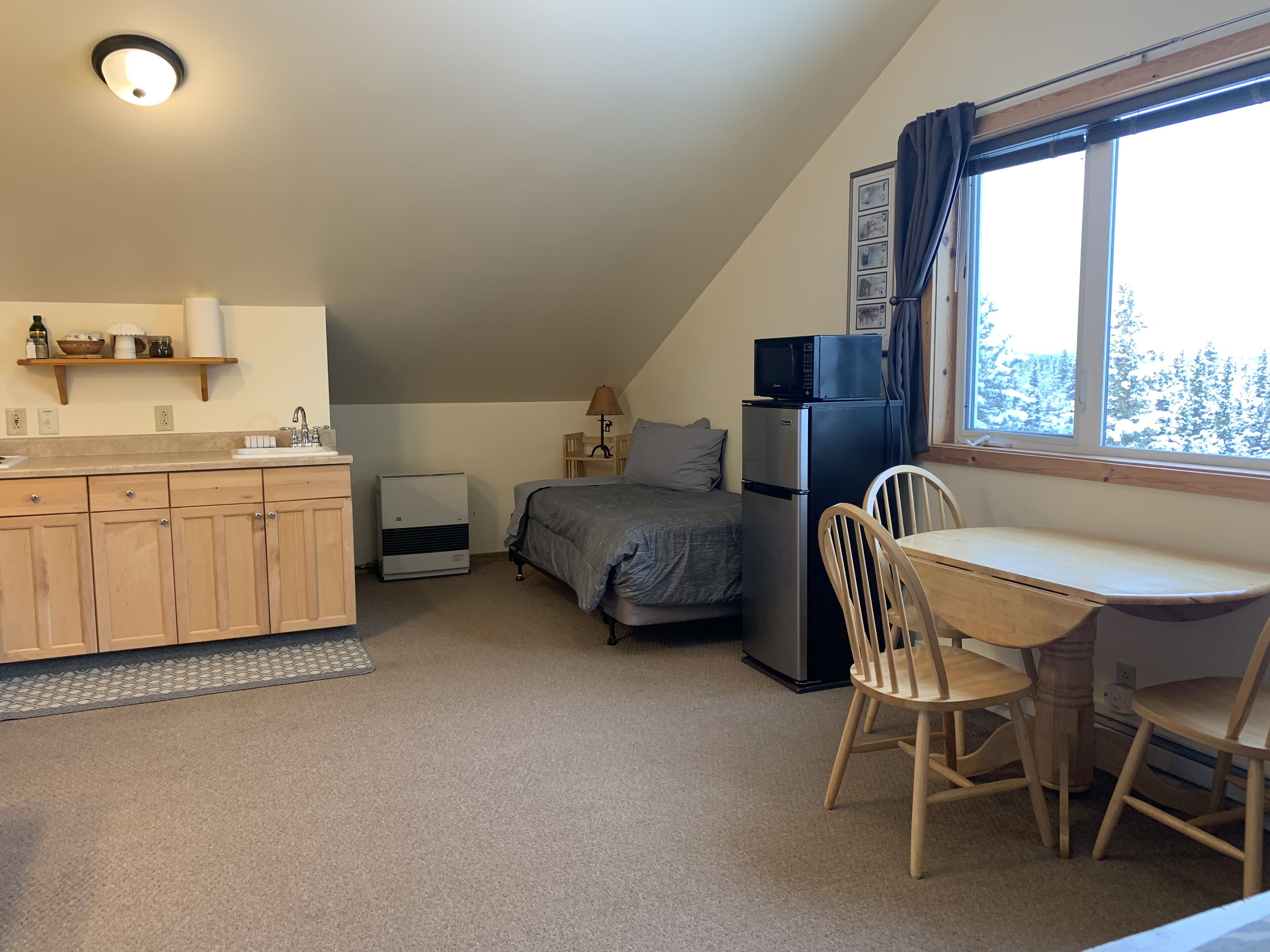 Cozy & Convenient Studio with Kitchenette Stay in comfort in the cozy Lynx Den. This second floor suite has amazing open views above the trees facing north for prime aurora viewing in winter and exceptional scenery year round. Den includes a kitchenette and private bathroom with shower. The property is located at the end of a road in a quiet neighborhood on just over 2 acres.This one room den has...