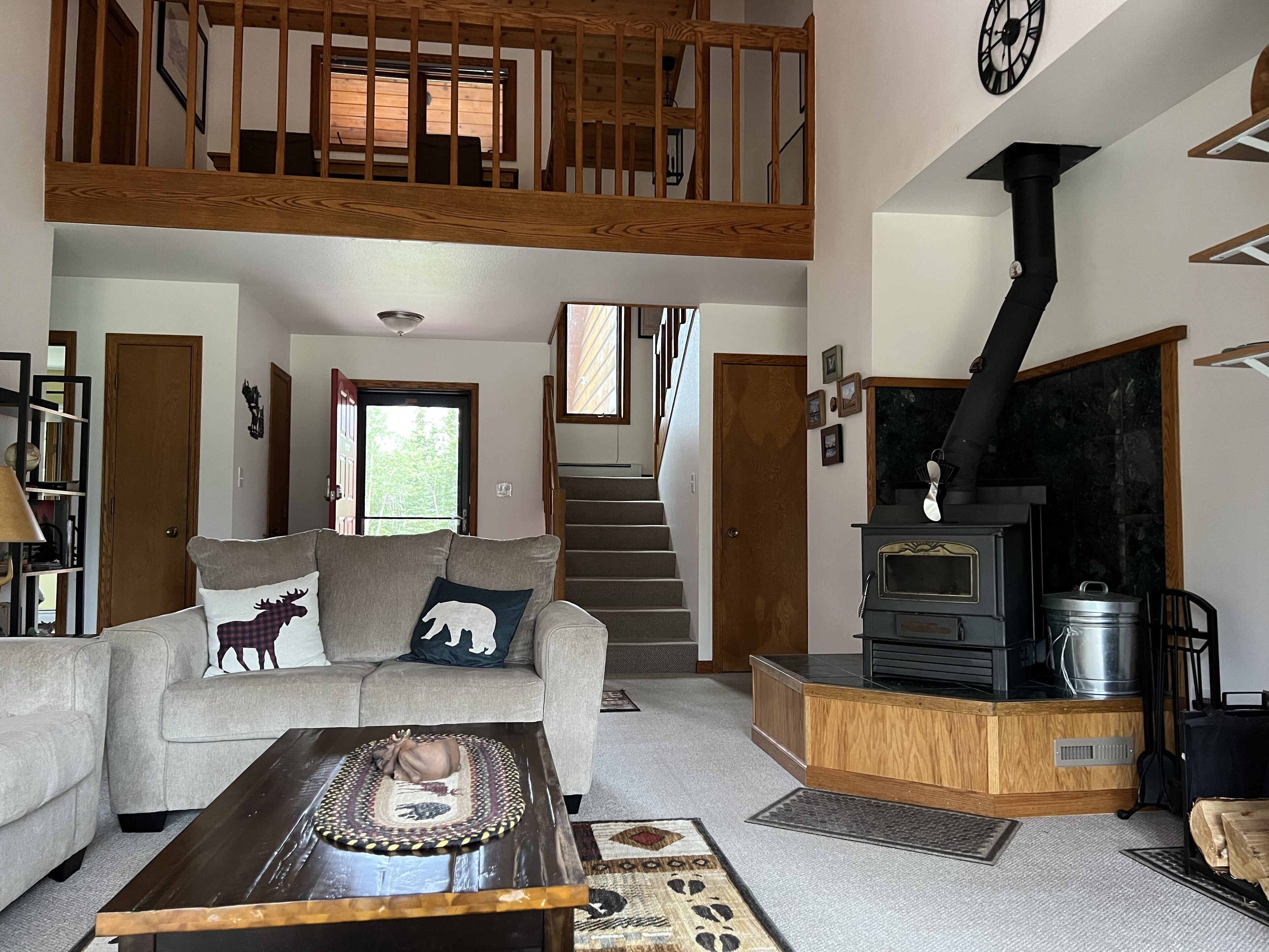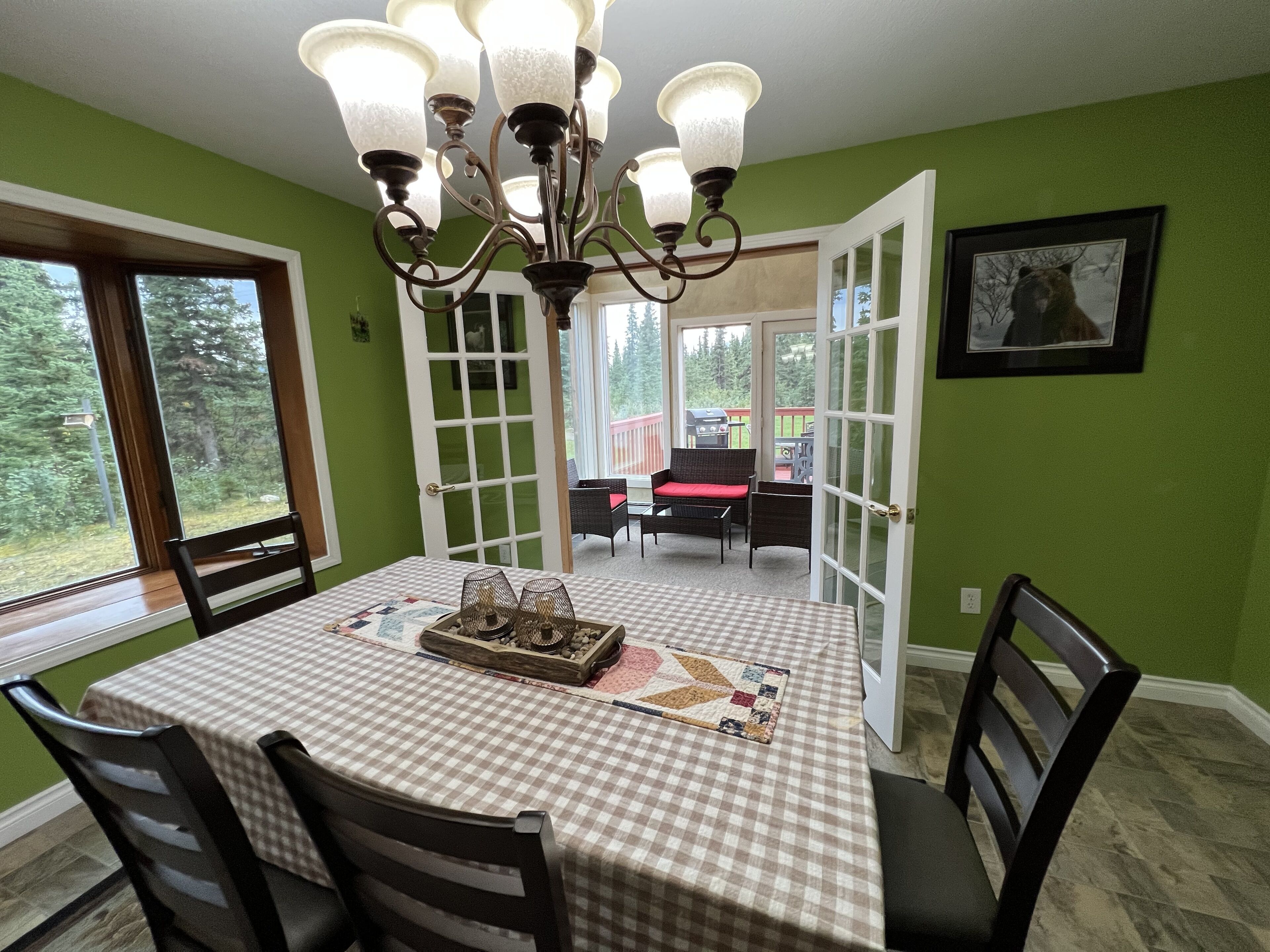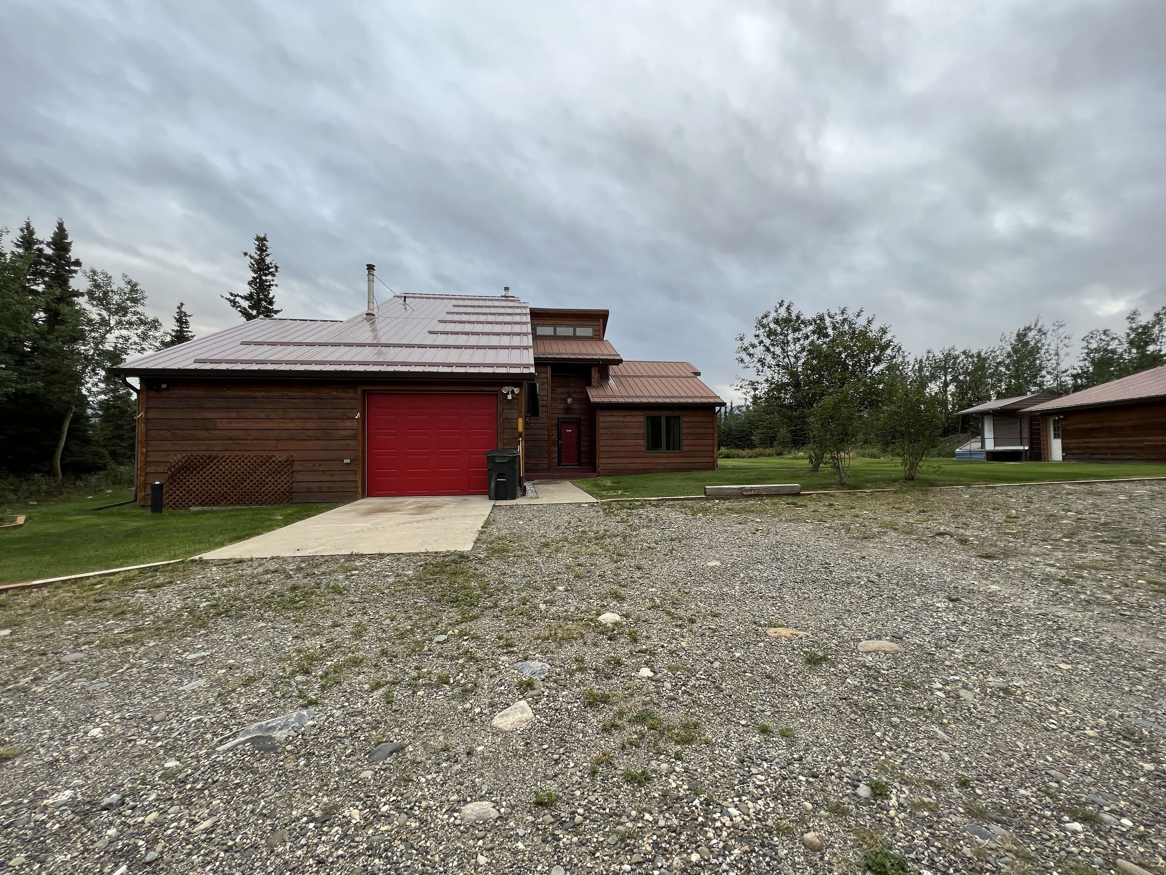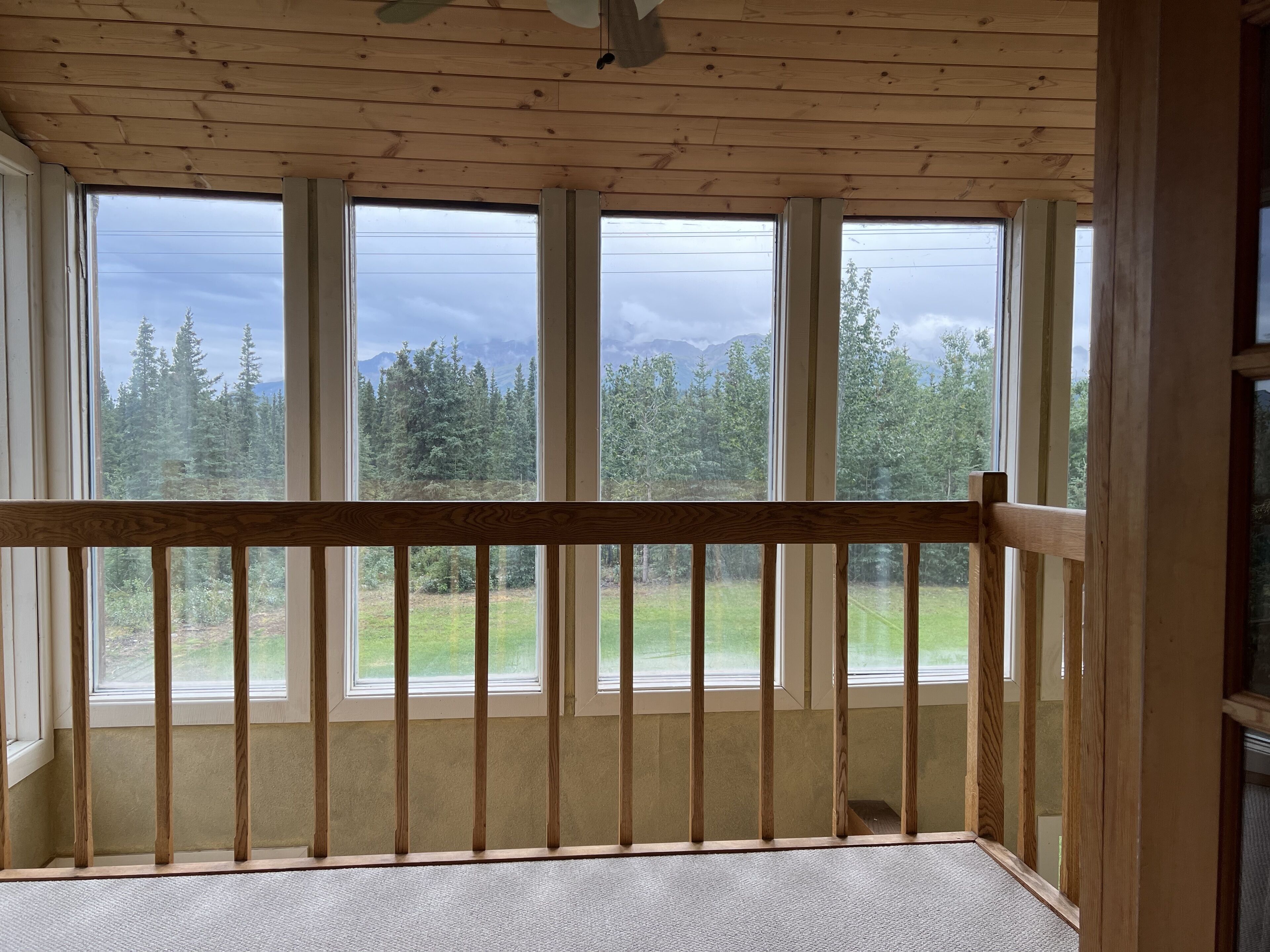 Your Home Along the Way in Denali Home Along is a clean, custom, charming home filled with windows that look out to private land and views of the mountains. This spacious home has a private driveway and private parking area. It is a comfortable home with 3 bedrooms, two bathrooms, dining room, full kitchen with dishwasher and new quartz countertops, living room, sun room, a study area with large desk, deck and private lawns. It is owner-occupied in a completely separate space from the rental to follow HOA regulations. Alaskans owners have been hosting guests for 35 years in Denali. Owners also provide rental cars and will book train tickets, flights, rafting, Husky Homestead Tours, ATVing, Fat Truck tours, etc. Owners are happy to provide many tips and suggestions for your Denali National Park visit.This home offers privacy, but is close to restaurants, grocery stores, trails and especially...Denali National Park.There are close to 3.5 acres with this property. It has BBQ, outdoor dining table for six, and Solo fire pit.Your Home has an exclusive washer and dryer, hanging racks, iron and ironing board in a separate laundry room. Supplies are provided.There are so many extras provided with your rental: Bose Sound System, wood stove, Wolfe gas stove, five ceiling fans, shades and curtains on the windows, established lawn and berry patch, open living room concept, and wood accents for a cabin feel.There is no hot tub.
