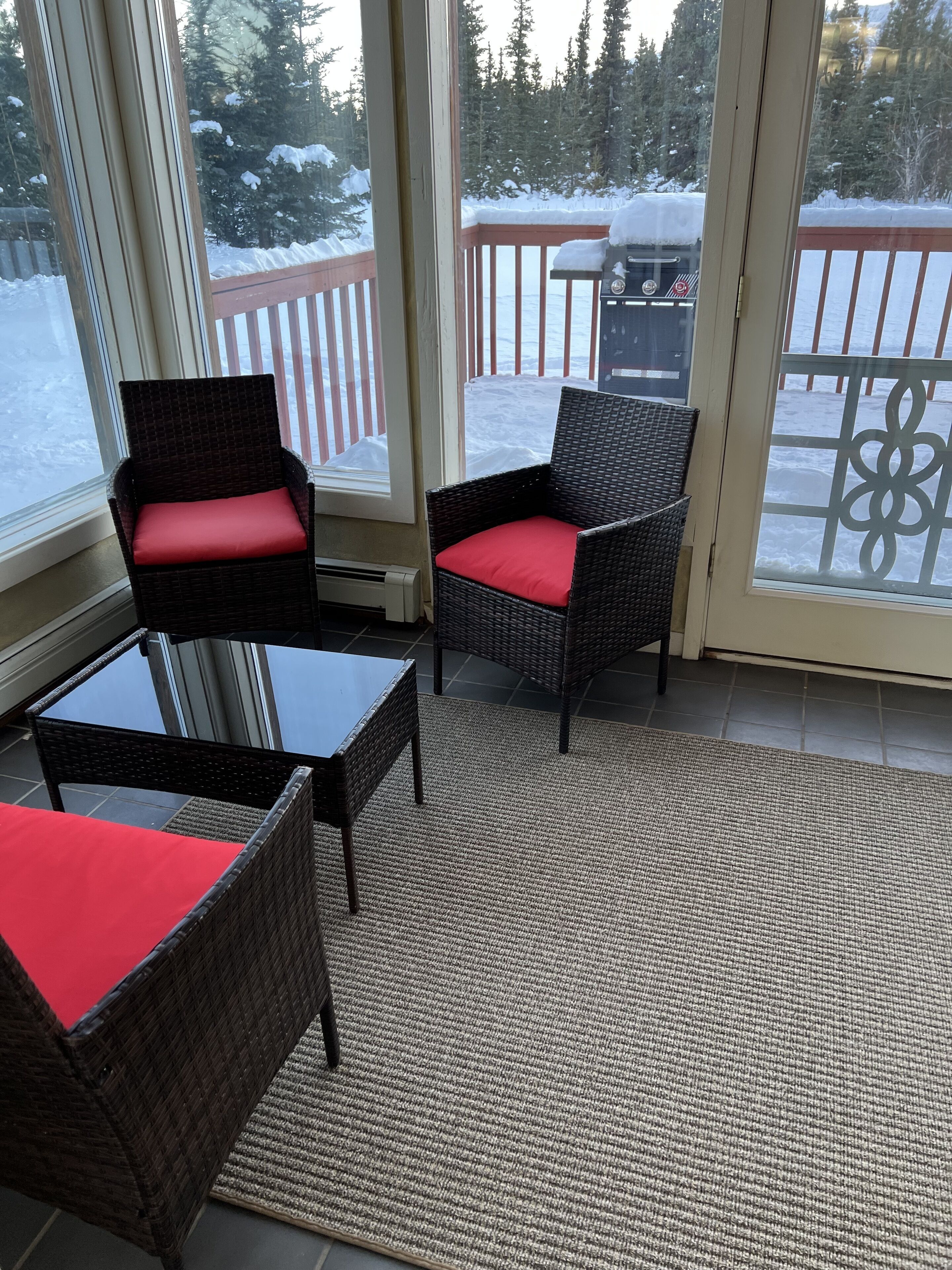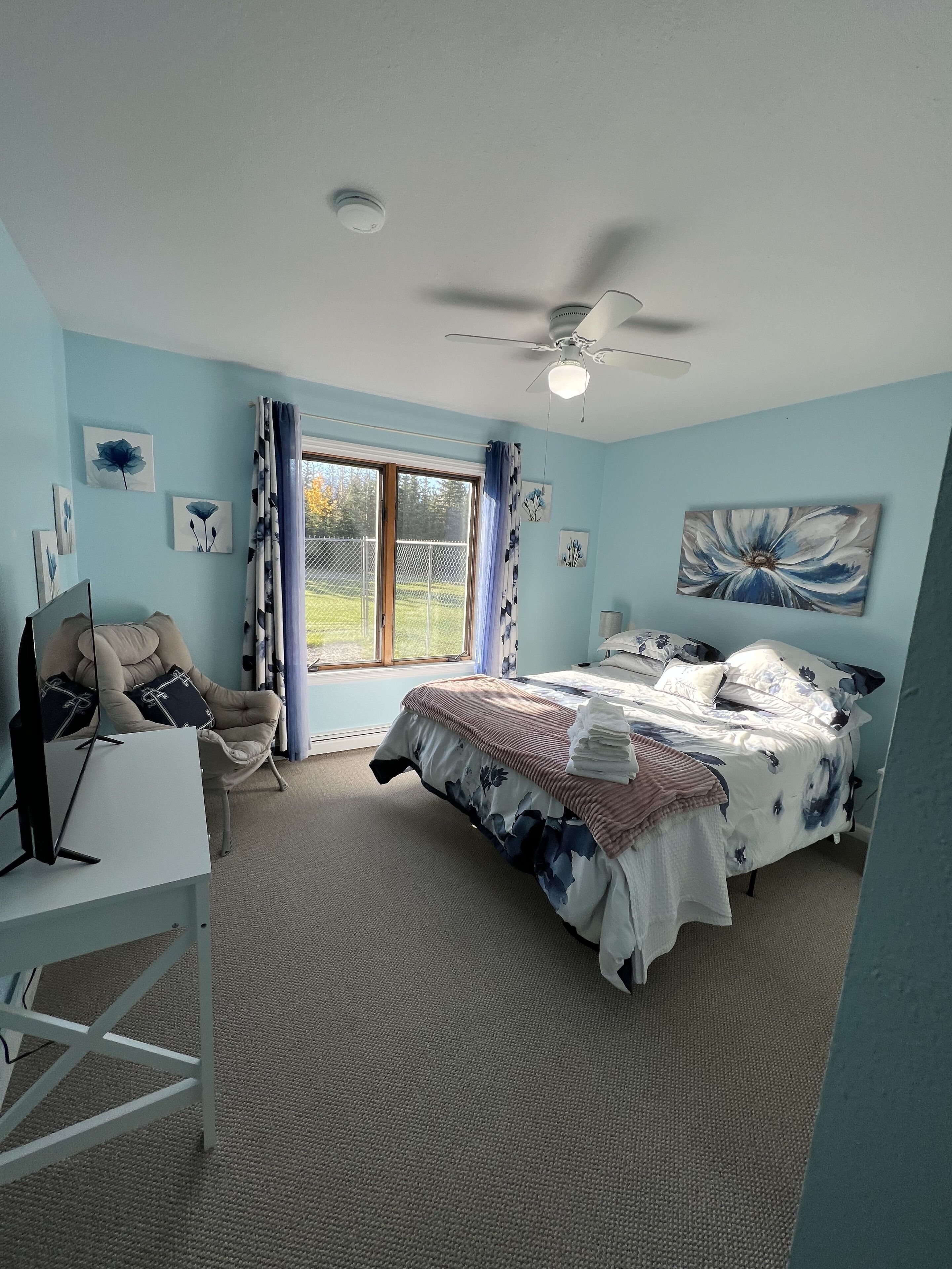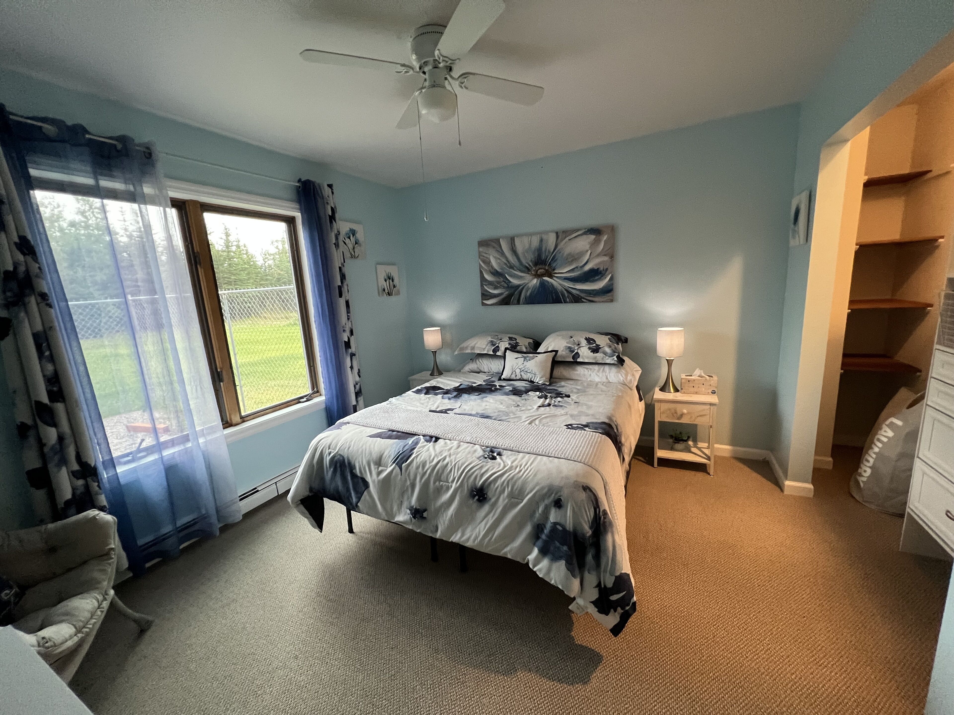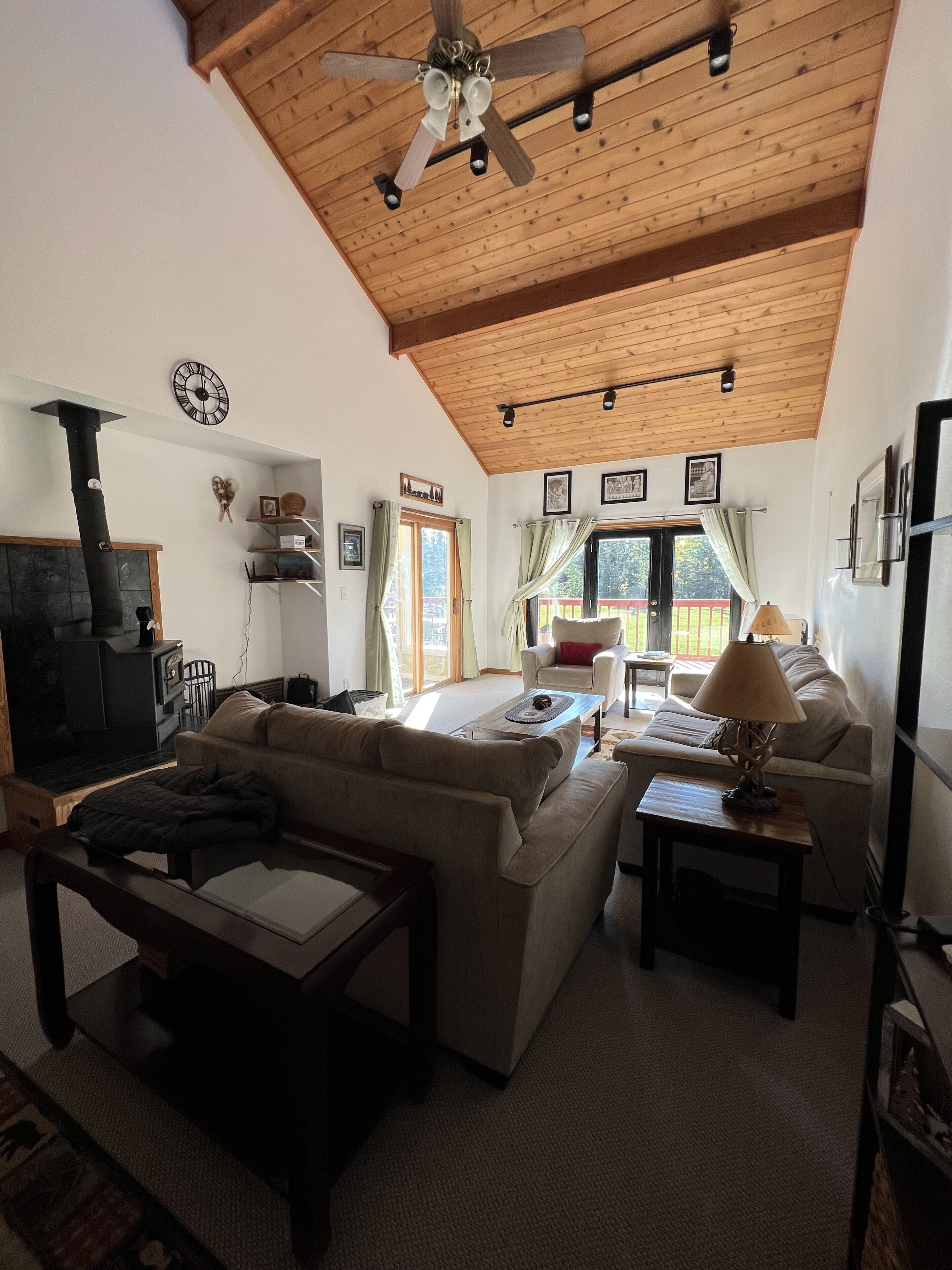 Your Home Along the Way in Denali Home Along is a clean, custom, charming home filled with windows that look out to private land and views of the mountains. This spacious home has a private driveway and private parking area. It is a comfortable home with 3 bedrooms, two bathrooms, dining room, full kitchen with dishwasher and new quartz countertops, living room, sun room, a study area with large desk, deck and private lawns. It is owner-occupied in a completely separate space from the rental to follow HOA regulations. Alaskans owners have been hosting guests for 35 years in Denali. Owners also provide rental cars and will book train tickets, flights, rafting, Husky Homestead Tours, ATVing, Fat Truck tours, etc. Owners are happy to provide many tips and suggestions for your Denali National Park visit.This home offers privacy, but is close to restaurants, grocery stores, trails and especially...Denali National Park.There are close to 3.5 acres with this property. It has BBQ, outdoor dining table for six, and Solo fire pit.Your Home has an exclusive washer and dryer, hanging racks, iron and ironing board in a separate laundry room. Supplies are provided.There are so many extras provided with your rental: Bose Sound System, wood stove, Wolfe gas stove, five ceiling fans, shades and curtains on the windows, established lawn and berry patch, open living room concept, and wood accents for a cabin feel.There is no hot tub.