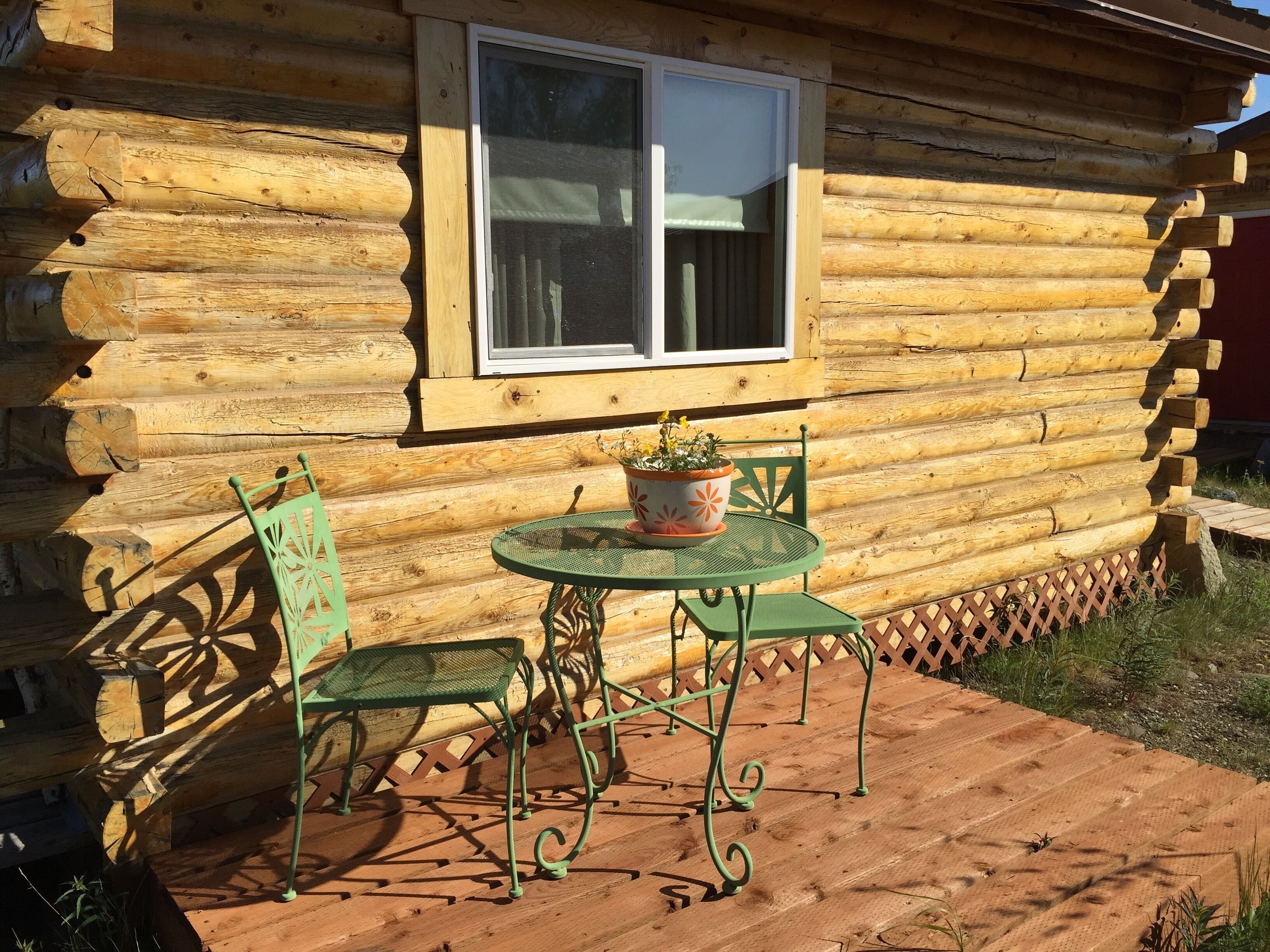 Earthsong Lodge -Two Room Cabin EarthSong Lodge provides an opportunity for Denali Park visitors to have a unique, authentic place to stay overnight while visiting the National Park. Located four miles out Stampede Road (from "Into The Wild" fame), EarthSong is above treeline on open tundra, with unobstructed views of the Alaska Range. It's the perfect spot for guests who wish for a quiet, spectacular place to sleep, and have accommodations that are more than just a bed and bathroom. Log cabins are well-apportioned and have modern conveniences, spaced for privacy. On-site guests can enjoy some extra amenities. EarthSong is for the visitor that wants just a bit more from their visit.Two-Room cabins have two rooms, one double bed in each room, and are perfect for groups that need more than one bed. Separate rooms allow this cabin to be possible for couples traveling together, but there is limited space and privacy for four adults. Each cabin has bathroom with modern facilities, individual hot water heater, nice towels, extra pillows, and more to make your stay comfortable. Cabins are also insulated and heated for the cooler nights. All cabins have either private or shared porches. While there are no cooking facilities in the cabins, there is a shared kiosk where guests have access to fridge and microwave. Most cabins are log, all hand-built and unique, and have nice mix of authentic and comfort, with a high level of cleanliness. Daily service available.