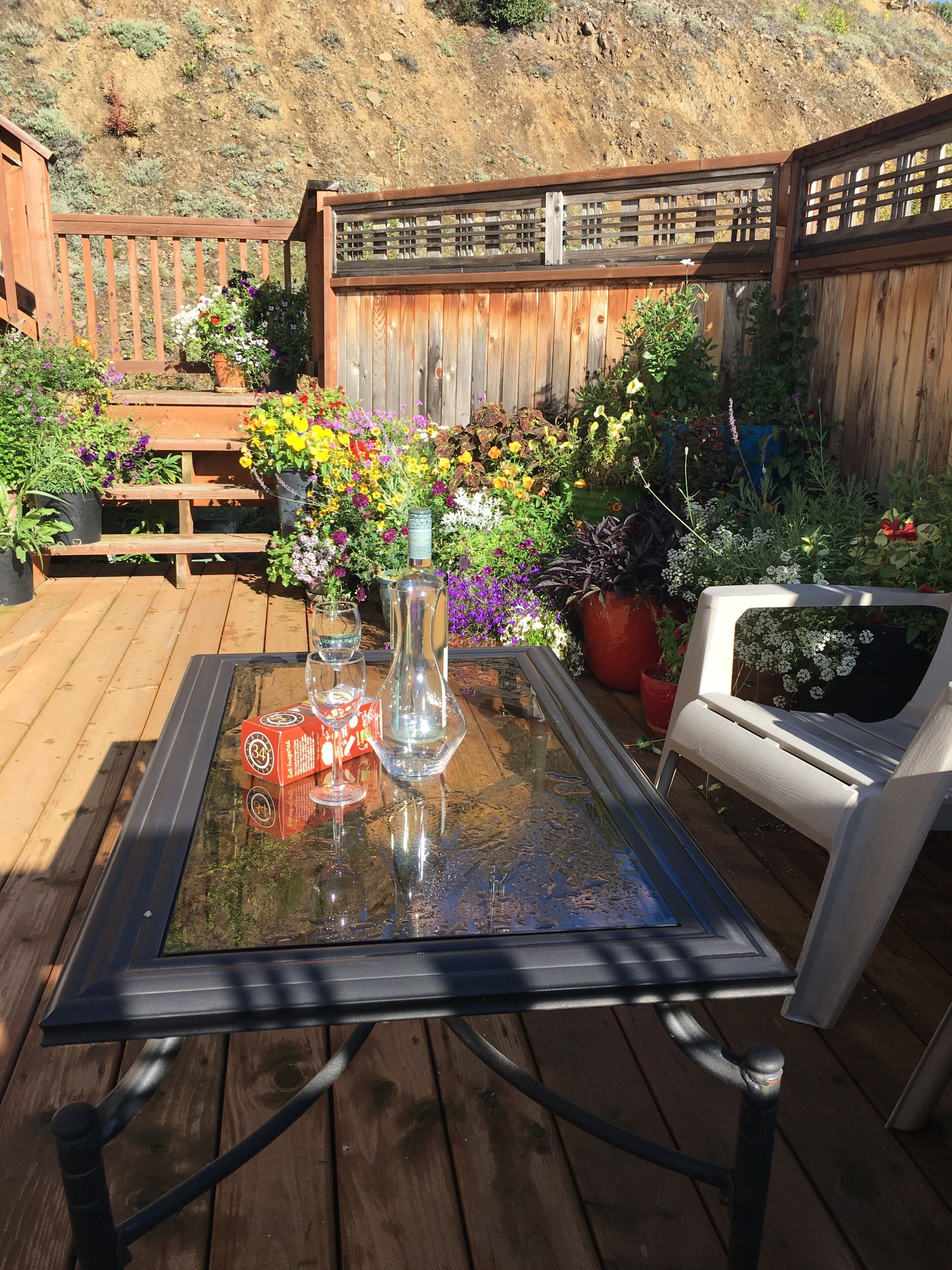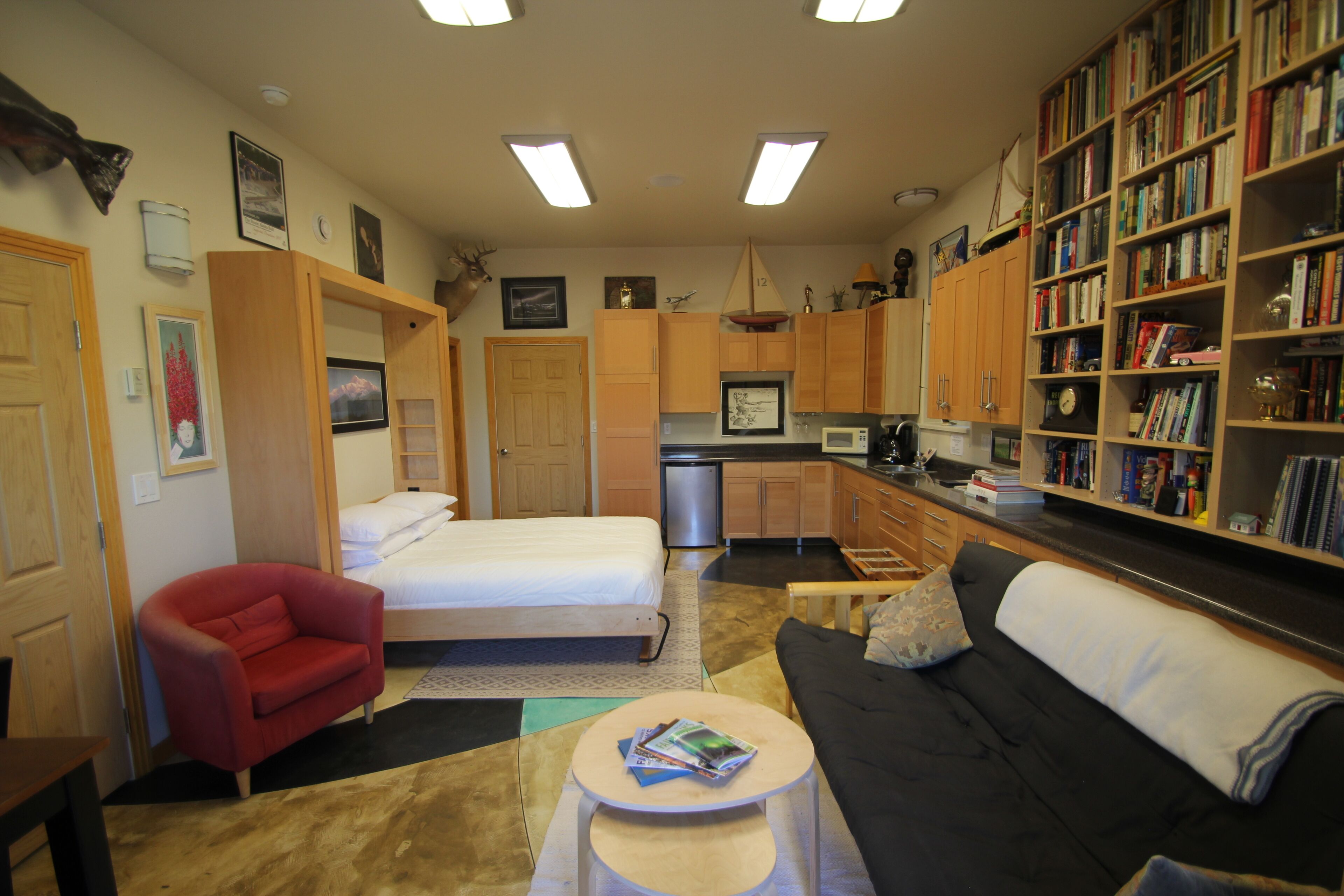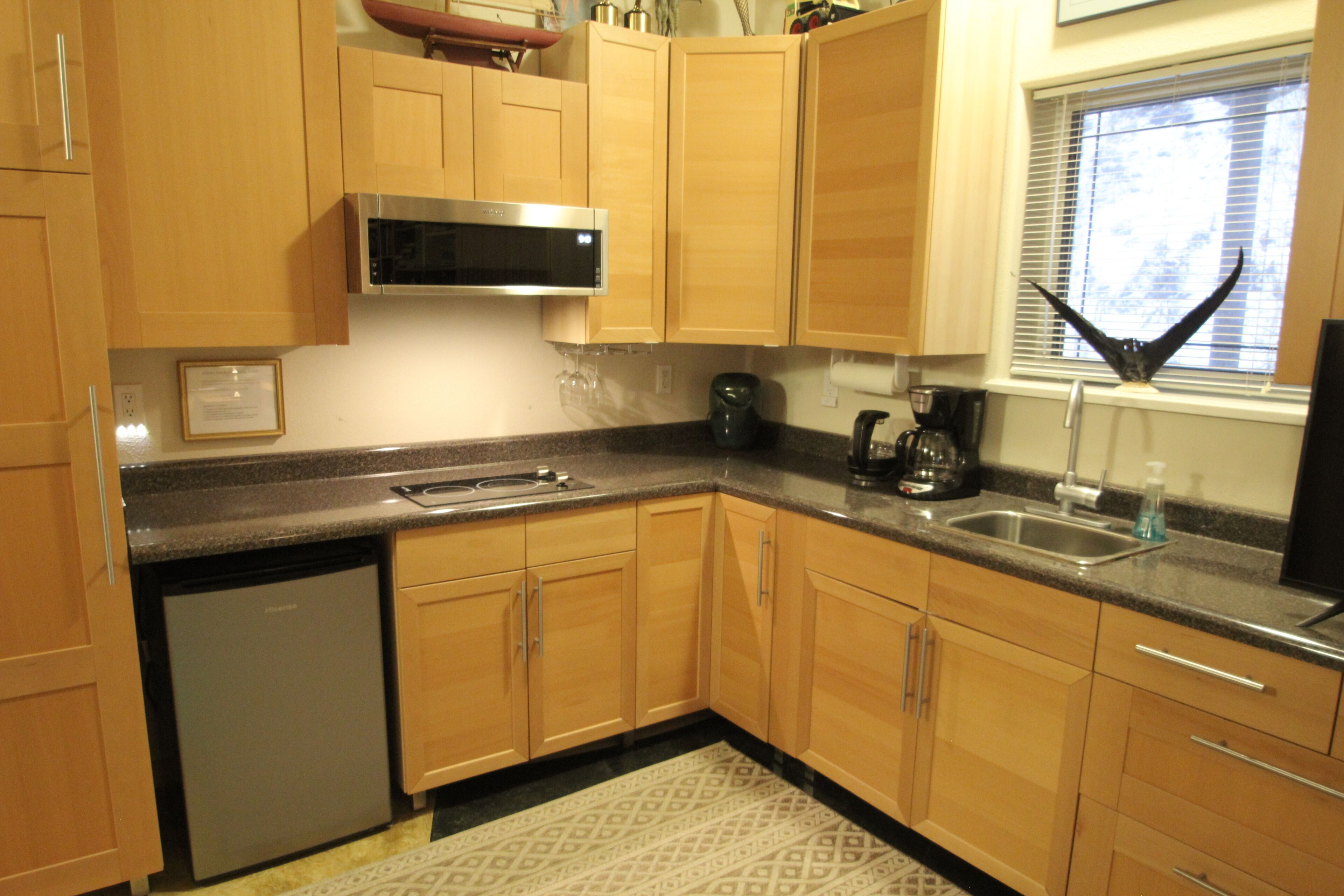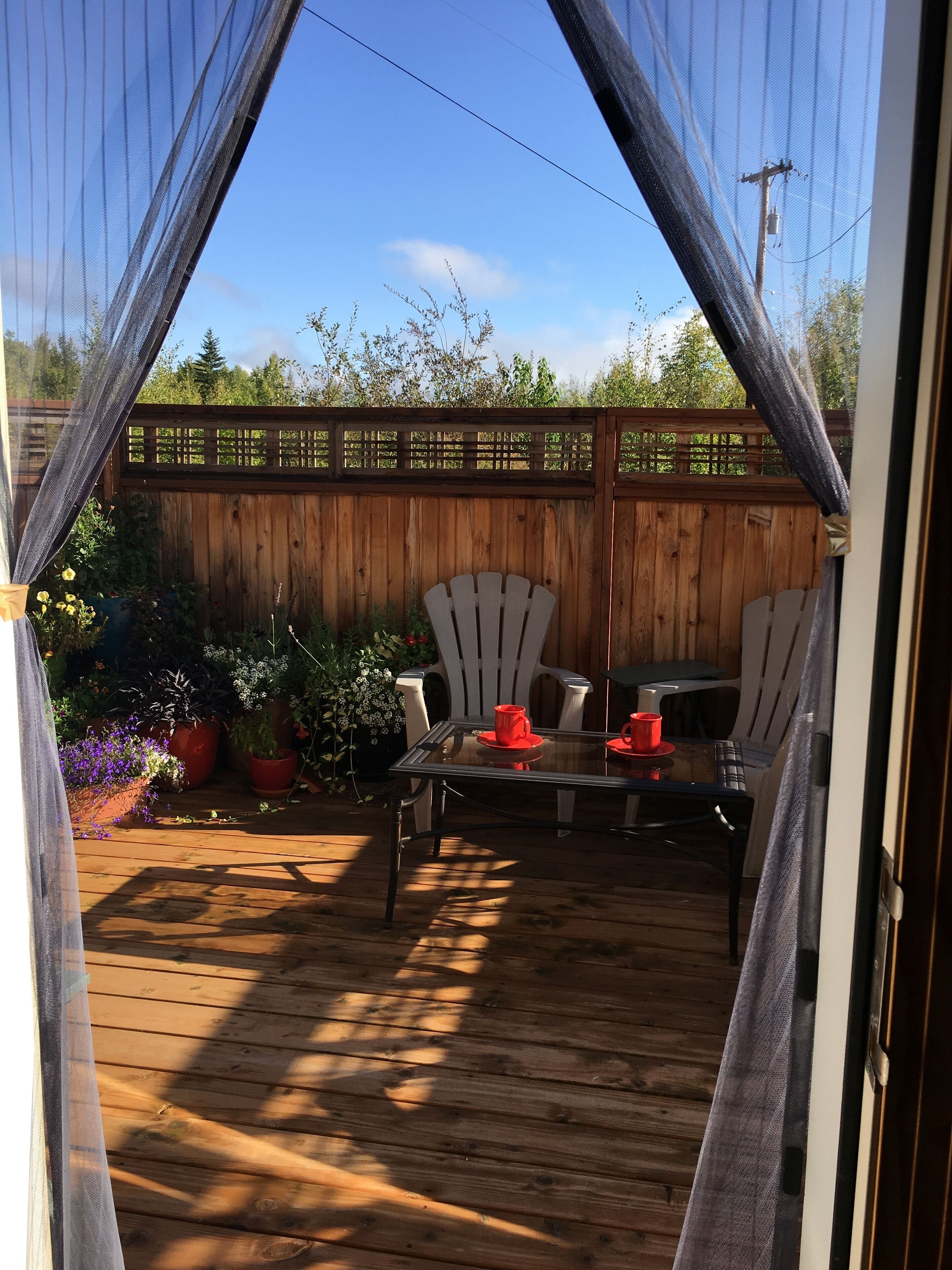 Cozy Studio apartment with a Courtyard and Hot Tub. The Alaska Garden Paradise is a 384 square foot Studio Apartment located in a private home in the Lakloey Hill area. There is a separate entrance on the right side of the house past the front door and through a private courtyard. The door has a touch pad so there is no need to check in. The room is soundproofed from the rest of the house. Amenities include a queen bed and a futon for additional guests as well as a coffee maker, microwave, 2 burner cooktop, refrigerator and table that seats 4 . The private courtyard has seating for 4 with a coffee table for morning coffee or afternoon drinks and is filled with fragrant flowers during the summer months. The private bathroom has a tub/shower.