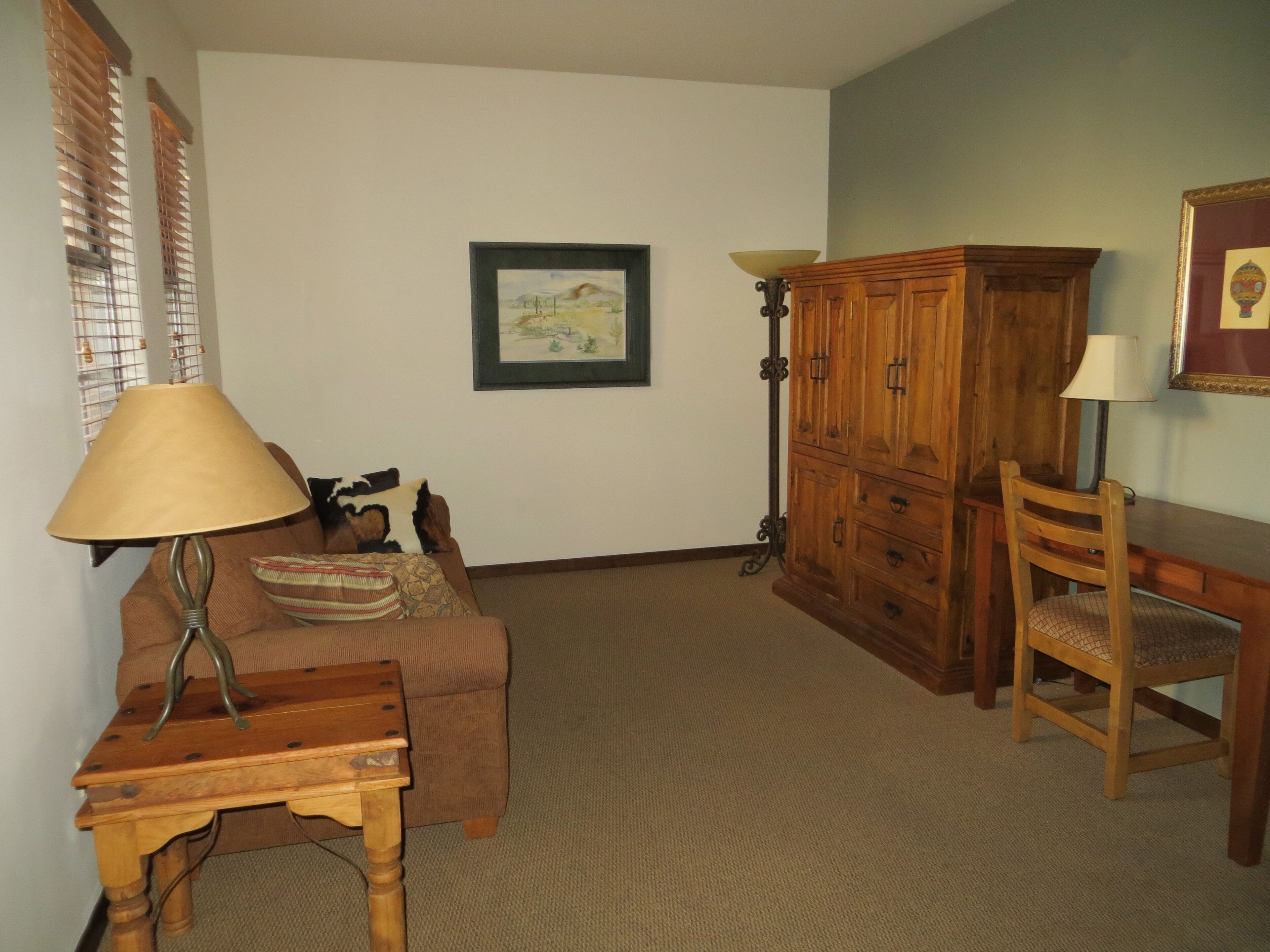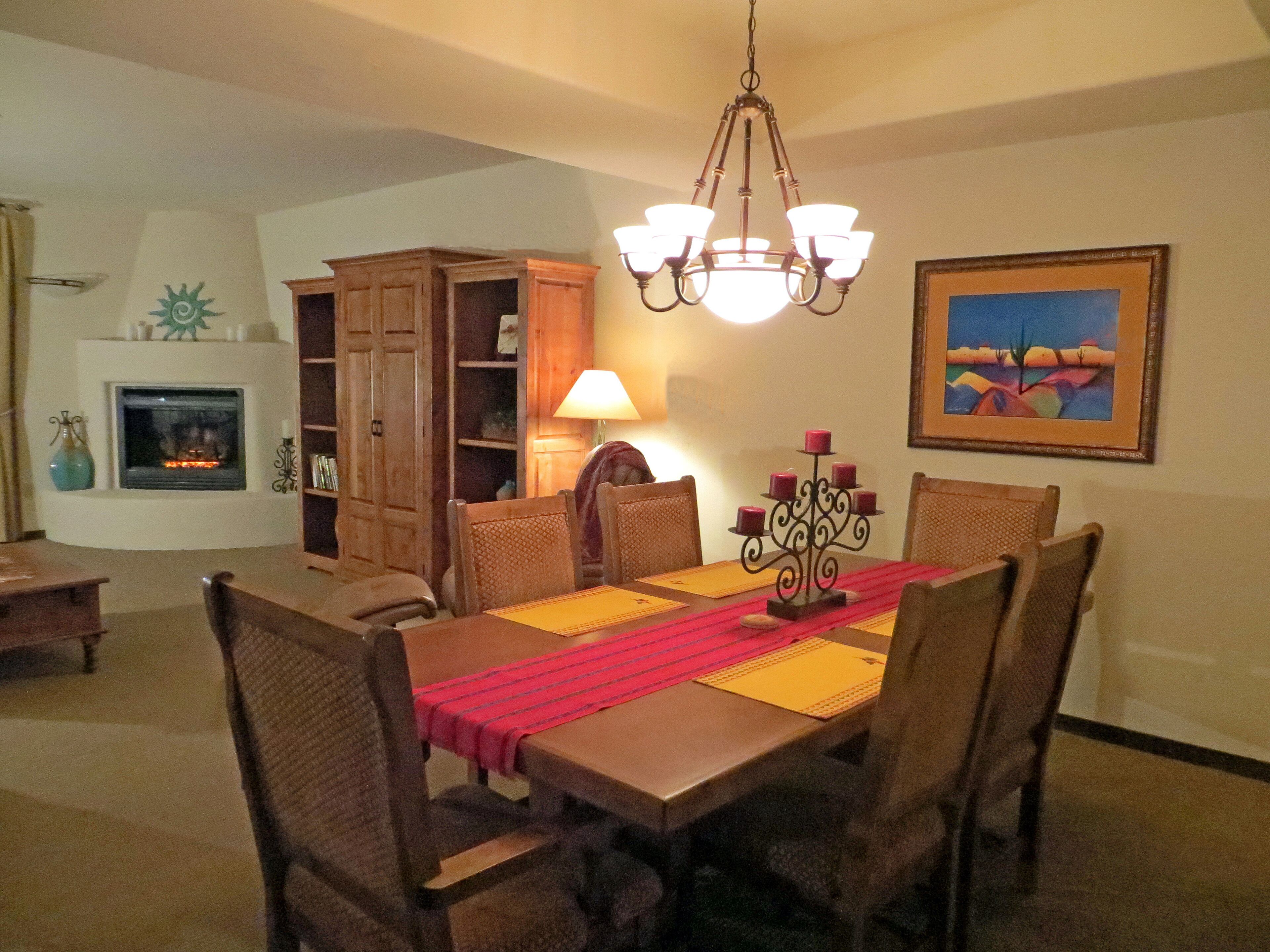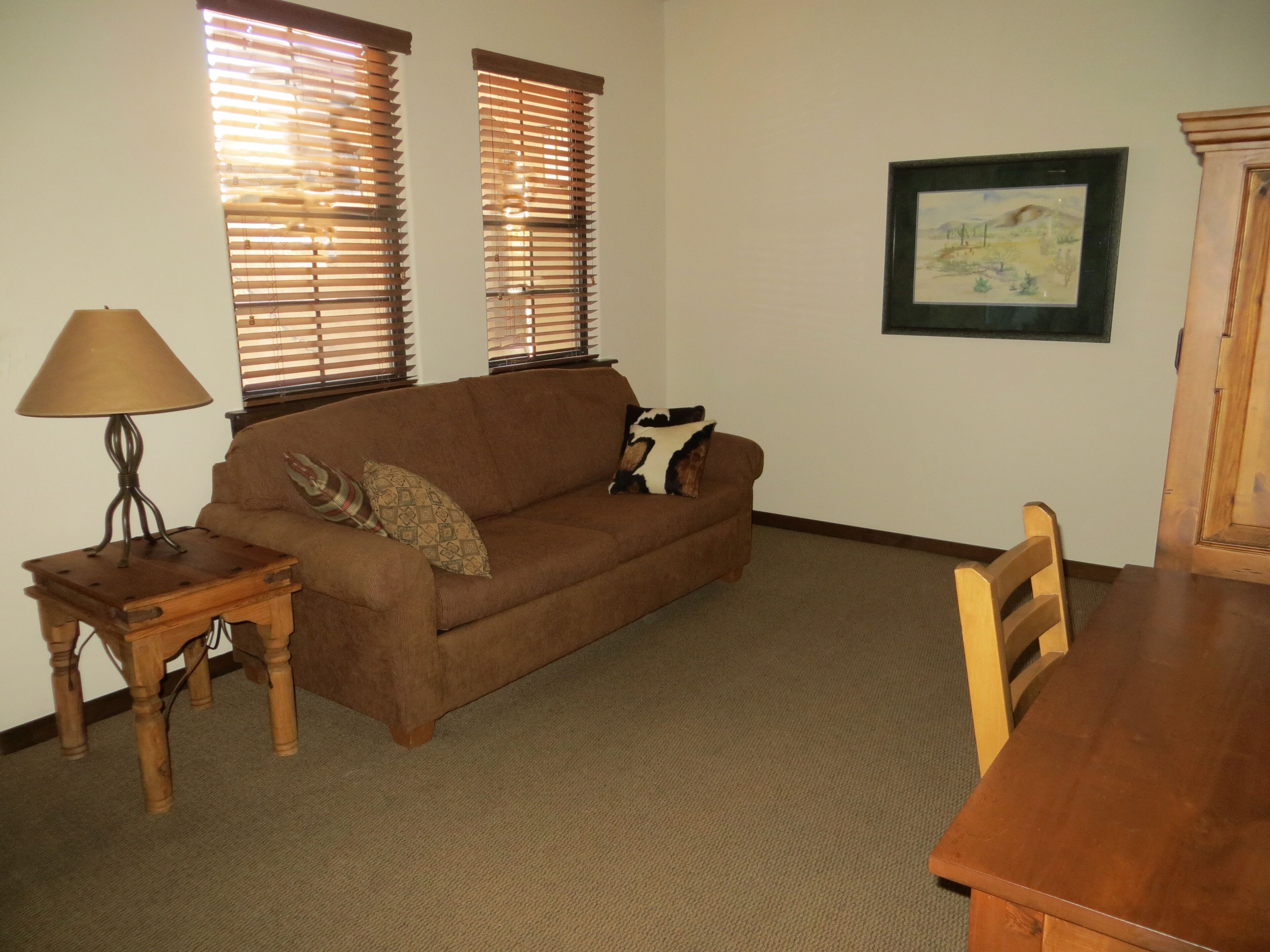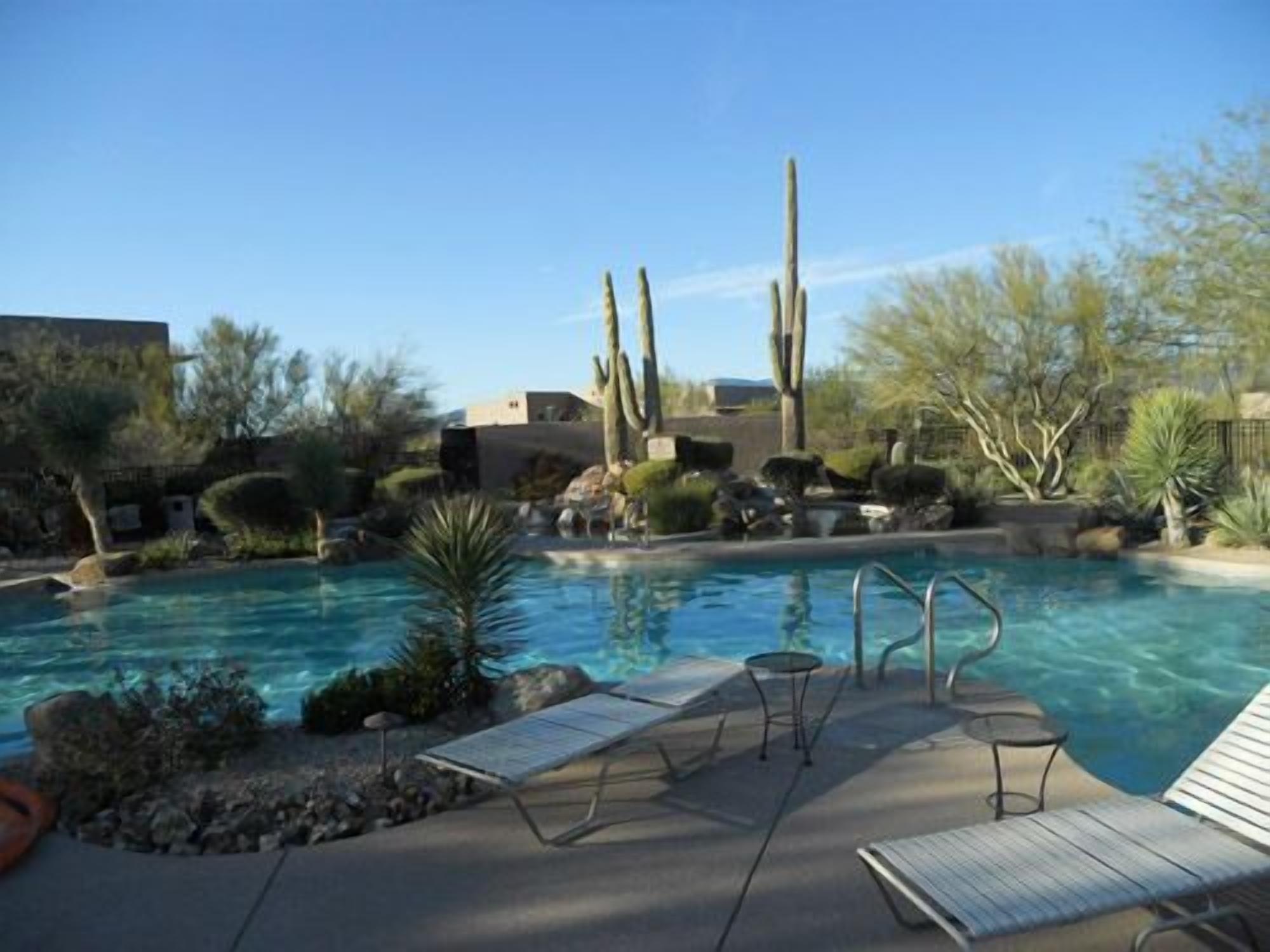 You'll Love The Views! Spacious 2br/2 1/2ba Condo With Sunset & Mountain Views! Experience the comfort and tranquility of a quiet, gated neighborhood with resort-style amenities of a community swimming pool (heated in winter), hot tub, and putting green. Our 2,000 sq. ft. villa embraces desert living with 2 private covered patios and no interior or exterior stairs. Secure WiFi (password protected for our unit only), high-speed internet, and cable are available throughout the villa. From our fully stocked and ideally located Carefree vacation villa, you can be in town or the desert in minutes. Tennis and bike rentals are an easy 5 minute walk; public golf courses a very short drive away.Relax in the Master Suite comprised of a spacious family room, dining area, full kitchen, powder room, and master bedroom with king bed, large walk-in closet, and full bath with jetted tub and shower. New flat screen HDTV's with cable and DVD/CD players in the family room and master bedroom are provided for your entertainment. Your guests will enjoy a private (lock-off) Guest Suite: den, bedroom with king bed and TV/DVD, full bath and walk-in closet. Both suites have private covered patios to enjoy the desert beauty and abundant wildlife. This unique area north of Scottsdale offers a quiet haven with beautiful views of mountains, desert, and stately saguaros. Hummingbirds, owls and other bird species, javelina, coyotes, and bobcat are often seen in the early morning and late afternoon. At dusk, enjoy beautiful sunsets followed by a star-filled sky. The greater Carefree area offers a myriad of activities. Hike nearby Cave Creek Park, Spur Cross Ranch, Pinnacle Peak, or other desert trails. Hit the links or enjoy the courts at the area's world class golf and tennis resorts or public courses. Bike or horseback ride on desert paths. Enjoy authentic Mexican food, delicious BBQ, and casual and fine dining in the many diverse Carefree, Cave Creek or Scottsdale restaurants. Experience the western lifestyle at an authentic rodeo and western-themed restaurants, and enjoy the excitement at a nearby casino. Pamper yourself at a local spa or peruse the many art galleries and shopping experiences in the area. Winter events include the Barrett Jackson Auto Auction and Show, the PGA Phoenix Open, art exhibits, and MLB spring training games.Please join us to experience the best of the Southwest. We invite you to make this your home during your stay in sunny Carefree.Master Suite:Family room with kiva fireplace, flat-screen HDTV with DVD/CDDining area with seating for 6Fully equipped, roomy kitchen: oven/range, refrigerator with ice-maker, microwave, dishwasher, garbage disposal, coffeemaker, toaster, blender, mixer, Forman grillMaster bedroom with king bed, flat-screen HDTV and DVDWalk-in shower, spa tub, and dual sinks in master bathLarge walk-in closetPowder room adjacent to family roomFull laundry room: washer and dryerPrivate covered patio with mountain, desert & golf course viewLock-off Guest Suite with separate entrance:Den with TV, mini-refrigerator, and coffee-makerGuest bedroom with king bed, TV and DVDTub and shower in guest bathWalk-in closetPrivate covered patio with mountain, desert, and sunset viewsAmenities:High speed Internet, secure WiFi (password protected for our unit only), cable TVLinens and towels providedFull kitchen supplies: dining, cooking and baking utensilsSmall kitchen appliances: coffee makers, blender, toaster, mixer, Forman grillFull laundry roomIrons and ironing boards (2)Hair dryers (2)Private garage parking for one car; additional off-street parking adjacent to villaShort walk to community swimming pool and hot tubCommunity club house with lending libraryPutting green