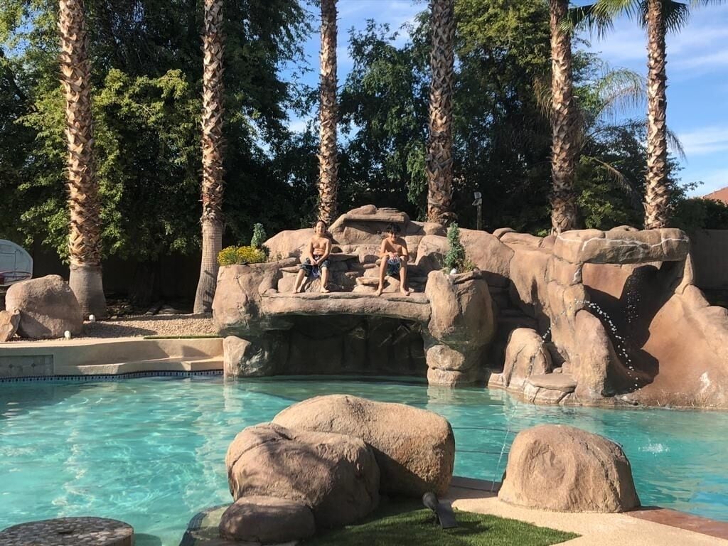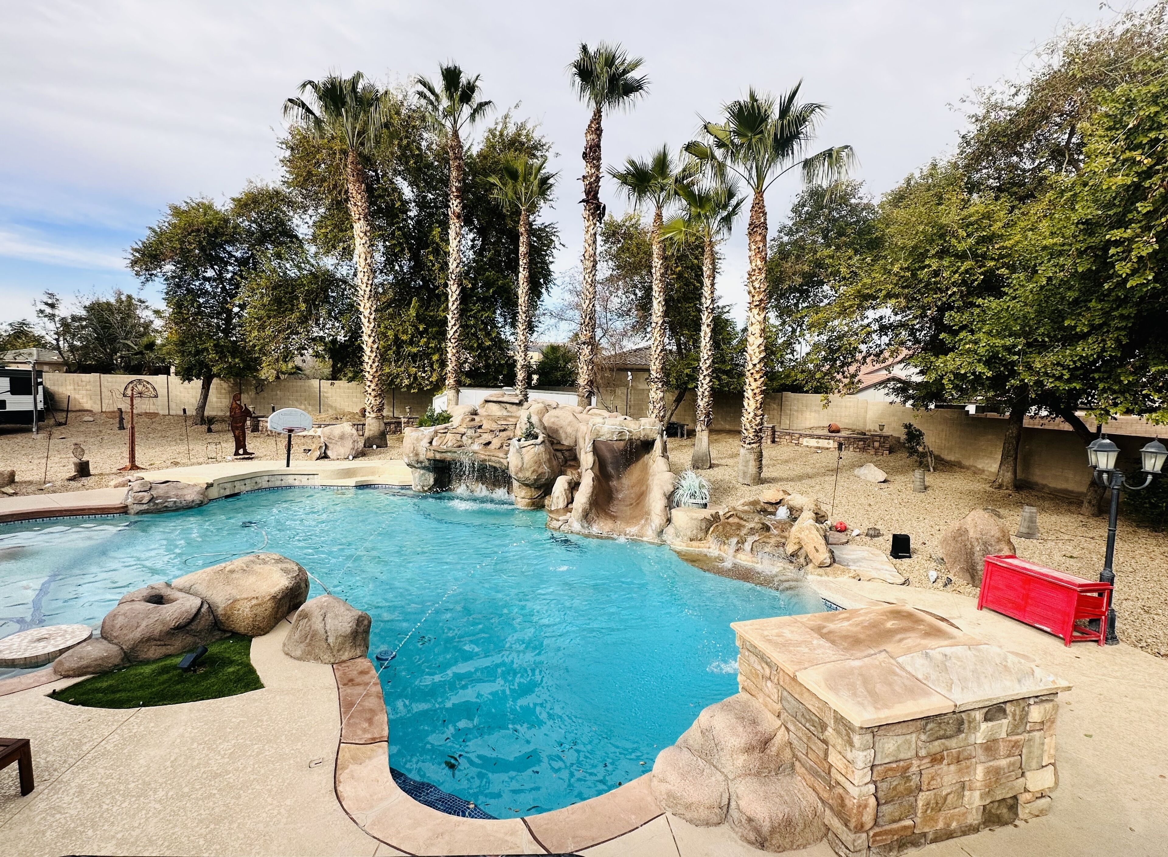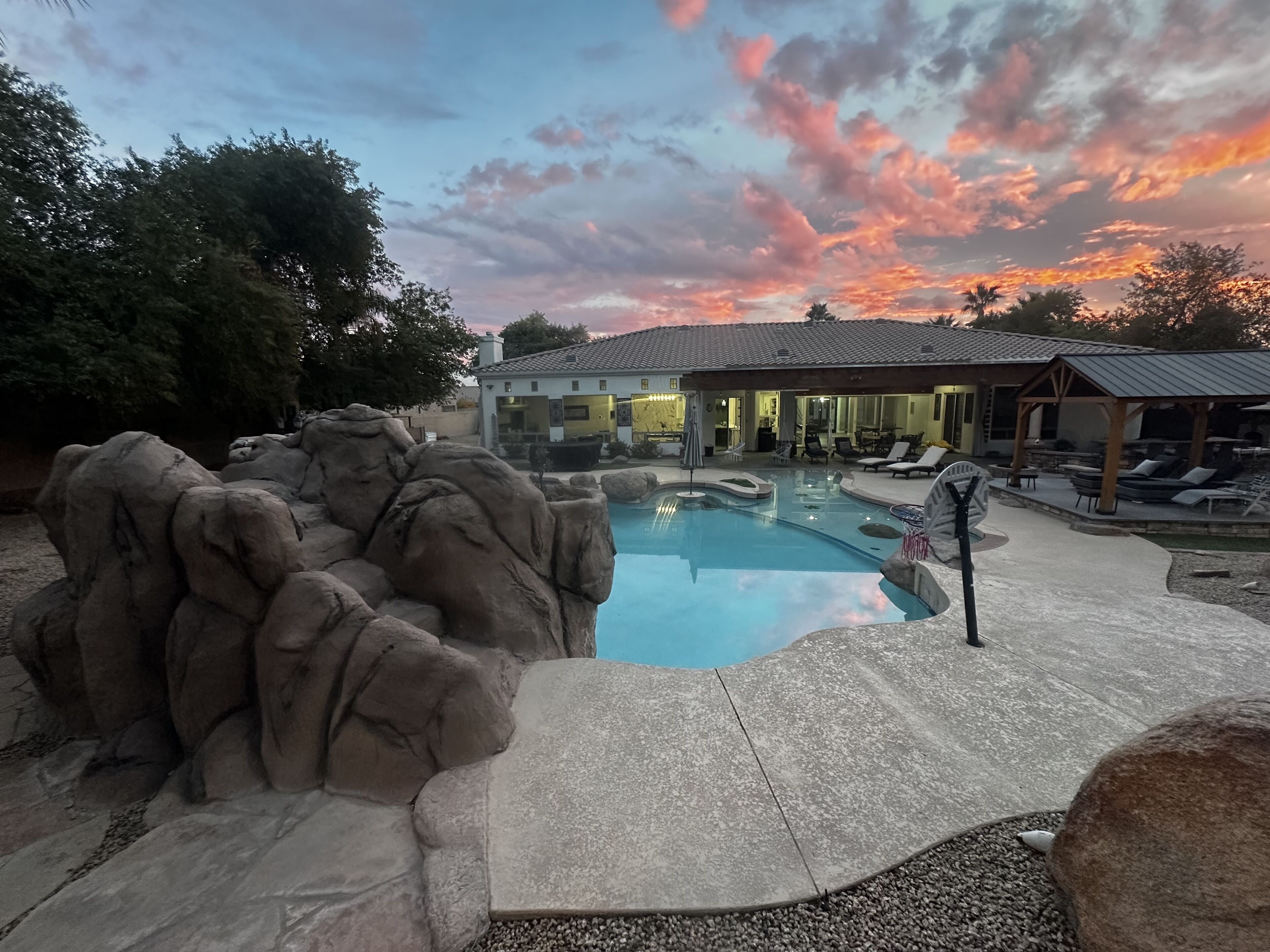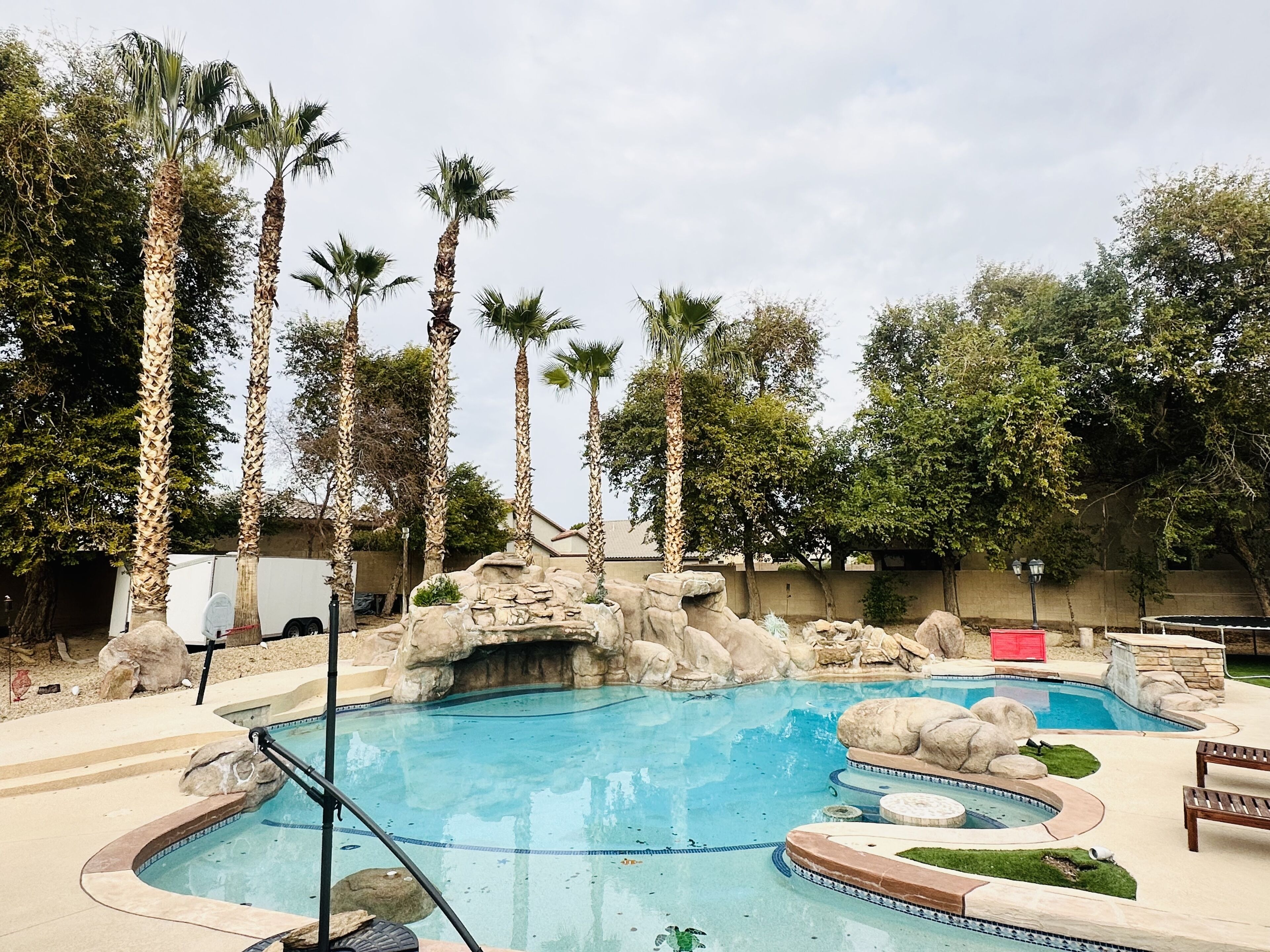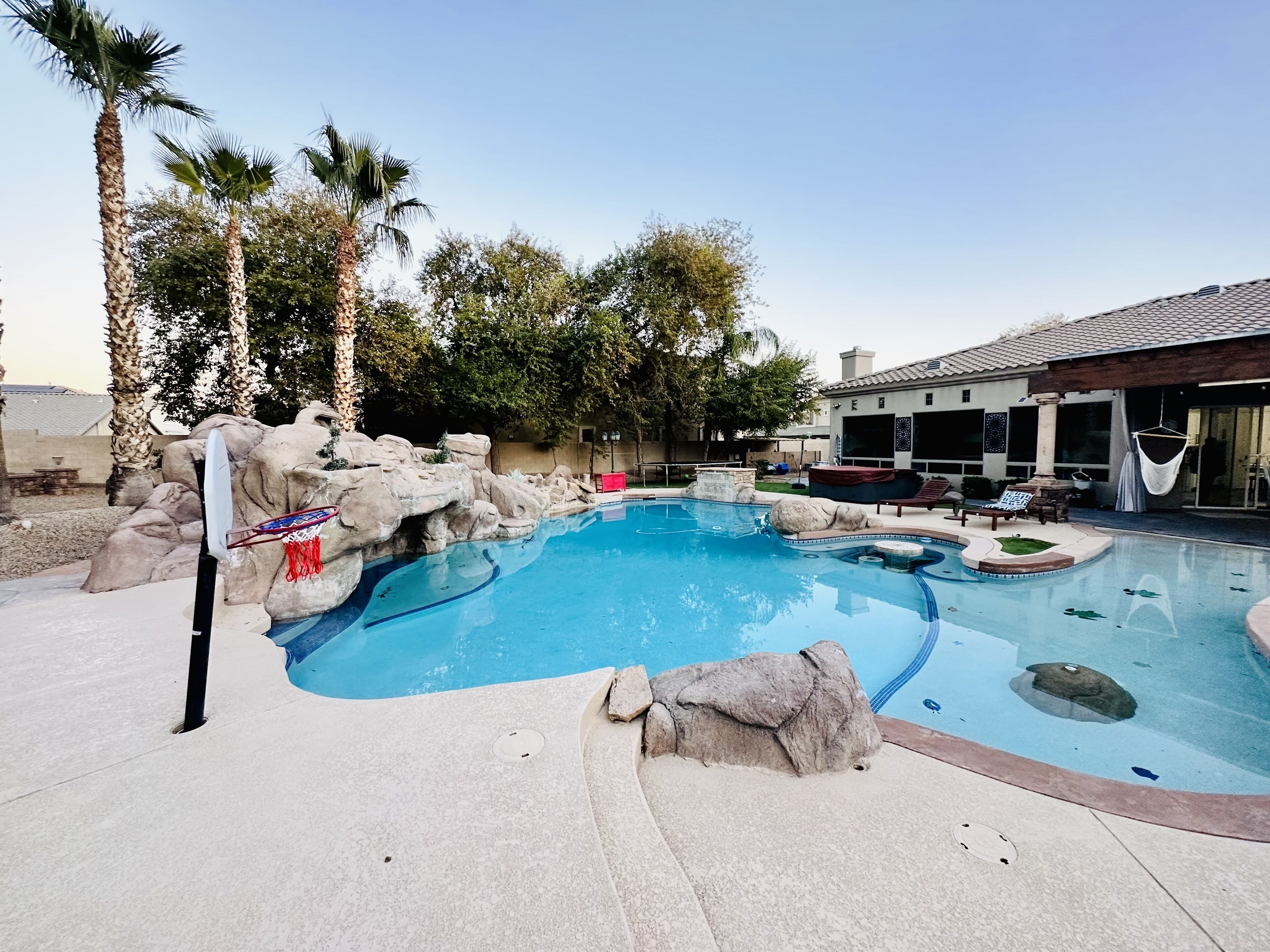 AMAZING CUSTOM HOME - OASIS RESORT STYLE POOL Sleek, sophisticated, and ready to host your next Litchfield Park soirée, this well-appointed vacation rental is just what you’re searching for! Play a round of golf or visit the LA Dodger's & White Sox Camelback Ranch Ballpark in Glendale - all within minutes of this property - before heading back to your home-away-from-home to cool down in the private pool & jacuzzie, complete with waterfalls, jumping rocks and a water slide! Sip a cocktail on the covered patio with and outdoor dinning area before you gather around the fireplace with loved ones. With 4 bedrooms + den and 4 baths, this prime spot has it all!This Arizona home is the ideal spot for large families, sports enthusiasts, and those simply wanting to lounge poolside without sacrificing any at-home comforts and conveniences!-This spectacular custom home on 1 acre lot is located in one of the best areas in west Phoenix. This is a super luxury residence, perfect for a family or friends get together.Huge outdoor living space that includes a pool, outdoor kitchen really nice BBQ area, Gazebo, and fireplace.Bedroom 1: King Bed Bedroom 2: Queen Bed Bedroom 3: Queen Bed Bedroom 4: Full Bed & Bunk BedsDen: 1 Futon Additional Sleeping: 2 Queen Air MattressUp to 12 GuestOUTDOOR SPACE: Pool, yard games, beach chairs, gas grill w/ prepping station, mini-fridge, outdoor dining, patio furnitureINDOOR LIVING: 3 Smart TVs, board games, fireplace, laptop-friendly workspace and a huge game roomKITCHEN: Fully equipped w/ cooking basics, dishware/flatware, Crock-Pot, blender, hot water pot, ice maker, coffee potGENERAL: Free WiFi, washer/dryer, linens/towels, complimentary toiletries, central air conditioning/heat, hair dryers,FAQ: quiet hours (10:00 PM - 6:00 AM), pool depth (3' - 6'5), optional daily pool heat fee (paid pre-trip, applied to entire stay, Sept-May)PARKING: Driveway (8 vehicles), garage (2 vehicles)-- THE LOCATION --Only 9 Minutes from State Farm stadium-super bowlOnly 5 min from the LA Dodgers Spring TrainingOnly 9 min from WestGate EntertainmentOnly 7 min from Top golf, Wigwam golf, Shops, Restaurants & many more attractions.OTHER ATTRACTIONS: Wildlife World Zoo, Aquarium & Safari Park (5 miles), Desert Diamond Casino - West Valley (11 miles), Castles N’ Coasters (25.0 miles), Japanese Friendship Garden of Phoenix (24.2 miles), Phoenix Speedway (34.0 miles), Butterfly Wonderland (37.6 miles)SPRING TRAINING: Camelback Ranch LA Dodgers & White Sox (4 miles)Surprise Stadium (11 miles)Peoria Sports Complex (12 miles)Goodyear Ballpark (9 miles)GOLFING: Grandview Golf Course (7 miles), Sun Village Golf Course (8 miles), Pebble brook Golf Course (7 miles), Cimarron Golf Course (7 miles), Riverview Golf Course (9 miles), Sun City North Golf Course (14 miles), Falcon Dunes Golf Course (16 miles), Pueblo El Mirage Golf Course (9 miles)HIKING TRAILS: White Tank Mountain Regional Park (10 miles), Vietnam Veterans Memorial Trailhead (14 miles), Mesquite Canyon Trail (15 miles), Desert Vista Trailhead (24 miles), Shaw Butte Trailhead (25 miles), Hole in the Rock (28 miles), Apache Wash Trailhead (32 miles), Echo Canyon Recreation Area (36 miles)AIRPORT: Phoenix Sky Harbor International Airport (24 miles)-- POLICIES --- No smoking- No pets allowed- No events, parties, or large gatherings. We have a caretaker just in case of any emergency. The caretaker is on a RV Trailer right next to the house and guest don't have any access to this side of the property and caretaker has no access to the house or any area of the primary residence either. We have a huge 1 acre lot. - Must be at least 21 years old to book- Photo ID may be required upon check-in- NOTE: Please observe quiet hours from 10:00 PM to 6:00 AM- NOTE: There is an optional daily pool heat fee of $150 + fees & taxes, paid pre-trip, applied to entire stay (Sept-May)-NOTE: The maximum number guests allowed is 12 people. Guests #11 and #12 will have an extra fee of $40 per person/per night (including any individuals who do not stay in the house)