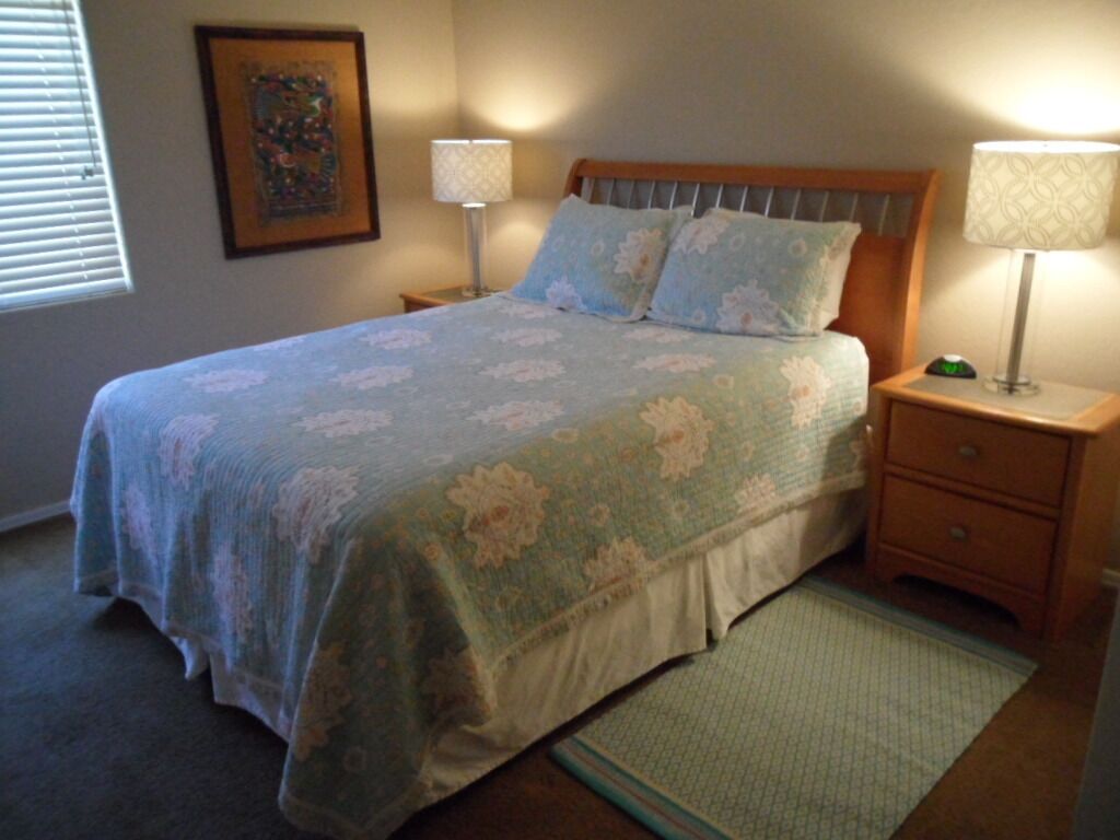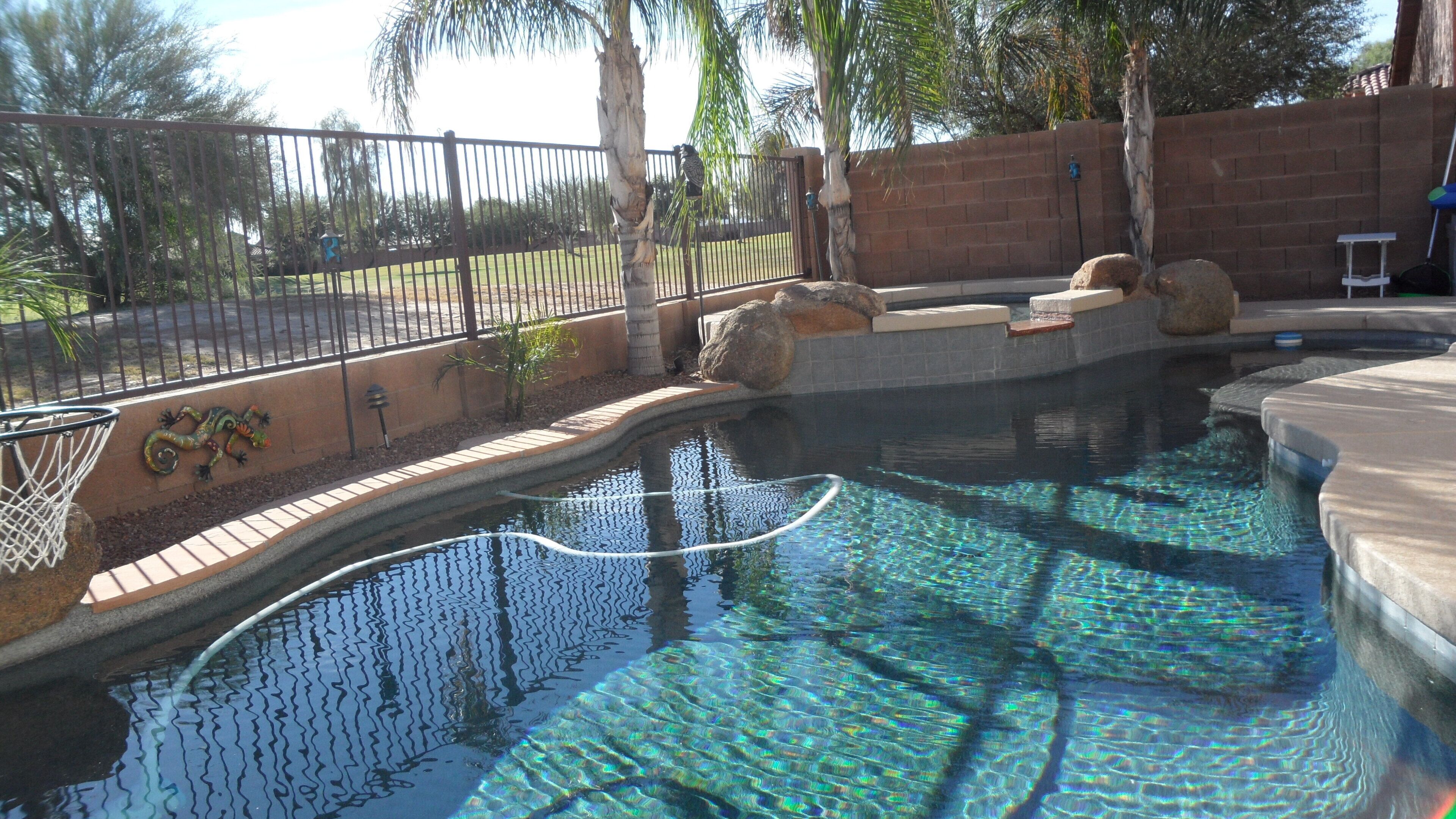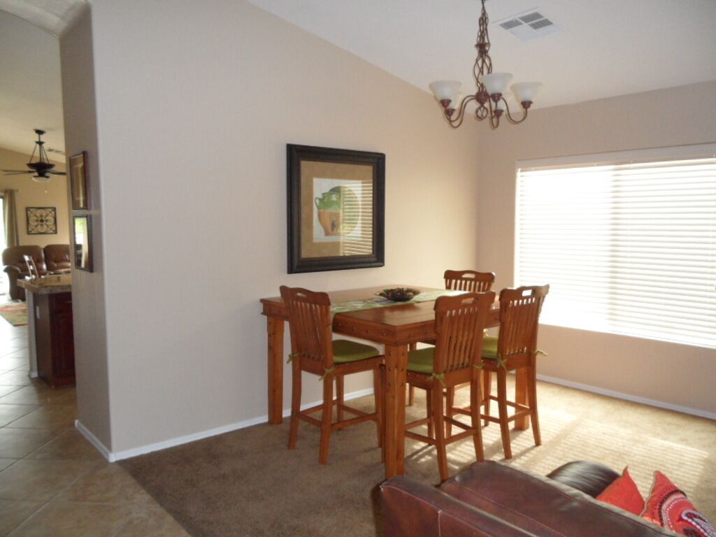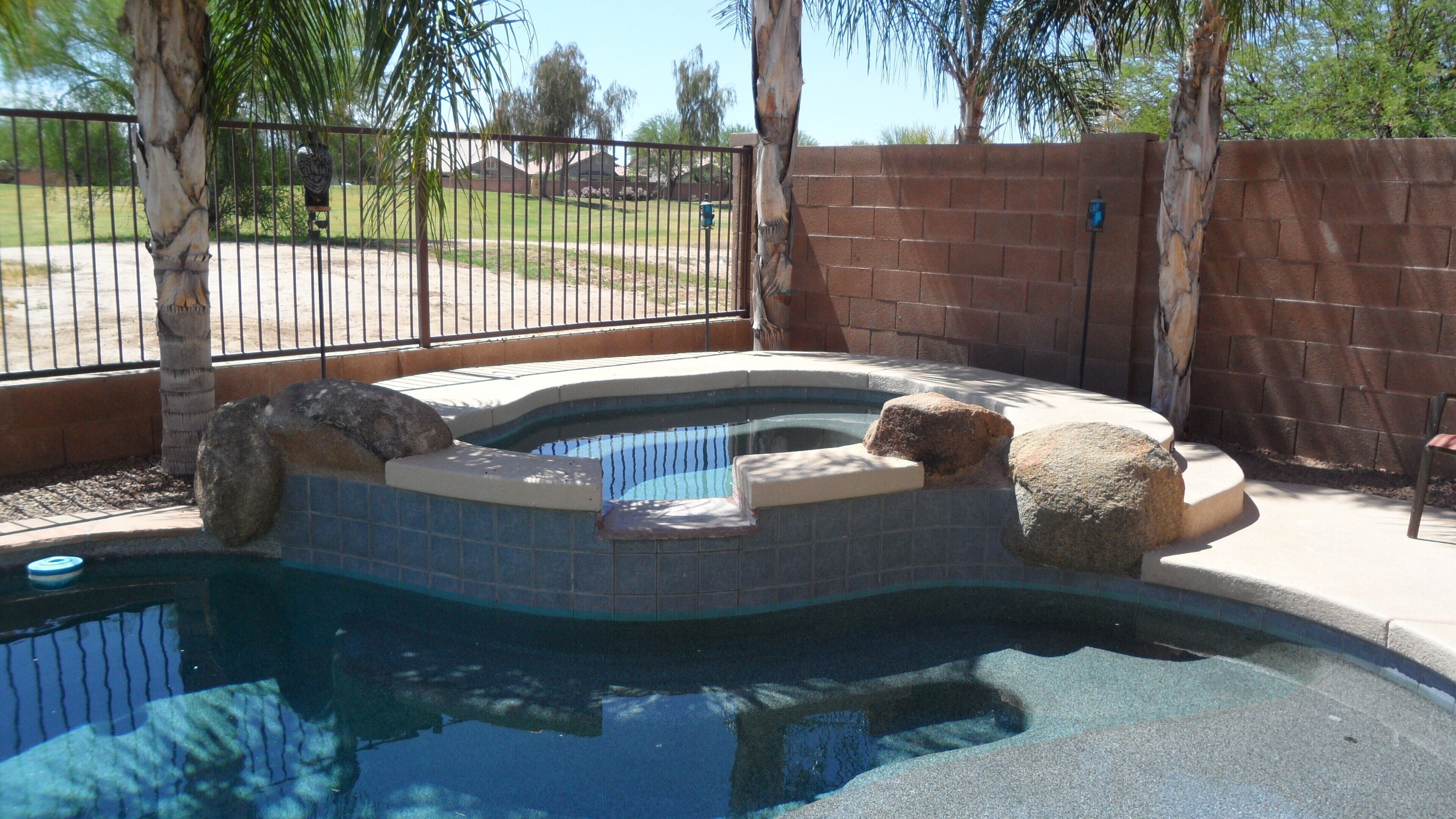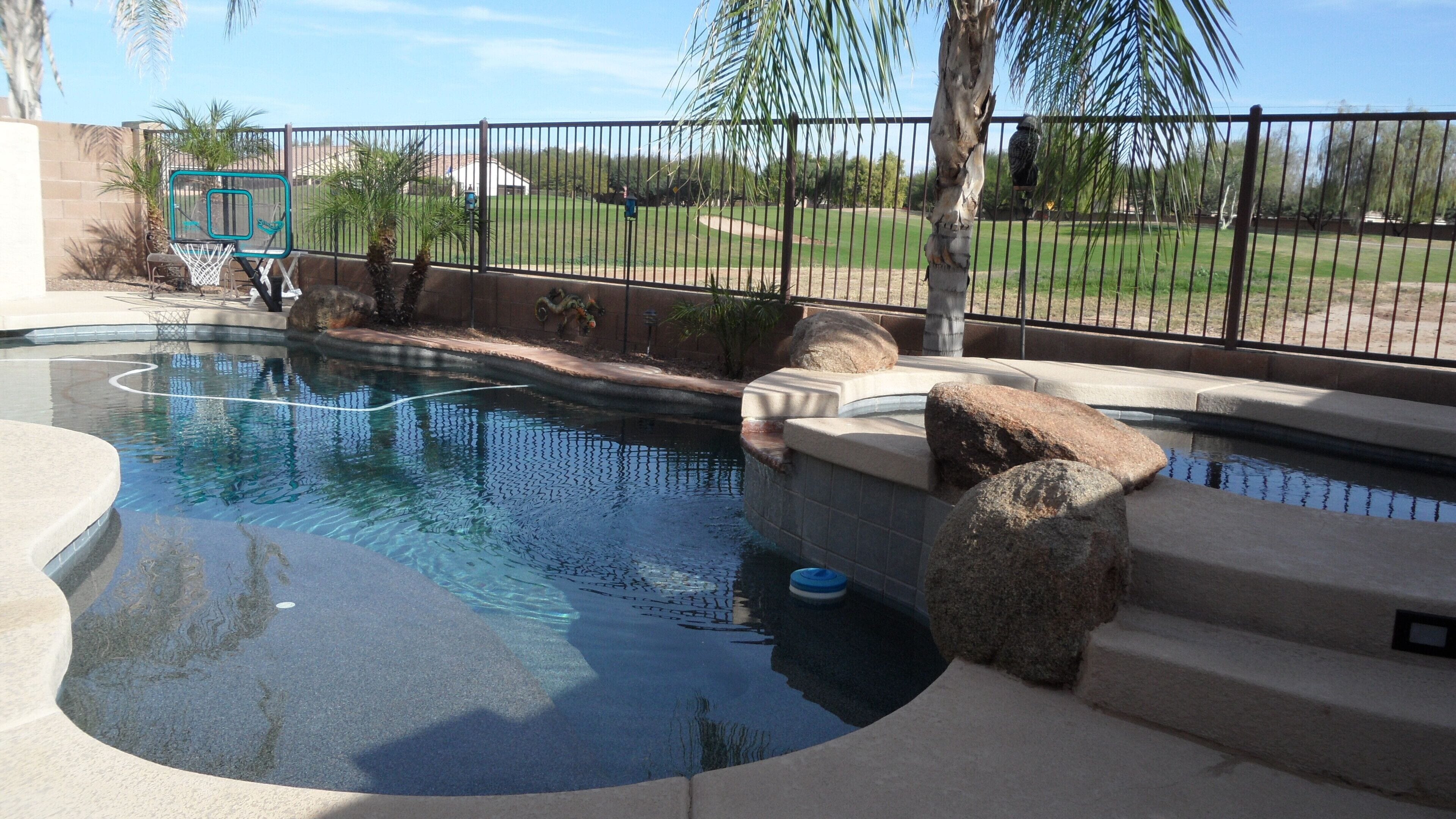 Beautiful Home with Heated Pool/Spa on Golf Course near Bell Bank Park Premium Golf Course lot, this fully stocked home has separate living, family and dining rooms. Four bedroom home with high quality mattresses: one king bed, two queen beds, and set of twin beds, sleeps 8 comfortably. Attractive, fully stocked kitchen with granite countertops and stainless steel appliances. Living room and family room both have HDTV's w/COX cable. Outdoor patio with Weber natural gas BBQ and comfortable metal rocking patio chairs with table. Beautiful heated peeble tec pool/spa with oversized step down entry and night lighting. Palm trees around pool/spa have landscape lighting for evening enjoyment. Pool floating loungers provided for your relaxation. Beach towels are also available. Great quiet, friendly, safe neighborhood for your relaxation. Free access to The Villages year round heated pool, lighted tennis courts and fitness center. Gate opener for these facilities provided with rental. Great location for shopping and dining out. There are a large number of golf courses in the Queen Creek area for your enjoyment.