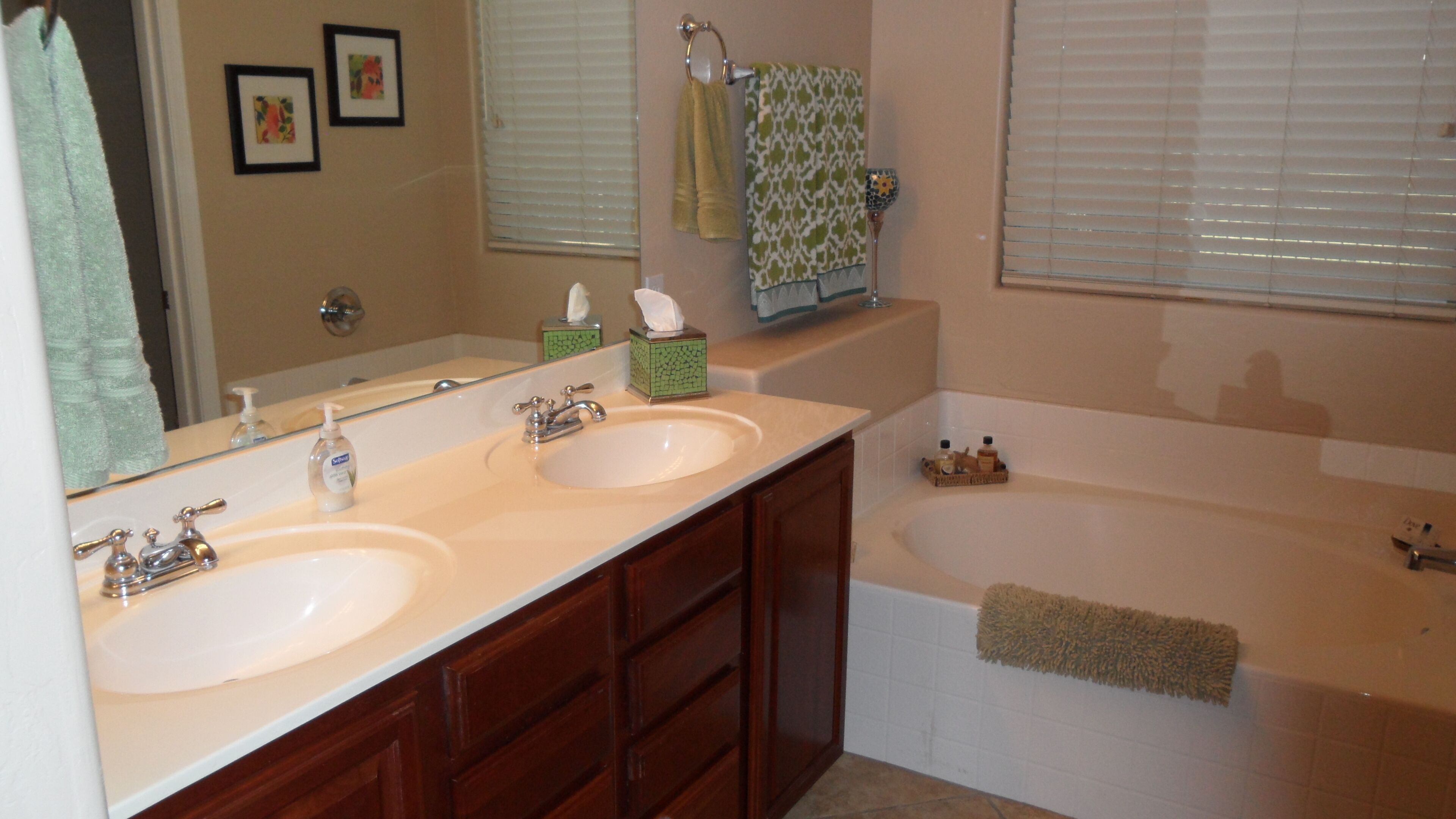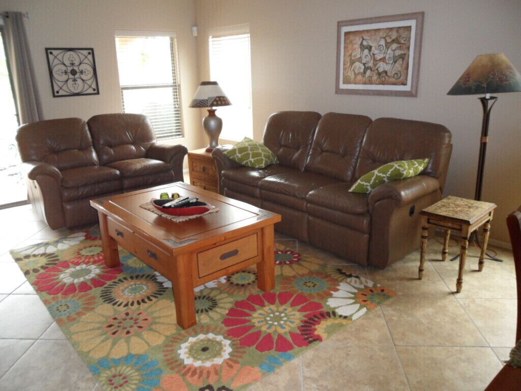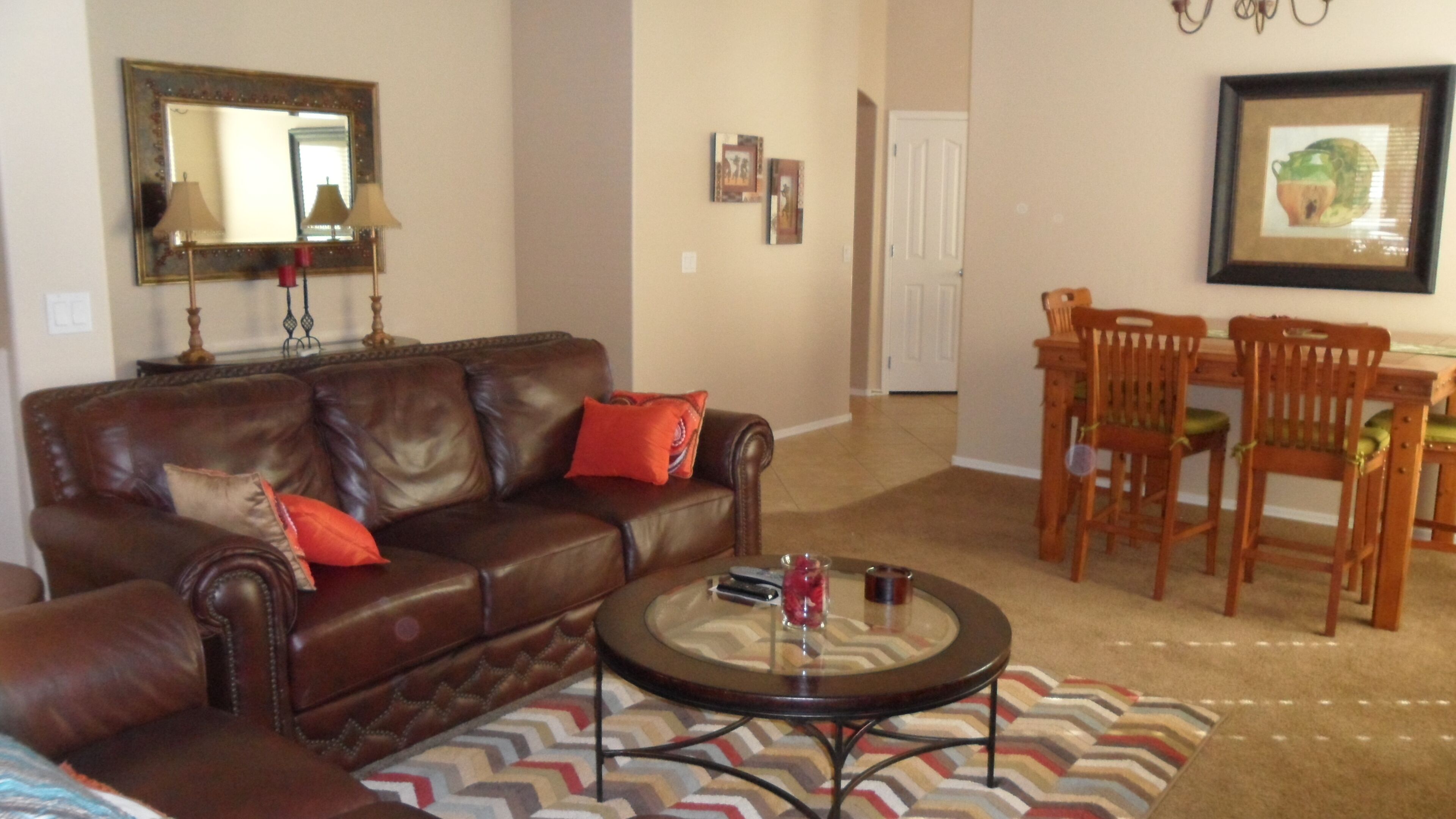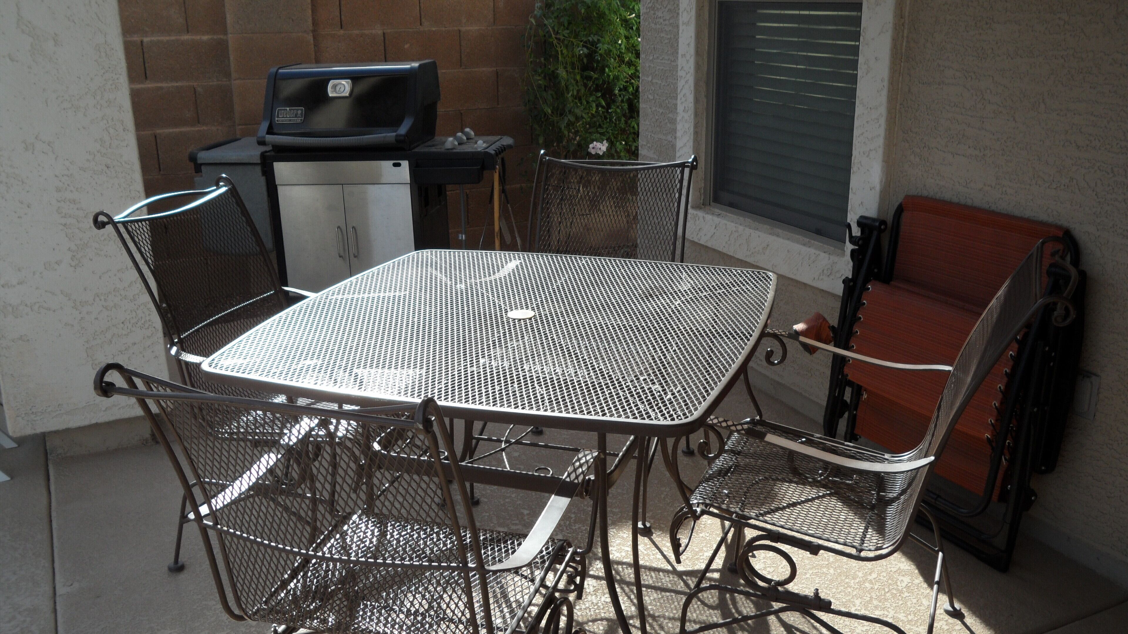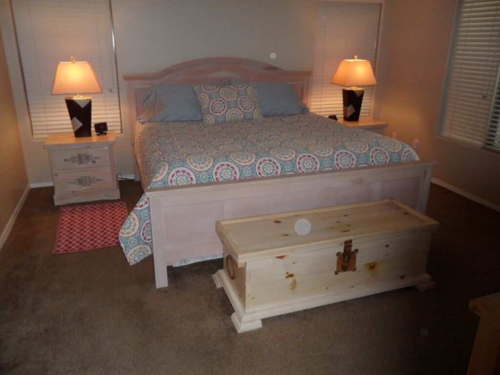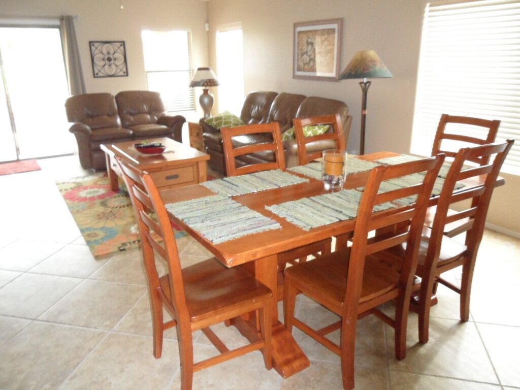 Beautiful Home with Heated Pool/Spa on Golf Course near Bell Bank Park Premium Golf Course lot, this fully stocked home has separate living, family and dining rooms. Four bedroom home with high quality mattresses: one king bed, two queen beds, and set of twin beds, sleeps 8 comfortably. Attractive, fully stocked kitchen with granite countertops and stainless steel appliances. Living room and family room both have HDTV's w/COX cable. Outdoor patio with Weber natural gas BBQ and comfortable metal rocking patio chairs with table. Beautiful heated peeble tec pool/spa with oversized step down entry and night lighting. Palm trees around pool/spa have landscape lighting for evening enjoyment. Pool floating loungers provided for your relaxation. Beach towels are also available. Great quiet, friendly, safe neighborhood for your relaxation. Free access to The Villages year round heated pool, lighted tennis courts and fitness center. Gate opener for these facilities provided with rental. Great location for shopping and dining out. There are a large number of golf courses in the Queen Creek area for your enjoyment.