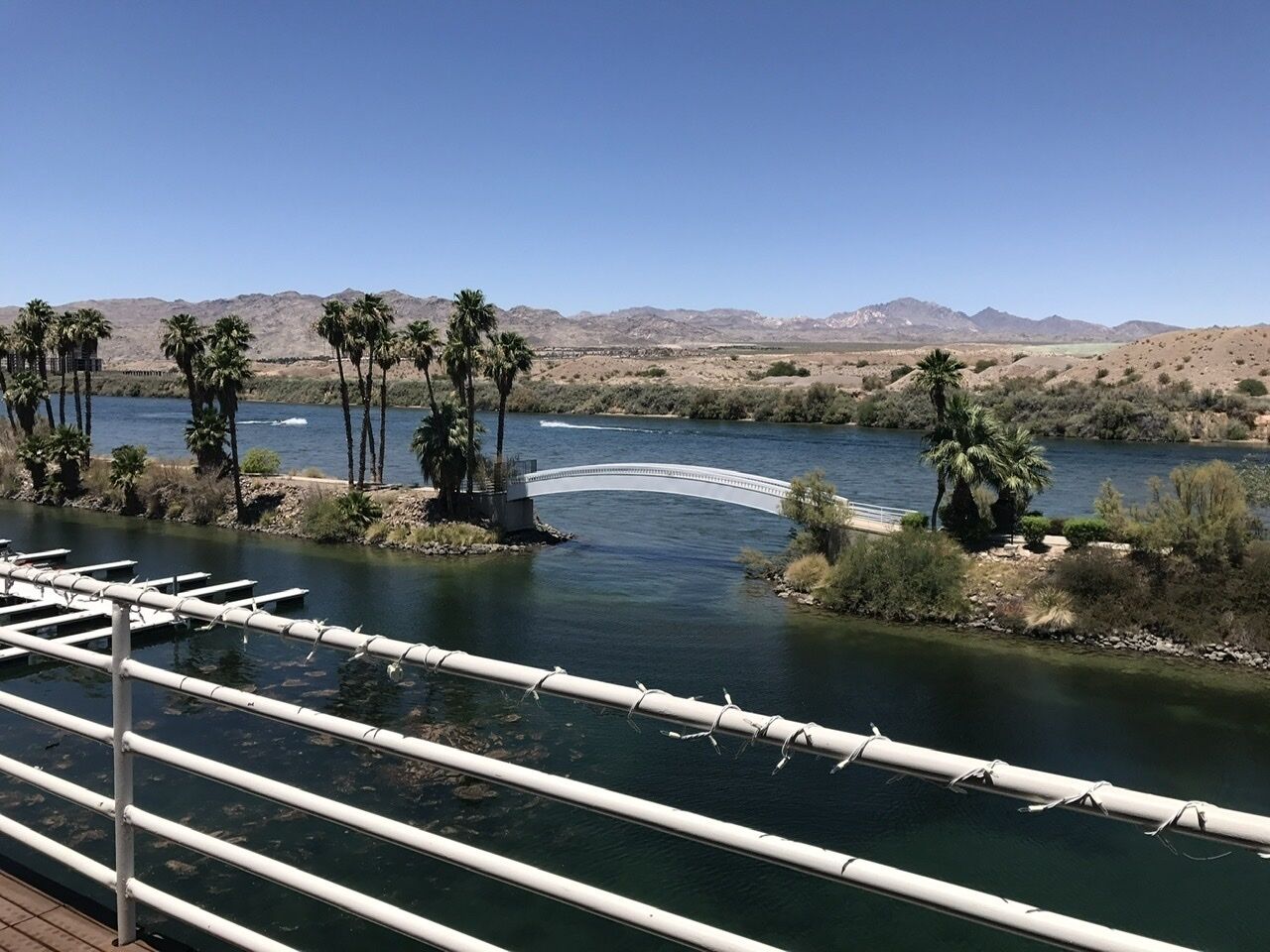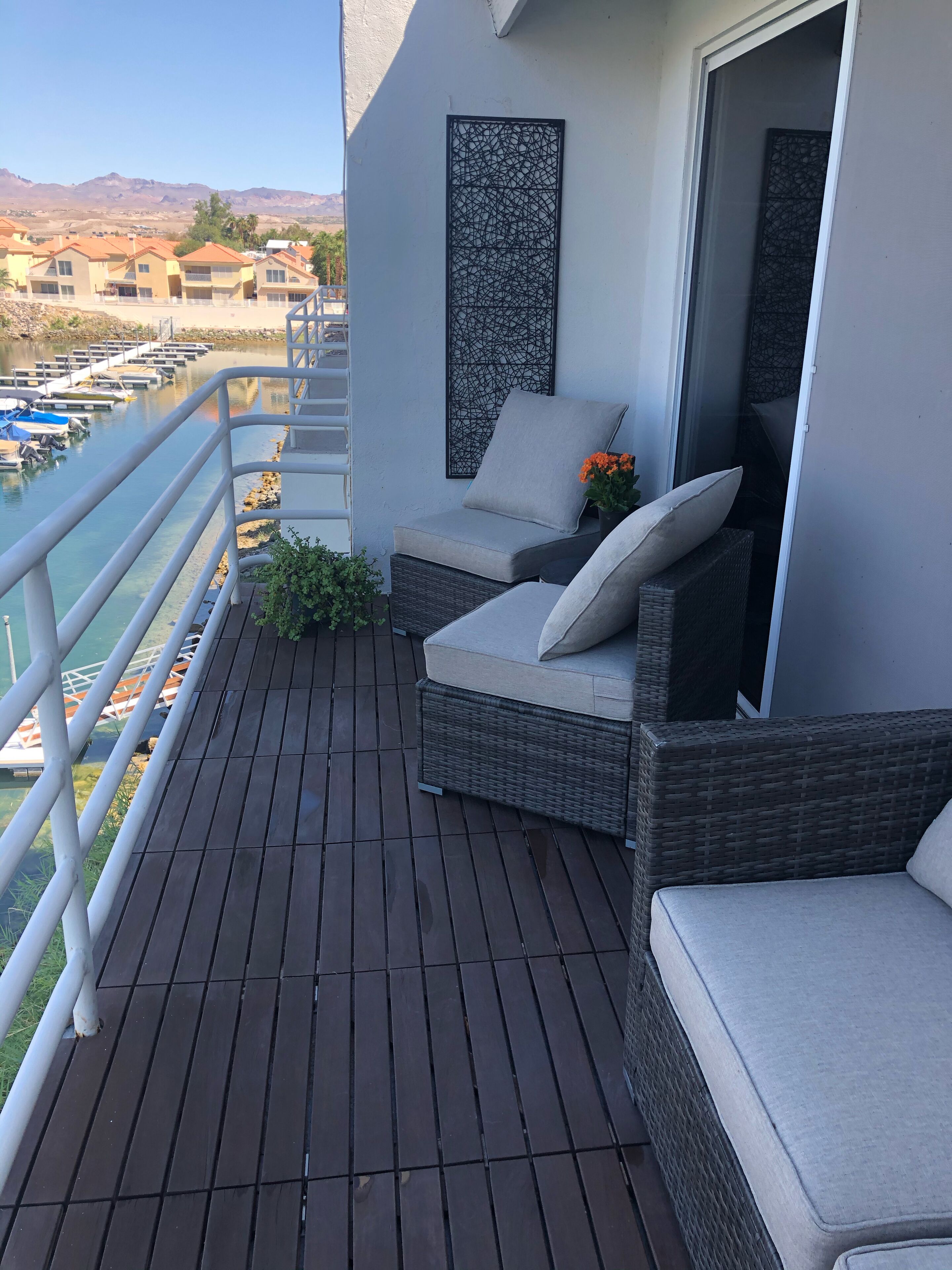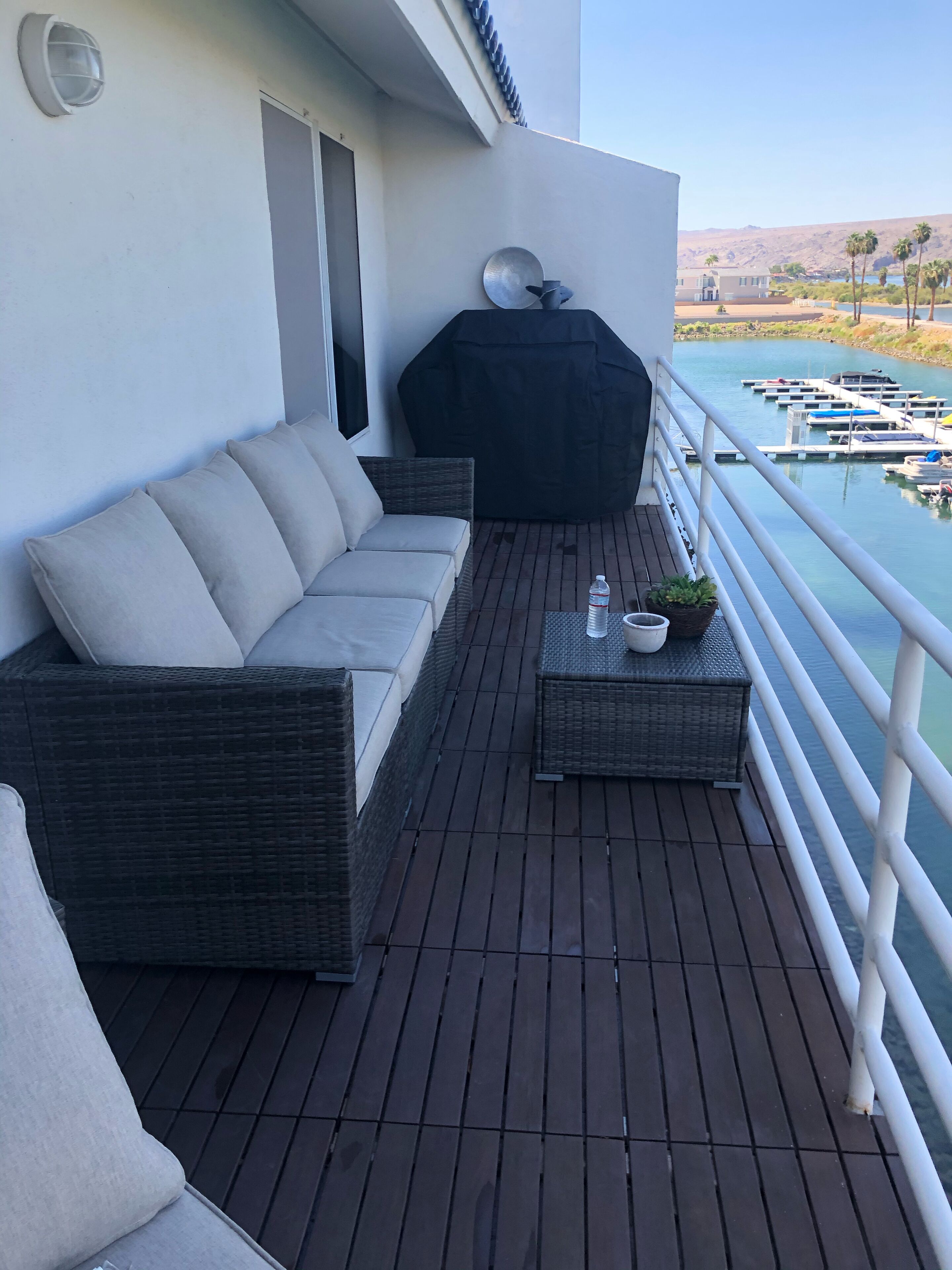 Colorado River water front oasis Come experience contemporary living on the Colorado River, where you can unwind and relax at Arizona’s premier gated community. Centrally located this newly remodeled 2 bdrm/2 bath condominium on the water, is just minutes from stores, restaurants and Laughlin Nevada casinos. When first entering the unit will be wowed by the open spaced, unobscured views of the Colorado river. The main living space, living room, dining room and kitchen are designed for entertaining and maximizing river views. Step out onto the decking of the spacious 6’x40’ outdoor balcony. Fully equipped with bbq grill, sofa, tables and seating area. Relax and enjoy the incredible views, sounds and smell of the Colorado River, surrounding landscape and variety of amazing wildlife. In this uniquely designed unit enjoy curling up on the large down feather sectional in front of the wood burning fireplace. A large flat screen tv with internet, WiFi and Bose surround system are provided for your pleasure. In the dining room the table easily seats 10 people. A large wall chalk board lends its self to a fun night of games. Along side the kitchen a long counter/bar space seats 5 additionally. The kitchen boasts a wine bar, coffee bar, dishwasher drawer, microwave and a large capacity stainless French door refrigerator. With tons of storage it comes complete with everything you need for entertaining or just a quiet night in. Various small appliances toaster, crockpot, fondue’s, cook and bake ware, utensils, dishes and spice pantry. With a full bar find everything you need to make that favorite cocktail. Down the hall a double door storage and laundry closet store a large capacity front load stackable washer and dryer. The two spa inspired bathrooms are complete with luxury towels, spa robes and slippers, great for when your headed to the hot tube. Pool/ beach towels are provided as well. The master bedrooms king size mattress is dressed with luxury linens and bedding to maximize your comfort, a large his and her closet, large full motion flat screen smart tv and portable Bose system are provided. The smaller guest rooms queen size is also dressed with quality linens and bedding for that great nights sleep. A large closet and flat screen smart tv provided. A large wall to wall bookcase complete with various books and magazines are provided for your reading pleasure. Outside take advantage of that beautiful Arizona weather. With our private marina on the river you can enjoy swimming, fishing, jet skiing. Kayaking or boating. A private boat slip is available for an additional fee. Enjoy meeting and making new friends at any of the private four pools or three spas within the gated complex. No pets allowed in this non smoking unit. Thank you for viewing my property.MichelleI can be reached directly at:562 477-6679