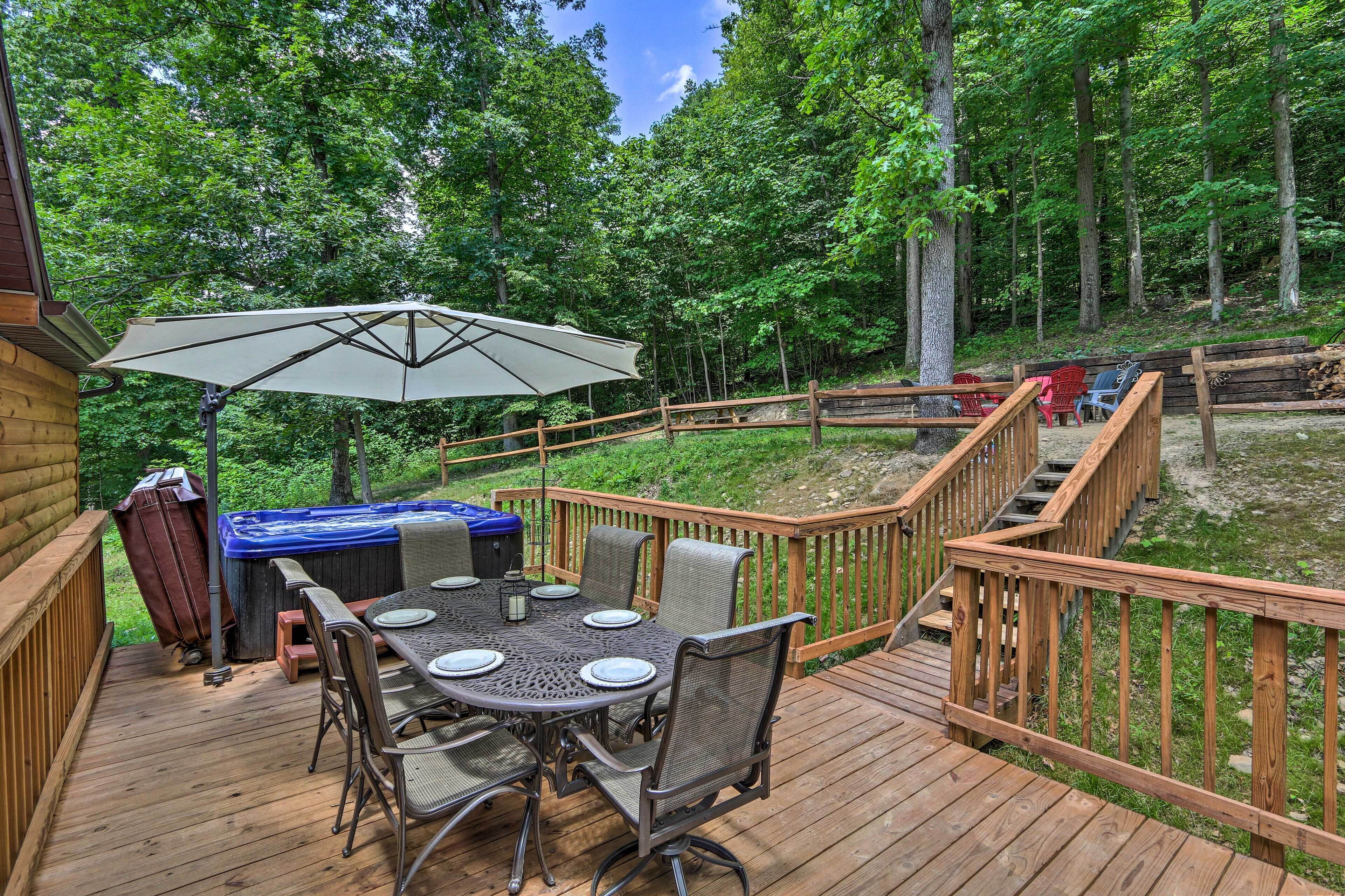 Butler Cabin on 19 Acres w/ Hot Tub & Fire Pit! Find solace in the forest with a trip to this Butler cabin, where you’ll have at-home comforts and easy access to the area’s best trails and treks! The 3-bedroom, 3-bath vacation rental is bursting with family-friendly entertainment, from the interior game room and Smart TV to the deck’s private hot tub and grill. Spend days exploring the scenic Mohican-Memorial State Forest and Park by foot, bike or boat, then return home to roast s’mores by the fire pit and revel in the serenity of rural Ohio!-- THE PROPERTY --2,420 Sq Ft | Private Hot Tub | Spacious Deck | Fire Pit (Firewood Provided)Disconnect from daily stress and recharge with your loved ones in the newly built 'Sugar Hill' cabin, offering all the comforts of home with the added peace and comfort of the great outdoors!Bedroom 1: King Bed | Bedroom 2: King Bed | Bedroom 3: King/Queen Bunk Bed | Additional Sleeping: Queen Air MattressOUTDOOR LIVING: 19 acres of private wooded surroundings, furnished deck, gas grill, fire pit w/ seating, hot tubKITCHEN: Well-equipped w/ cooking basics, refrigerator, stove/oven, microwave, blender, drip coffee maker, high-top dining tableINDOOR LIVING: Recent updates, fireplace, Smart TV, game room w/ darts, foosball & card table, 2 en-suite baths w/ dual-head walk-in showers, rolling garment rack & boot/glove dryer (upon request)GENERAL: Central A/C & heat, iron & board, basic toiletries, linens, towels, hair dryers, free WiFiPARKING: Steep gravel driveway (4 vehicles)-- THE LOCATION --AREA ACTIVITIES: Canoeing, kayaking, rafting, hiking, biking, fishing, motorsports, tubing, golfing, horseback ridingPARKS & FORESTS: Mohican-Memorial State Forest (5.6 miles), Malabar Farm State Park (6.3 miles), Pleasant Hill Lake Park (7.1 miles), Mohican State Park (7.8 miles), Ariel-Foundation Park (20.1 miles)ATTRACTIONS: Mohican Adventures Canoe Livery & Fun Center (8.4 miles), Richland Carrousel Park (16.3 miles), Bridge of Dreams (18.2 miles), Ohio Bird Sanctuary (20.8 miles), Ohio State Reformatory (23.0 miles)LOCAL EATS: Five Points Drive In Ice Cream & Dairy Bar (2.9 miles), Ducky’s Pub & Grill (2.9 miles), Whiffletree (3.0 miles), Fast Eddie’s Pizza (8.7 miles), Wedgewing Family Restaurant (9.0 miles)AIRPORT: John Glenn Columbus International Airport (71.7 miles)-- REST EASY WITH US --Evolve makes it easy to find and book properties you'll never want to leave. You can relax knowing that our properties will always be ready for you and that we'll answer the phone 24/7. Even better, if anything is off about your stay, we'll make it right. You can count on our homes and our people to make you feel welcome — because we know what vacation means to you.-- POLICIES --- No smoking- Please note: There will be a $250 fee for deep cleaning due to smoking inside the property. There will be a $100 fee for evidence of smoking outdoors on the property.- No pets allowed. If you will be bringing a certified service animal, we kindly request you inform the Guest Contact so the property can be cleaned accordingly after your stay- No events, parties, or large gatherings- Must be at least 25 years old to book- Additional fees and taxes may apply- Photo ID may be required upon check-in- NOTE: Your safety matters. This property features 2 exterior security cameras, both pointing at the front driveway entrance. They do not look into interior spaces