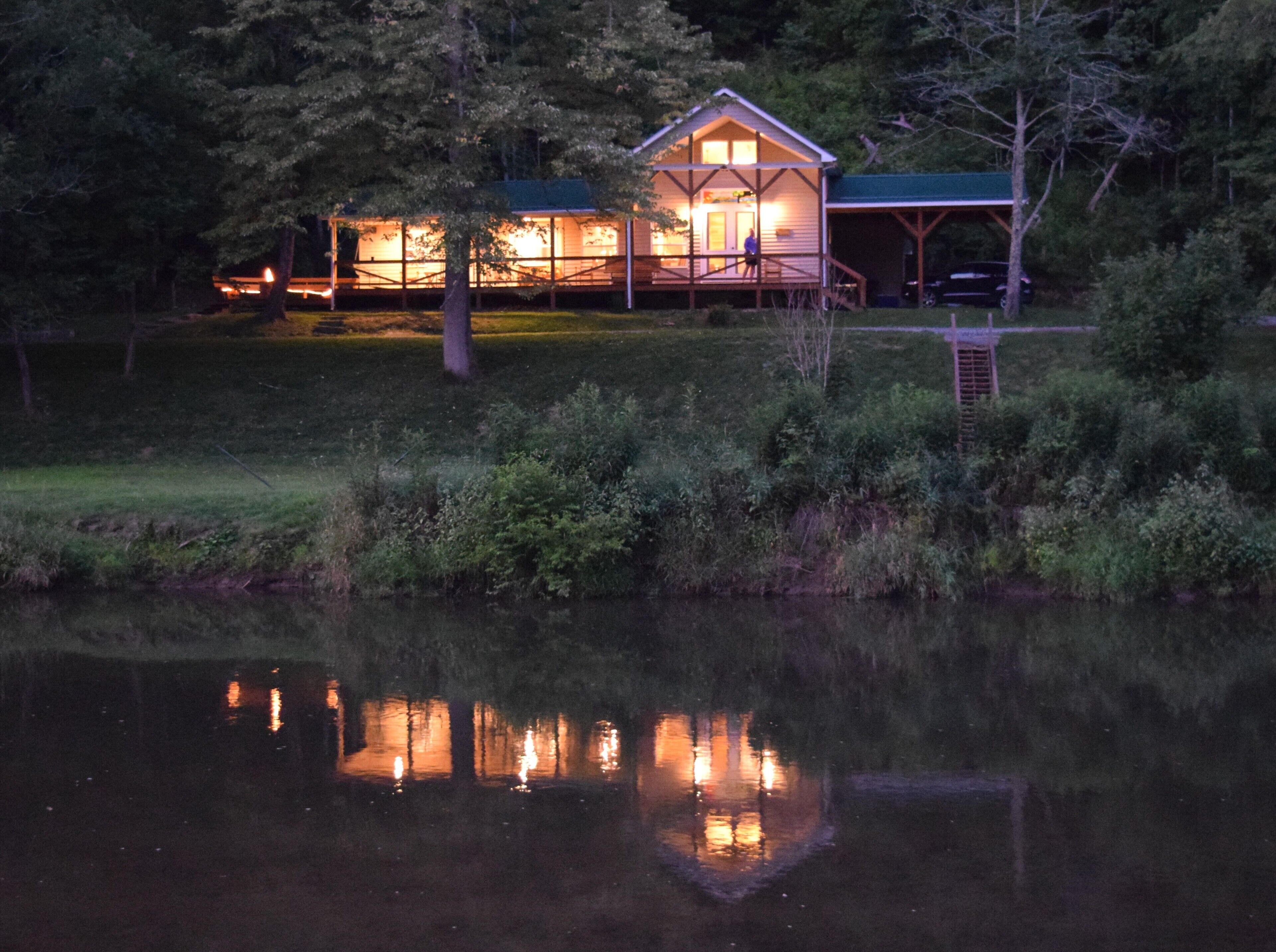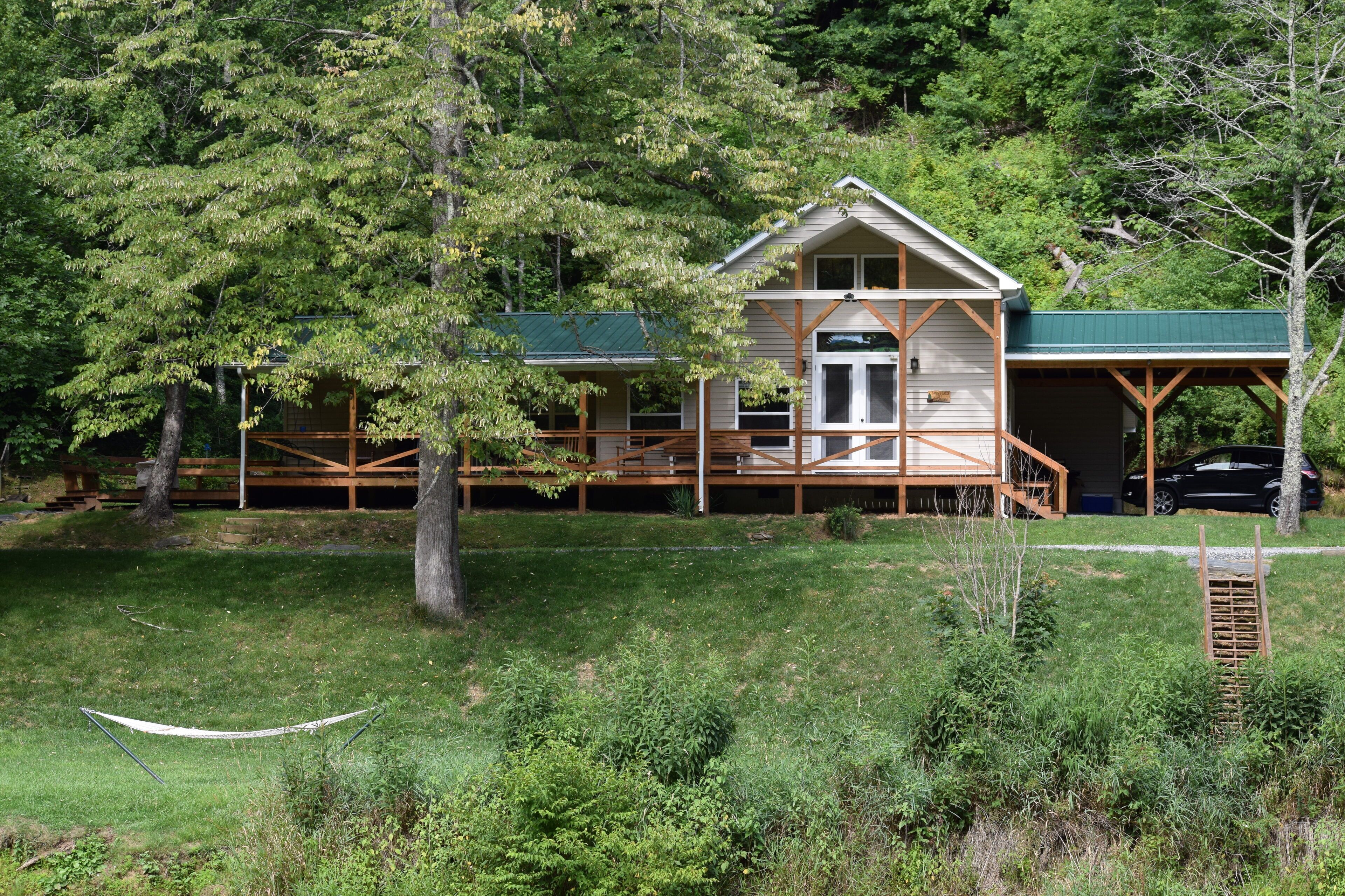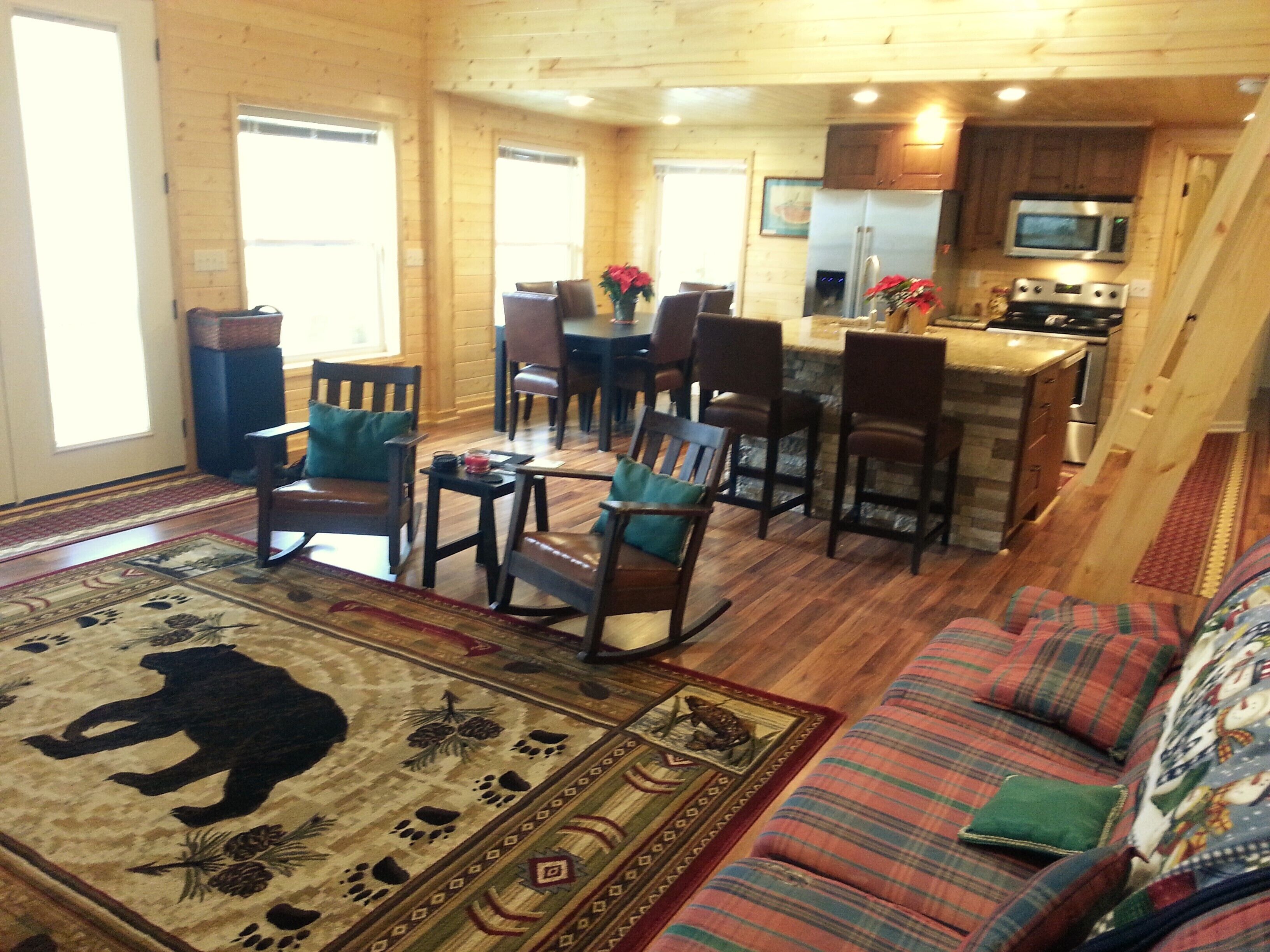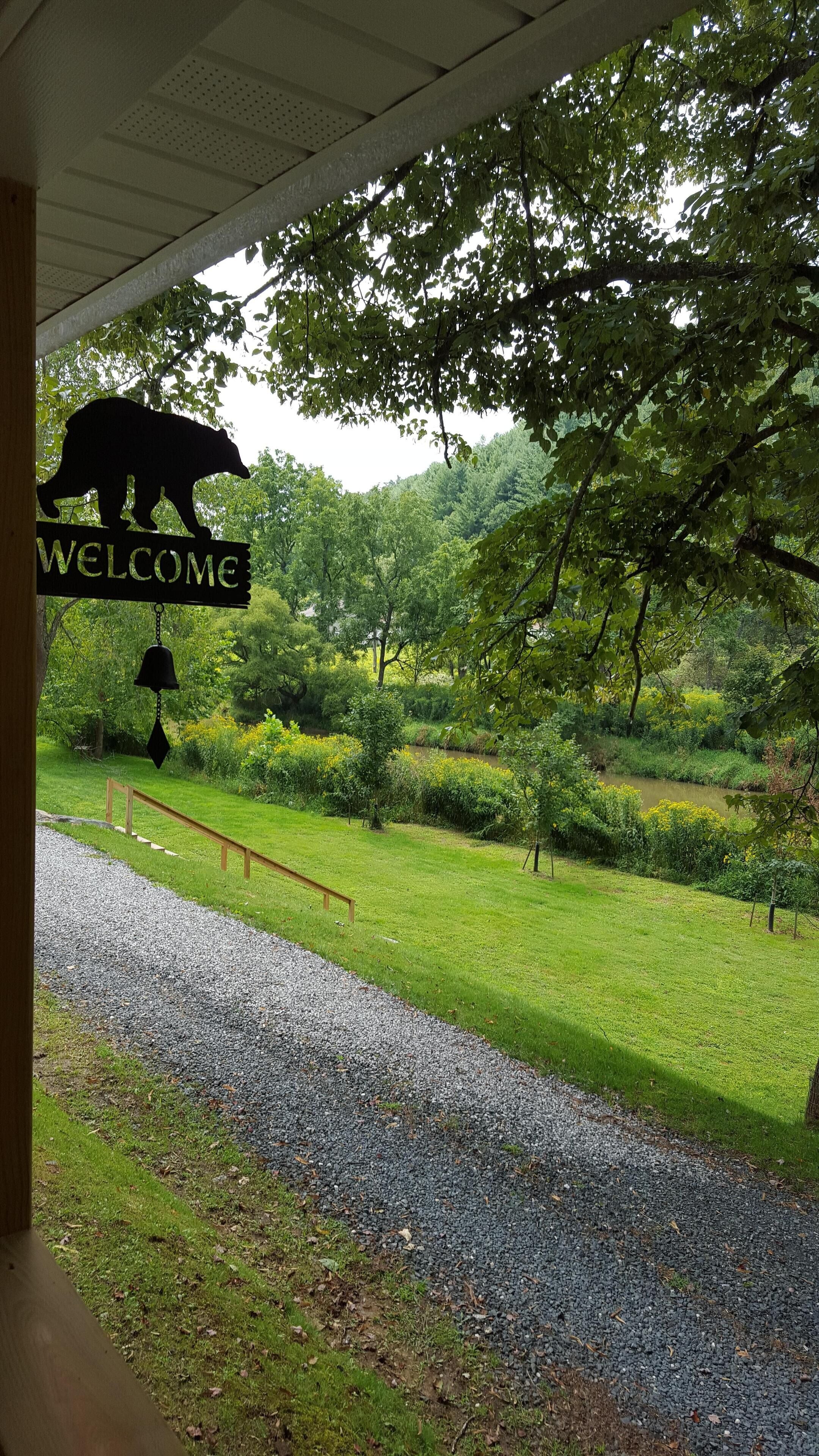 The Cabin- Riverside Cabin Perfect For Your Family Getaway Before you read anything here, scroll down and look at the second picture. It is the view of the North Fork of the New River in the front yard of The Cabin. When we are at The Cabin, we spend as much time as possible on our wonderful front porch- rocking, swinging, eating, roasting s’mores around the fire pit, warming up in the hot tube, napping in the hammock, or waving at people drifting by in the beautiful New River. When nighttime comes, we move inside to the great room and light the fireplace. The rustic chandelier lights the cathedral ceiling and the beautiful wood floors, walls and ceilings. Our family enjoys the evenings listening to beautiful music and playing games with friends, but the wifi is available if we simply have to check emails or want to watch a movie. A fully stocked kitchen allows plenty of room to make a quick snack, or a family feast. When it is time for bed, the master suite has a king bed with ensuite bathroom with a walk in shower. A second bathroom has a Jacuzzi bathtub to enjoy. Three other bedrooms offer a king bed, king day bed, and rear room with bunk single beds, and a full bed. Back over the great room is a loft bedroom (open to great room). The ladder up to the loft is sturdy and an easy climb up to two more double beds. The kids always fight to see who gets to sleep in the loft. When morning comes, everyone is ready to hit the river. The North Fork of the New River is literally in the front yard. The river is about 40 feet wide in front of the cabin, but only a few feet deep. For those wishing more adventure than fishing, swimming around and skipping rocks, tubing is always an option. If shopping is more your speed, West Jefferson and Jefferson are about a 15 minute drive. The Ashe County Cheese Factory, art galleries, fresco churches and shops are great fun. We even have a hard apple cider cidery nearby in Lansing. If hiking is more your speed, the possibilities in the area are endless. For bikers, the top of the Virginia Creeper trail at White Top is only 30 minutes away. Vacations are about making memories with the people you love. Our family has enjoyed The Cabin for many years, and now that we have renovated it, we enjoy sharing it with friends. We look forward to sharing it with you.