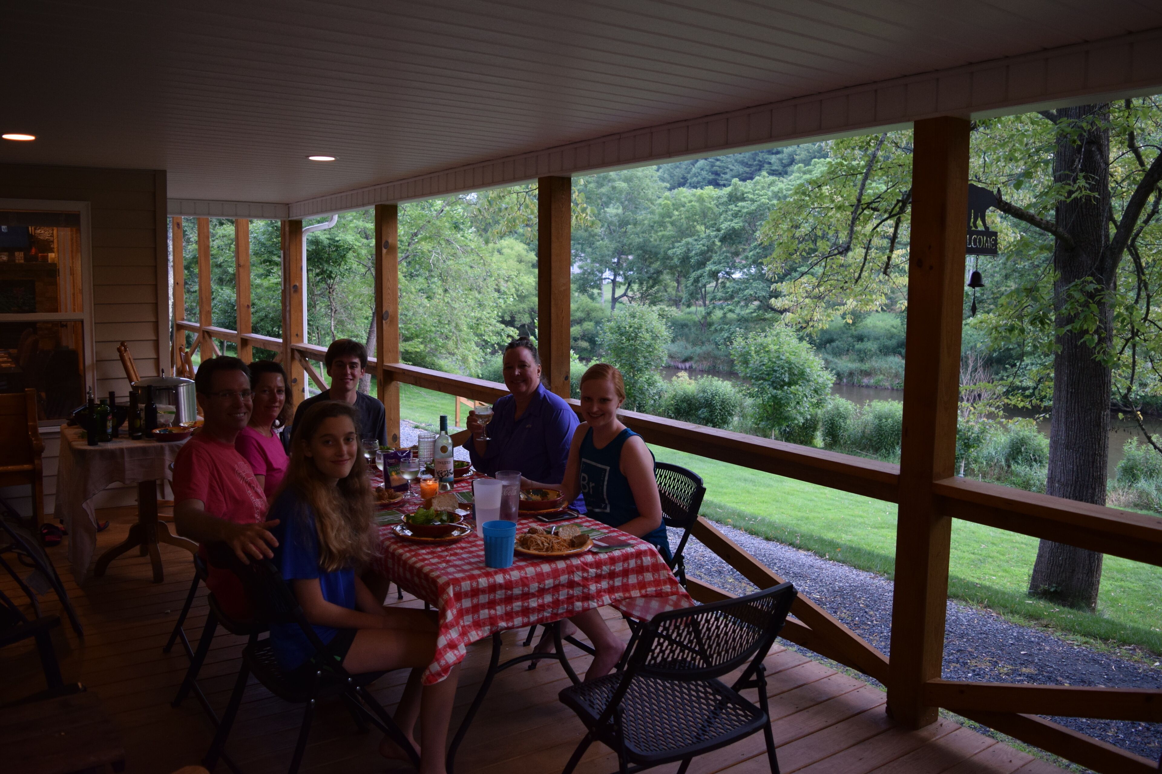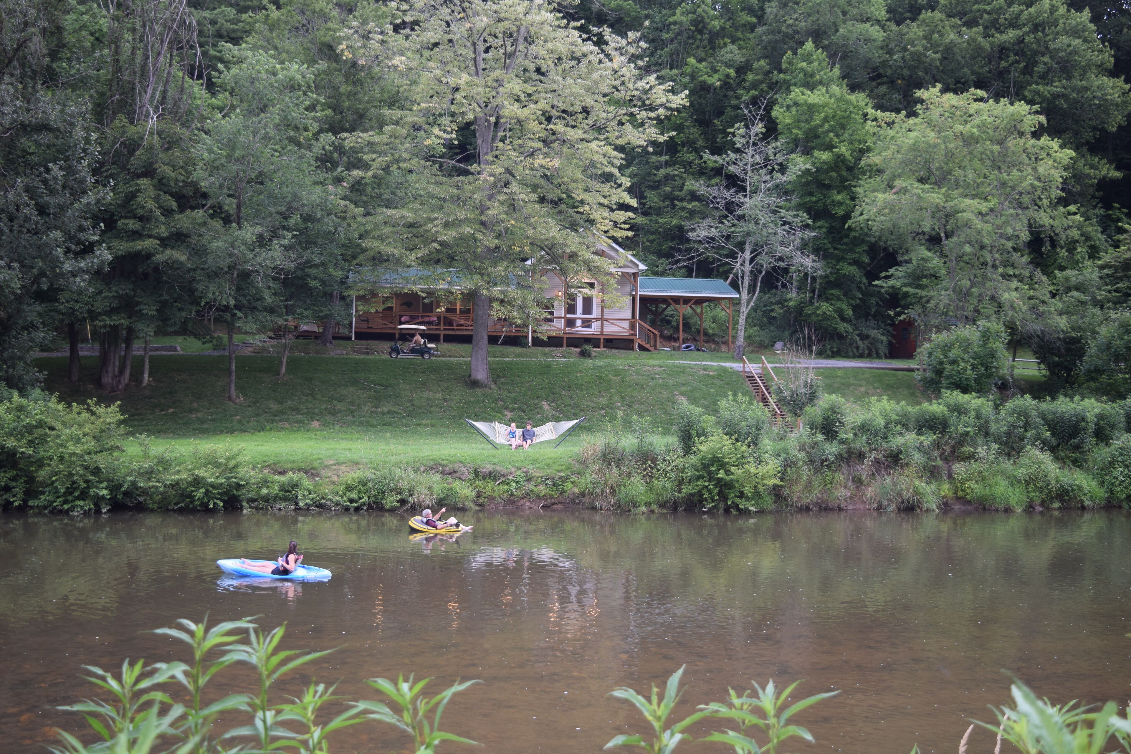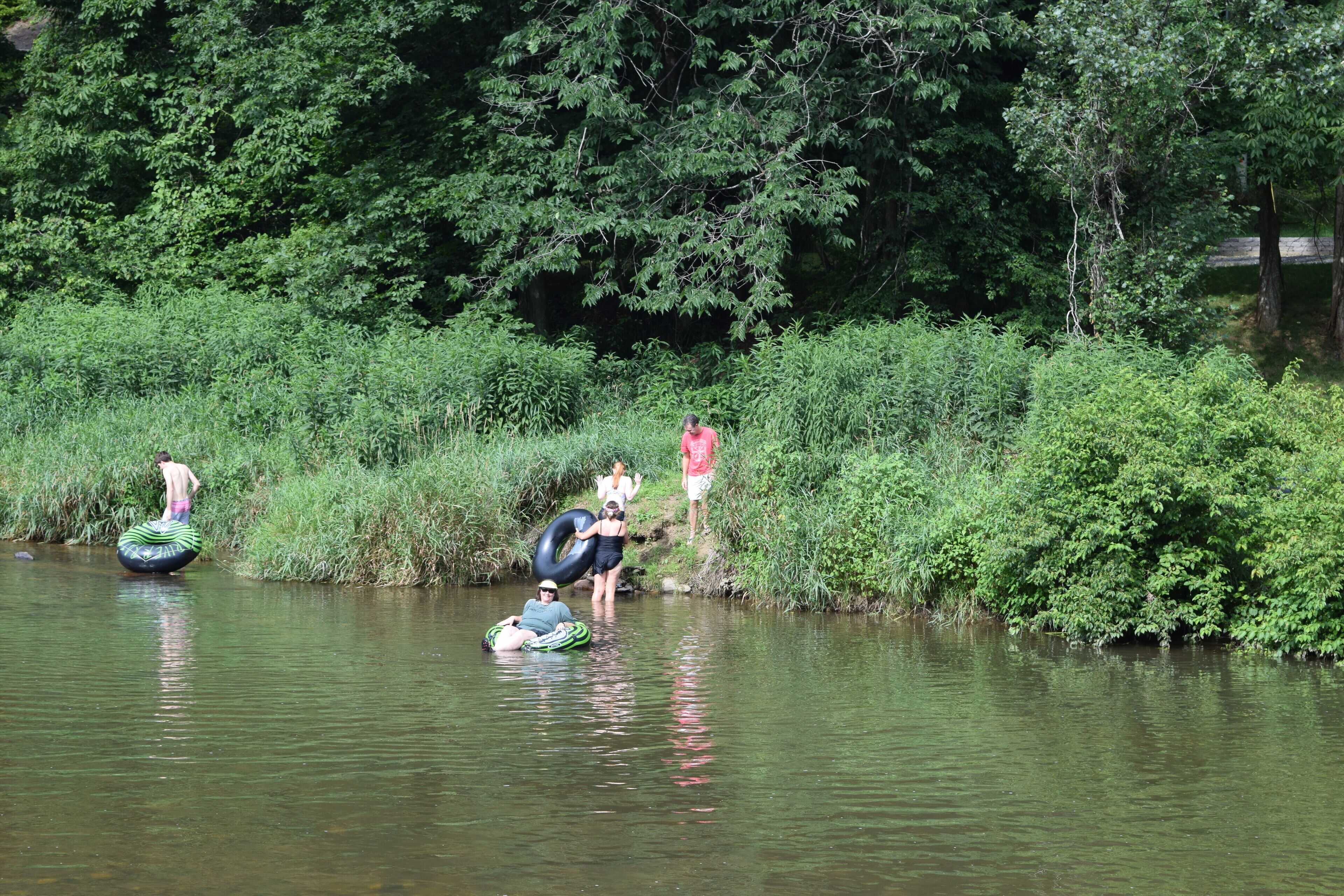 The Cabin- Riverside Cabin Perfect For Your Family Getaway Before you read anything here, scroll down and look at the second picture. It is the view of the North Fork of the New River in the front yard of The Cabin. When we are at The Cabin, we spend as much time as possible on our wonderful front porch- rocking, swinging, eating, roasting s’mores around the fire pit, warming up in the hot tube, napping in the hammock, or waving at people drifting by in the beautiful New River. When nighttime comes, we move inside to the great room and light the fireplace. The rustic chandelier lights the cathedral ceiling and the beautiful wood floors, walls and ceilings. Our family enjoys the evenings listening to beautiful music and playing games with friends, but the wifi is available if we simply have to check emails or want to watch a movie. A fully stocked kitchen allows plenty of room to make a quick snack, or a family feast. When it is time for bed, the master suite has a king bed with ensuite bathroom with a walk in shower. A second bathroom has a Jacuzzi bathtub to enjoy. Three other bedrooms offer a king bed, king day bed, and rear room with bunk single beds, and a full bed. Back over the great room is a loft bedroom (open to great room). The ladder up to the loft is sturdy and an easy climb up to two more double beds. The kids always fight to see who gets to sleep in the loft. When morning comes, everyone is ready to hit the river. The North Fork of the New River is literally in the front yard. The river is about 40 feet wide in front of the cabin, but only a few feet deep. For those wishing more adventure than fishing, swimming around and skipping rocks, tubing is always an option. If shopping is more your speed, West Jefferson and Jefferson are about a 15 minute drive. The Ashe County Cheese Factory, art galleries, fresco churches and shops are great fun. We even have a hard apple cider cidery nearby in Lansing. If hiking is more your speed, the possibilities in the area are endless. For bikers, the top of the Virginia Creeper trail at White Top is only 30 minutes away. Vacations are about making memories with the people you love. Our family has enjoyed The Cabin for many years, and now that we have renovated it, we enjoy sharing it with friends. We look forward to sharing it with you.