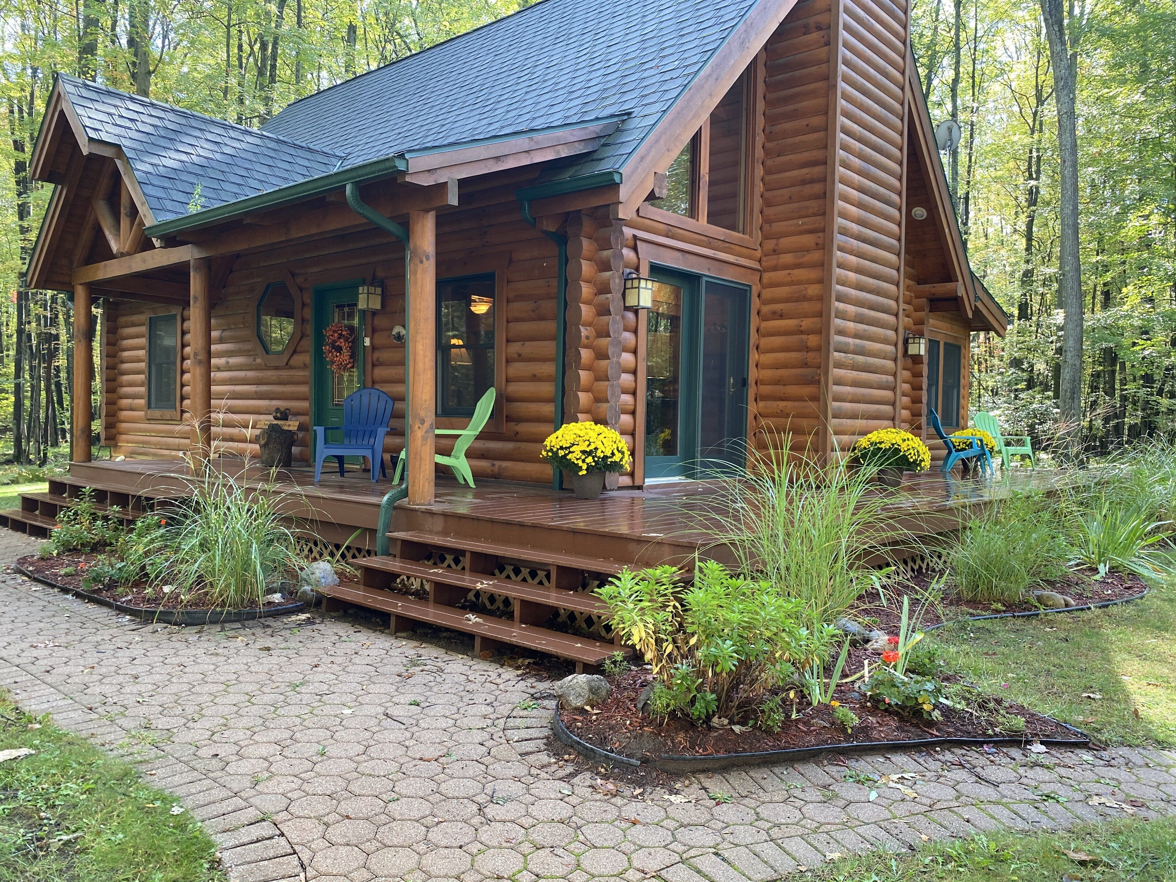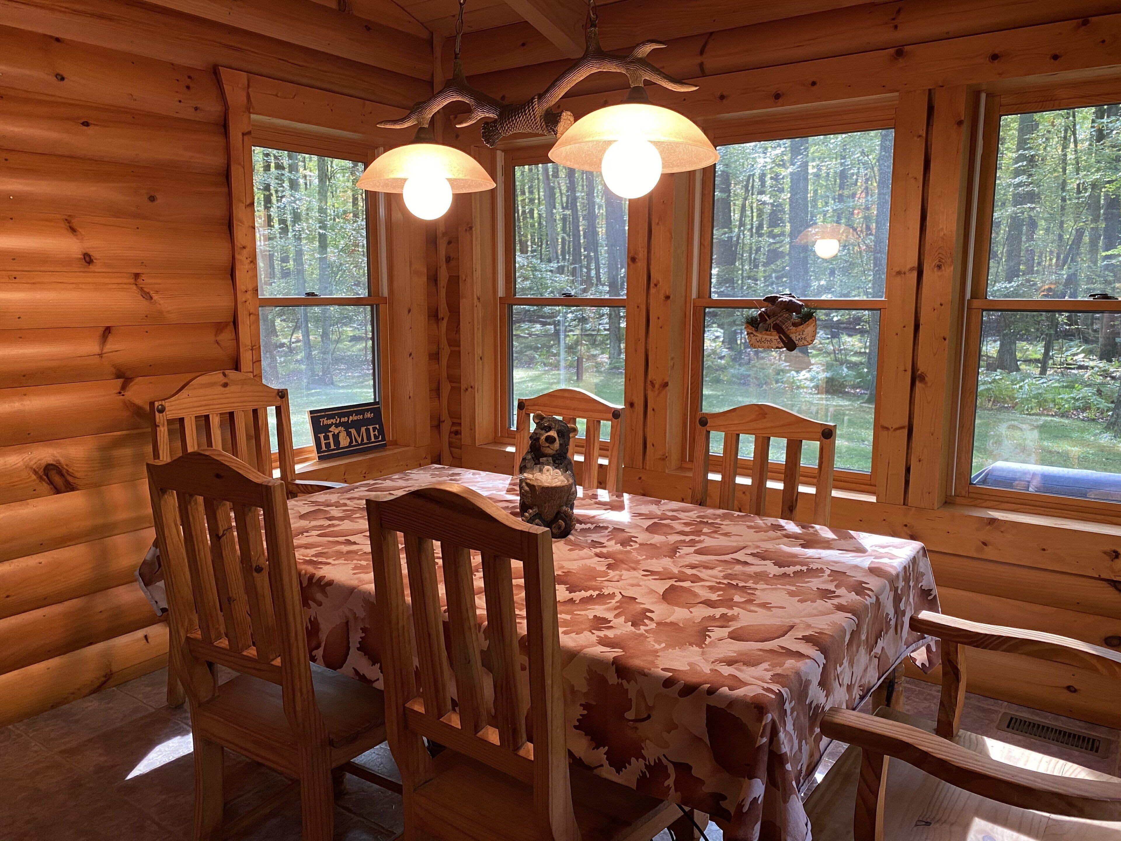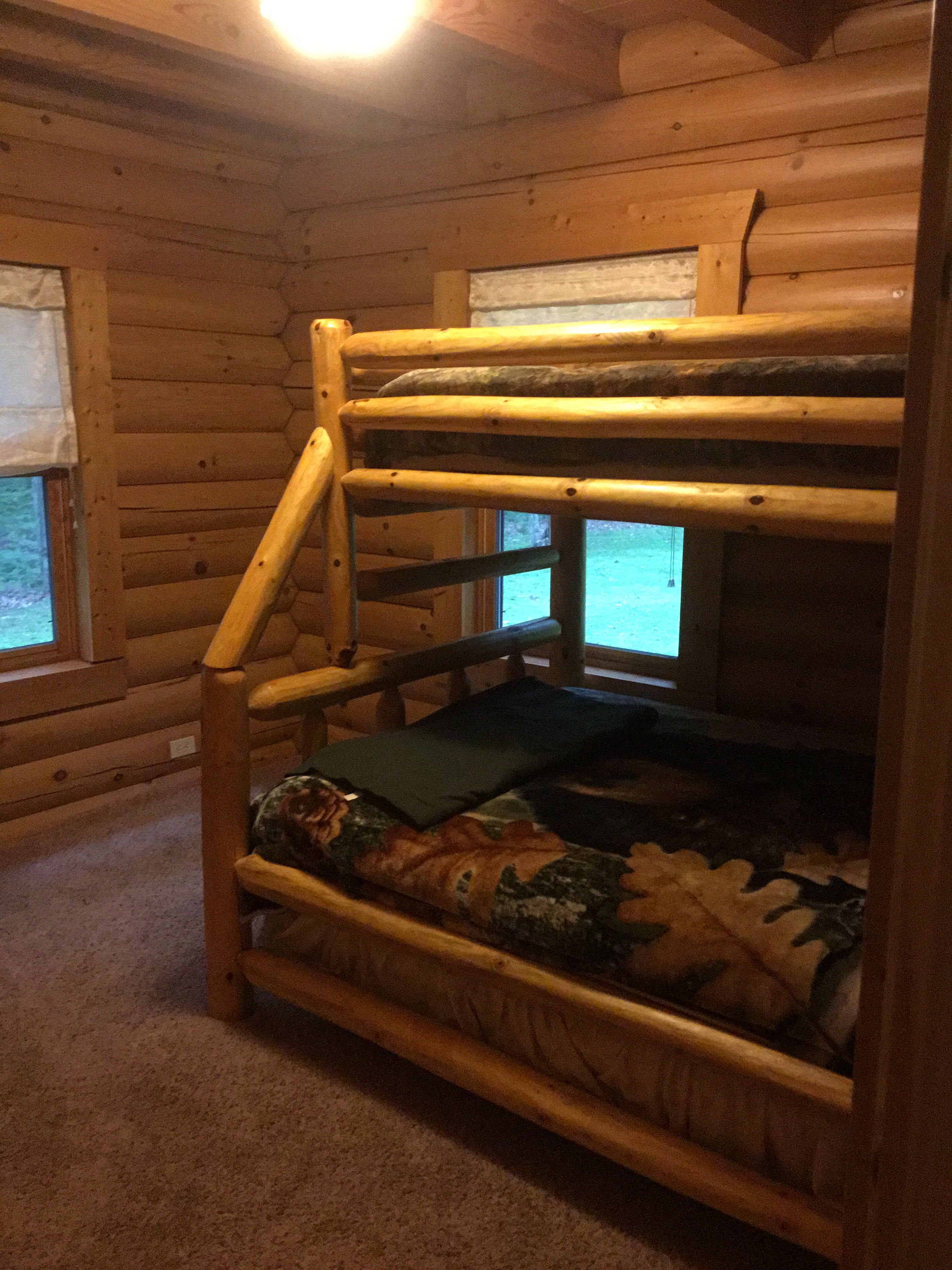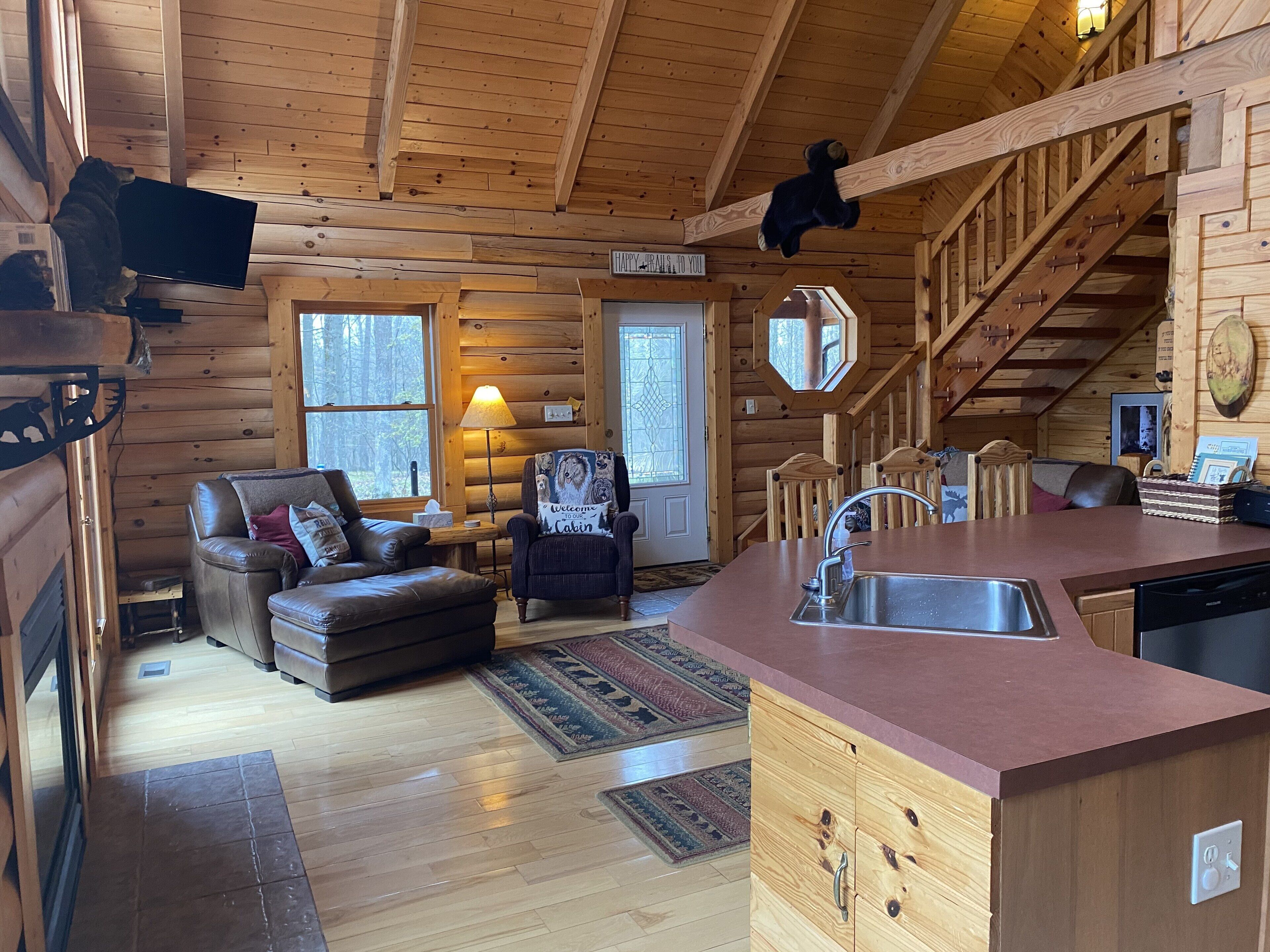 Relax and Unplug at this peaceful log home. PARTIES OVER 4 INCUR EXTRA CHARGES. CHILDREN 2 & UNDER STAY FREE. RATES ARE SUBJECT TO CHANGE WITHOUT NOTICE.This cozy log cabin is nestled in the woods perfect for some well deserved R & R. Wildlife right in your backyard. All this without the long drive to the U.P. This versatile mid-Michigan cabin can accommodate up to 8 (Parties over 4 incur extra charges) with it's log twin over full bunk beds the kids will just love. Or perhaps a cozy retreat for you and that special someone. Romantic master suite in the loft with a private bath and of course a jacuzzi tub, a Mom and Dad getaway special! Just bring your toothbrushes and clothes, everything else has been thought of. All linens and towels, coffee, tea, cocoa, kitchen items, sugar and spices, washer & dryer. This place is fully stocked, your home away from home. We have many movies for all ages. Sit back on the deck, relax and watch the deer roam through. The cabin does not have wireless internet access or cable due to the tall trees. However, we do have an antenna which provides some local channels. This is the woods, time to log off and relax! But for those who are unable to shut down completely it is possible to use your phone as a "hotspot" and still read those emails or surf the web. Also, the Clubhouse has free wireless internet. Even if it is closed you can access it in the parking lot if necessary.This cabin is located in a gated community with 4 small private non-motorized lakes, one of which is only a short stroll away. Perfect for teaching the little ones how to fish. Spend some quality time with your family or simply take yourself for a quiet walk to enjoy all the beauty Michigan has to offer. Deer, Wild Turkey and other wildlife abound in this heavily wooded community. Quiet and so serene that you can almost hear the snowflakes hitting the ground.