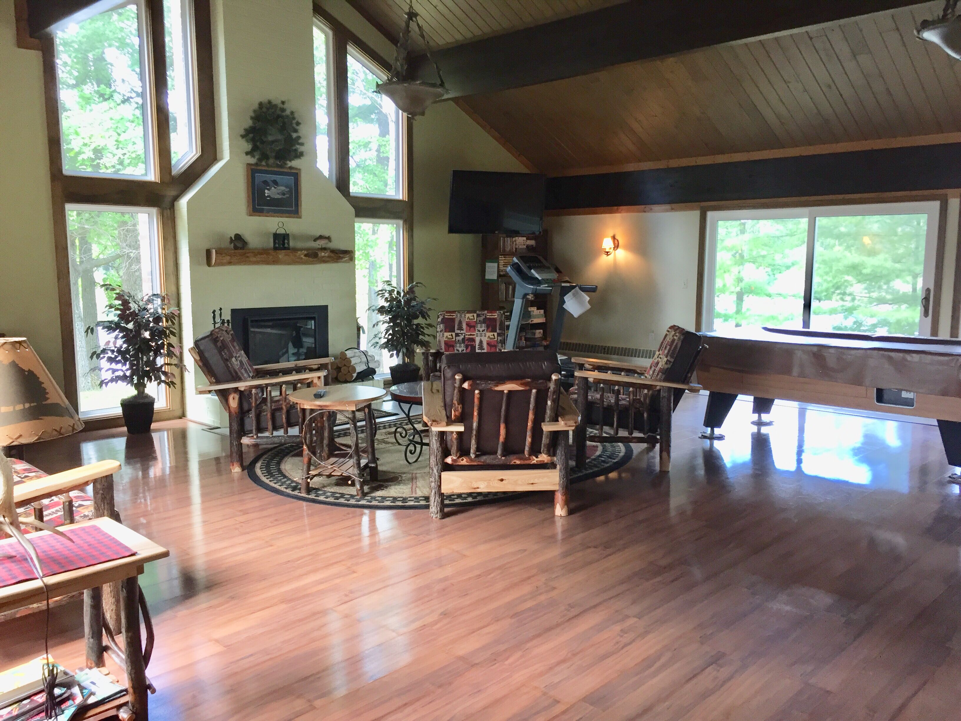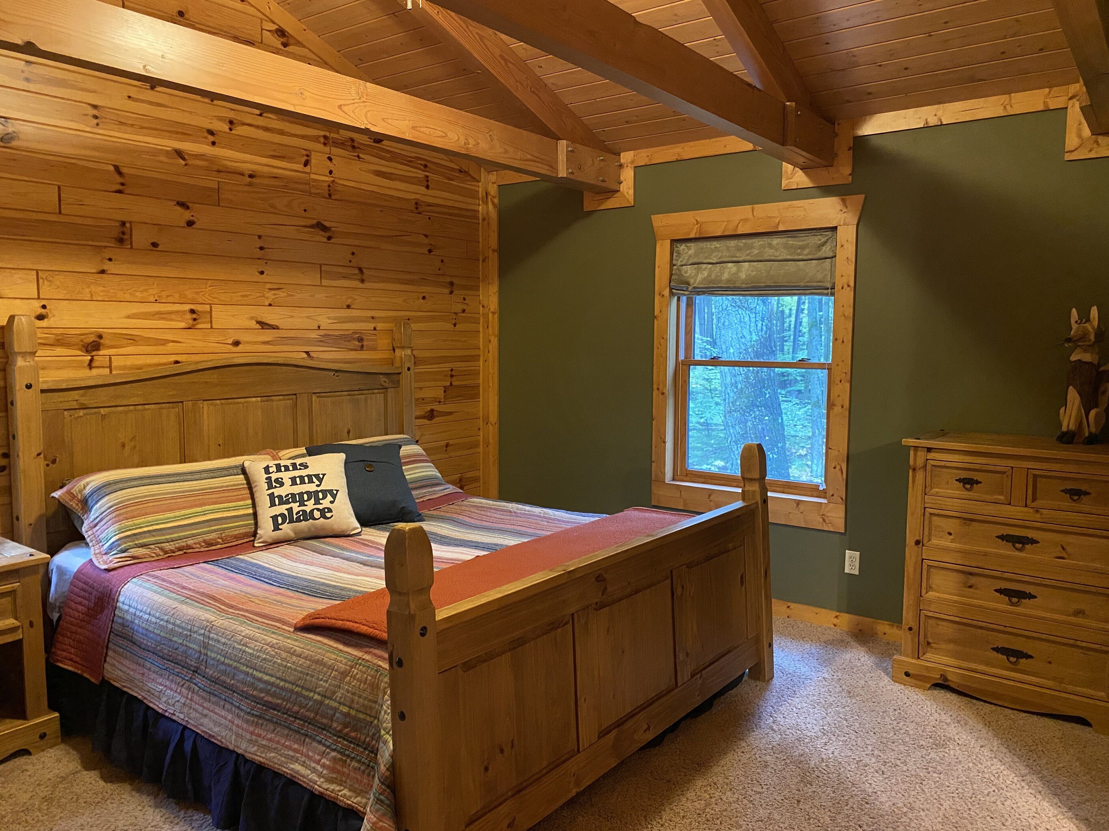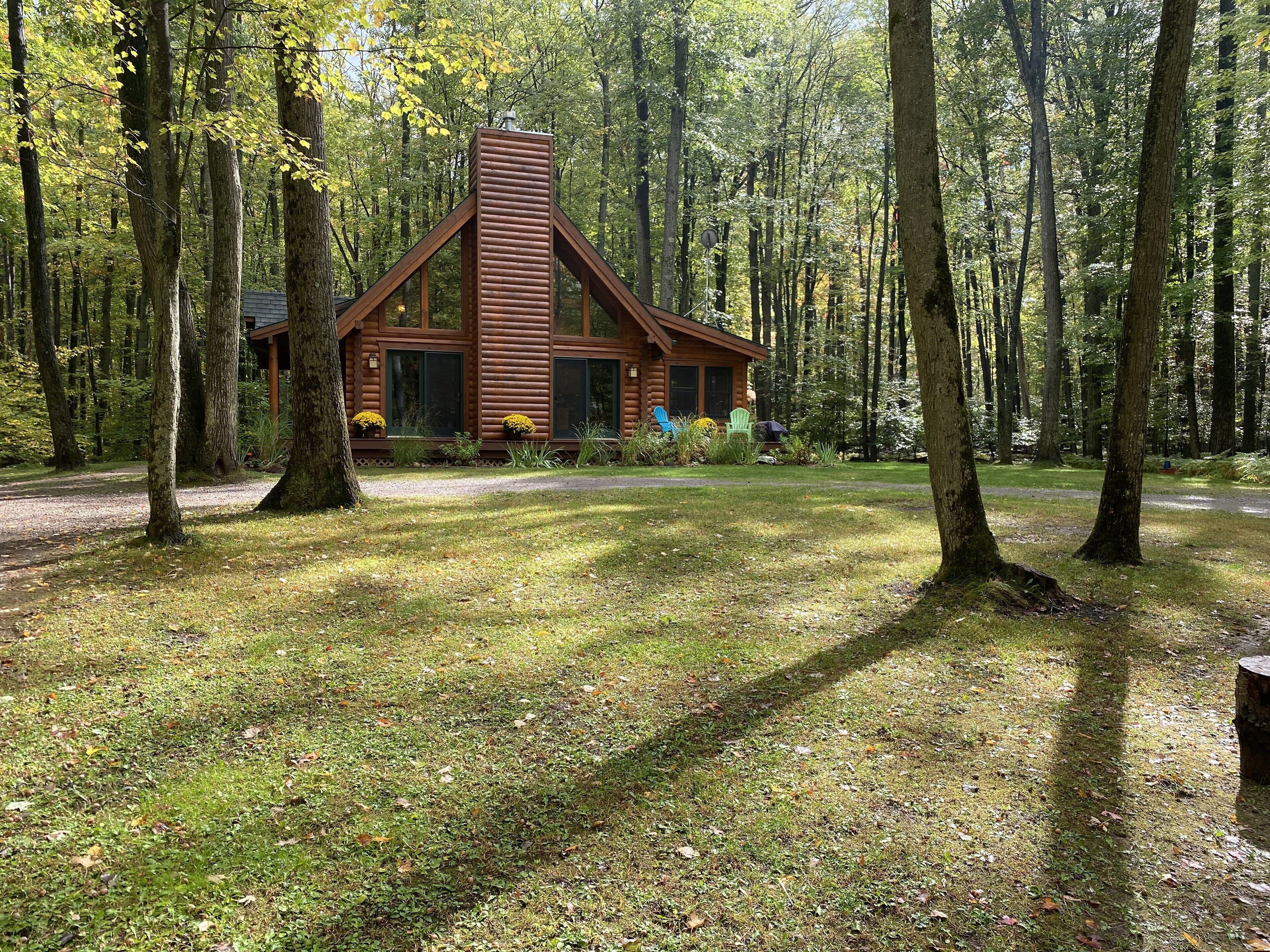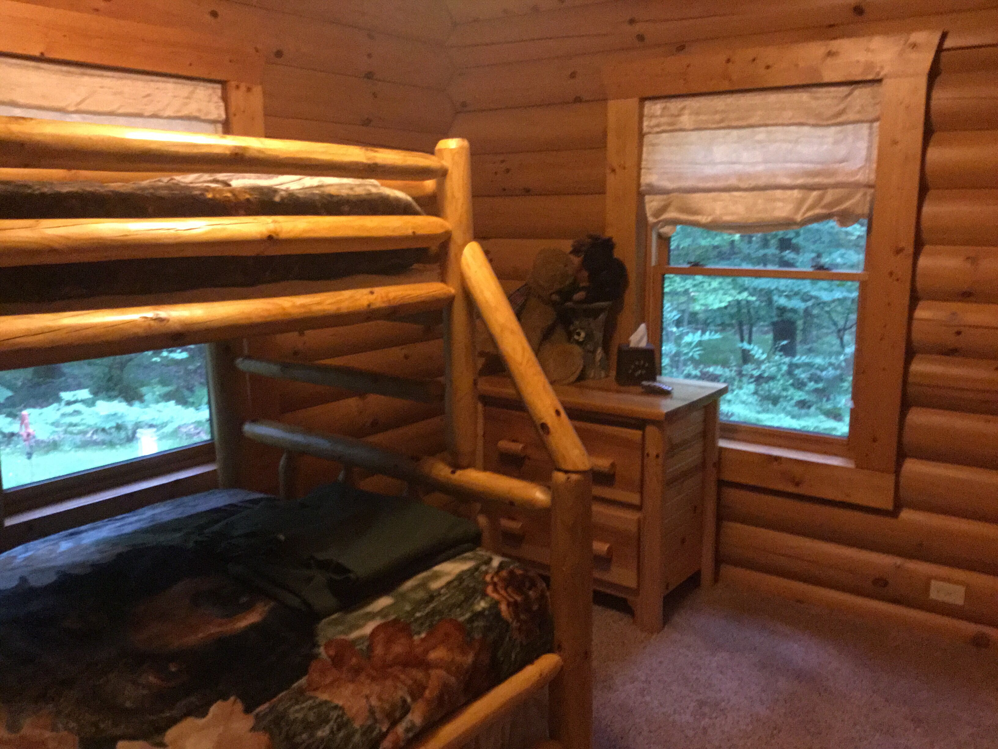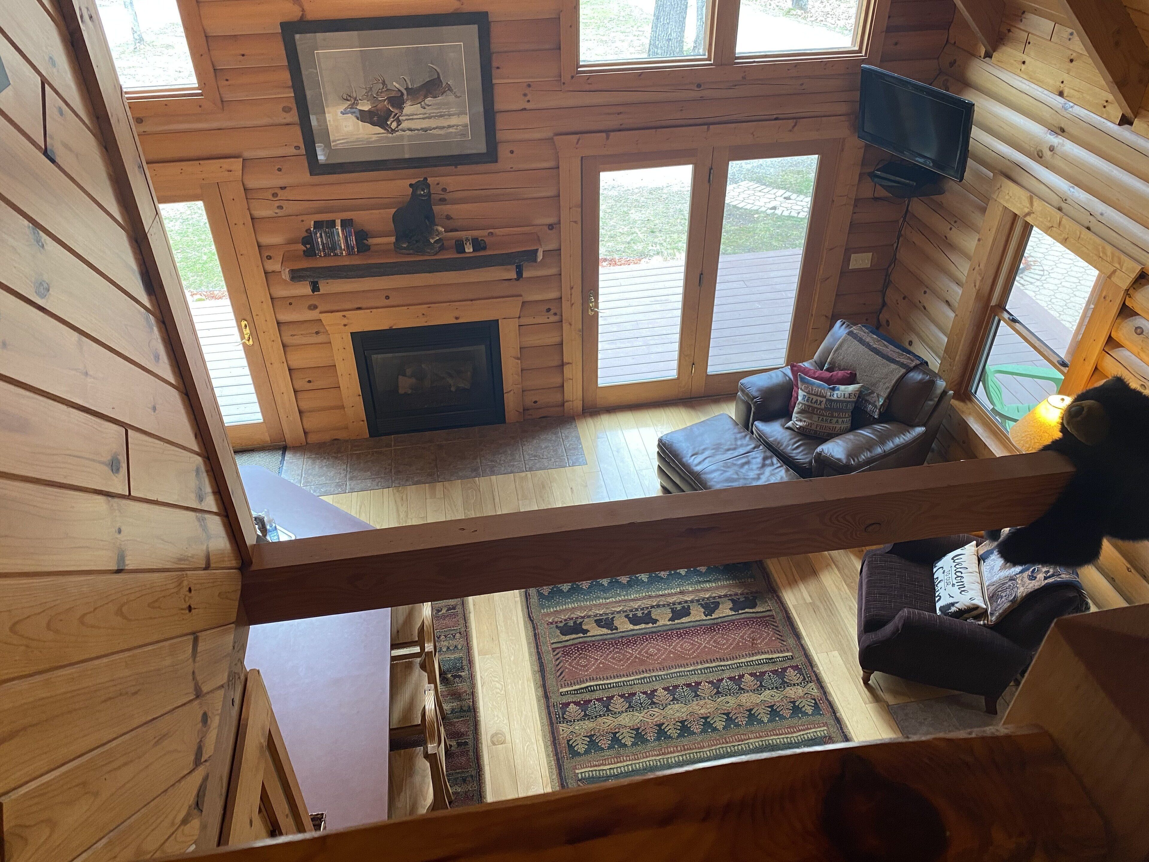 Relax and Unplug at this peaceful log home. PARTIES OVER 4 INCUR EXTRA CHARGES. CHILDREN 2 & UNDER STAY FREE. RATES ARE SUBJECT TO CHANGE WITHOUT NOTICE.This cozy log cabin is nestled in the woods perfect for some well deserved R & R. Wildlife right in your backyard. All this without the long drive to the U.P. This versatile mid-Michigan cabin can accommodate up to 8 (Parties over 4 incur extra charges) with it's log twin over full bunk beds the kids will just love. Or perhaps a cozy retreat for you and that special someone. Romantic master suite in the loft with a private bath and of course a jacuzzi tub, a Mom and Dad getaway special! Just bring your toothbrushes and clothes, everything else has been thought of. All linens and towels, coffee, tea, cocoa, kitchen items, sugar and spices, washer & dryer. This place is fully stocked, your home away from home. We have many movies for all ages. Sit back on the deck, relax and watch the deer roam through. The cabin does not have wireless internet access or cable due to the tall trees. However, we do have an antenna which provides some local channels. This is the woods, time to log off and relax! But for those who are unable to shut down completely it is possible to use your phone as a "hotspot" and still read those emails or surf the web. Also, the Clubhouse has free wireless internet. Even if it is closed you can access it in the parking lot if necessary.This cabin is located in a gated community with 4 small private non-motorized lakes, one of which is only a short stroll away. Perfect for teaching the little ones how to fish. Spend some quality time with your family or simply take yourself for a quiet walk to enjoy all the beauty Michigan has to offer. Deer, Wild Turkey and other wildlife abound in this heavily wooded community. Quiet and so serene that you can almost hear the snowflakes hitting the ground.