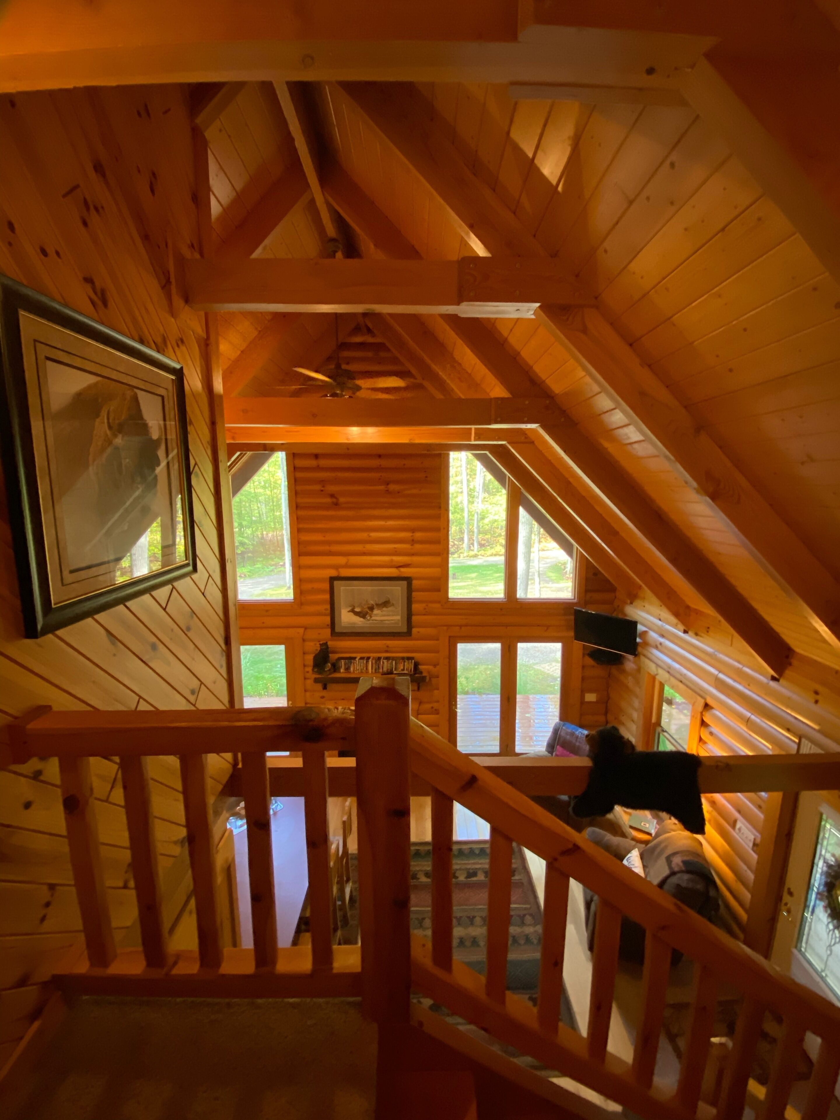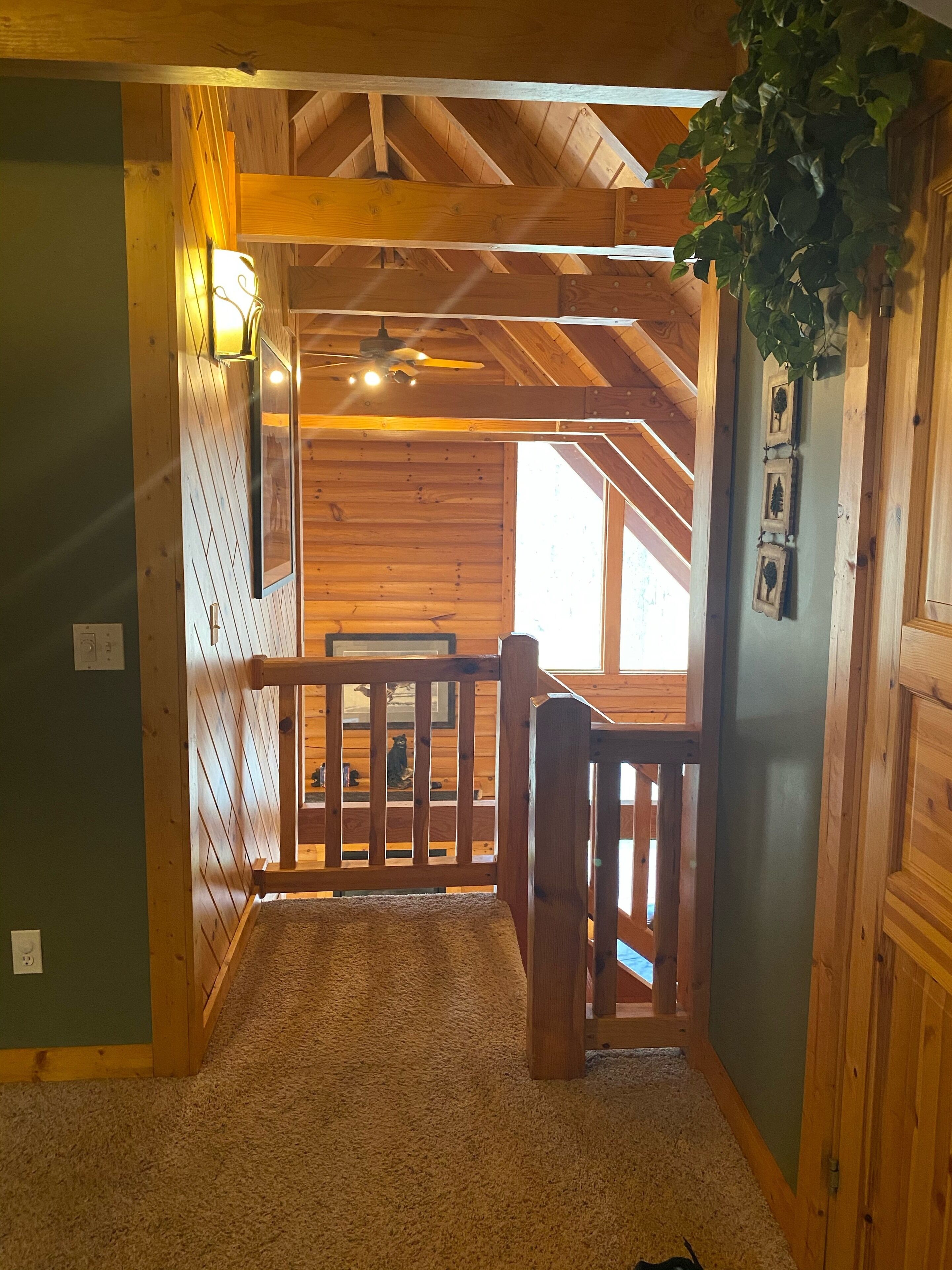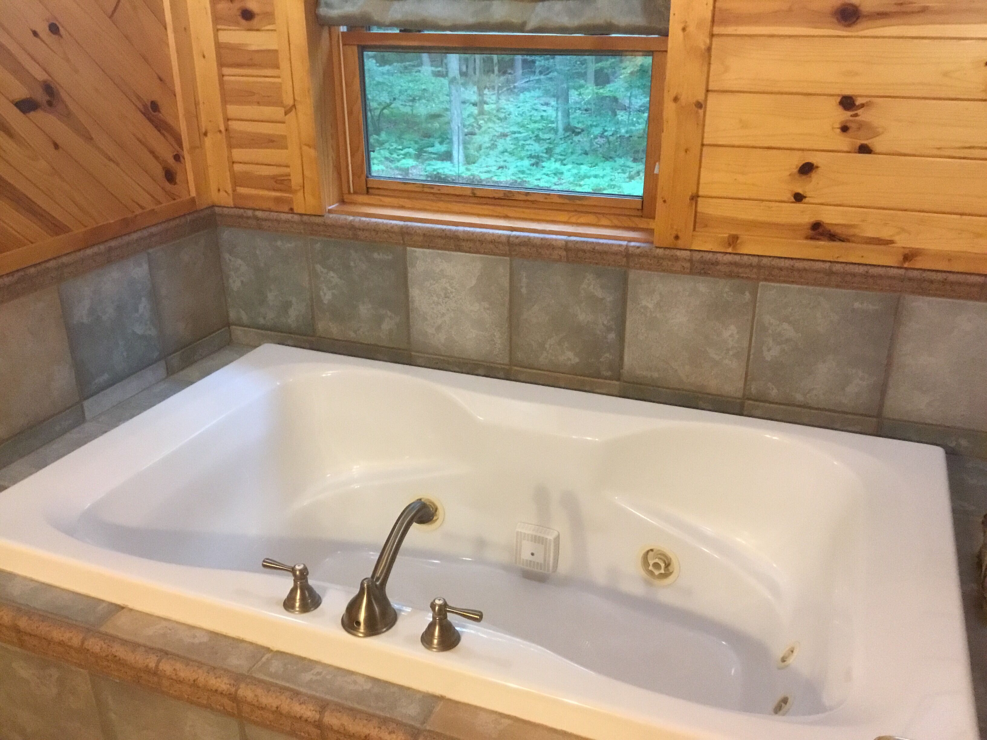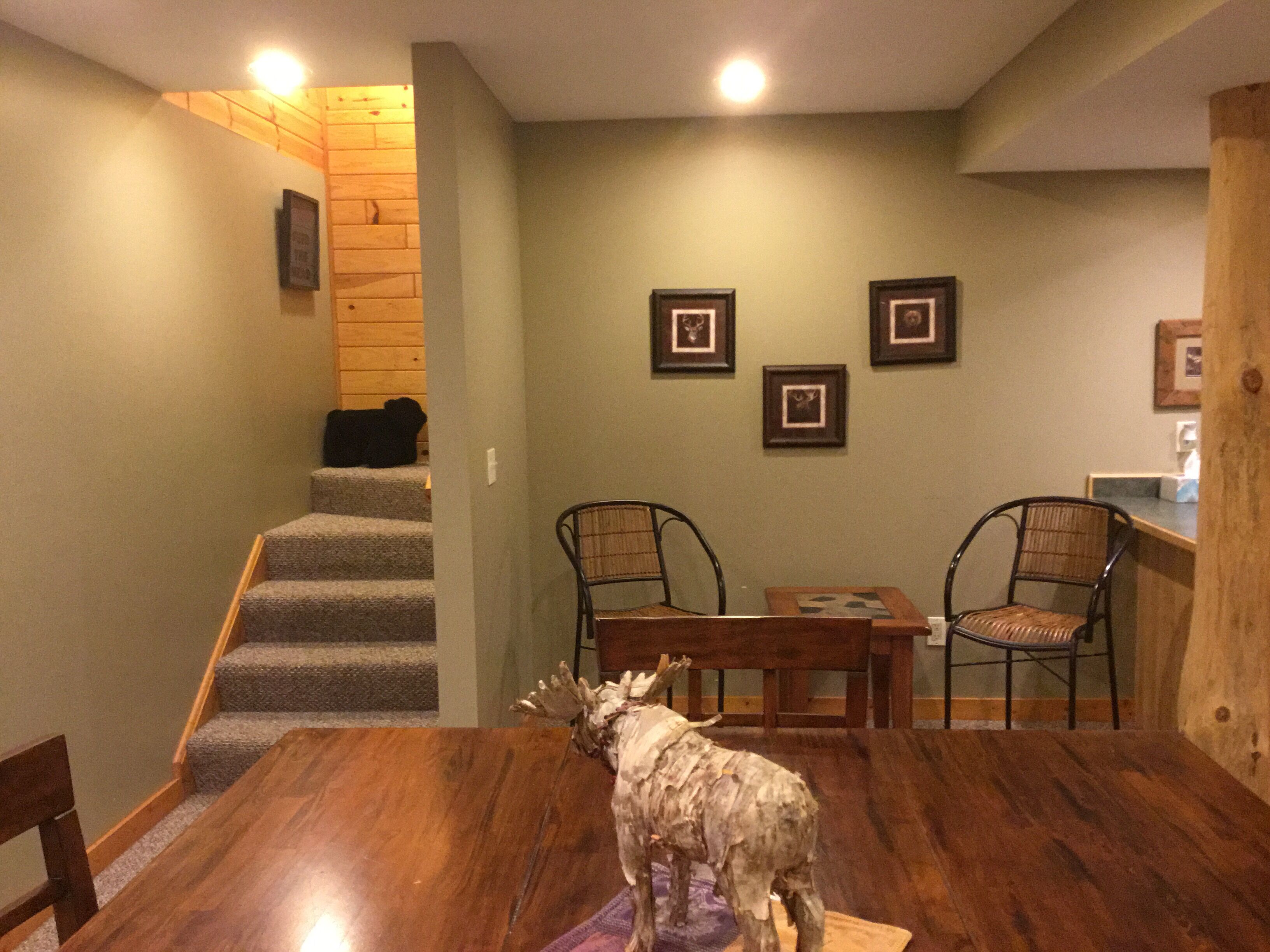 Relax and Unplug at this peaceful log home. PARTIES OVER 4 INCUR EXTRA CHARGES. CHILDREN 2 & UNDER STAY FREE. RATES ARE SUBJECT TO CHANGE WITHOUT NOTICE.This cozy log cabin is nestled in the woods perfect for some well deserved R & R. Wildlife right in your backyard. All this without the long drive to the U.P. This versatile mid-Michigan cabin can accommodate up to 8 (Parties over 4 incur extra charges) with it's log twin over full bunk beds the kids will just love. Or perhaps a cozy retreat for you and that special someone. Romantic master suite in the loft with a private bath and of course a jacuzzi tub, a Mom and Dad getaway special! Just bring your toothbrushes and clothes, everything else has been thought of. All linens and towels, coffee, tea, cocoa, kitchen items, sugar and spices, washer & dryer. This place is fully stocked, your home away from home. We have many movies for all ages. Sit back on the deck, relax and watch the deer roam through. The cabin does not have wireless internet access or cable due to the tall trees. However, we do have an antenna which provides some local channels. This is the woods, time to log off and relax! But for those who are unable to shut down completely it is possible to use your phone as a "hotspot" and still read those emails or surf the web. Also, the Clubhouse has free wireless internet. Even if it is closed you can access it in the parking lot if necessary.This cabin is located in a gated community with 4 small private non-motorized lakes, one of which is only a short stroll away. Perfect for teaching the little ones how to fish. Spend some quality time with your family or simply take yourself for a quiet walk to enjoy all the beauty Michigan has to offer. Deer, Wild Turkey and other wildlife abound in this heavily wooded community. Quiet and so serene that you can almost hear the snowflakes hitting the ground.