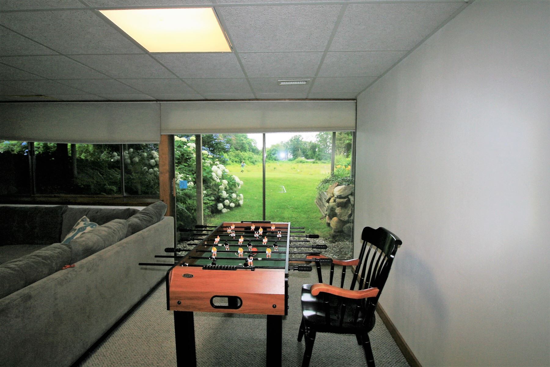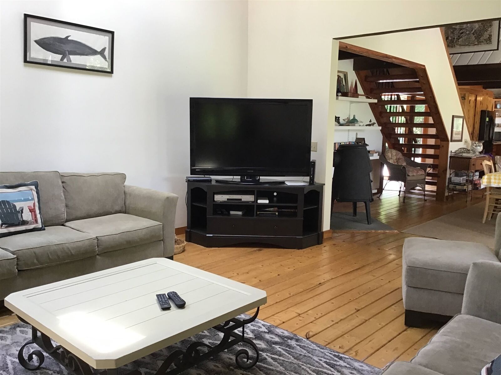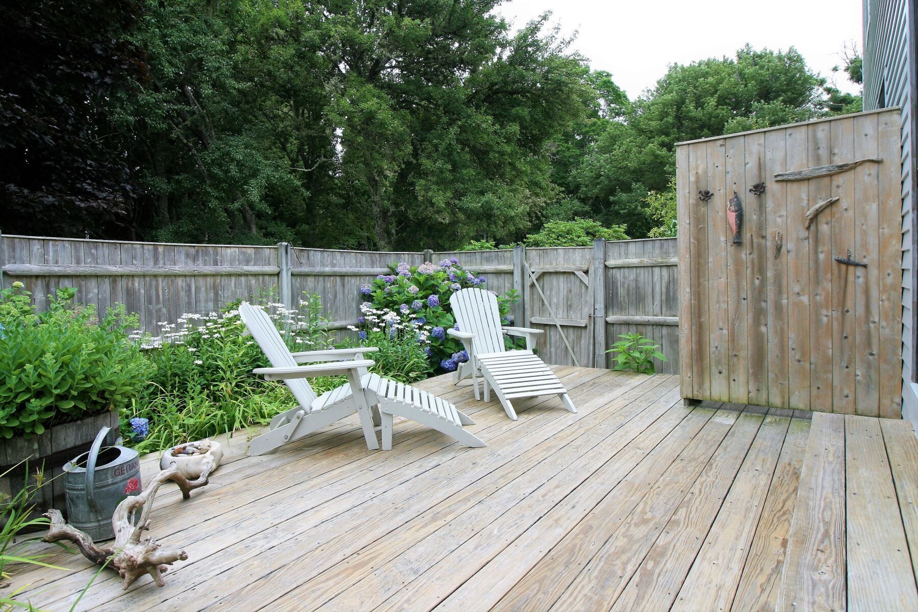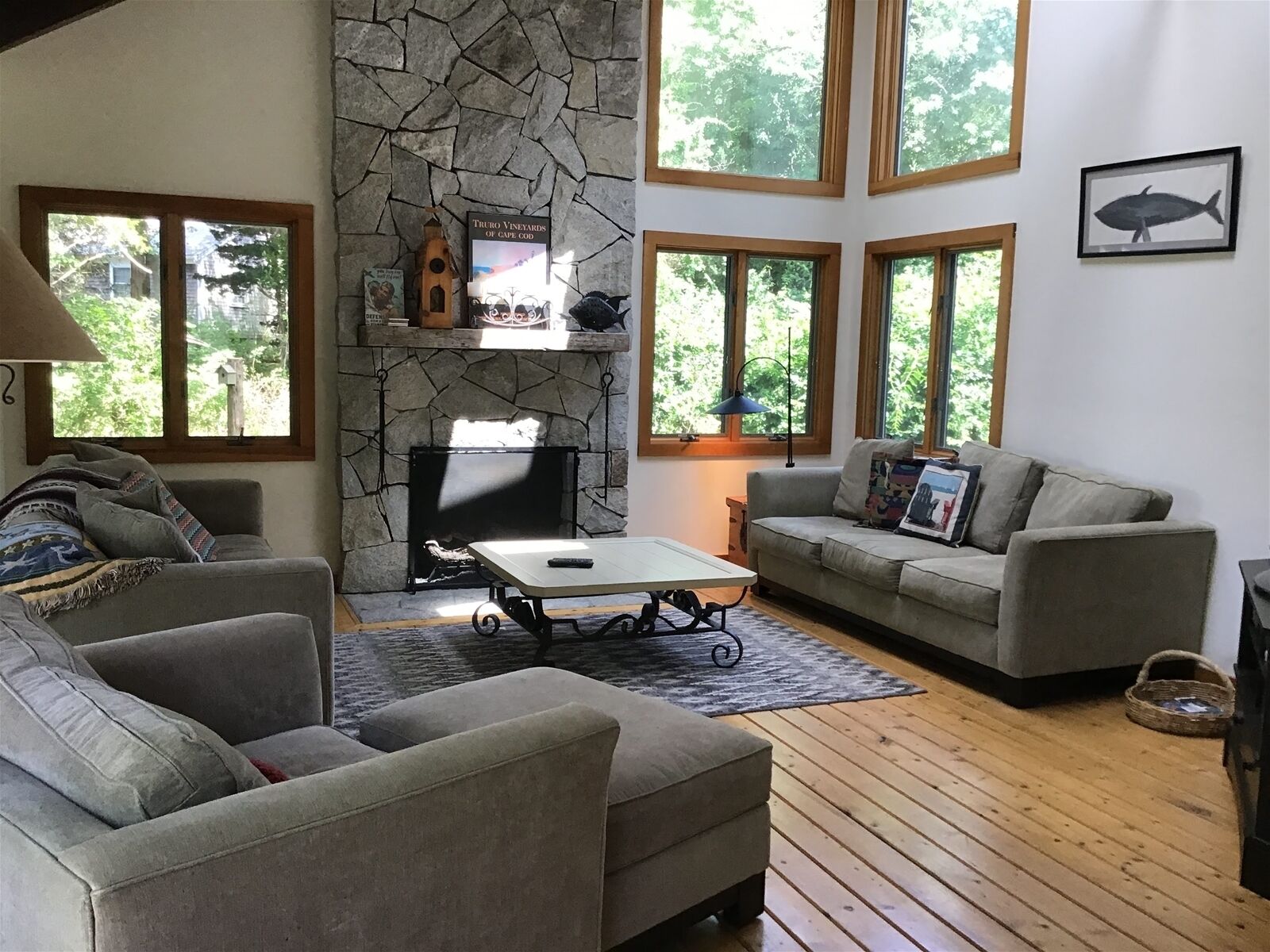 Path to Skaket Beach | 5 Bed, 3 Bath Contemporary home with private setting just 3/10 mile walk through a private neighborhood association path to Skaket Beach. Back yard overlooks an active cranberry bog! Near the Cape Cod Bike Trail and less than a mile to Rock Harbor fishing fleet. There are 3 decks and a fully screened porch with table and chairs with views of beautiful one acre yard. Central A/C throughout plus lots of space for entertaining with the open floor plan. Five bedrooms include the first floor Primary Bedroom with a slider to a private patio and outdoor shower. 2nd bedroom on main floor has two twins. 3 more bedrooms upstairs.A loft upstairs makes a great play area. Lower level has full bath and TV and relaxing living space. There is a foosball table for extra fun! Stroll to historic Captain Linnell House for fine dining. Enjoy the sunset over Skaket Beach....It is vacation time! Upstairs has loft, 3 bedrooms. One king, one queen and 2 twins in 3 BR. One full bath upstairs with tub/shower combo. Master suite is on main level and has deck with outdoor shower. Bathroom is right outside the master door w/ tub/shower 5th bedroom 2 twins on main level shares hall bathroom. Basement has full bathroom. Large sofa in lower level. 3 new mini-splits added to upstairs bedrooms for extra cooling!King Beds (2), Queen Bed (1), Single Beds (4)Blankets and Pillows Provided - Guests need to bring or rent bed linens and towelsCentral ACWIFITVs (2)FoosballWasher & DryerParking for up to 4 carsDeckScreened PorchGas GrillFully Enclosed Outdoor ShowerFull Sized RefrigeratorOvenMicrowaveRegular Drip CoffeemakerToasterIron & Ironing BoardBeach Equipment