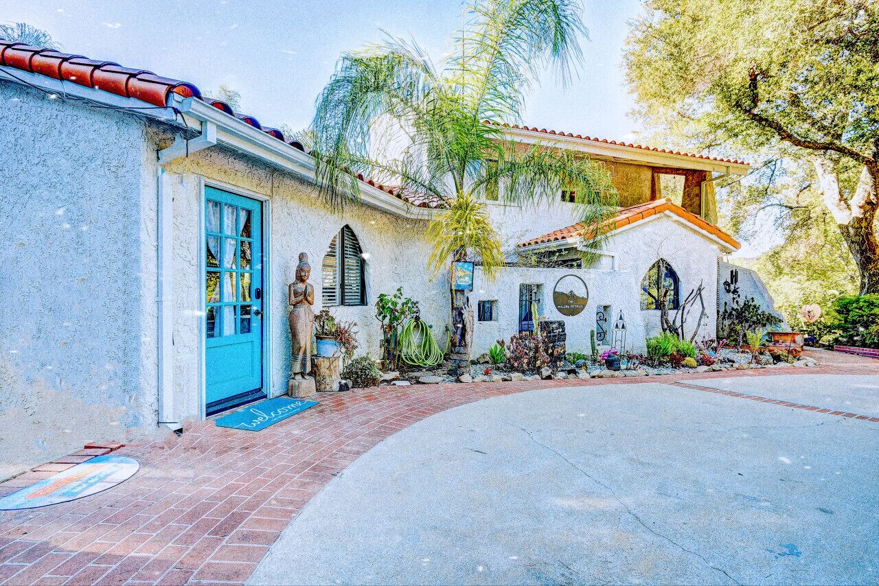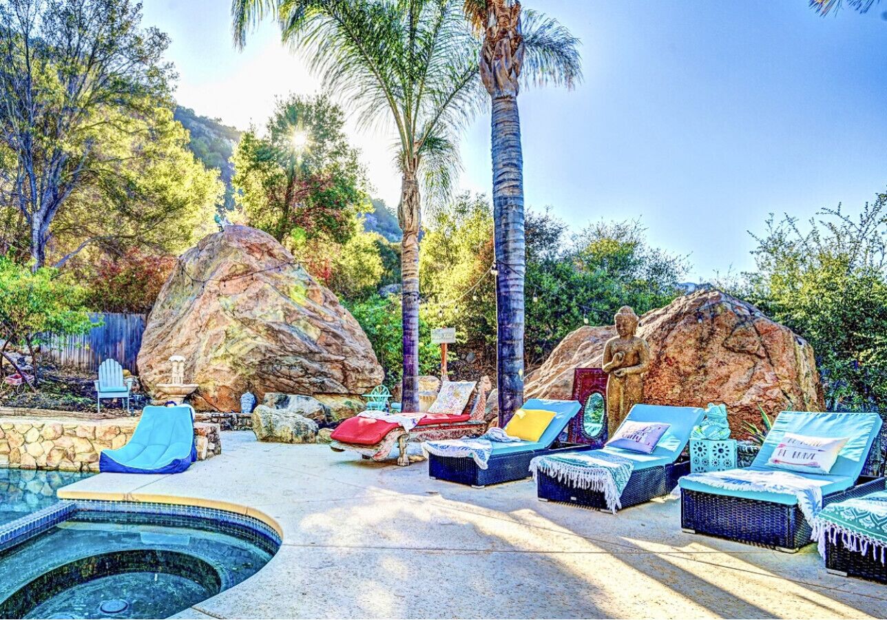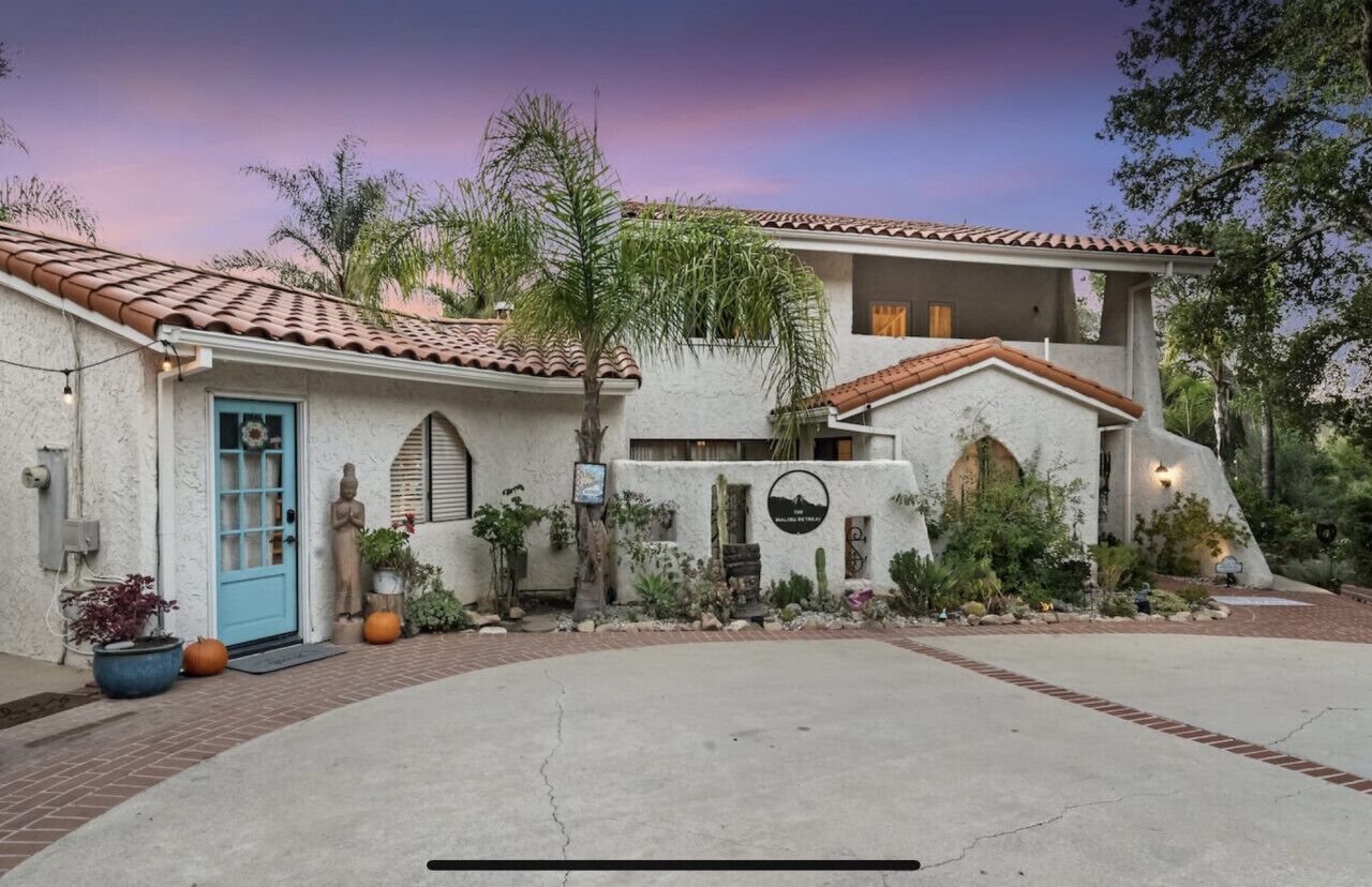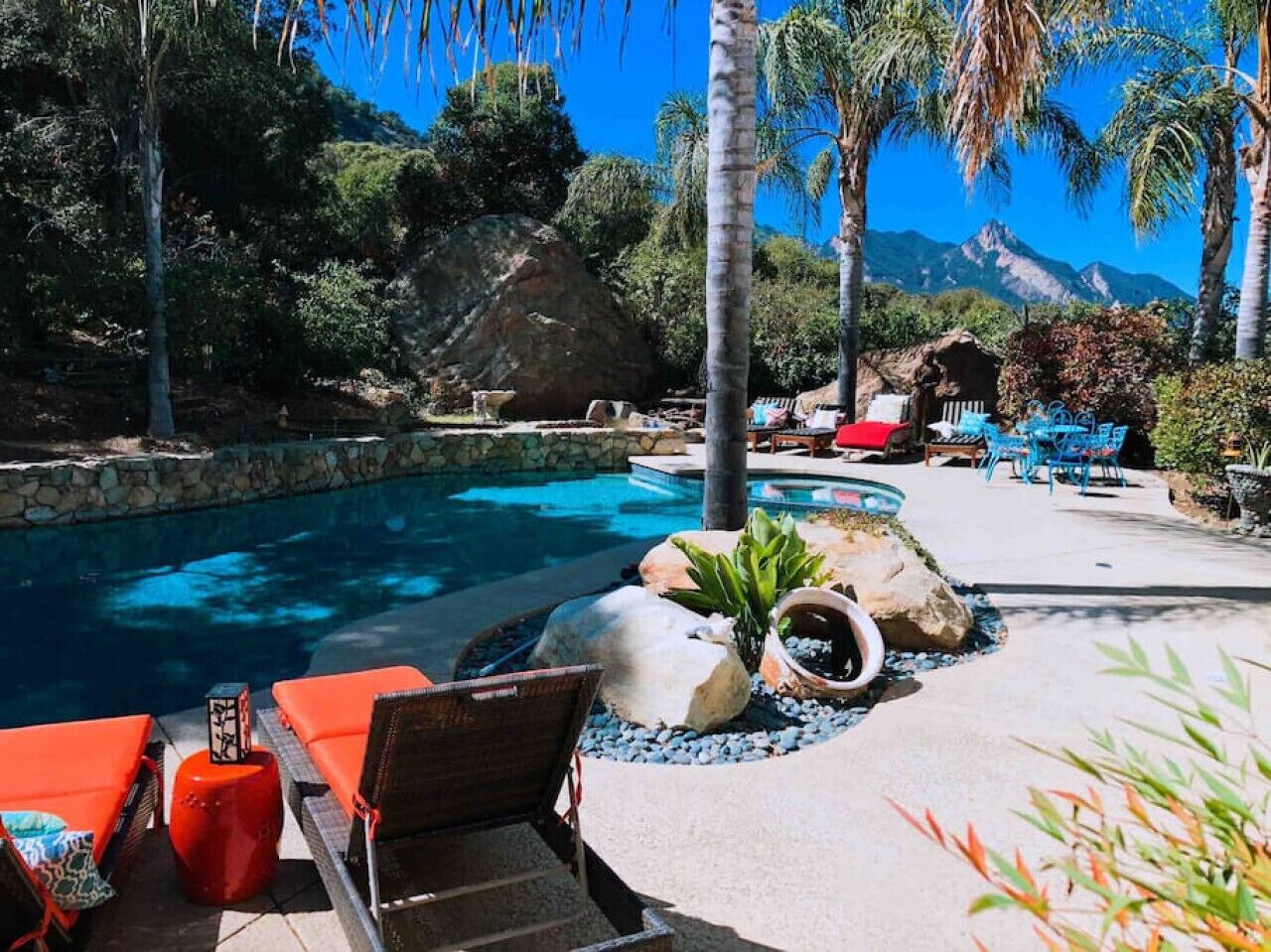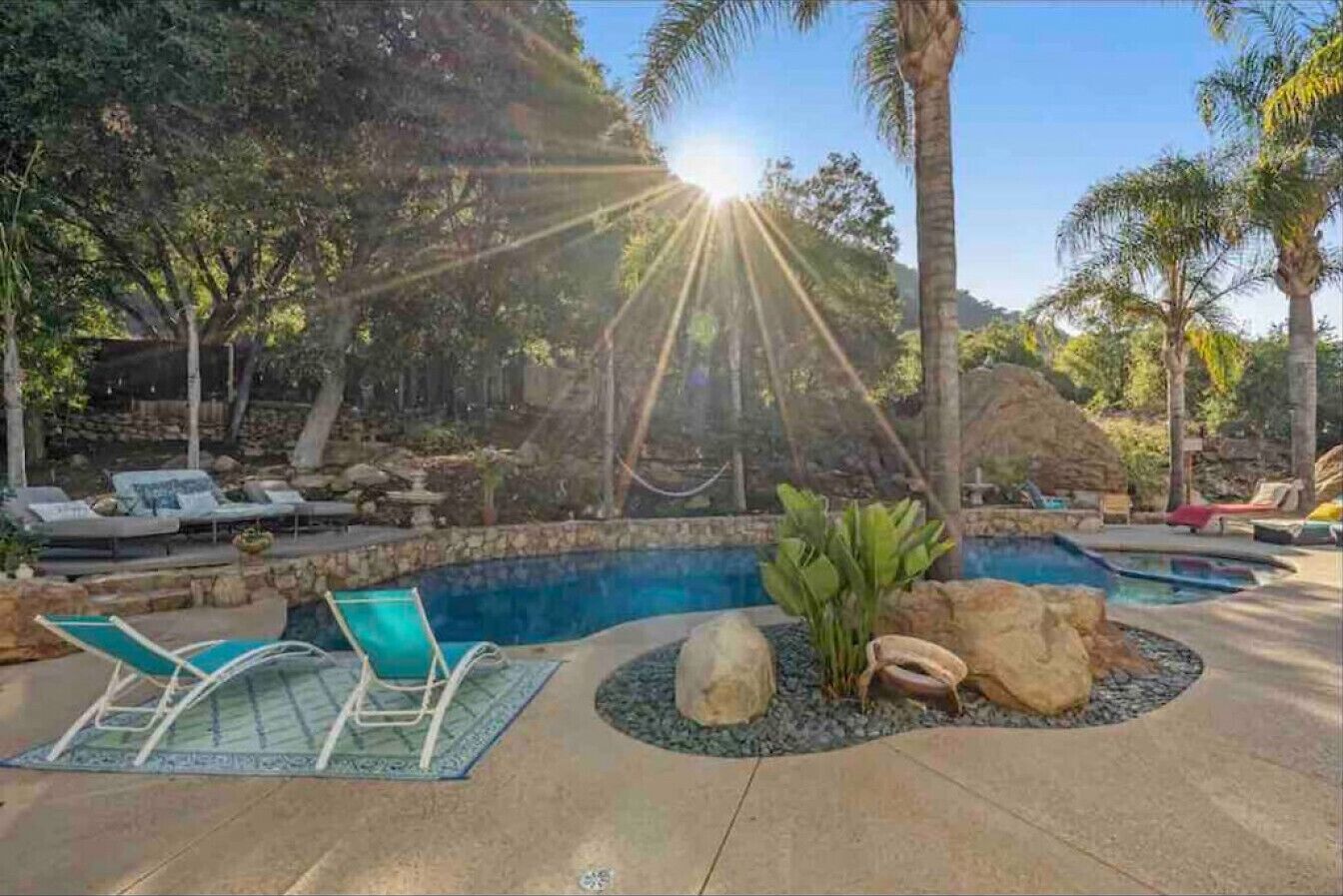 Private Compound Malibu Retreat Salt Pool Yoga The Malibu Retreat ‘s Main & Guest Houses are like staying at your own Private Resort with pool, Jacuzzi, Yoga Deck, Mediterranean Patios, Fire Pit, Ping Pong table & Glorious Mountain Views on 3 acres of beautiful land surrounded by peaceful nature. Property sleeps up to 23 & is great for families. Hiking trails, ocean breezes & legendary Saddle Peak Lodge in exclusive Monte Nido (home of the most influential families) adjacent to both Malibu & Calabasas. Relaxed Luxury with a Boho Chic vibe.The Award Winning Malibu Retreat includes BOTH the Main and Guest Houses on our 3 acre estate property for Vacations, Retreats, Productions, photo shoots, weddings & Exclusive Gatherings (all events on a case by case basis). Just send us the details of your dream plans & we'll give you the appropriate pricing. The Malibu Retreat provides about 5000 sq ft of indoor spaces on 3 acres of unparalleled magical sacred land. It feels which like a private resort for your family or friends to relax & retreat.The Main House is a cool Mediterranean style colorful, inspiring house w/:*4 large bedrooms* 3 full custom bathrooms (2 w/ heated Toto bidets), *2 balconies w/ views *3 real wood burning fireplaces, *A true “Conversation pit”*Gourmet, fully stocked kitchen w/ Viking double oven, food warmer & Sub Zero frig (plus a kitchenette in the GH)*Home Office w/ desks,Monitors, printer & 2 blazing fast Internet / WiFi’s *Indoor / outdoor living & dining rooms*Infinity Zen yoga deck w/ Yoga mats & blocks*Mediterranean patios w/ Positano Italy benches *Natural Bottom Heated Pool & Bubbling Jacuzzi (heat costs extra)*Natural Gas Fire pit*2 Stainless Steel BBQs* Pro Ping Pong Table* 7 New Smart TVs (w/ Netflix, Hulu, Amazon Prime, Showtime, HBO, Apple TV & Roku) * Lush Lawn w/ Hammocks* World-class Hiking Trails * Majestic California Oaks * Glorious Mountain Views* between Malibu’s famous Beaches & Calabasas in Exclusive neighborhood of Monte NidoMain House’s Gourmet custom kitchen:-Limestone Countertops, -Ann Sacks Handblown tiles -Viking double oven w/ 6 burner gas range & griddle-Viking food warmer-Sub-zero refrigerator-Retro stools for kitchen dining-large desk / buffet table-microwave -Toaster oven -multiple coffee pots -opens to Dining Room / Outdoor Living Room Conversation Pit Living room:-gathering place for everyone to gather w/a wood burning fireplacesZen Den: -Home Office w/ pottery barn desk w/ 2 monitors, wifi printer, docking station & office supplies. -yummy couch Primary Living room:-custom down couch -Sixpenny daybed -60 inch smart TV-wood burning fireplaceUpstairs Bedrooms in Main House:1) Shabby Chic Master: -private balcony w/ breathtaking views-Wood-burning fireplace-new king all organic mattress-mini frig-60 inch smart TV-ceiling fan w/colorful Hue lights -2 Shabby Chic Chairs-luxury sheets, pillows & down duvet Master ensuite bath:-tumbled Marble tiles-multi-jet rain shower shower w/ views -Toto bidet heated toilet -Kohler faucets-double vessel sinksAnthropologie Family Suite (sleeps 8 people… great kids room too!): -colorful artistic bedroom w/ 2 Queen beds, luxury sheets & down duvet -2 twin bunk beds in upstairs loft-smart TV-shared balcony-closet & bureau Santana Suite:-new king bed, luxury sheets & down duvet -new smart TV-desk & chair -Shared balconyShared upstairs bath w/ custom tiles, tub/shower & sinks w/ vanities both inside & outside of the bathroom Hawaiian Room (downstairs main house):-private patio -new Queen organic cooling mattress, luxury sheets & down duvet -closet & Bureau House of Blues bathroom (downstairs across the hall from Hawaiian bedroom) - cobalt blue wall vessel sink-tiled glass shower-heated bidet toilet seatAcross the driveway you’ll find the “Music Promoter Guest House”. There are Some dates where Guest House is booked or blocked. Please ASK when booking.Guest House details:1350 sq ft w/bedding for 9! -2 sides w/ open loft bedrooms-one w/ a queen bed -the other w/ 2 new twins, each w/ a trundle -3 more twins downstairs (1 with trundles) -Another living room, dining room, kitchenette & the property’s 4th bathroom. -2 flat screen Smart TVs -Harmon & Kardon 2 room, 4 speaker stereo w/ Bluetooth -Zen Soji screens-Gold & Platinum Records & autographed posters of Artists-Dining area -Retro Kitchenette (refrigerator & freezer, microwave, toaster oven & coffee maker). -Private Patio w/ propane BBQ grill w/ a burner, an outdoor dining table, seating area & utility sink - Leads to shared Pool & Jacuzzi areas -Designer bathroom has a showerOutdoor Pool Area:-35,000 gallon Natural Bottom Pool (which can be heated for extra)-Bubbling Jacuzzi (can be heated for extra) -Gas Fire Pit-Lounge Chairs & daybeds-Dining & Bistro seating -Hammocks-Natural Boulders, palm trees, mountain views -Multi-Level Mediterranean Patios, outdoor living room surrounded by stunning mountain views-handcrafted benches from Positano Italy-gas-fueled DCS BBQ-Protected oak grove -900 Sq Ft Zen Yoga Deck w/ Buddhas, Bamboo, Bougainvillea -Ping Pong table -7000 sq ft lush lawn -10,000 acres of parkland and hiking trails -upper and lower driveways for plenty of parking We DO host select gatherings, weddings, photo shoots, retreats & production locations for movies & music videos, but all of these types of bookings have different needs, parameters, rules, regulations & contracts. So if you’re planning for anything other than a vacation stay, feel free to reach out to us and include all of your needs & details outlined so we can give you the correct pricing to accommodate (if it’s possible). We are NOT a good fit for wild parties! We’re more like a quiet, beautiful, sanctuary.... For Liability Purposes, only registered guests are permitted on property at any time - so if you plan to have company, please include your guests in the total booking number. Important to know: We issue direct leases with our guests once you book here & we requ