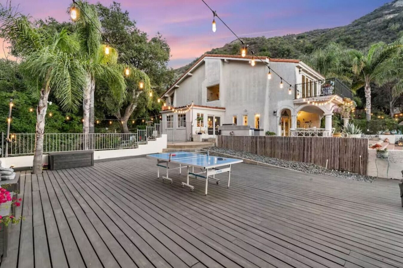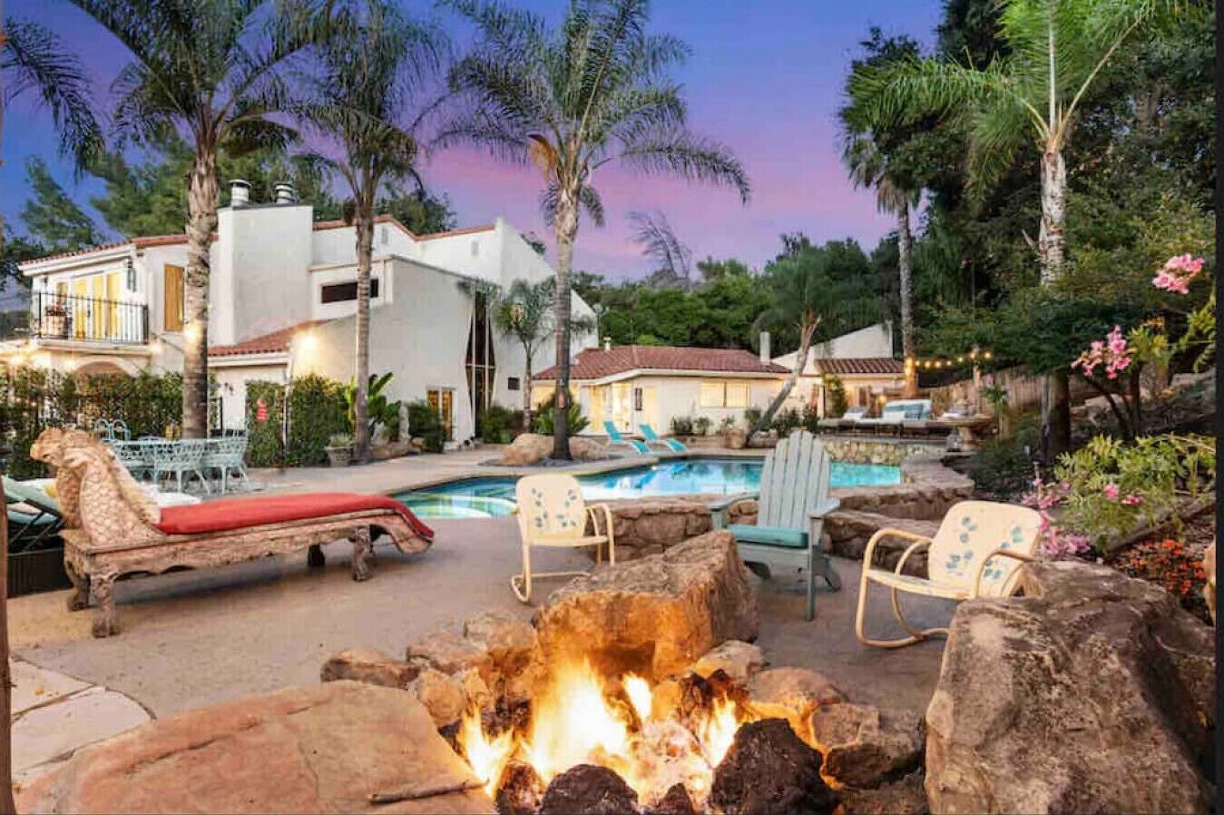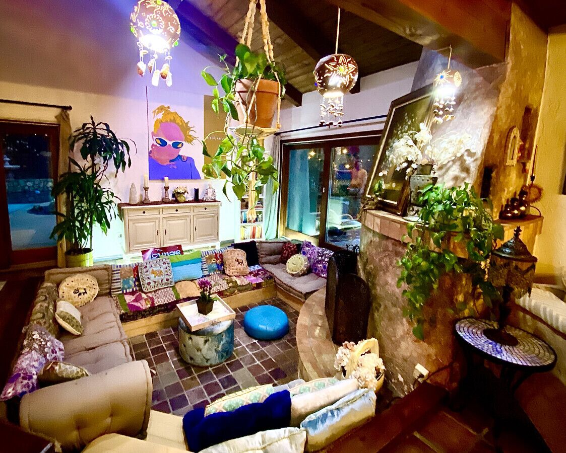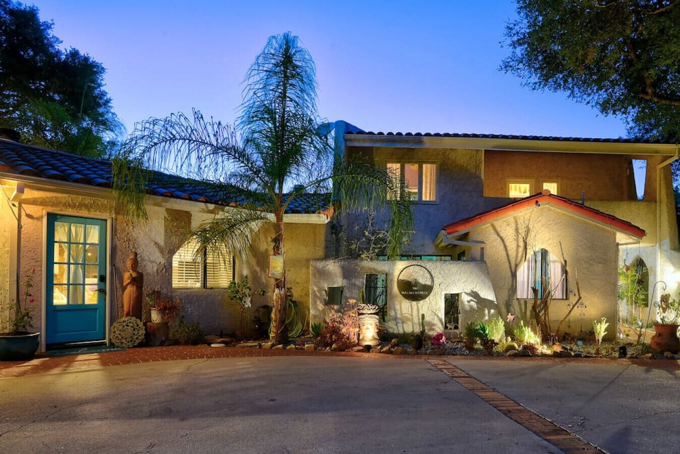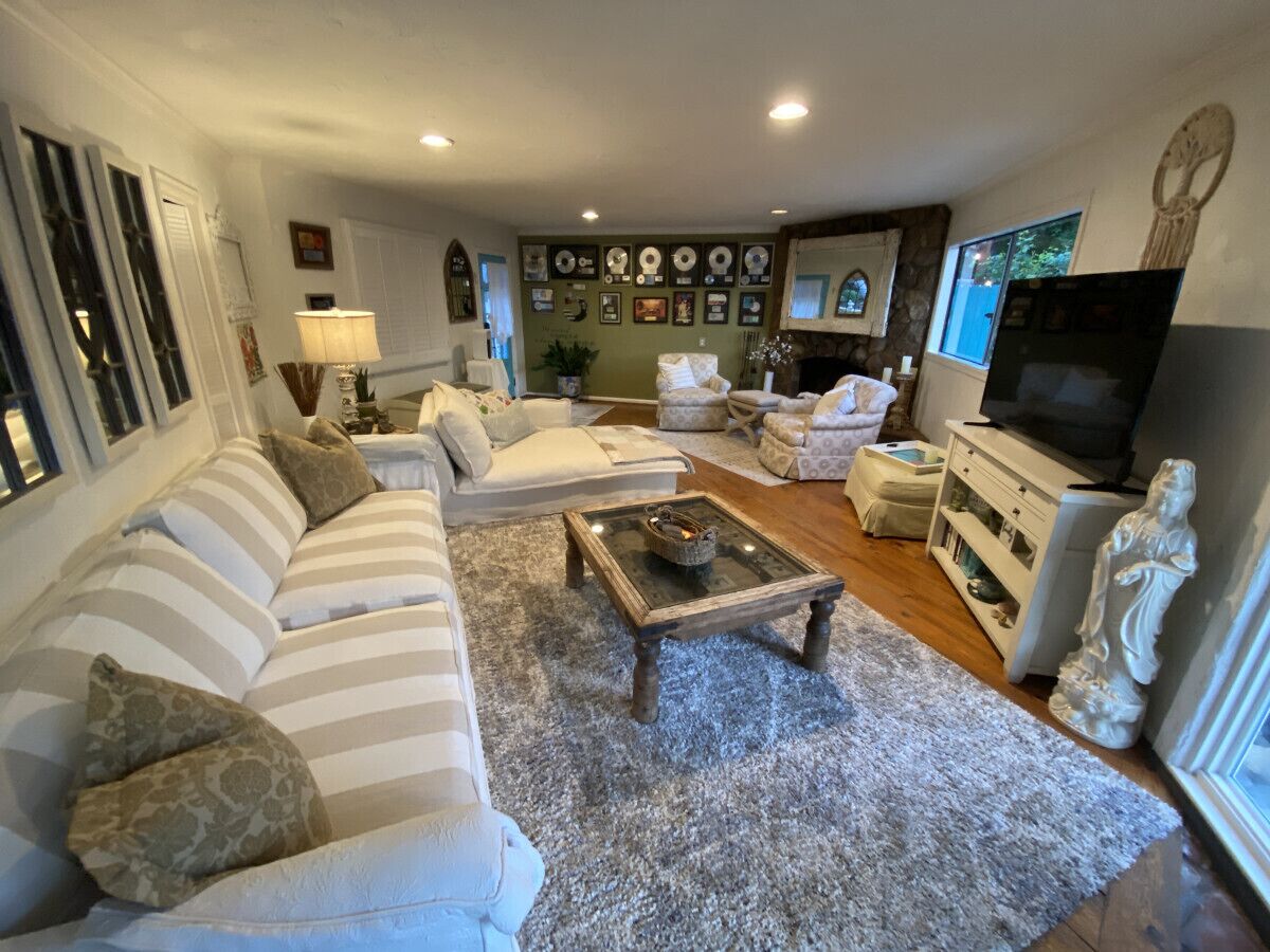 Private Compound Malibu Retreat Salt Pool Yoga The Malibu Retreat ‘s Main & Guest Houses are like staying at your own Private Resort with pool, Jacuzzi, Yoga Deck, Mediterranean Patios, Fire Pit, Ping Pong table & Glorious Mountain Views on 3 acres of beautiful land surrounded by peaceful nature. Property sleeps up to 23 & is great for families. Hiking trails, ocean breezes & legendary Saddle Peak Lodge in exclusive Monte Nido (home of the most influential families) adjacent to both Malibu & Calabasas. Relaxed Luxury with a Boho Chic vibe.The Award Winning Malibu Retreat includes BOTH the Main and Guest Houses on our 3 acre estate property for Vacations, Retreats, Productions, photo shoots, weddings & Exclusive Gatherings (all events on a case by case basis). Just send us the details of your dream plans & we'll give you the appropriate pricing. The Malibu Retreat provides about 5000 sq ft of indoor spaces on 3 acres of unparalleled magical sacred land. It feels which like a private resort for your family or friends to relax & retreat.The Main House is a cool Mediterranean style colorful, inspiring house w/:*4 large bedrooms* 3 full custom bathrooms (2 w/ heated Toto bidets), *2 balconies w/ views *3 real wood burning fireplaces, *A true “Conversation pit”*Gourmet, fully stocked kitchen w/ Viking double oven, food warmer & Sub Zero frig (plus a kitchenette in the GH)*Home Office w/ desks,Monitors, printer & 2 blazing fast Internet / WiFi’s *Indoor / outdoor living & dining rooms*Infinity Zen yoga deck w/ Yoga mats & blocks*Mediterranean patios w/ Positano Italy benches *Natural Bottom Heated Pool & Bubbling Jacuzzi (heat costs extra)*Natural Gas Fire pit*2 Stainless Steel BBQs* Pro Ping Pong Table* 7 New Smart TVs (w/ Netflix, Hulu, Amazon Prime, Showtime, HBO, Apple TV & Roku) * Lush Lawn w/ Hammocks* World-class Hiking Trails * Majestic California Oaks * Glorious Mountain Views* between Malibu’s famous Beaches & Calabasas in Exclusive neighborhood of Monte NidoMain House’s Gourmet custom kitchen:-Limestone Countertops, -Ann Sacks Handblown tiles -Viking double oven w/ 6 burner gas range & griddle-Viking food warmer-Sub-zero refrigerator-Retro stools for kitchen dining-large desk / buffet table-microwave -Toaster oven -multiple coffee pots -opens to Dining Room / Outdoor Living Room Conversation Pit Living room:-gathering place for everyone to gather w/a wood burning fireplacesZen Den: -Home Office w/ pottery barn desk w/ 2 monitors, wifi printer, docking station & office supplies. -yummy couch Primary Living room:-custom down couch -Sixpenny daybed -60 inch smart TV-wood burning fireplaceUpstairs Bedrooms in Main House:1) Shabby Chic Master: -private balcony w/ breathtaking views-Wood-burning fireplace-new king all organic mattress-mini frig-60 inch smart TV-ceiling fan w/colorful Hue lights -2 Shabby Chic Chairs-luxury sheets, pillows & down duvet Master ensuite bath:-tumbled Marble tiles-multi-jet rain shower shower w/ views -Toto bidet heated toilet -Kohler faucets-double vessel sinksAnthropologie Family Suite (sleeps 8 people… great kids room too!): -colorful artistic bedroom w/ 2 Queen beds, luxury sheets & down duvet -2 twin bunk beds in upstairs loft-smart TV-shared balcony-closet & bureau Santana Suite:-new king bed, luxury sheets & down duvet -new smart TV-desk & chair -Shared balconyShared upstairs bath w/ custom tiles, tub/shower & sinks w/ vanities both inside & outside of the bathroom Hawaiian Room (downstairs main house):-private patio -new Queen organic cooling mattress, luxury sheets & down duvet -closet & Bureau House of Blues bathroom (downstairs across the hall from Hawaiian bedroom) - cobalt blue wall vessel sink-tiled glass shower-heated bidet toilet seatAcross the driveway you’ll find the “Music Promoter Guest House”. There are Some dates where Guest House is booked or blocked. Please ASK when booking.Guest House details:1350 sq ft w/bedding for 9! -2 sides w/ open loft bedrooms-one w/ a queen bed -the other w/ 2 new twins, each w/ a trundle -3 more twins downstairs (1 with trundles) -Another living room, dining room, kitchenette & the property’s 4th bathroom. -2 flat screen Smart TVs -Harmon & Kardon 2 room, 4 speaker stereo w/ Bluetooth -Zen Soji screens-Gold & Platinum Records & autographed posters of Artists-Dining area -Retro Kitchenette (refrigerator & freezer, microwave, toaster oven & coffee maker). -Private Patio w/ propane BBQ grill w/ a burner, an outdoor dining table, seating area & utility sink - Leads to shared Pool & Jacuzzi areas -Designer bathroom has a showerOutdoor Pool Area:-35,000 gallon Natural Bottom Pool (which can be heated for extra)-Bubbling Jacuzzi (can be heated for extra) -Gas Fire Pit-Lounge Chairs & daybeds-Dining & Bistro seating -Hammocks-Natural Boulders, palm trees, mountain views -Multi-Level Mediterranean Patios, outdoor living room surrounded by stunning mountain views-handcrafted benches from Positano Italy-gas-fueled DCS BBQ-Protected oak grove -900 Sq Ft Zen Yoga Deck w/ Buddhas, Bamboo, Bougainvillea -Ping Pong table -7000 sq ft lush lawn -10,000 acres of parkland and hiking trails -upper and lower driveways for plenty of parking We DO host select gatherings, weddings, photo shoots, retreats & production locations for movies & music videos, but all of these types of bookings have different needs, parameters, rules, regulations & contracts. So if you’re planning for anything other than a vacation stay, feel free to reach out to us and include all of your needs & details outlined so we can give you the correct pricing to accommodate (if it’s possible). We are NOT a good fit for wild parties! We’re more like a quiet, beautiful, sanctuary.... For Liability Purposes, only registered guests are permitted on property at any time - so if you plan to have company, please include your guests in the total booking number. Important to know: We issue direct leases with our guests once you book here & we requ