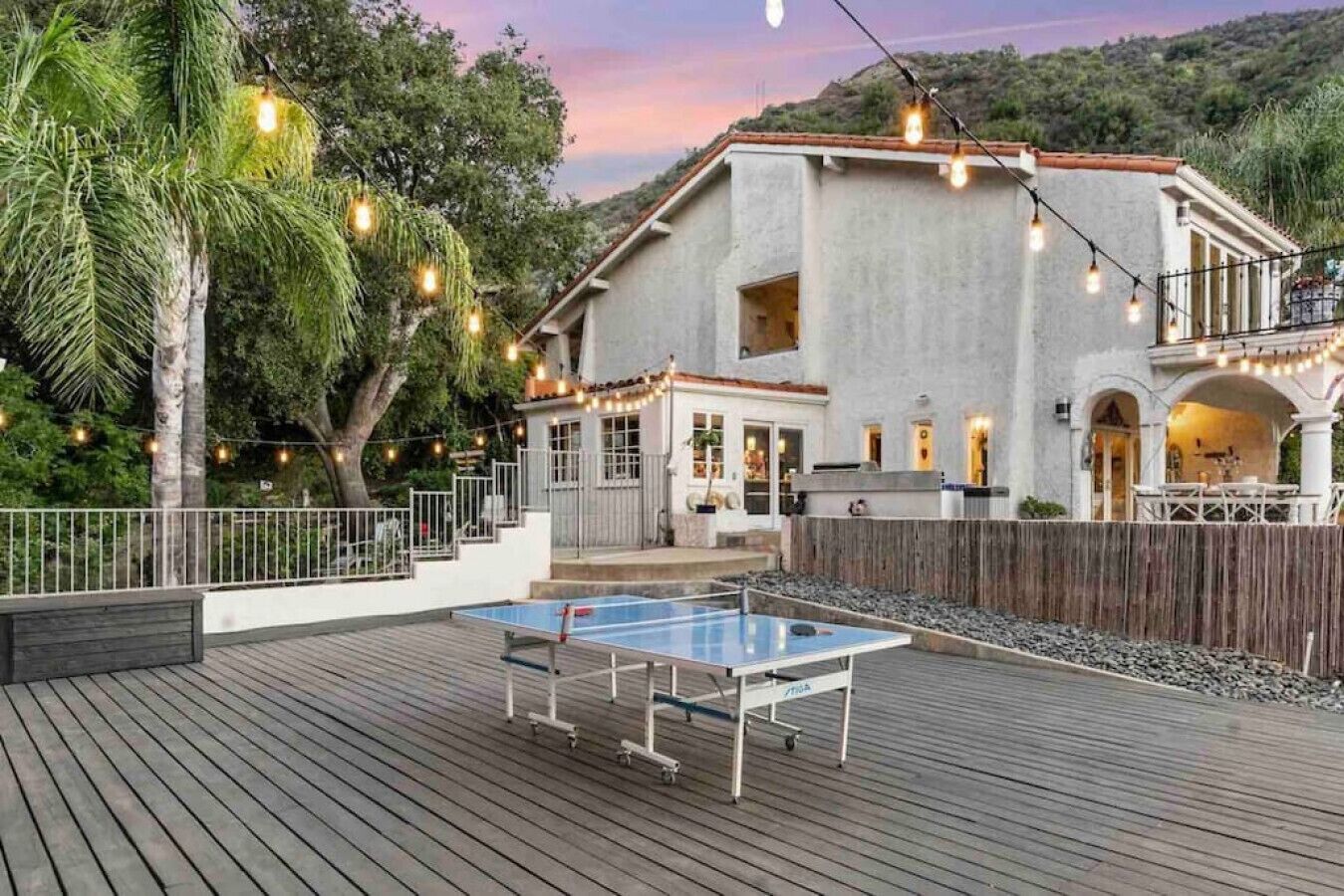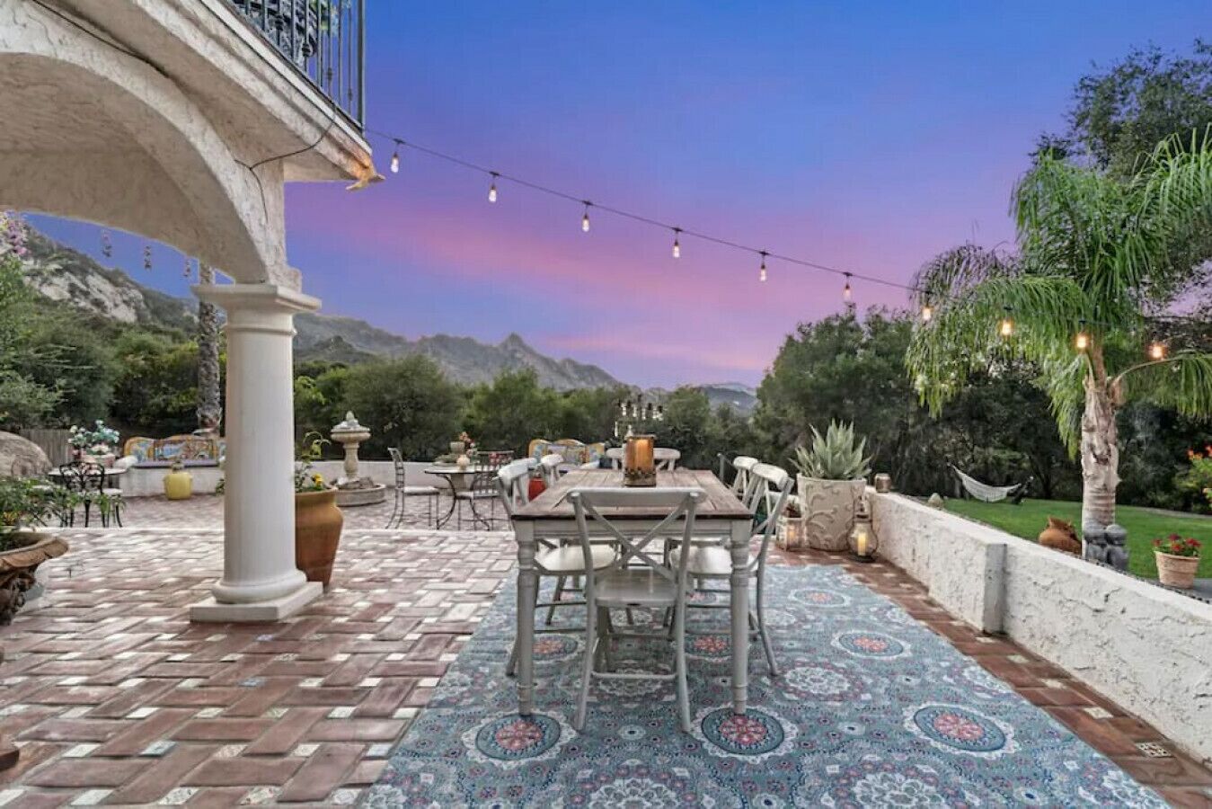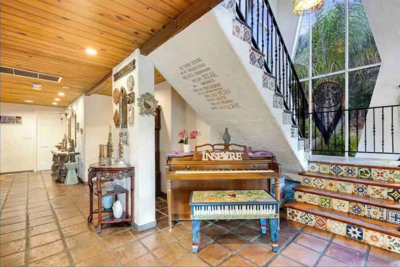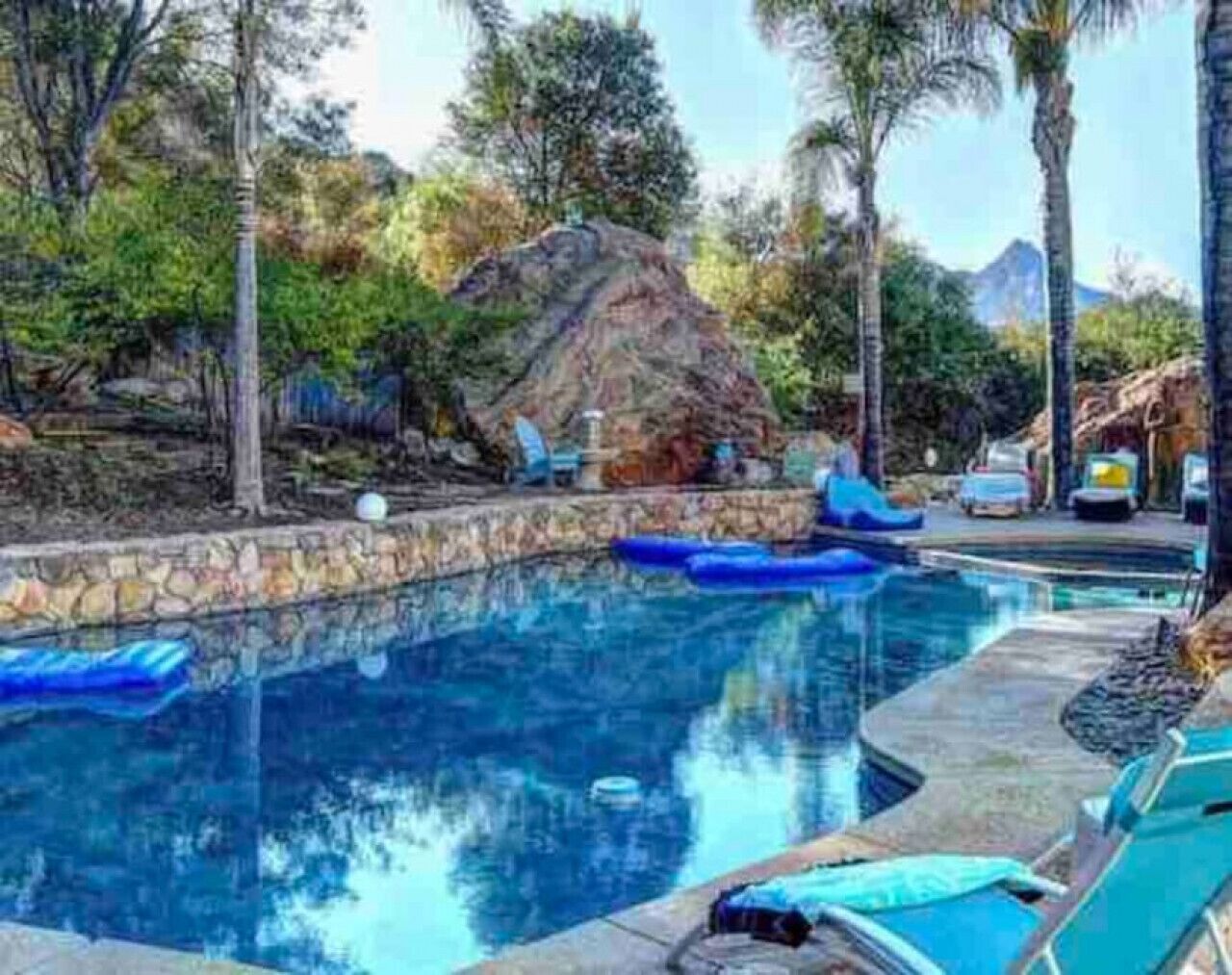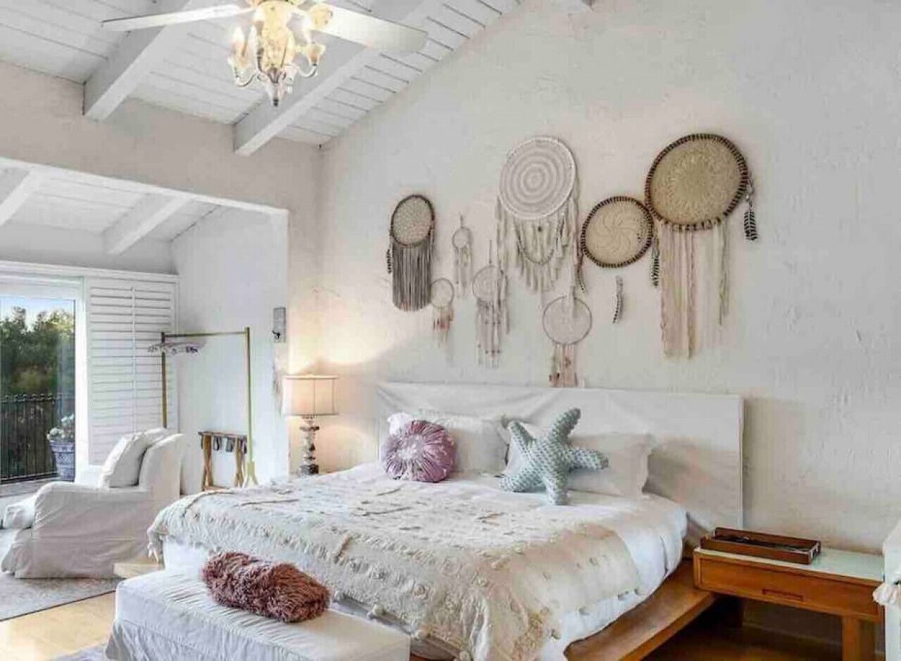 Private Compound Malibu Retreat Salt Pool Yoga The Malibu Retreat ‘s Main & Guest Houses are like staying at your own Private Resort with pool, Jacuzzi, Yoga Deck, Mediterranean Patios, Fire Pit, Ping Pong table & Glorious Mountain Views on 3 acres of beautiful land surrounded by peaceful nature. Property sleeps up to 23 & is great for families. Hiking trails, ocean breezes & legendary Saddle Peak Lodge in exclusive Monte Nido (home of the most influential families) adjacent to both Malibu & Calabasas. Relaxed Luxury with a Boho Chic vibe.The Award Winning Malibu Retreat includes BOTH the Main and Guest Houses on our 3 acre estate property for Vacations, Retreats, Productions, photo shoots, weddings & Exclusive Gatherings (all events on a case by case basis). Just send us the details of your dream plans & we'll give you the appropriate pricing. The Malibu Retreat provides about 5000 sq ft of indoor spaces on 3 acres of unparalleled magical sacred land. It feels which like a private resort for your family or friends to relax & retreat.The Main House is a cool Mediterranean style colorful, inspiring house w/:*4 large bedrooms* 3 full custom bathrooms (2 w/ heated Toto bidets), *2 balconies w/ views *3 real wood burning fireplaces, *A true “Conversation pit”*Gourmet, fully stocked kitchen w/ Viking double oven, food warmer & Sub Zero frig (plus a kitchenette in the GH)*Home Office w/ desks,Monitors, printer & 2 blazing fast Internet / WiFi’s *Indoor / outdoor living & dining rooms*Infinity Zen yoga deck w/ Yoga mats & blocks*Mediterranean patios w/ Positano Italy benches *Natural Bottom Heated Pool & Bubbling Jacuzzi (heat costs extra)*Natural Gas Fire pit*2 Stainless Steel BBQs* Pro Ping Pong Table* 7 New Smart TVs (w/ Netflix, Hulu, Amazon Prime, Showtime, HBO, Apple TV & Roku) * Lush Lawn w/ Hammocks* World-class Hiking Trails * Majestic California Oaks * Glorious Mountain Views* between Malibu’s famous Beaches & Calabasas in Exclusive neighborhood of Monte NidoMain House’s Gourmet custom kitchen:-Limestone Countertops, -Ann Sacks Handblown tiles -Viking double oven w/ 6 burner gas range & griddle-Viking food warmer-Sub-zero refrigerator-Retro stools for kitchen dining-large desk / buffet table-microwave -Toaster oven -multiple coffee pots -opens to Dining Room / Outdoor Living Room Conversation Pit Living room:-gathering place for everyone to gather w/a wood burning fireplacesZen Den: -Home Office w/ pottery barn desk w/ 2 monitors, wifi printer, docking station & office supplies. -yummy couch Primary Living room:-custom down couch -Sixpenny daybed -60 inch smart TV-wood burning fireplaceUpstairs Bedrooms in Main House:1) Shabby Chic Master: -private balcony w/ breathtaking views-Wood-burning fireplace-new king all organic mattress-mini frig-60 inch smart TV-ceiling fan w/colorful Hue lights -2 Shabby Chic Chairs-luxury sheets, pillows & down duvet Master ensuite bath:-tumbled Marble tiles-multi-jet rain shower shower w/ views -Toto bidet heated toilet -Kohler faucets-double vessel sinksAnthropologie Family Suite (sleeps 8 people… great kids room too!): -colorful artistic bedroom w/ 2 Queen beds, luxury sheets & down duvet -2 twin bunk beds in upstairs loft-smart TV-shared balcony-closet & bureau Santana Suite:-new king bed, luxury sheets & down duvet -new smart TV-desk & chair -Shared balconyShared upstairs bath w/ custom tiles, tub/shower & sinks w/ vanities both inside & outside of the bathroom Hawaiian Room (downstairs main house):-private patio -new Queen organic cooling mattress, luxury sheets & down duvet -closet & Bureau House of Blues bathroom (downstairs across the hall from Hawaiian bedroom) - cobalt blue wall vessel sink-tiled glass shower-heated bidet toilet seatAcross the driveway you’ll find the “Music Promoter Guest House”. There are Some dates where Guest House is booked or blocked. Please ASK when booking.Guest House details:1350 sq ft w/bedding for 9! -2 sides w/ open loft bedrooms-one w/ a queen bed -the other w/ 2 new twins, each w/ a trundle -3 more twins downstairs (1 with trundles) -Another living room, dining room, kitchenette & the property’s 4th bathroom. -2 flat screen Smart TVs -Harmon & Kardon 2 room, 4 speaker stereo w/ Bluetooth -Zen Soji screens-Gold & Platinum Records & autographed posters of Artists-Dining area -Retro Kitchenette (refrigerator & freezer, microwave, toaster oven & coffee maker). -Private Patio w/ propane BBQ grill w/ a burner, an outdoor dining table, seating area & utility sink - Leads to shared Pool & Jacuzzi areas -Designer bathroom has a showerOutdoor Pool Area:-35,000 gallon Natural Bottom Pool (which can be heated for extra)-Bubbling Jacuzzi (can be heated for extra) -Gas Fire Pit-Lounge Chairs & daybeds-Dining & Bistro seating -Hammocks-Natural Boulders, palm trees, mountain views -Multi-Level Mediterranean Patios, outdoor living room surrounded by stunning mountain views-handcrafted benches from Positano Italy-gas-fueled DCS BBQ-Protected oak grove -900 Sq Ft Zen Yoga Deck w/ Buddhas, Bamboo, Bougainvillea -Ping Pong table -7000 sq ft lush lawn -10,000 acres of parkland and hiking trails -upper and lower driveways for plenty of parking We DO host select gatherings, weddings, photo shoots, retreats & production locations for movies & music videos, but all of these types of bookings have different needs, parameters, rules, regulations & contracts. So if you’re planning for anything other than a vacation stay, feel free to reach out to us and include all of your needs & details outlined so we can give you the correct pricing to accommodate (if it’s possible). We are NOT a good fit for wild parties! We’re more like a quiet, beautiful, sanctuary.... For Liability Purposes, only registered guests are permitted on property at any time - so if you plan to have company, please include your guests in the total booking number. Important to know: We issue direct leases with our guests once you book here & we requ