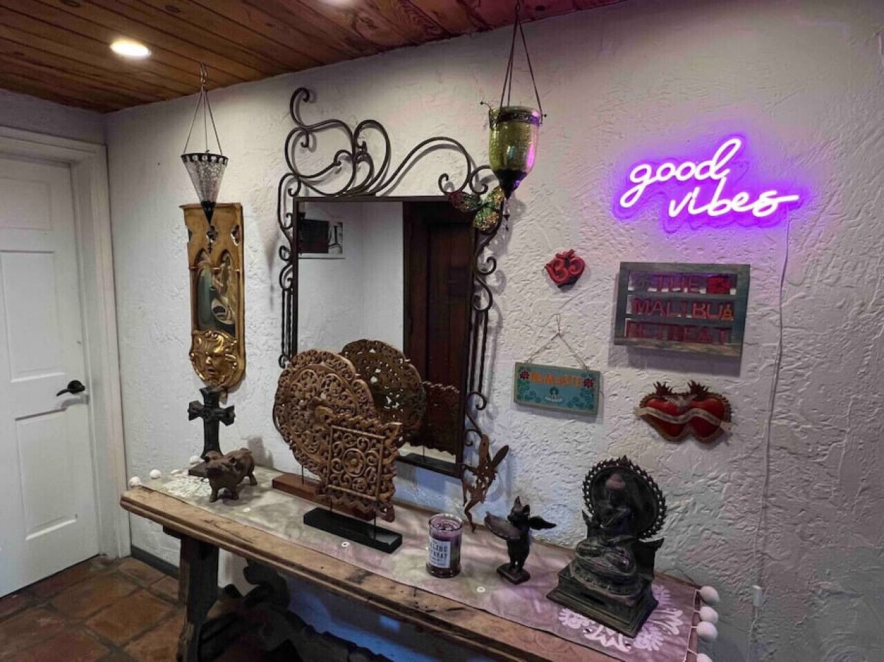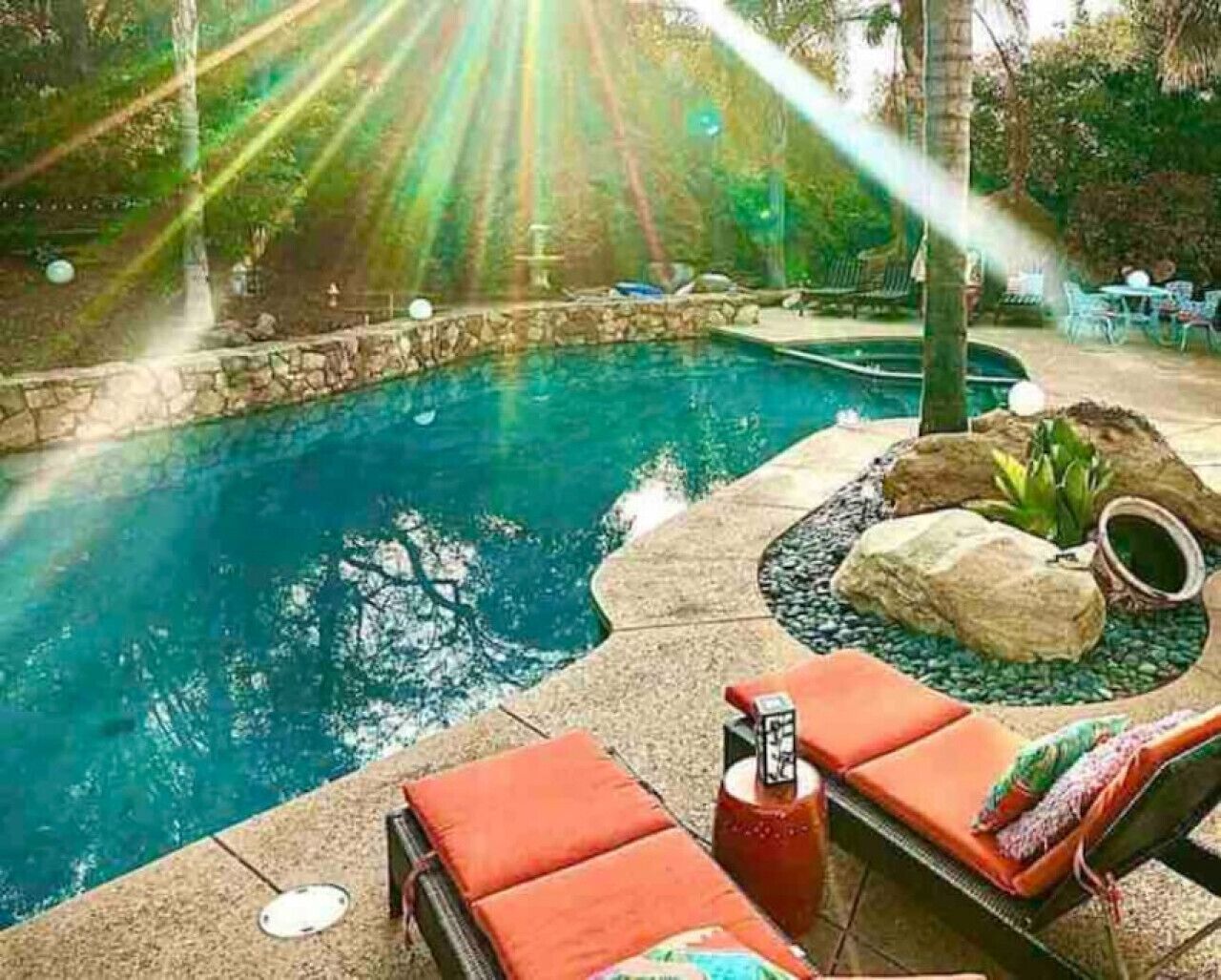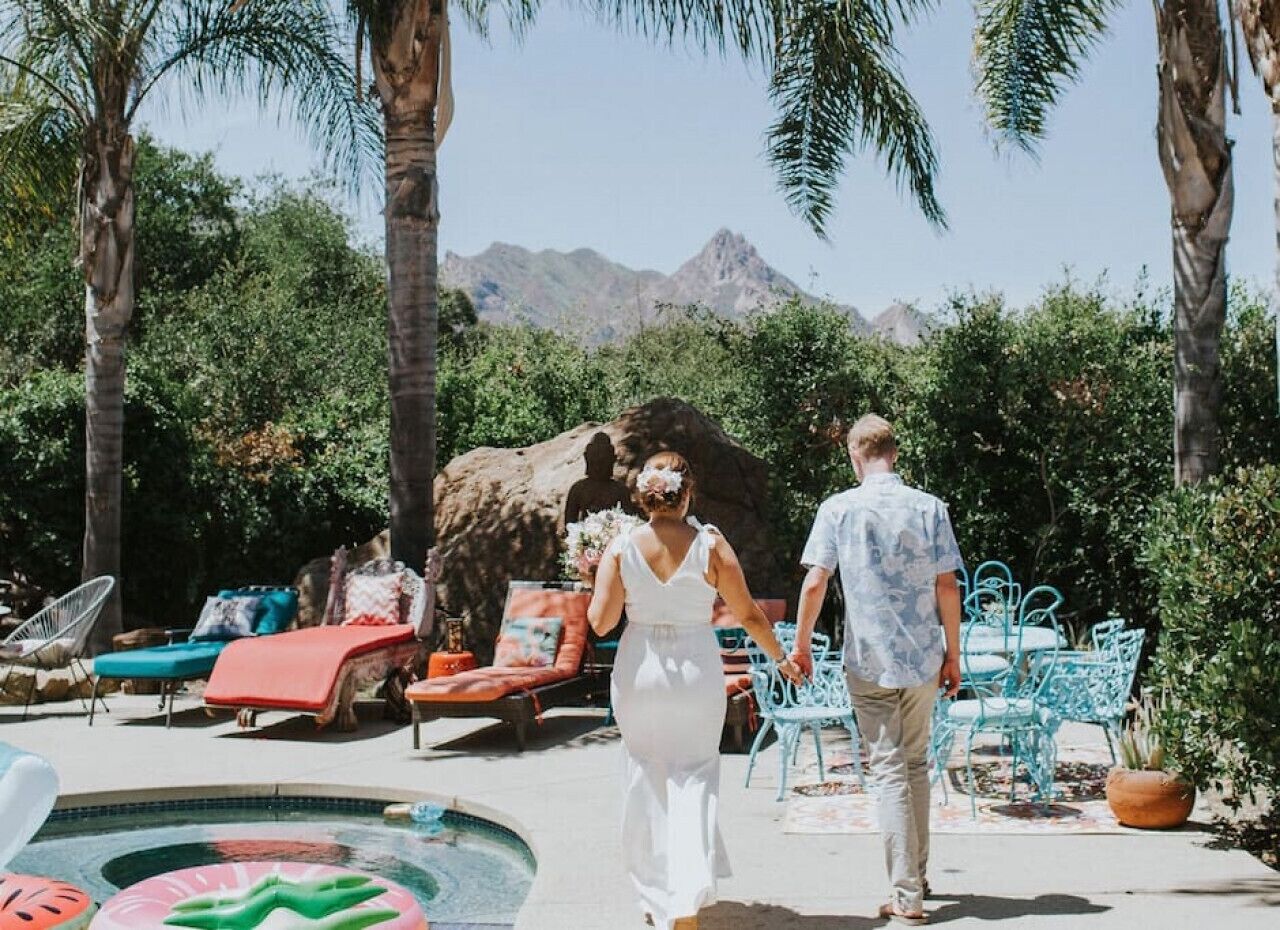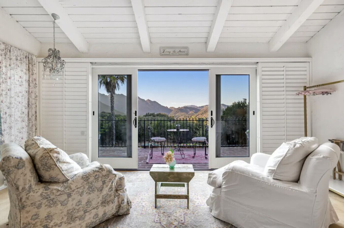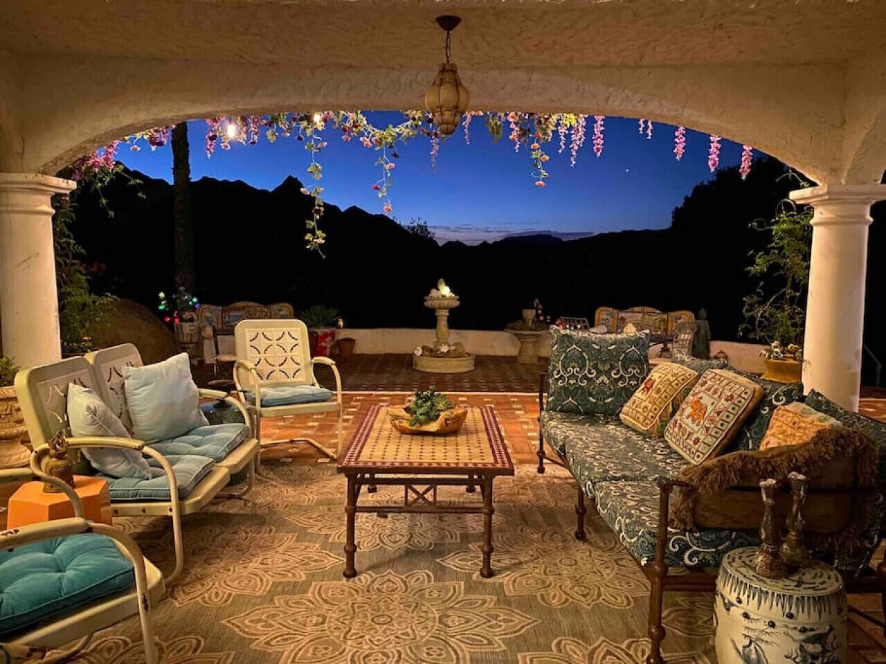 Private Compound Malibu Retreat Salt Pool Yoga The Malibu Retreat ‘s Main & Guest Houses are like staying at your own Private Resort with pool, Jacuzzi, Yoga Deck, Mediterranean Patios, Fire Pit, Ping Pong table & Glorious Mountain Views on 3 acres of beautiful land surrounded by peaceful nature. Property sleeps up to 23 & is great for families. Hiking trails, ocean breezes & legendary Saddle Peak Lodge in exclusive Monte Nido (home of the most influential families) adjacent to both Malibu & Calabasas. Relaxed Luxury with a Boho Chic vibe.The Award Winning Malibu Retreat includes BOTH the Main and Guest Houses on our 3 acre estate property for Vacations, Retreats, Productions, photo shoots, weddings & Exclusive Gatherings (all events on a case by case basis). Just send us the details of your dream plans & we'll give you the appropriate pricing. The Malibu Retreat provides about 5000 sq ft of indoor spaces on 3 acres of unparalleled magical sacred land. It feels which like a private resort for your family or friends to relax & retreat.The Main House is a cool Mediterranean style colorful, inspiring house w/:*4 large bedrooms* 3 full custom bathrooms (2 w/ heated Toto bidets), *2 balconies w/ views *3 real wood burning fireplaces, *A true “Conversation pit”*Gourmet, fully stocked kitchen w/ Viking double oven, food warmer & Sub Zero frig (plus a kitchenette in the GH)*Home Office w/ desks,Monitors, printer & 2 blazing fast Internet / WiFi’s *Indoor / outdoor living & dining rooms*Infinity Zen yoga deck w/ Yoga mats & blocks*Mediterranean patios w/ Positano Italy benches *Natural Bottom Heated Pool & Bubbling Jacuzzi (heat costs extra)*Natural Gas Fire pit*2 Stainless Steel BBQs* Pro Ping Pong Table* 7 New Smart TVs (w/ Netflix, Hulu, Amazon Prime, Showtime, HBO, Apple TV & Roku) * Lush Lawn w/ Hammocks* World-class Hiking Trails * Majestic California Oaks * Glorious Mountain Views* between Malibu’s famous Beaches & Calabasas in Exclusive neighborhood of Monte NidoMain House’s Gourmet custom kitchen:-Limestone Countertops, -Ann Sacks Handblown tiles -Viking double oven w/ 6 burner gas range & griddle-Viking food warmer-Sub-zero refrigerator-Retro stools for kitchen dining-large desk / buffet table-microwave -Toaster oven -multiple coffee pots -opens to Dining Room / Outdoor Living Room Conversation Pit Living room:-gathering place for everyone to gather w/a wood burning fireplacesZen Den: -Home Office w/ pottery barn desk w/ 2 monitors, wifi printer, docking station & office supplies. -yummy couch Primary Living room:-custom down couch -Sixpenny daybed -60 inch smart TV-wood burning fireplaceUpstairs Bedrooms in Main House:1) Shabby Chic Master: -private balcony w/ breathtaking views-Wood-burning fireplace-new king all organic mattress-mini frig-60 inch smart TV-ceiling fan w/colorful Hue lights -2 Shabby Chic Chairs-luxury sheets, pillows & down duvet Master ensuite bath:-tumbled Marble tiles-multi-jet rain shower shower w/ views -Toto bidet heated toilet -Kohler faucets-double vessel sinksAnthropologie Family Suite (sleeps 8 people… great kids room too!): -colorful artistic bedroom w/ 2 Queen beds, luxury sheets & down duvet -2 twin bunk beds in upstairs loft-smart TV-shared balcony-closet & bureau Santana Suite:-new king bed, luxury sheets & down duvet -new smart TV-desk & chair -Shared balconyShared upstairs bath w/ custom tiles, tub/shower & sinks w/ vanities both inside & outside of the bathroom Hawaiian Room (downstairs main house):-private patio -new Queen organic cooling mattress, luxury sheets & down duvet -closet & Bureau House of Blues bathroom (downstairs across the hall from Hawaiian bedroom) - cobalt blue wall vessel sink-tiled glass shower-heated bidet toilet seatAcross the driveway you’ll find the “Music Promoter Guest House”. There are Some dates where Guest House is booked or blocked. Please ASK when booking.Guest House details:1350 sq ft w/bedding for 9! -2 sides w/ open loft bedrooms-one w/ a queen bed -the other w/ 2 new twins, each w/ a trundle -3 more twins downstairs (1 with trundles) -Another living room, dining room, kitchenette & the property’s 4th bathroom. -2 flat screen Smart TVs -Harmon & Kardon 2 room, 4 speaker stereo w/ Bluetooth -Zen Soji screens-Gold & Platinum Records & autographed posters of Artists-Dining area -Retro Kitchenette (refrigerator & freezer, microwave, toaster oven & coffee maker). -Private Patio w/ propane BBQ grill w/ a burner, an outdoor dining table, seating area & utility sink - Leads to shared Pool & Jacuzzi areas -Designer bathroom has a showerOutdoor Pool Area:-35,000 gallon Natural Bottom Pool (which can be heated for extra)-Bubbling Jacuzzi (can be heated for extra) -Gas Fire Pit-Lounge Chairs & daybeds-Dining & Bistro seating -Hammocks-Natural Boulders, palm trees, mountain views -Multi-Level Mediterranean Patios, outdoor living room surrounded by stunning mountain views-handcrafted benches from Positano Italy-gas-fueled DCS BBQ-Protected oak grove -900 Sq Ft Zen Yoga Deck w/ Buddhas, Bamboo, Bougainvillea -Ping Pong table -7000 sq ft lush lawn -10,000 acres of parkland and hiking trails -upper and lower driveways for plenty of parking We DO host select gatherings, weddings, photo shoots, retreats & production locations for movies & music videos, but all of these types of bookings have different needs, parameters, rules, regulations & contracts. So if you’re planning for anything other than a vacation stay, feel free to reach out to us and include all of your needs & details outlined so we can give you the correct pricing to accommodate (if it’s possible). We are NOT a good fit for wild parties! We’re more like a quiet, beautiful, sanctuary.... For Liability Purposes, only registered guests are permitted on property at any time - so if you plan to have company, please include your guests in the total booking number. Important to know: We issue direct leases with our guests once you book here & we requ