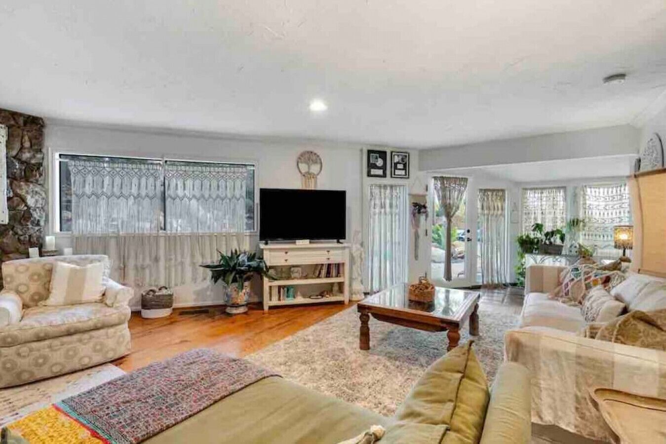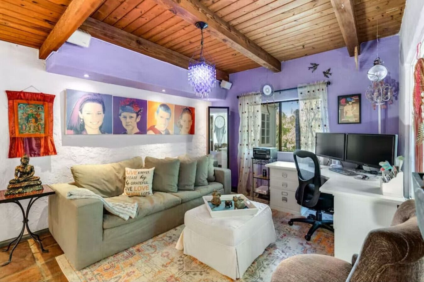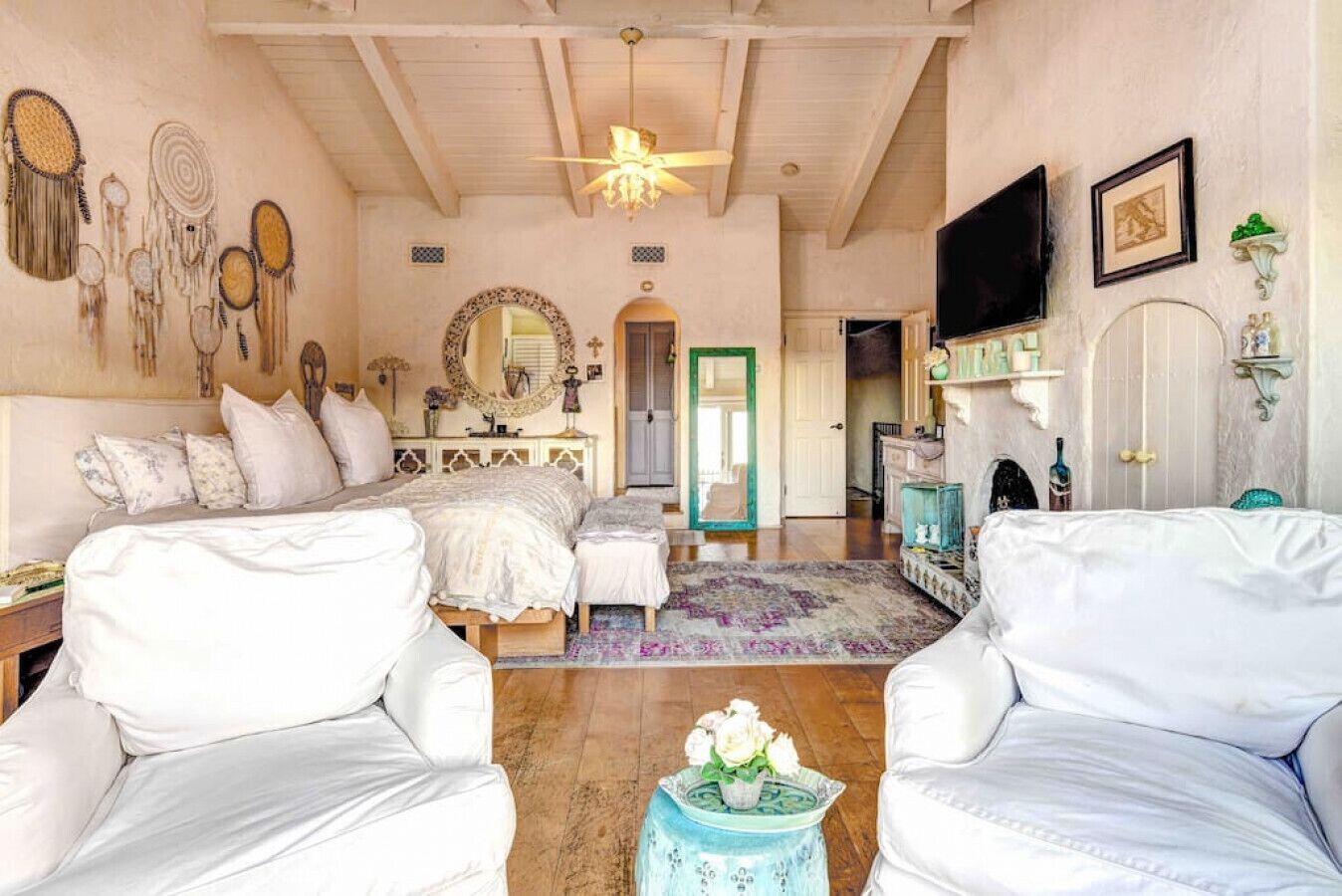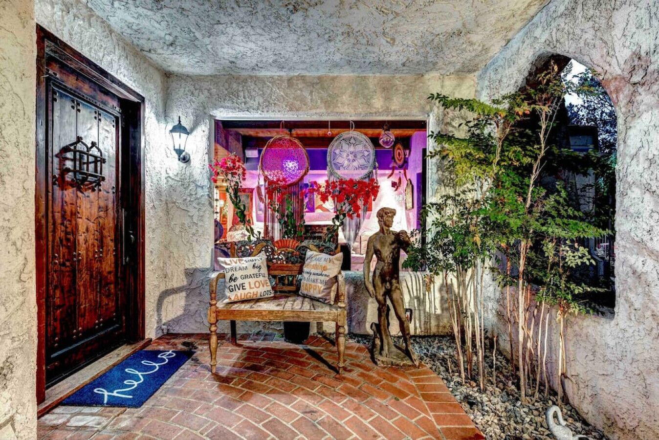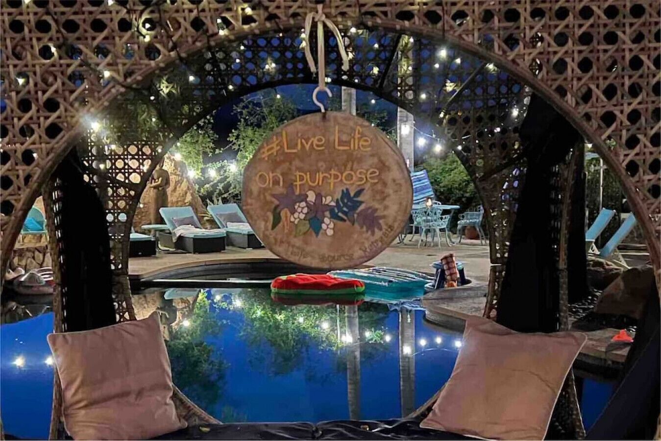 Private Compound Malibu Retreat Salt Pool Yoga The Malibu Retreat ‘s Main & Guest Houses are like staying at your own Private Resort with pool, Jacuzzi, Yoga Deck, Mediterranean Patios, Fire Pit, Ping Pong table & Glorious Mountain Views on 3 acres of beautiful land surrounded by peaceful nature. Property sleeps up to 23 & is great for families. Hiking trails, ocean breezes & legendary Saddle Peak Lodge in exclusive Monte Nido (home of the most influential families) adjacent to both Malibu & Calabasas. Relaxed Luxury with a Boho Chic vibe.The Award Winning Malibu Retreat includes BOTH the Main and Guest Houses on our 3 acre estate property for Vacations, Retreats, Productions, photo shoots, weddings & Exclusive Gatherings (all events on a case by case basis). Just send us the details of your dream plans & we'll give you the appropriate pricing. The Malibu Retreat provides about 5000 sq ft of indoor spaces on 3 acres of unparalleled magical sacred land. It feels which like a private resort for your family or friends to relax & retreat.The Main House is a cool Mediterranean style colorful, inspiring house w/:*4 large bedrooms* 3 full custom bathrooms (2 w/ heated Toto bidets), *2 balconies w/ views *3 real wood burning fireplaces, *A true “Conversation pit”*Gourmet, fully stocked kitchen w/ Viking double oven, food warmer & Sub Zero frig (plus a kitchenette in the GH)*Home Office w/ desks,Monitors, printer & 2 blazing fast Internet / WiFi’s *Indoor / outdoor living & dining rooms*Infinity Zen yoga deck w/ Yoga mats & blocks*Mediterranean patios w/ Positano Italy benches *Natural Bottom Heated Pool & Bubbling Jacuzzi (heat costs extra)*Natural Gas Fire pit*2 Stainless Steel BBQs* Pro Ping Pong Table* 7 New Smart TVs (w/ Netflix, Hulu, Amazon Prime, Showtime, HBO, Apple TV & Roku) * Lush Lawn w/ Hammocks* World-class Hiking Trails * Majestic California Oaks * Glorious Mountain Views* between Malibu’s famous Beaches & Calabasas in Exclusive neighborhood of Monte NidoMain House’s Gourmet custom kitchen:-Limestone Countertops, -Ann Sacks Handblown tiles -Viking double oven w/ 6 burner gas range & griddle-Viking food warmer-Sub-zero refrigerator-Retro stools for kitchen dining-large desk / buffet table-microwave -Toaster oven -multiple coffee pots -opens to Dining Room / Outdoor Living Room Conversation Pit Living room:-gathering place for everyone to gather w/a wood burning fireplacesZen Den: -Home Office w/ pottery barn desk w/ 2 monitors, wifi printer, docking station & office supplies. -yummy couch Primary Living room:-custom down couch -Sixpenny daybed -60 inch smart TV-wood burning fireplaceUpstairs Bedrooms in Main House:1) Shabby Chic Master: -private balcony w/ breathtaking views-Wood-burning fireplace-new king all organic mattress-mini frig-60 inch smart TV-ceiling fan w/colorful Hue lights -2 Shabby Chic Chairs-luxury sheets, pillows & down duvet Master ensuite bath:-tumbled Marble tiles-multi-jet rain shower shower w/ views -Toto bidet heated toilet -Kohler faucets-double vessel sinksAnthropologie Family Suite (sleeps 8 people… great kids room too!): -colorful artistic bedroom w/ 2 Queen beds, luxury sheets & down duvet -2 twin bunk beds in upstairs loft-smart TV-shared balcony-closet & bureau Santana Suite:-new king bed, luxury sheets & down duvet -new smart TV-desk & chair -Shared balconyShared upstairs bath w/ custom tiles, tub/shower & sinks w/ vanities both inside & outside of the bathroom Hawaiian Room (downstairs main house):-private patio -new Queen organic cooling mattress, luxury sheets & down duvet -closet & Bureau House of Blues bathroom (downstairs across the hall from Hawaiian bedroom) - cobalt blue wall vessel sink-tiled glass shower-heated bidet toilet seatAcross the driveway you’ll find the “Music Promoter Guest House”. There are Some dates where Guest House is booked or blocked. Please ASK when booking.Guest House details:1350 sq ft w/bedding for 9! -2 sides w/ open loft bedrooms-one w/ a queen bed -the other w/ 2 new twins, each w/ a trundle -3 more twins downstairs (1 with trundles) -Another living room, dining room, kitchenette & the property’s 4th bathroom. -2 flat screen Smart TVs -Harmon & Kardon 2 room, 4 speaker stereo w/ Bluetooth -Zen Soji screens-Gold & Platinum Records & autographed posters of Artists-Dining area -Retro Kitchenette (refrigerator & freezer, microwave, toaster oven & coffee maker). -Private Patio w/ propane BBQ grill w/ a burner, an outdoor dining table, seating area & utility sink - Leads to shared Pool & Jacuzzi areas -Designer bathroom has a showerOutdoor Pool Area:-35,000 gallon Natural Bottom Pool (which can be heated for extra)-Bubbling Jacuzzi (can be heated for extra) -Gas Fire Pit-Lounge Chairs & daybeds-Dining & Bistro seating -Hammocks-Natural Boulders, palm trees, mountain views -Multi-Level Mediterranean Patios, outdoor living room surrounded by stunning mountain views-handcrafted benches from Positano Italy-gas-fueled DCS BBQ-Protected oak grove -900 Sq Ft Zen Yoga Deck w/ Buddhas, Bamboo, Bougainvillea -Ping Pong table -7000 sq ft lush lawn -10,000 acres of parkland and hiking trails -upper and lower driveways for plenty of parking We DO host select gatherings, weddings, photo shoots, retreats & production locations for movies & music videos, but all of these types of bookings have different needs, parameters, rules, regulations & contracts. So if you’re planning for anything other than a vacation stay, feel free to reach out to us and include all of your needs & details outlined so we can give you the correct pricing to accommodate (if it’s possible). We are NOT a good fit for wild parties! We’re more like a quiet, beautiful, sanctuary.... For Liability Purposes, only registered guests are permitted on property at any time - so if you plan to have company, please include your guests in the total booking number. Important to know: We issue direct leases with our guests once you book here & we requ
