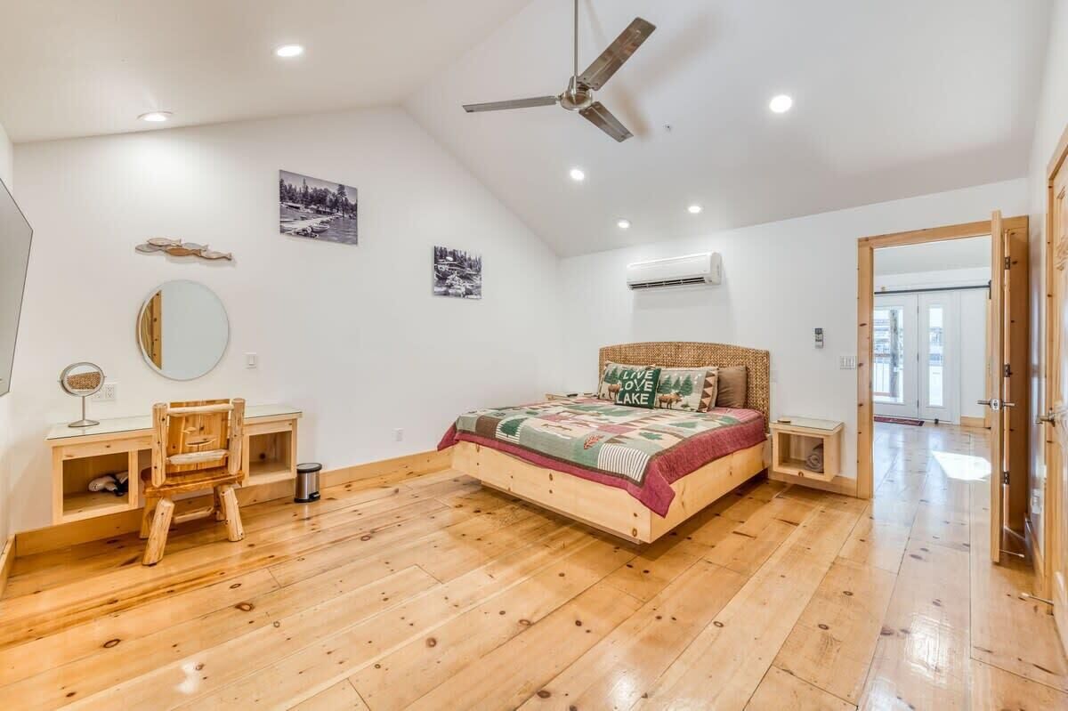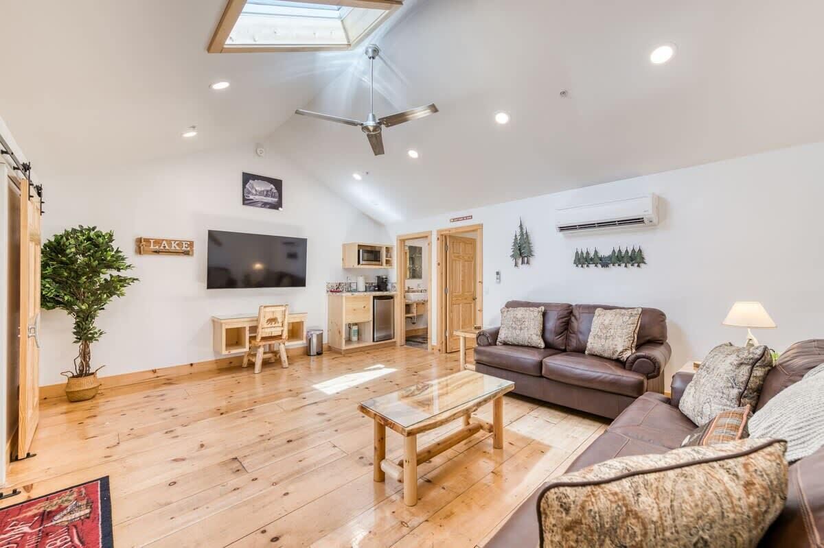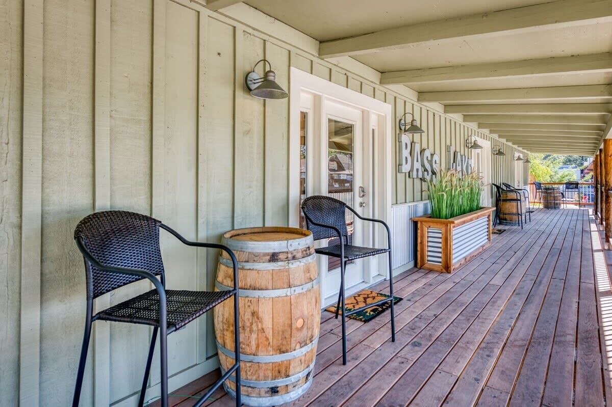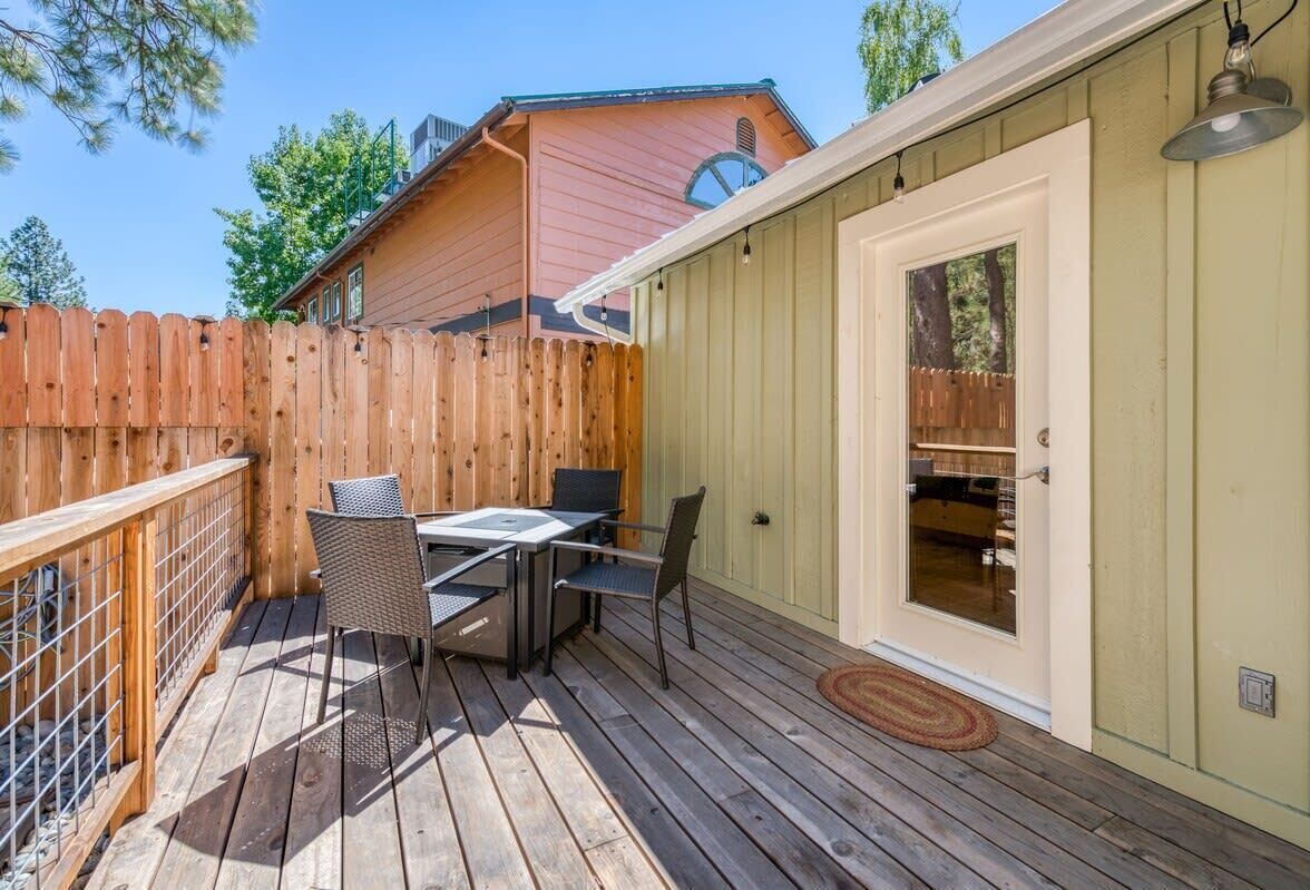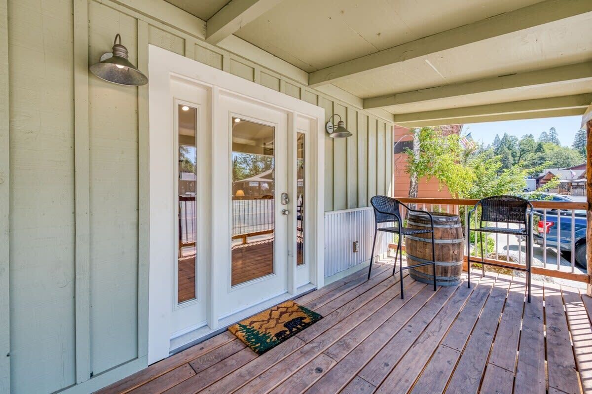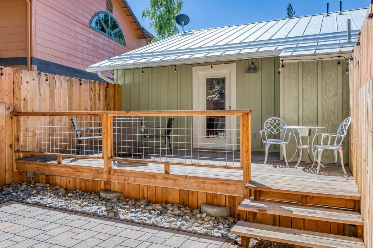 Cottage Like Suite With Private Hot Tub Summary:Unique 1 Bedroom, 1 Bath Mini-Lodge with a personal Hot tub and Fire pit. Beautiful Lake view. 750 square feet of indoor bliss. 400 feet of outdoor, fenced-in rear deck privacy. Location surrounded by luxury. Kitchenette, Keurig, work desk and separate vanity. Park the car. Located in the Pines Village and walkable to everything, including 4 restaurants, The Marina, 2 bars, boat rentals, market, boutique shops and a beach. Yosemite entrance is only 14 miles away. Great for couples!The Space:Individual mini-lodge unit with living room, bedroom, bathroom and private deck. Cathedral ceilings, all natural pine wood floors, large slate shower and leather couches offer cleanliness from the moment you enter. Private rear deck, wood fenced with your own hot tub, outdoor table and gas fire pit. S'mores time! 200 mbps wifi, large 65" TV in living room, 55" TV in bedroom, sunlight and cathedral ceilings add to the comforts. Double insulated for quiet time, this suite is individual and similar to a hotel room in that it has no adjourning doors.Guest Access:Park the car and walk everywhere. Located on the edge of town, the market, bars, restaurants, boat rentals and marina are all right there. Plenty of on-site free parking. Map it and see how easy your get-away will be.The Neighborhood:Bass Lake is a safe, friendly mountain town with that old-school feel.Getting Around:Walk everywhere, as this is THE location. We promise you will like the location of the suite and the privacy it offers! Map it! 54331 Road 432, Bass LakeOther Things to Note:Front of line at boat rentals and famous Marina Grill (when open). Automatic generator back-up should power fail. Washer/dryer in suite. Kitchenette with mini fridge, micro and Keurig. Iron, blow-dryer, walk-in closet, vanity and work station too. High speed wifi for all your gadgets.