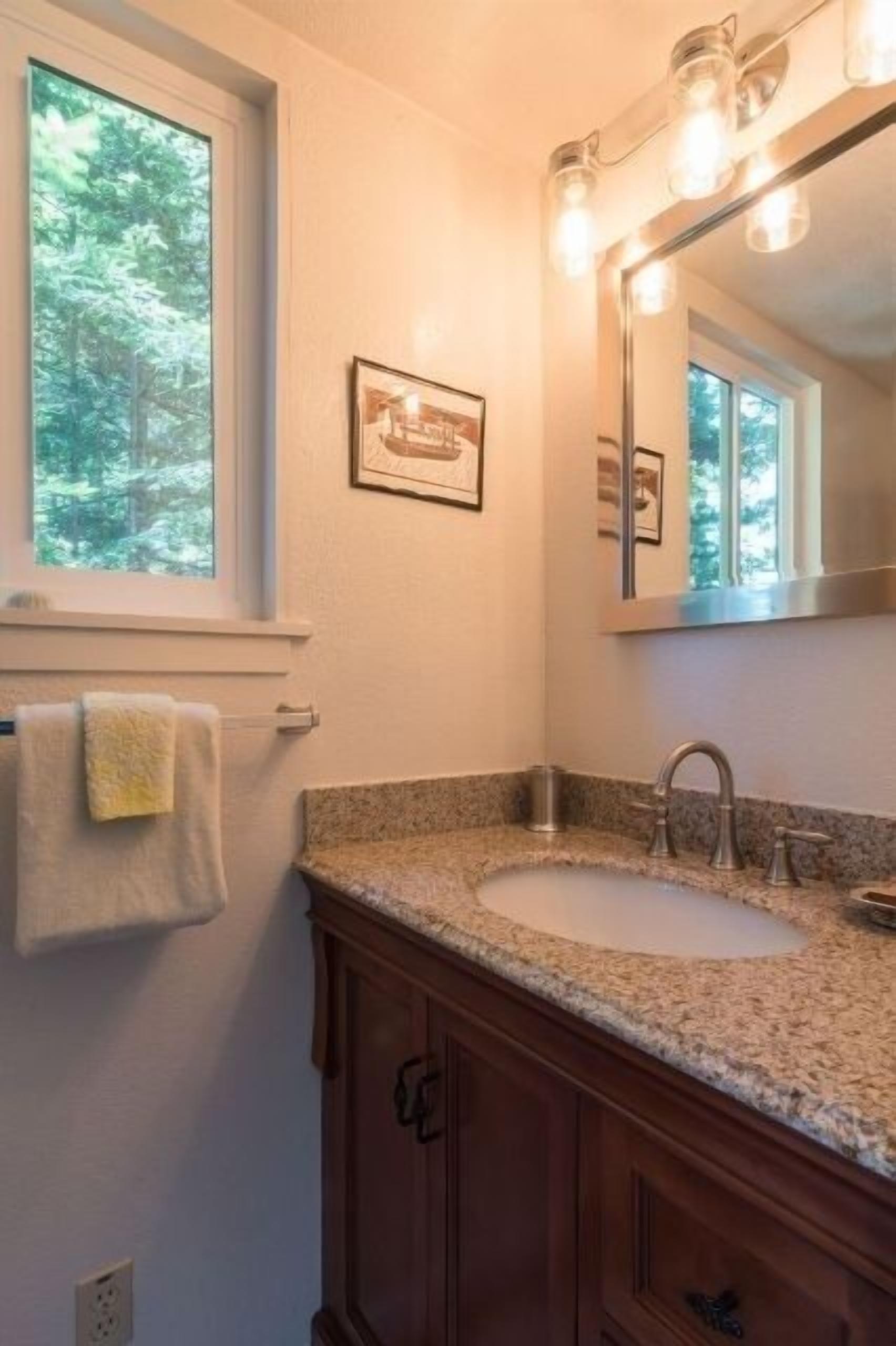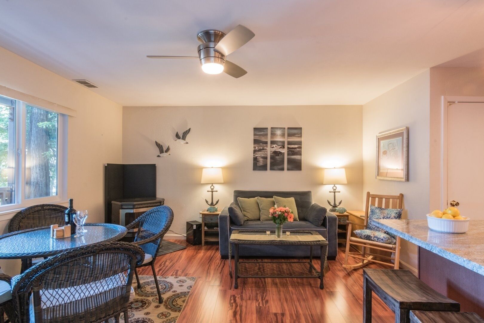 Fish Rock Retreat by RedAwning Fish Rock Retreat is a very sweet cabin in Anchor Bay Village just north of Gualala. A short walk takes you to the trail to Anchor Bay beach, with free access for walk-ins. The village shops are about a block from the house and include the White Cap Cafe with great coffee drinks and treats; Anchor Bay Thai Kitchen with authentic dishes; and the Anchor Bay Store for almost anything you could need or want during your stay.SUMMER SPECIAL! JULY-AUGUST RESERVE AT LEAST A 31 DAY BLOCK AT 31% SAVINGS! Stay for parts or all of the period at this significant rate reduction! Secure your summer getaway today!The main level welcomes you with a modern spacious kitchen with granite counters and stainless appliances. The open floor plan makes for an easy flow from kitchen, through living area and out to the deck. There is also the main bathroom with shower on this level. Enjoy the serenity of the redwoods on the deck, including a gas BBQ and fire pit.Upstairs are the loft bed; and the main bedroom with a half-bath, and the ocean view. The main bedroom as well as living room have flat screen TVs with Firesticks to stream DirecTV, and access to many other apps. Unlimited WiFi is available. Bring your own account login for streaming apps.The home is heated with electric space heaters and a pellet stove. Dogs are accepted with additional fee $65 per dog, two maximum. ADDITIONAL GUIDELINES AND RULESMaximum occupancy shall be 4 (four).Maximum number of vehicles shall be 2 (two), parked in driveway.Quiet hours must be observed between 10pm and 7am every day.11% occupancy tax, plus cleaning and reservation fees will be added to the Daily and Weekly base rate.