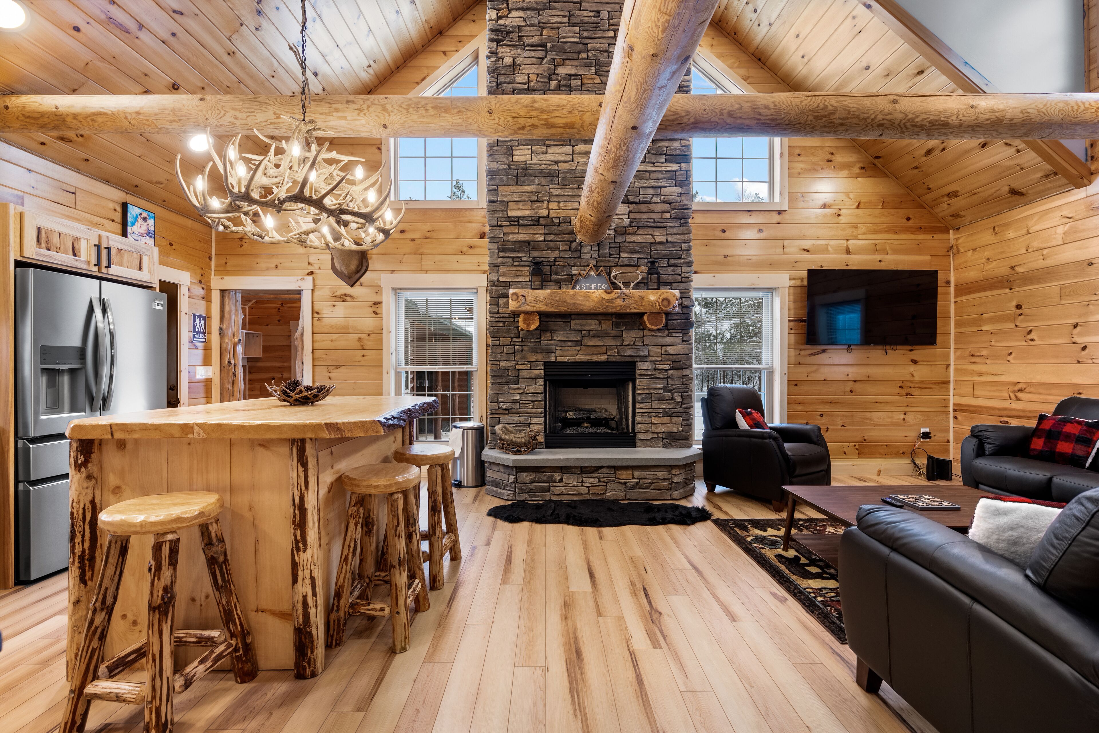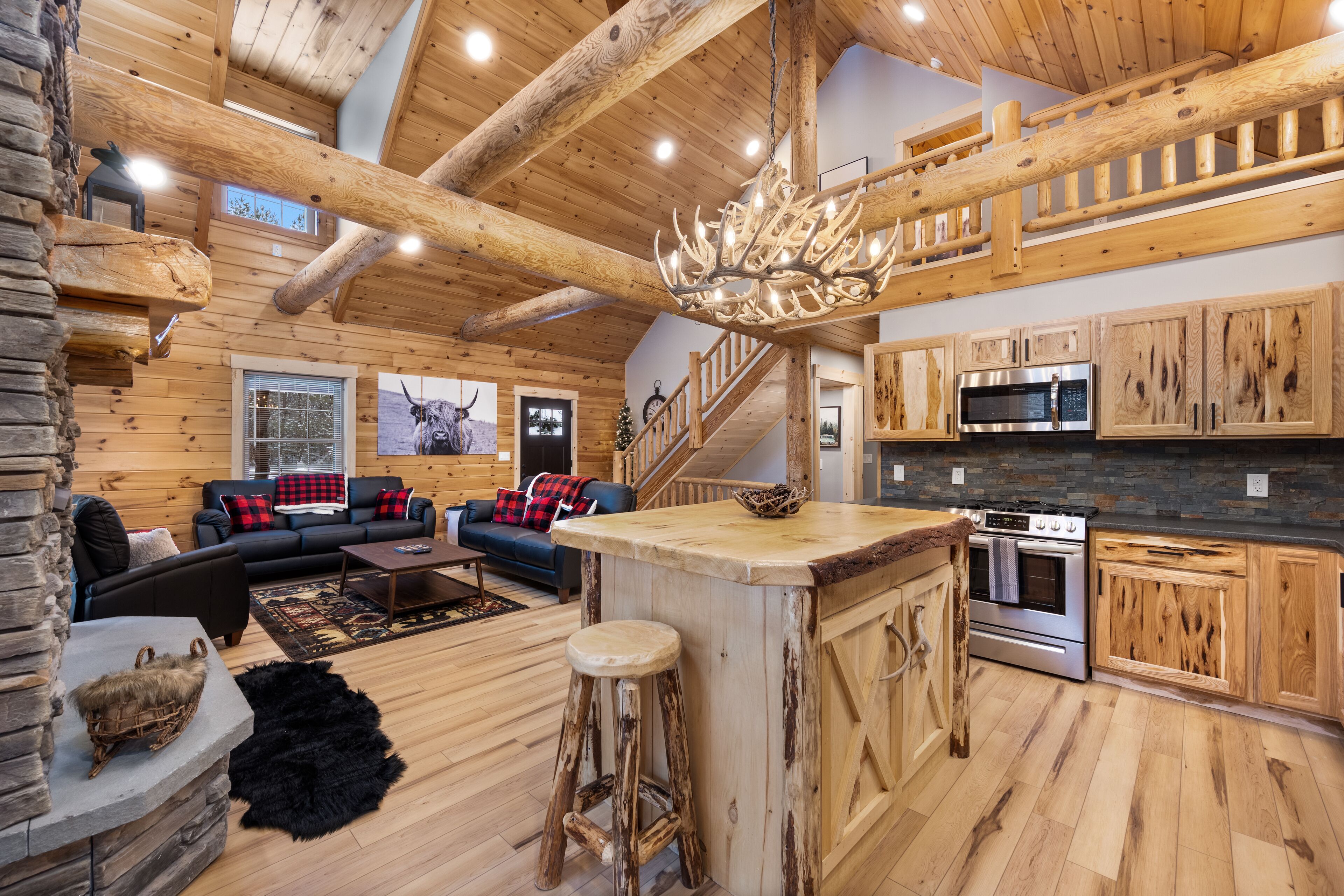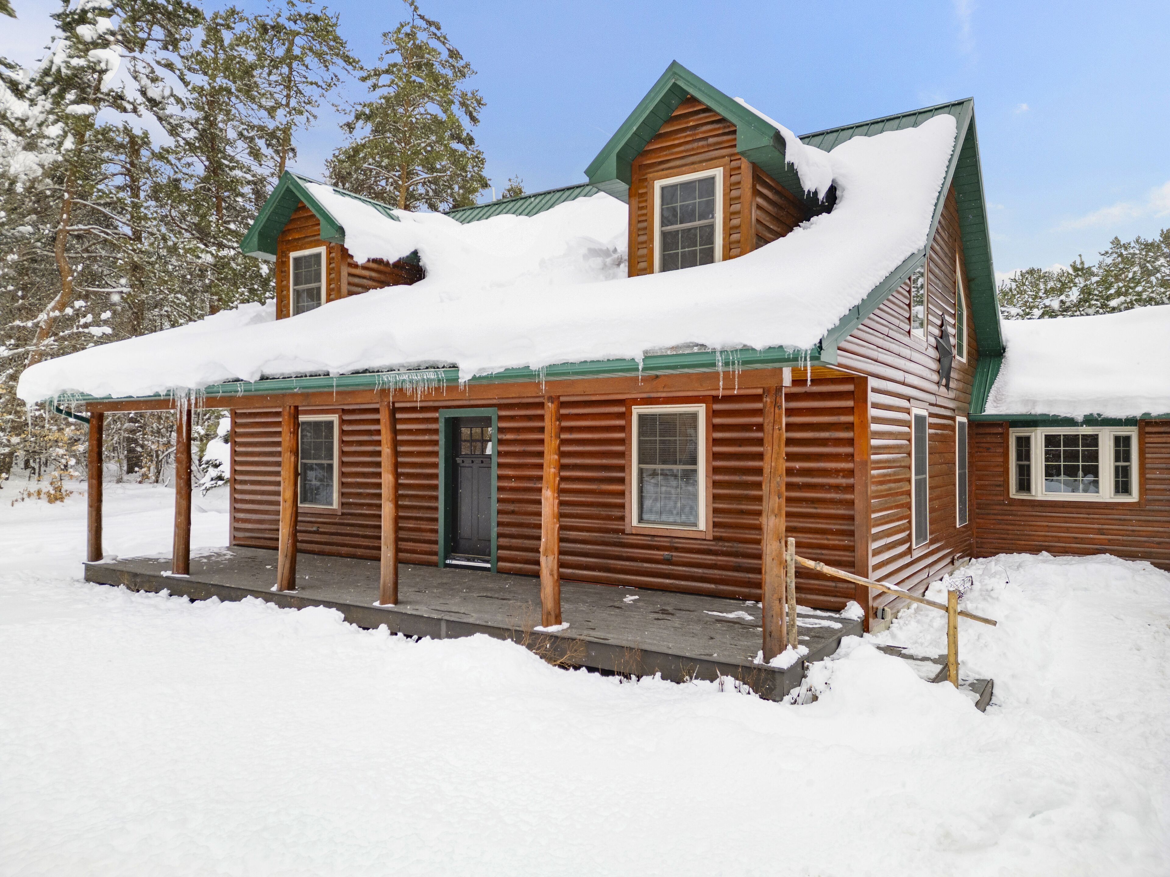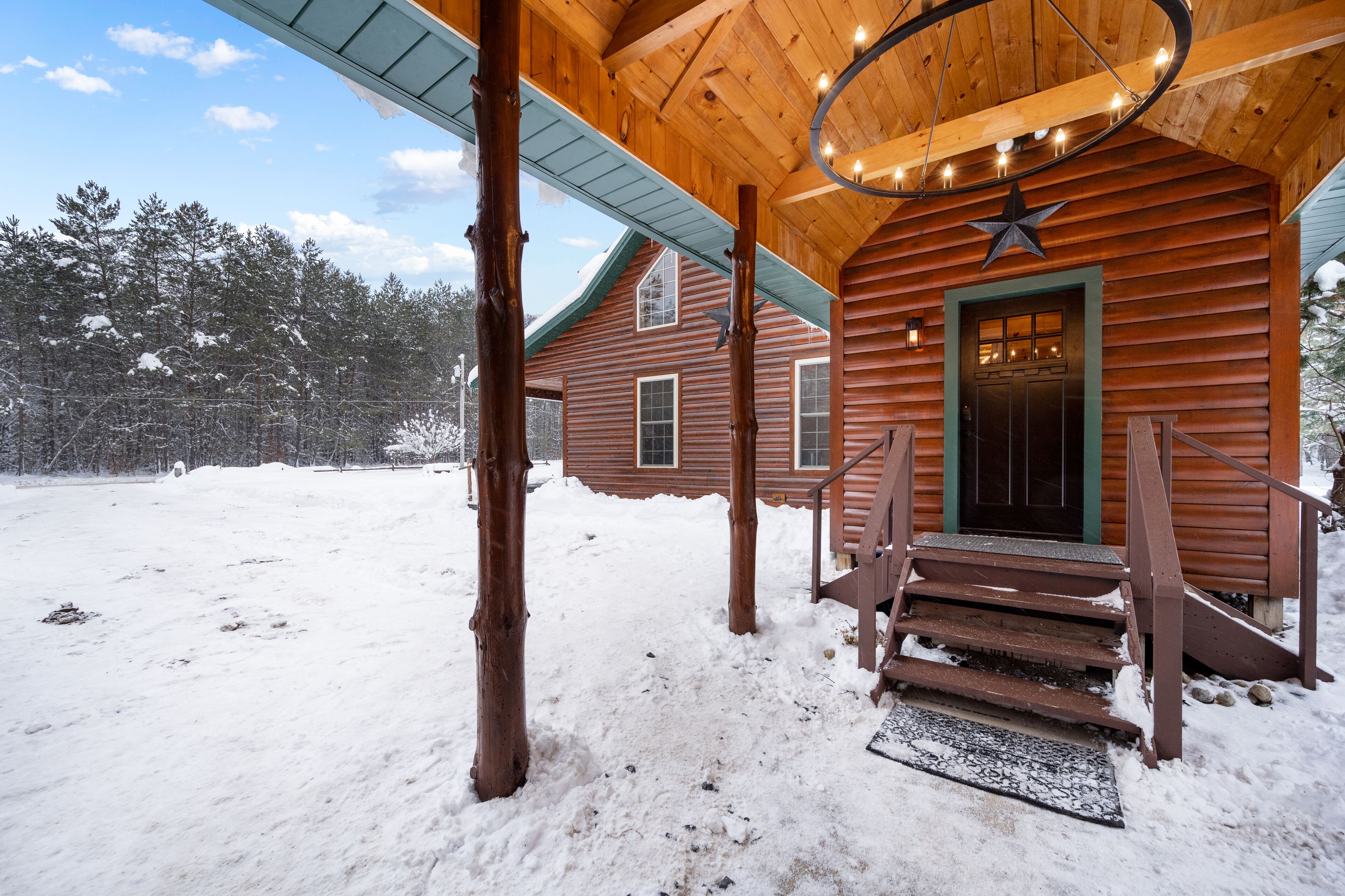 The Getaway in the Pines, On Snowmobile Trail Imagine an escape from the hustle & bustle where you're immersed in the tranquility of a secluded countryside cabin surrounded by serene evergreens. Newly renovated & all new amenities, this home+garage+loft apartment features 4BR (1King/3Queen), 3full baths, 4mattresses, sofabed and 2kitchens. Enjoy the outdoor Hot Tub! Snowmobile Trail directly behind Cabin! Only a few miles away to ATV trail access! Convenient location near town. Plentiful parking & 2 stall garage. The getaway you deserve! There are three options to book: The Cabin, The Loft, or the whole property (Cabin and Loft). Getaway in the Pines is the whole property.