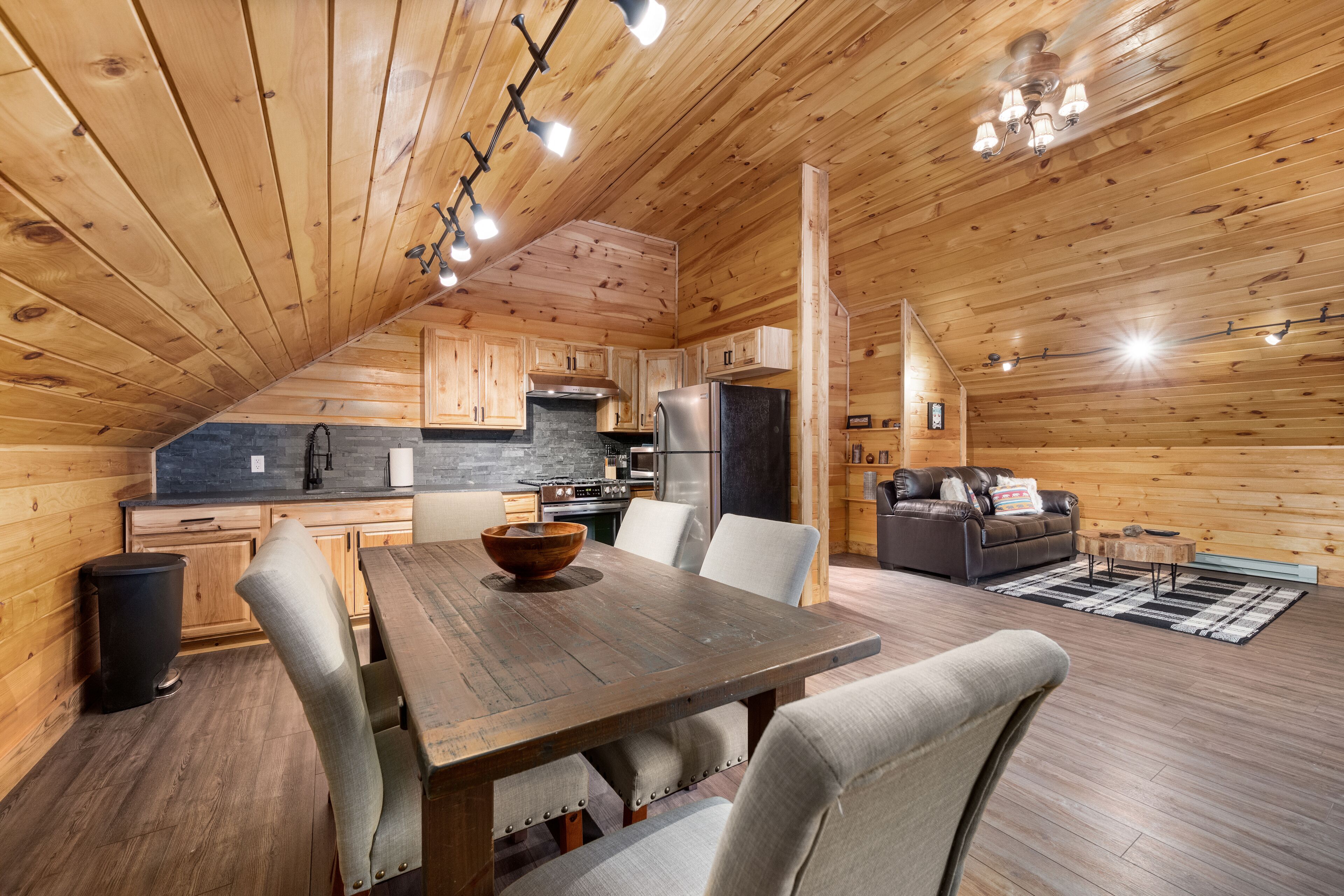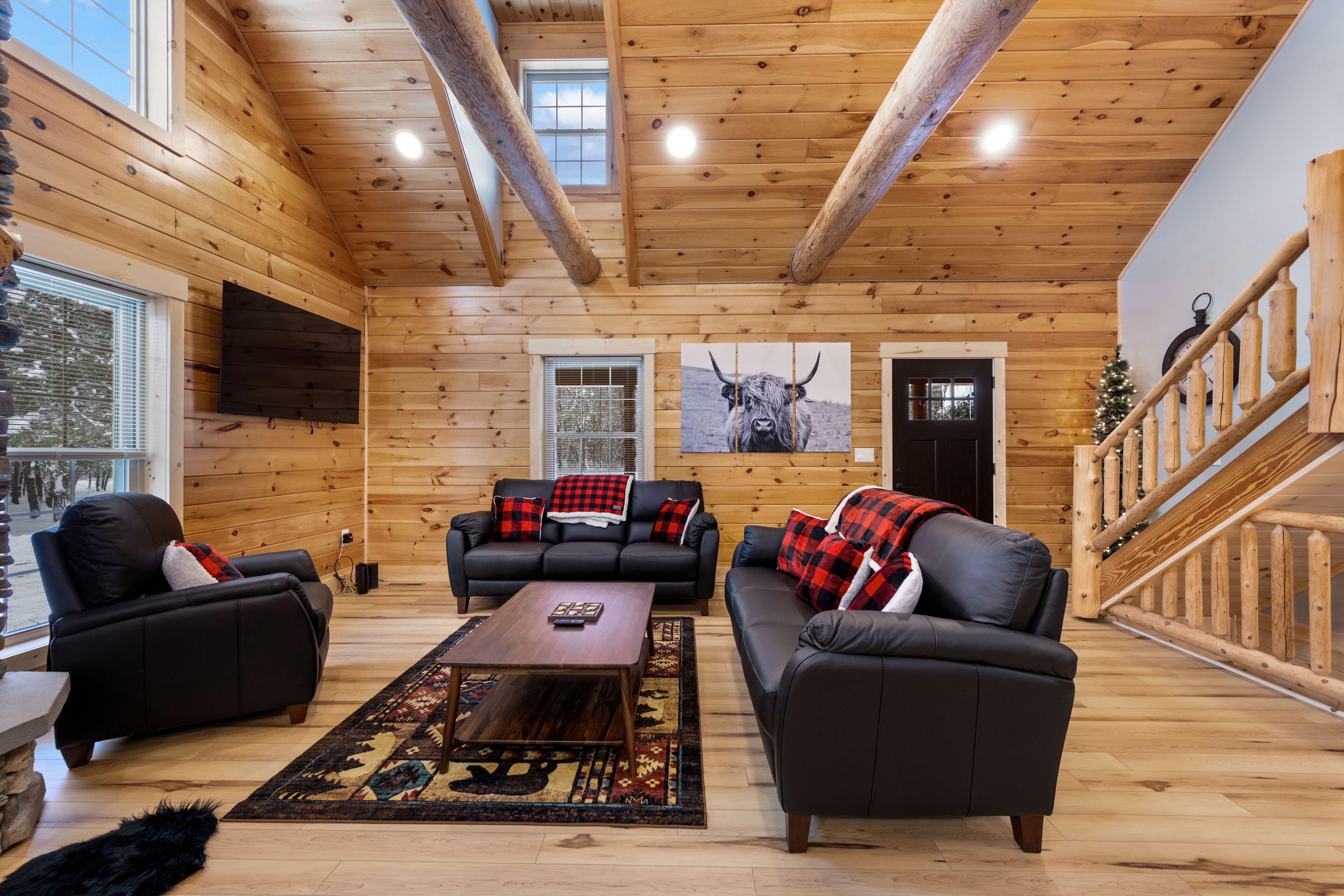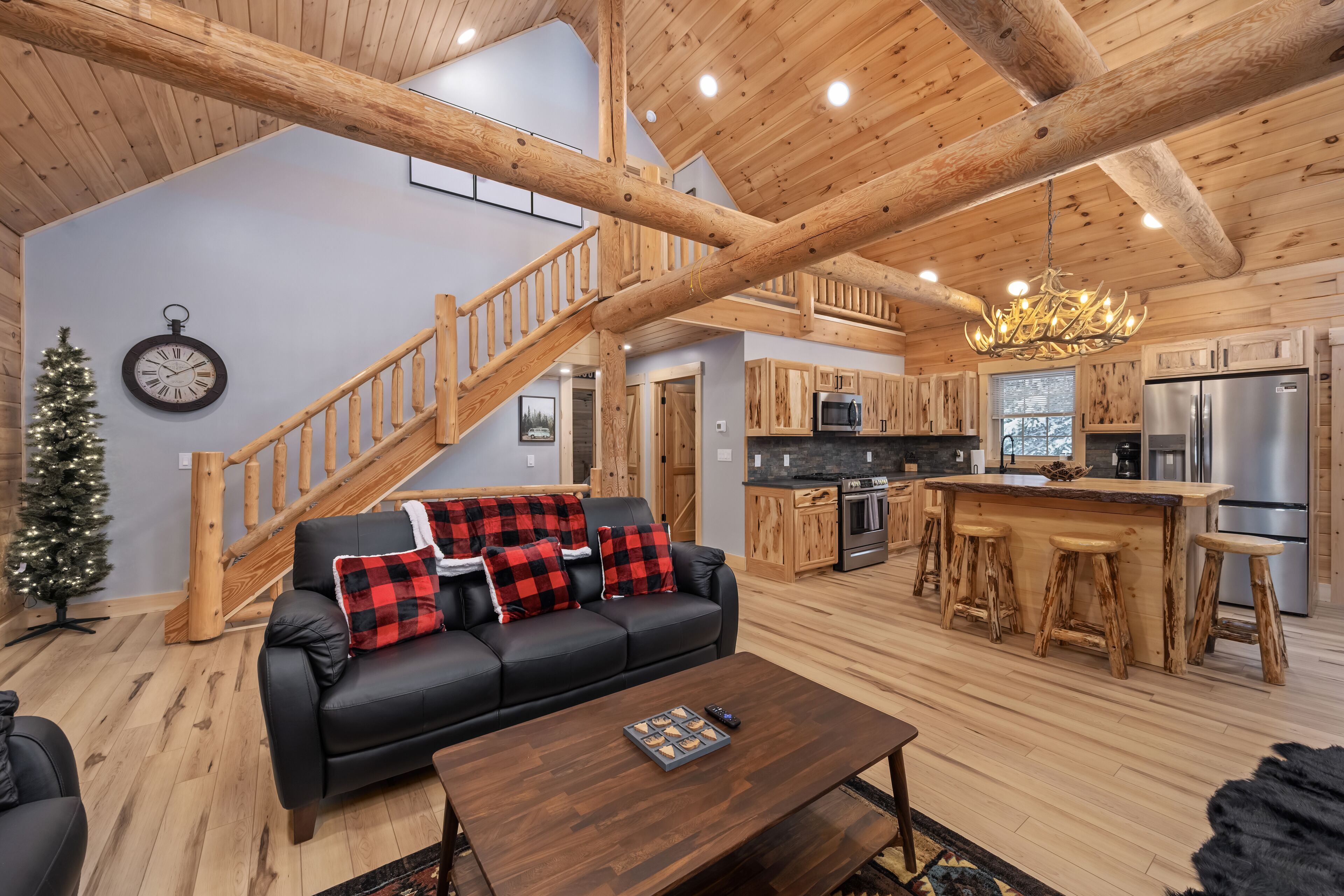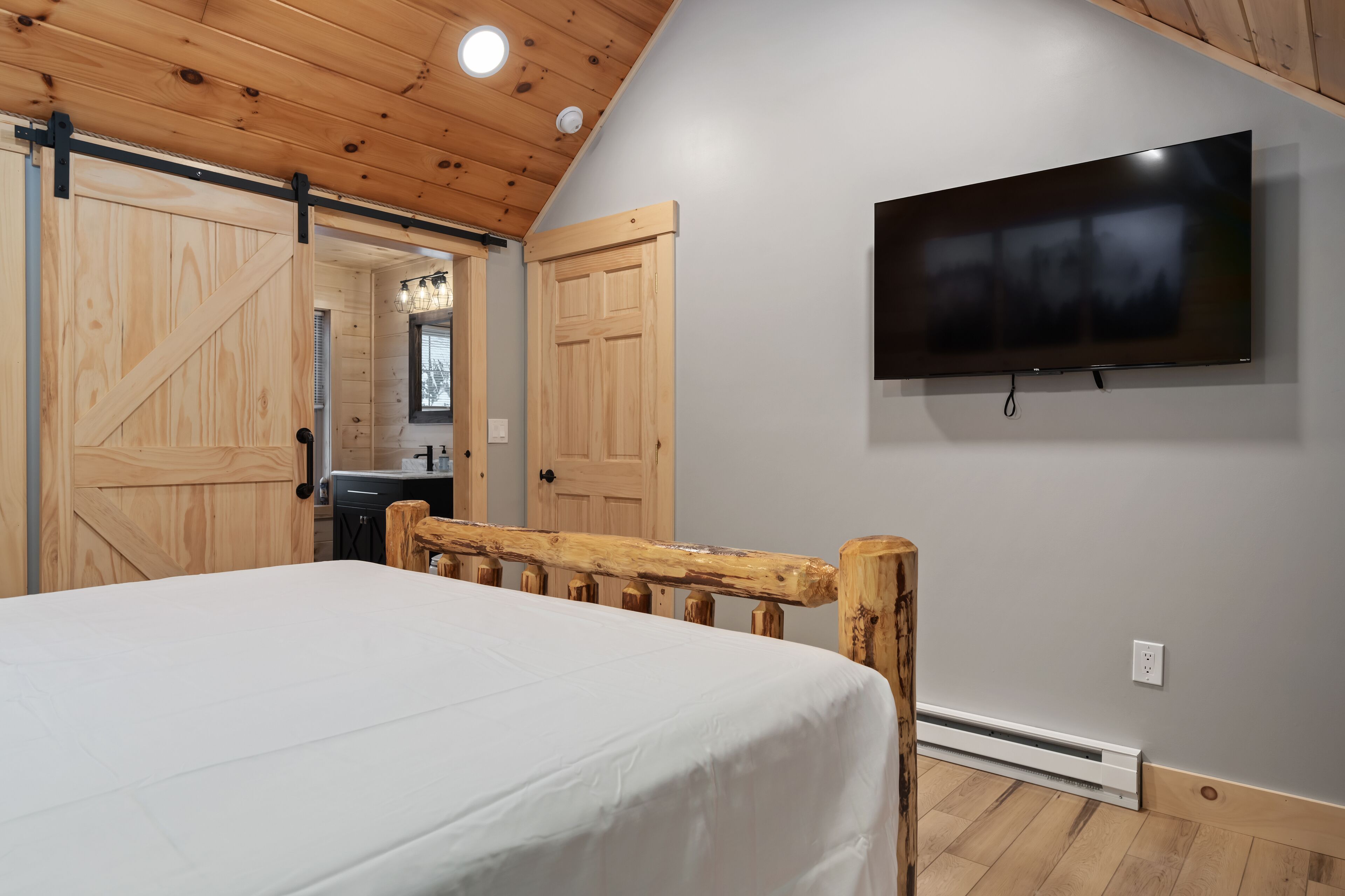 The Getaway in the Pines, On Snowmobile Trail Imagine an escape from the hustle & bustle where you're immersed in the tranquility of a secluded countryside cabin surrounded by serene evergreens. Newly renovated & all new amenities, this home+garage+loft apartment features 4BR (1King/3Queen), 3full baths, 4mattresses, sofabed and 2kitchens. Enjoy the outdoor Hot Tub! Snowmobile Trail directly behind Cabin! Only a few miles away to ATV trail access! Convenient location near town. Plentiful parking & 2 stall garage. The getaway you deserve! There are three options to book: The Cabin, The Loft, or the whole property (Cabin and Loft). Getaway in the Pines is the whole property.