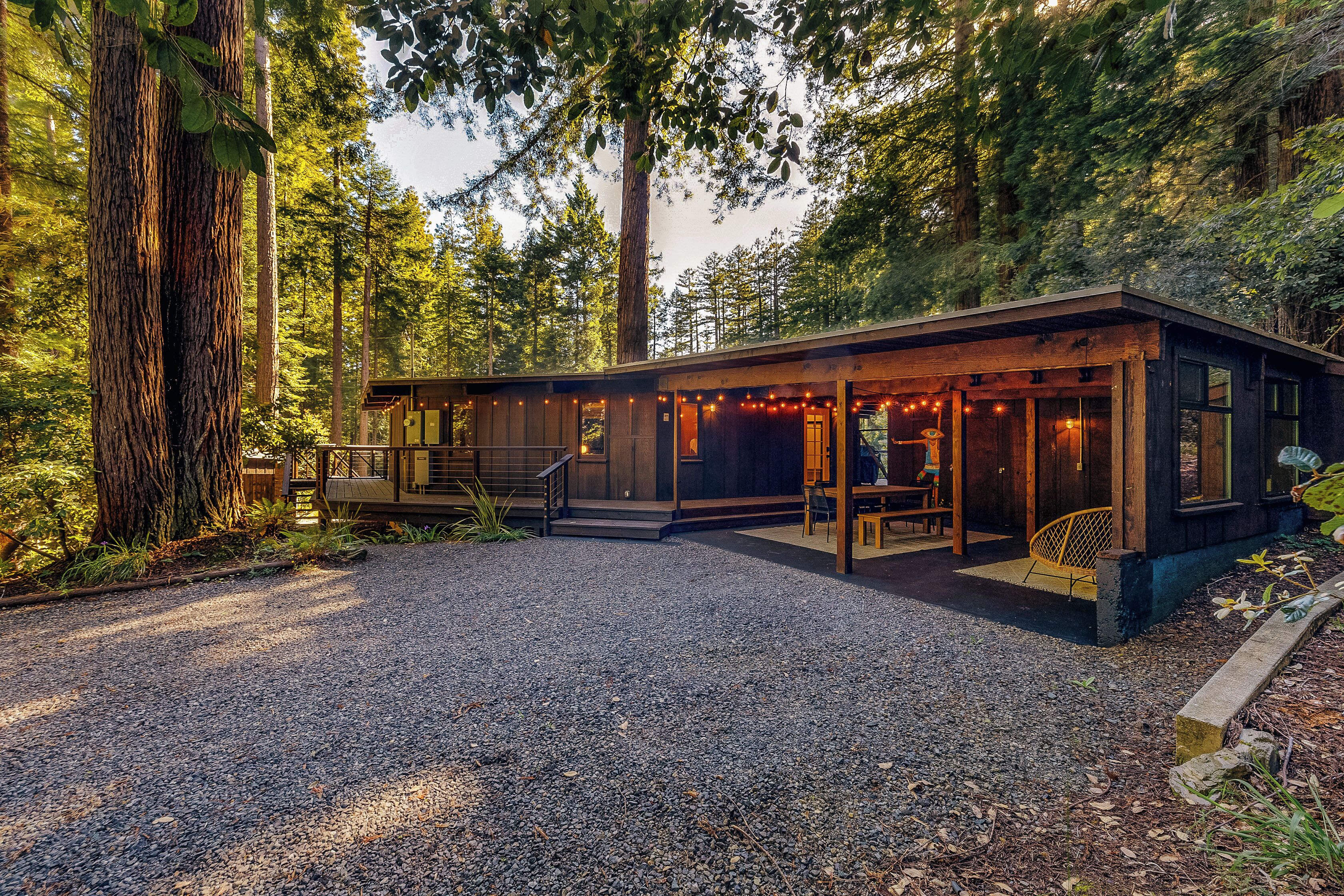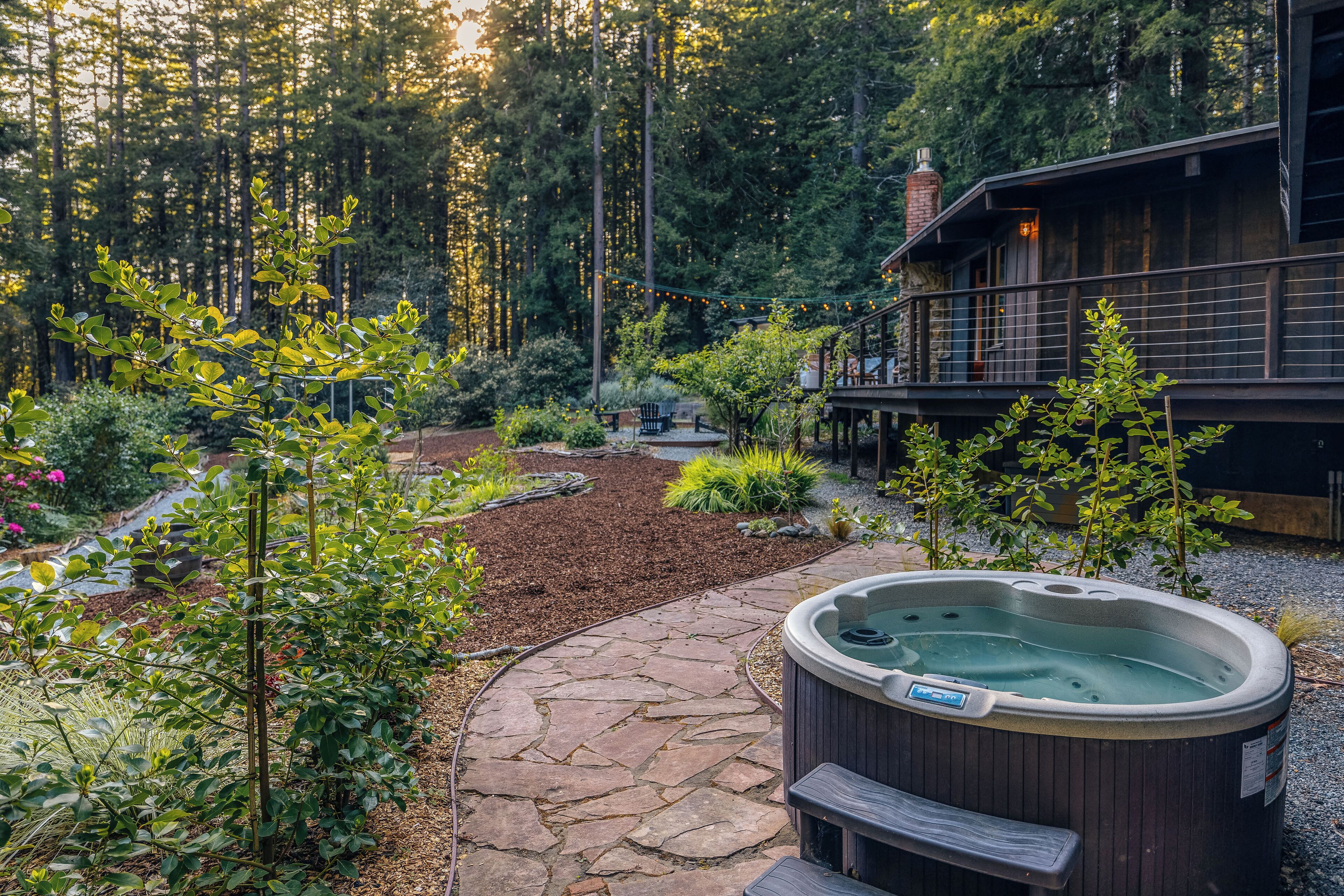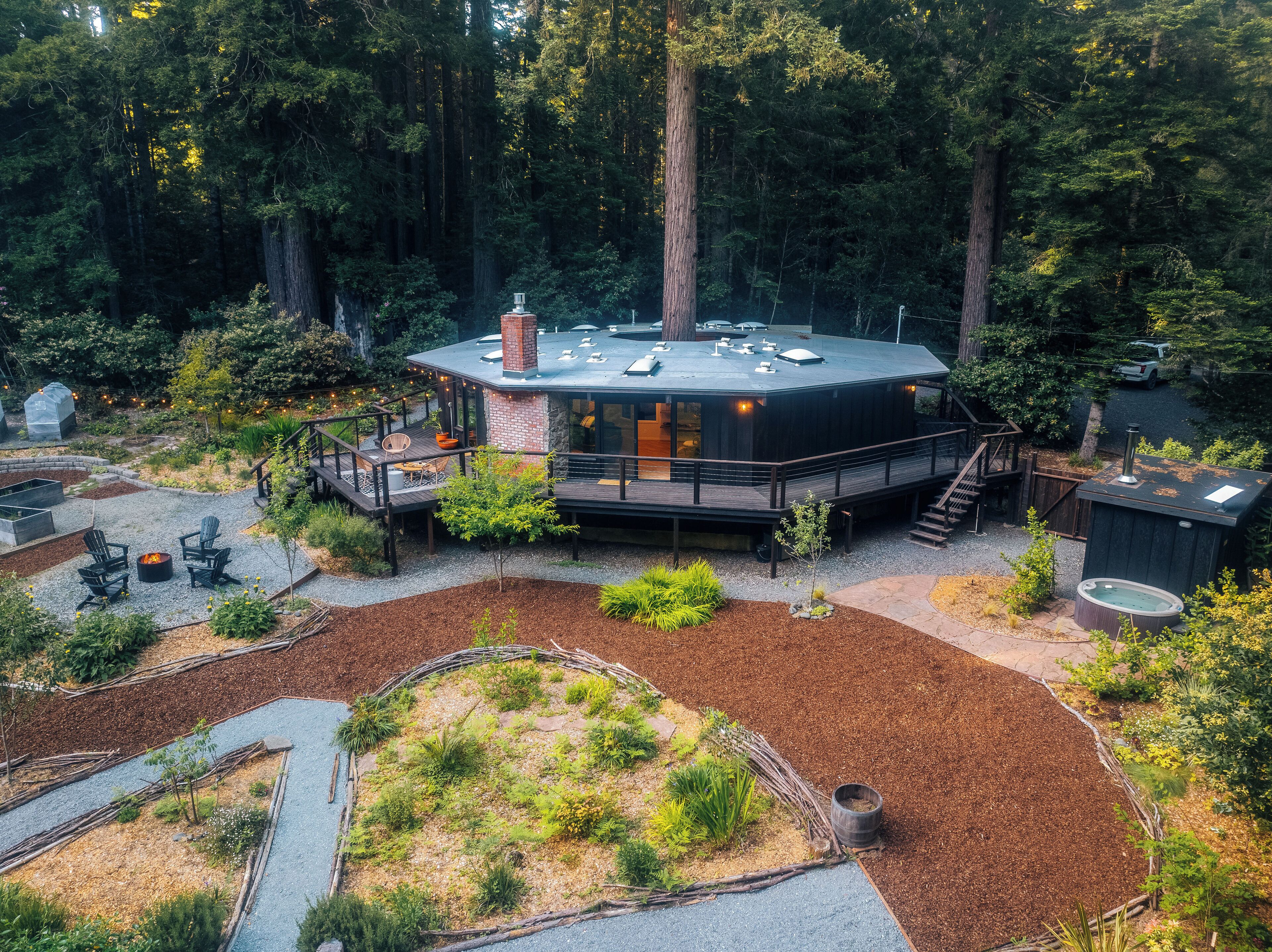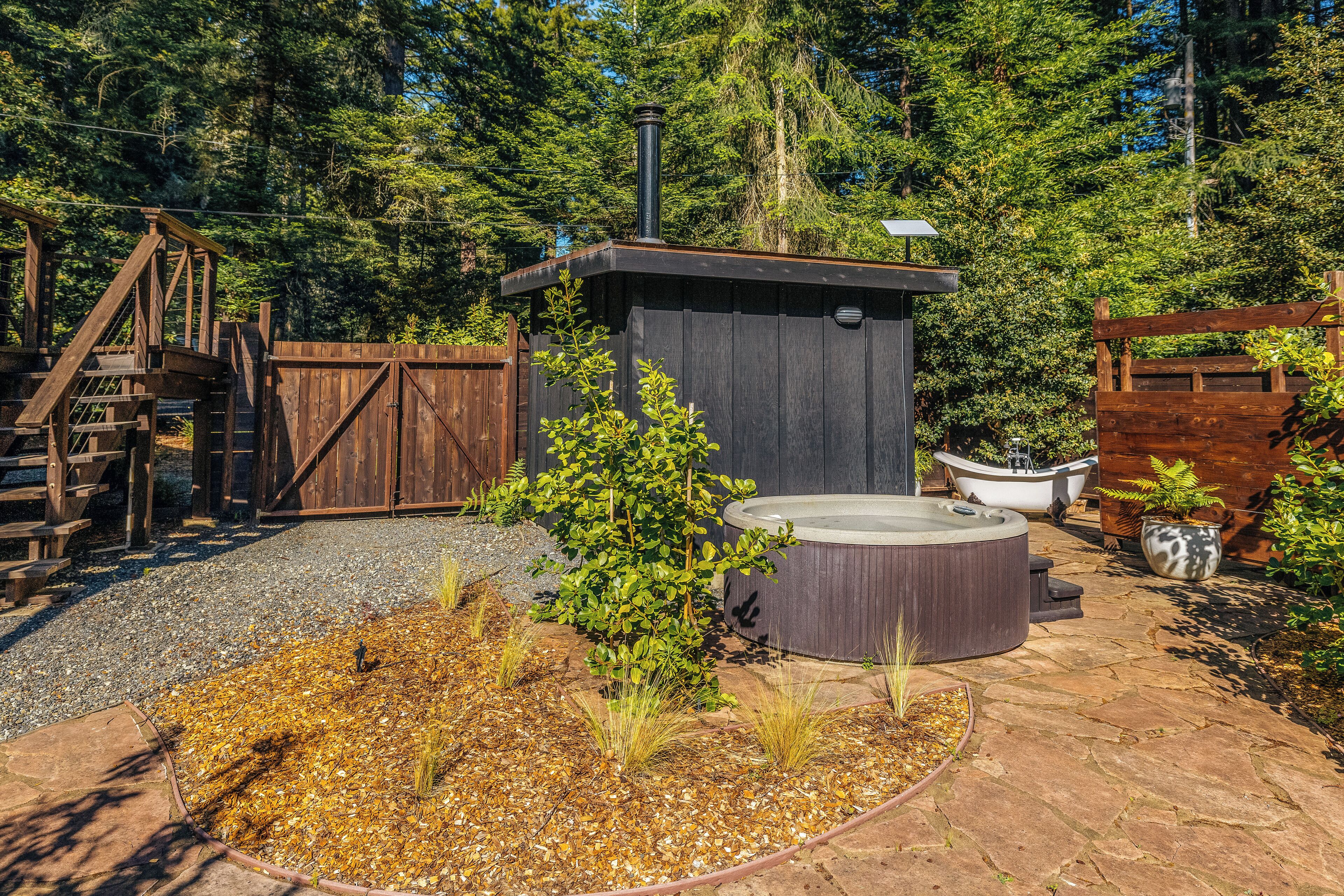 Private Mendocino Home with Luxury Outdoor Spa Escape to the privacy of the Mendocino Tree House, an octagon retreat built around a century year old redwood tree with a full luxury outdoor spa. The 2 bed/2 bath home blends modern style with natural splendor. Relax on the expansive wrap-around deck, or unwind by the fire pit amidst the redwoods. Indulge under the stars in the outdoor spa oasis, boasting a hot tub, wood-fired sauna, clawfoot tub, and shower. Immerse yourself in comfort, where every detail invites you to embrace peace and serenity.We have curated this home to be a retreat, a spa vacation, but also "a home away from home." In that way it's meant to be beautiful, enchanting and comfortable all at the same time. From the fully stocked kitchen, to the comfortable living room with breathtaking view of the backyard redwood forest, to the meticulously cared for bedrooms with quality mattresses, linens and pillows, to the one of kind outdoor spa, we're confident the Mendocino Tree House will check all your boxes and hopefully we'll add you to our family of guests for years to come. The 2 bed/2 bath house comfortably accommodates a couple, a group of friends or a family of 4-6 traveling together. For those larger groups, there are auto inflating/deflating air mattresses with sheet sets in each of the bedroom closets. Perfect for friend groups and families with children/teens. The house is styled to be inspiring yet cozy and approachable. The kitchen can be used as simply as storing leftovers to cooking a full meal with a full setting of dinnerware, silverware and glassware. There's one of kind art situated throughout the house from the owner's personal collection and a workspace in the master bedroom for those that need to "catch up" while away. The indoor fireplace is very straight forward - there's an easy on/off switch right on the front panel.Where we know you're going to spend A LOT of your time though is outside. While we've meticulously designed the inside of the house, as much if not more attention, was placed on the outside. From the backyard egg chair porch swings at the end of the meandering walkways by the fruit trees, to the lounging and catching up on the day's events or reminiscing of old times by the fire pit, to sweating/washing away life's stress in the outdoor spa, you will surely leave the Mendocino Tree House feeling revived and renewed.We want you to feel at home, while you're away from home, but to respect our home and our neighbors we do have a few simple asks below.PET POLICY:At Mendocino Tree House, we understand that pets are family, which is why we gladly welcome your furry companions to join you on your adventure. Well-behaved, house-trained dogs (maximum of two) are permitted for an additional fee of $100/stay. You MUST request to bring your dog when booking.In our efforts to maintain a pristine and comfortable environment for all guests, we also enforce a strict rule of no pets on furniture or beds. This simple courtesy ensures that everyone can enjoy the elevated experience we strive to provide over time. If our cleaning staff finds hair on the furniture or in the bed linens, you will be charged an additional $250 cleaning fee. Additionally, for the safety and well-being of your pet and our property, we request that pets are not left unattended at the house.We do require that you clean up your pet's waste as well - again, it's simple courtesy. A black aluminum waste bin is located under the deck right across from the sauna - please ensure the waste is bagged. If our staff has to clean up after your pet, you will be charged an additional $100 cleaning fee.Thank you for understanding, and we look forward to hosting both you and your furry friend at Mendocino Tree House! 🌲🐶NO PARTY POLICY:While we love to gather, and welcome you to do so with your fellow travelers that you've submitted as your group, there are no parties allowed otherwise. We do strictly monitor noise. NO SMOKING POLICY:We all have different habits when it comes to how we honor our bodies, but simply put, there is ABSOLUTELY NO SMOKING/VAPING in our house. Failure to comply with this rule will result in an additional $1000 cleaning fee and additional fees for any damage caused. We also enforce a no smoking policy outside as well as a rogue cigarette butt could bring an end to our precious neighborhood and forest. If you must vape, you can do so outside ONLY.WILDLIFE/TRASH: Mendocino has a thriving wildlife population and so with that said, do not leave food outside or in your vehicle. If you need to remove trash from the house, you will find the large garbage and recycling bins in the carport behind the double doors furthest from the front door. Ensure all waste items are in a tied bag - no loose garbage. These doors are kept locked, to keep wildlife out - the code is 987. Please make sure the latch pin and lock are both re-engaged if you do access.VANDALISM POLICY: ABSOLUTELY NO carving or marking of any trees, poles or any other structures on the property. If our staff finds any vandalism you will be charged a $1000 fine. A 5 Star review is a perfect way to "leave your mark!"SEPTIC SYSTEM:The home operates on a septic system which is robust, but to keep it that way, please refrain from flushing anything down the toilet other than toilet paper. INSURANCE & WARRANTY:Now for the legal jargon...Occupants personal property, including vehicles, are not insured by Owner against loss or damage due to fire, theft, vandalism, rain, water, criminal or negligent acts of others, or any other cause. Owner does not insure against personal injury to Occupants due to any reason other than the condition of the Premises. Owner recommends that Occupants carry or obtain insurance to protect Occupants and personal property from any loss or damage. Occupants agree to indemnify, defend and hold harmless Owner and Owners Representatives from all claims, disputes, litigation, judgements, cost and attorney