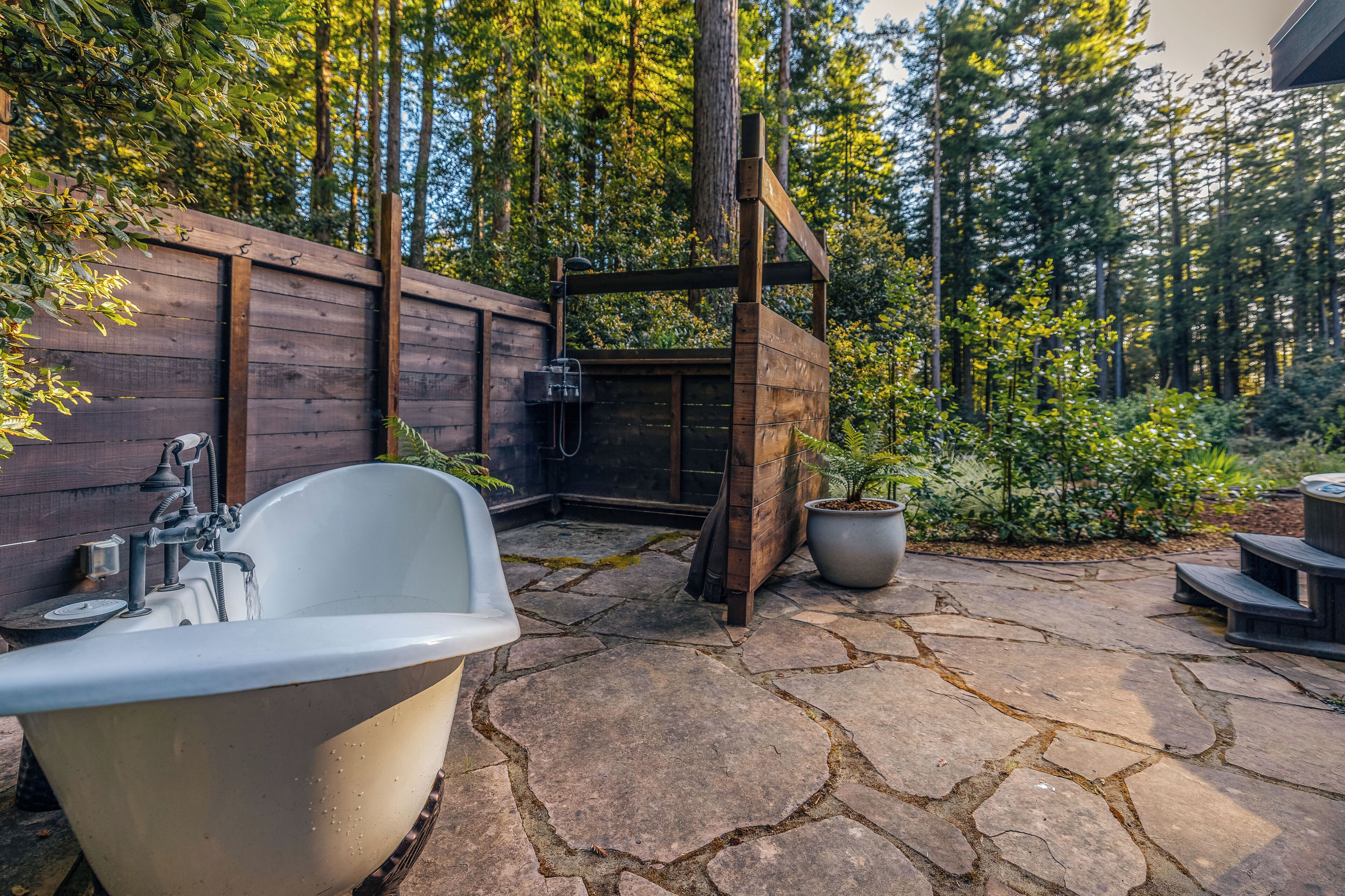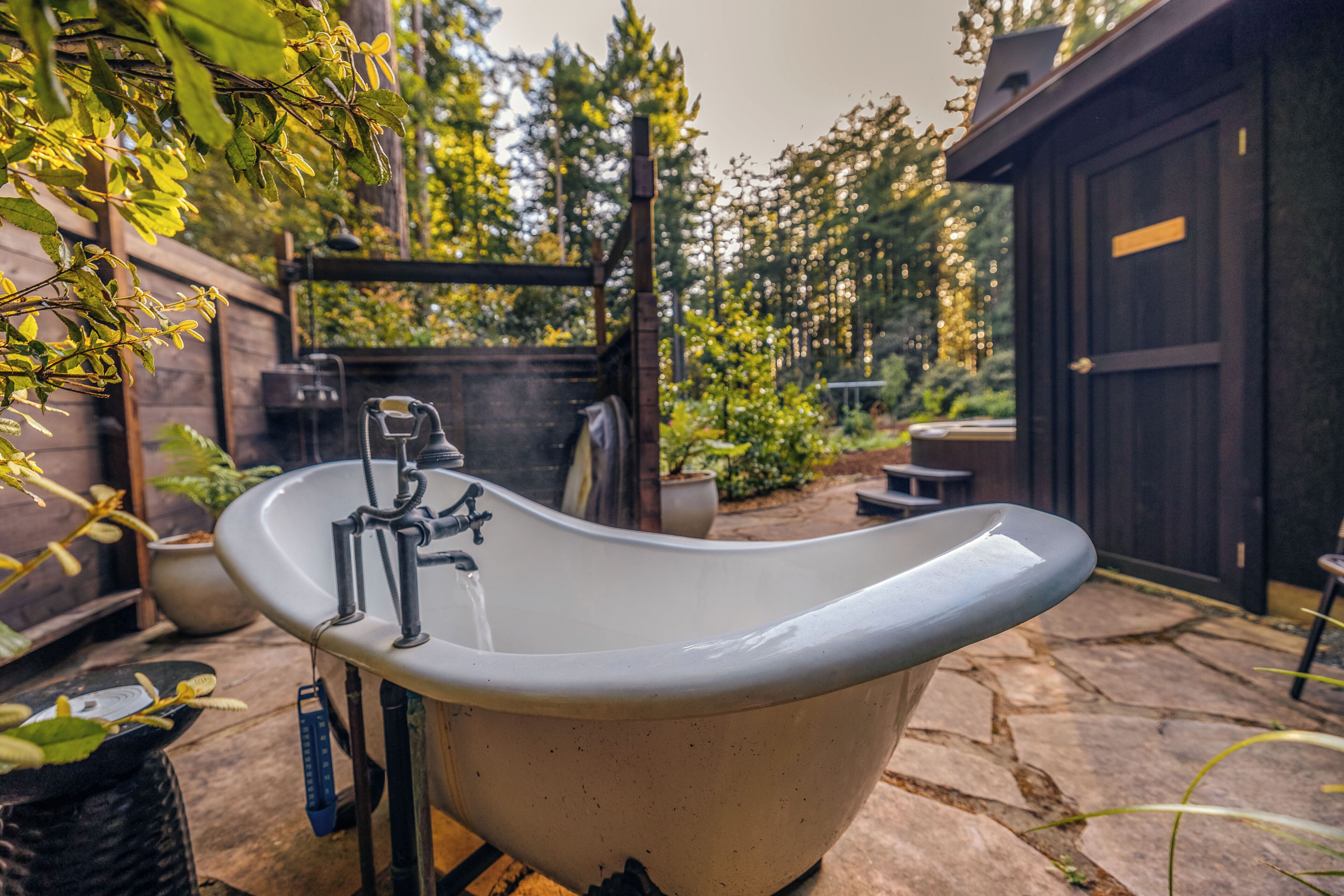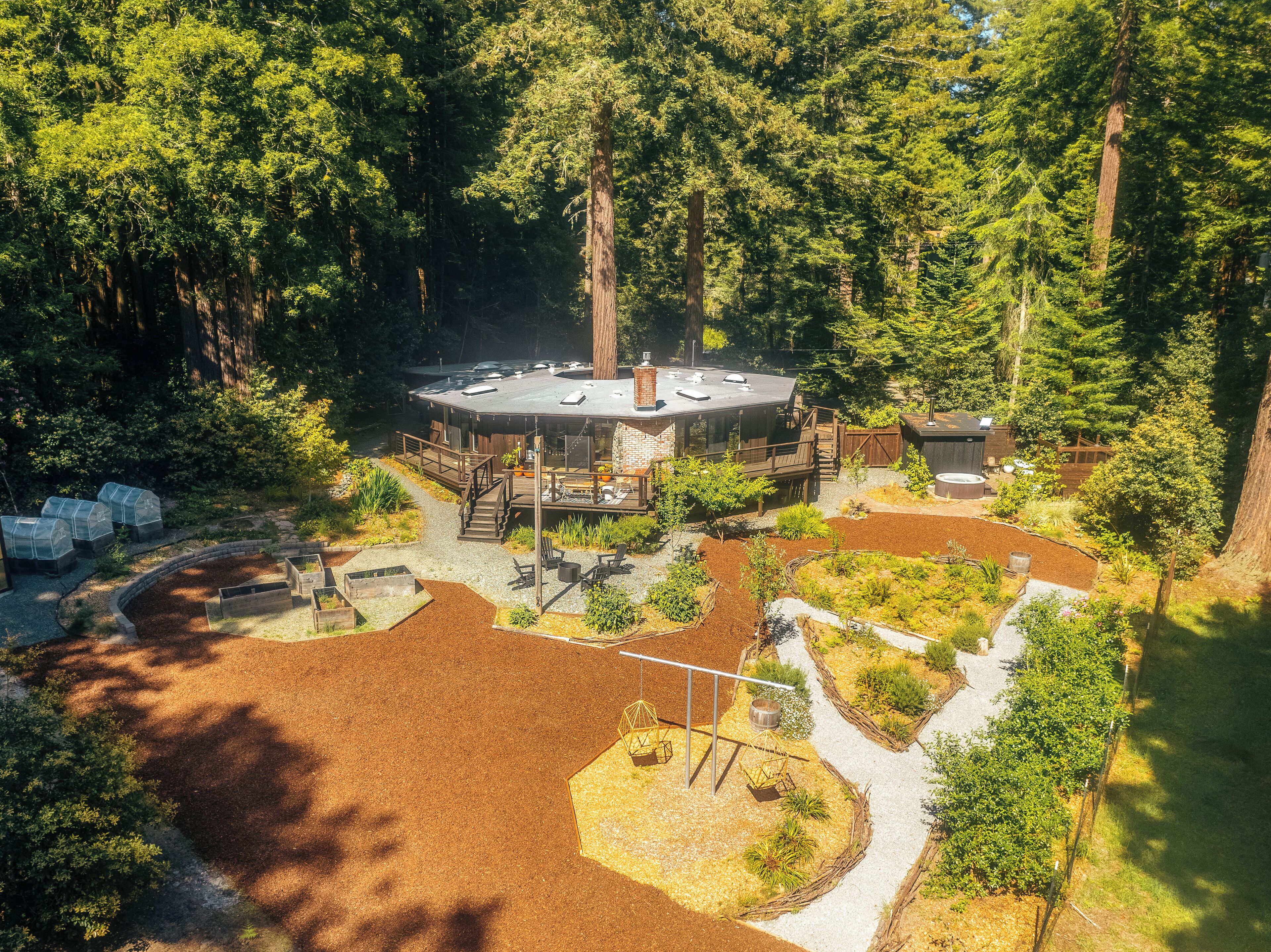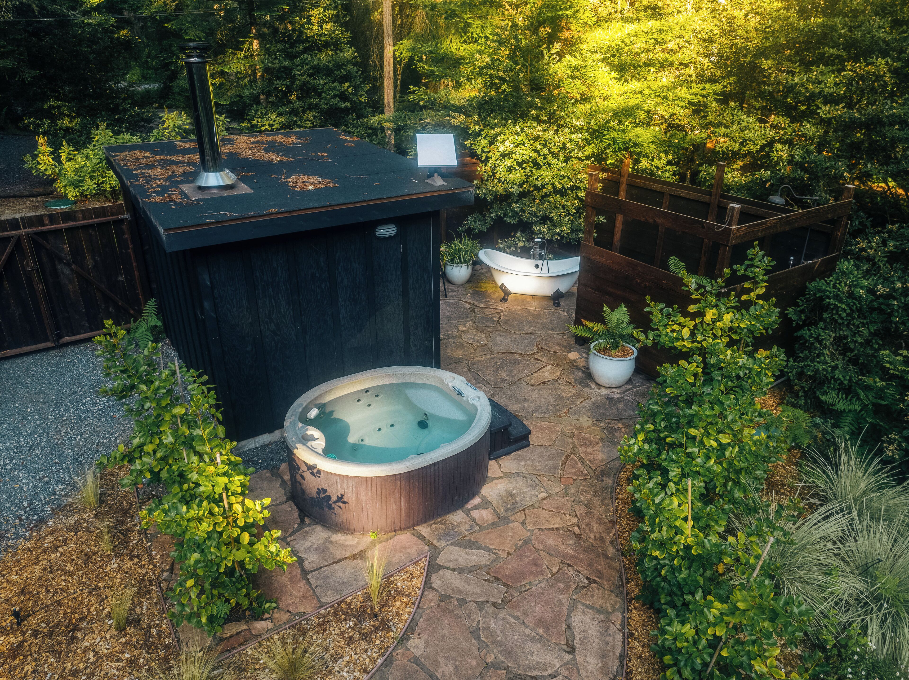 Private Mendocino Home with Luxury Outdoor Spa Escape to the privacy of the Mendocino Tree House, an octagon retreat built around a century year old redwood tree with a full luxury outdoor spa. The 2 bed/2 bath home blends modern style with natural splendor. Relax on the expansive wrap-around deck, or unwind by the fire pit amidst the redwoods. Indulge under the stars in the outdoor spa oasis, boasting a hot tub, wood-fired sauna, clawfoot tub, and shower. Immerse yourself in comfort, where every detail invites you to embrace peace and serenity.We have curated this home to be a retreat, a spa vacation, but also "a home away from home." In that way it's meant to be beautiful, enchanting and comfortable all at the same time. From the fully stocked kitchen, to the comfortable living room with breathtaking view of the backyard redwood forest, to the meticulously cared for bedrooms with quality mattresses, linens and pillows, to the one of kind outdoor spa, we're confident the Mendocino Tree House will check all your boxes and hopefully we'll add you to our family of guests for years to come. The 2 bed/2 bath house comfortably accommodates a couple, a group of friends or a family of 4-6 traveling together. For those larger groups, there are auto inflating/deflating air mattresses with sheet sets in each of the bedroom closets. Perfect for friend groups and families with children/teens. The house is styled to be inspiring yet cozy and approachable. The kitchen can be used as simply as storing leftovers to cooking a full meal with a full setting of dinnerware, silverware and glassware. There's one of kind art situated throughout the house from the owner's personal collection and a workspace in the master bedroom for those that need to "catch up" while away. The indoor fireplace is very straight forward - there's an easy on/off switch right on the front panel.Where we know you're going to spend A LOT of your time though is outside. While we've meticulously designed the inside of the house, as much if not more attention, was placed on the outside. From the backyard egg chair porch swings at the end of the meandering walkways by the fruit trees, to the lounging and catching up on the day's events or reminiscing of old times by the fire pit, to sweating/washing away life's stress in the outdoor spa, you will surely leave the Mendocino Tree House feeling revived and renewed.We want you to feel at home, while you're away from home, but to respect our home and our neighbors we do have a few simple asks below.PET POLICY:At Mendocino Tree House, we understand that pets are family, which is why we gladly welcome your furry companions to join you on your adventure. Well-behaved, house-trained dogs (maximum of two) are permitted for an additional fee of $100/stay. You MUST request to bring your dog when booking.In our efforts to maintain a pristine and comfortable environment for all guests, we also enforce a strict rule of no pets on furniture or beds. This simple courtesy ensures that everyone can enjoy the elevated experience we strive to provide over time. If our cleaning staff finds hair on the furniture or in the bed linens, you will be charged an additional $250 cleaning fee. Additionally, for the safety and well-being of your pet and our property, we request that pets are not left unattended at the house.We do require that you clean up your pet's waste as well - again, it's simple courtesy. A black aluminum waste bin is located under the deck right across from the sauna - please ensure the waste is bagged. If our staff has to clean up after your pet, you will be charged an additional $100 cleaning fee.Thank you for understanding, and we look forward to hosting both you and your furry friend at Mendocino Tree House! 🌲🐶NO PARTY POLICY:While we love to gather, and welcome you to do so with your fellow travelers that you've submitted as your group, there are no parties allowed otherwise. We do strictly monitor noise. NO SMOKING POLICY:We all have different habits when it comes to how we honor our bodies, but simply put, there is ABSOLUTELY NO SMOKING/VAPING in our house. Failure to comply with this rule will result in an additional $1000 cleaning fee and additional fees for any damage caused. We also enforce a no smoking policy outside as well as a rogue cigarette butt could bring an end to our precious neighborhood and forest. If you must vape, you can do so outside ONLY.WILDLIFE/TRASH: Mendocino has a thriving wildlife population and so with that said, do not leave food outside or in your vehicle. If you need to remove trash from the house, you will find the large garbage and recycling bins in the carport behind the double doors furthest from the front door. Ensure all waste items are in a tied bag - no loose garbage. These doors are kept locked, to keep wildlife out - the code is 987. Please make sure the latch pin and lock are both re-engaged if you do access.VANDALISM POLICY: ABSOLUTELY NO carving or marking of any trees, poles or any other structures on the property. If our staff finds any vandalism you will be charged a $1000 fine. A 5 Star review is a perfect way to "leave your mark!"SEPTIC SYSTEM:The home operates on a septic system which is robust, but to keep it that way, please refrain from flushing anything down the toilet other than toilet paper. INSURANCE & WARRANTY:Now for the legal jargon...Occupants personal property, including vehicles, are not insured by Owner against loss or damage due to fire, theft, vandalism, rain, water, criminal or negligent acts of others, or any other cause. Owner does not insure against personal injury to Occupants due to any reason other than the condition of the Premises. Owner recommends that Occupants carry or obtain insurance to protect Occupants and personal property from any loss or damage. Occupants agree to indemnify, defend and hold harmless Owner and Owners Representatives from all claims, disputes, litigation, judgements, cost and attorney