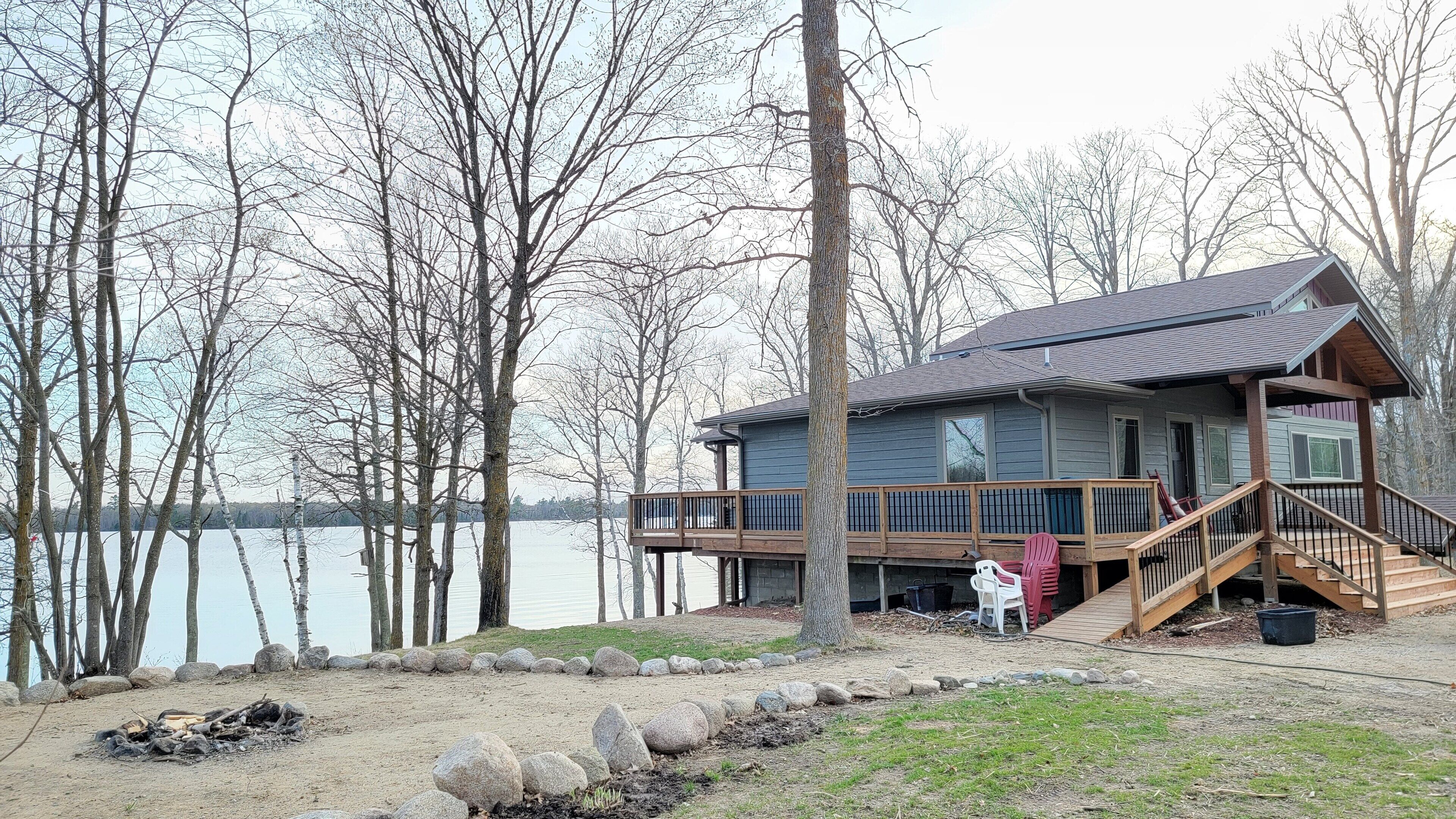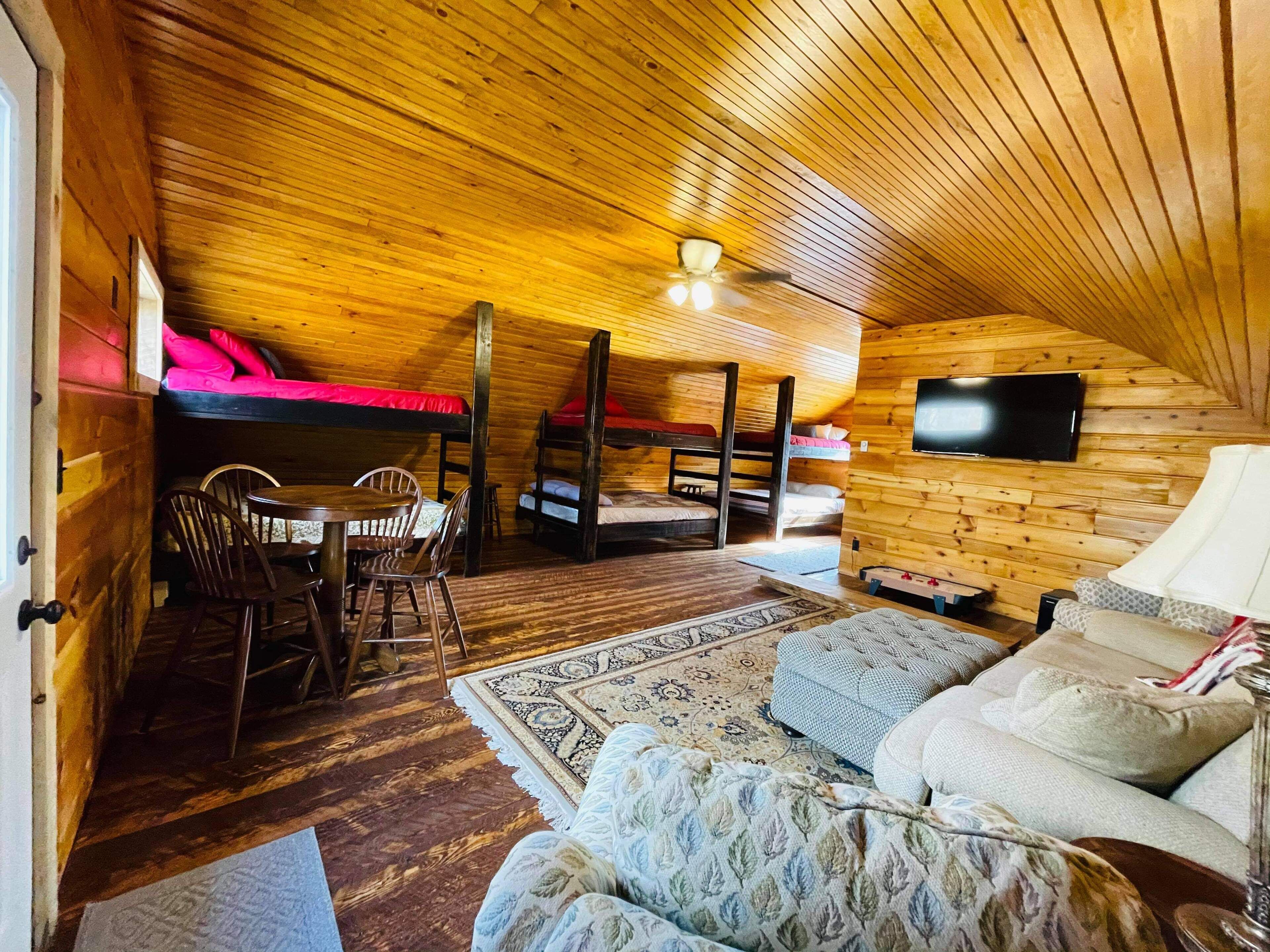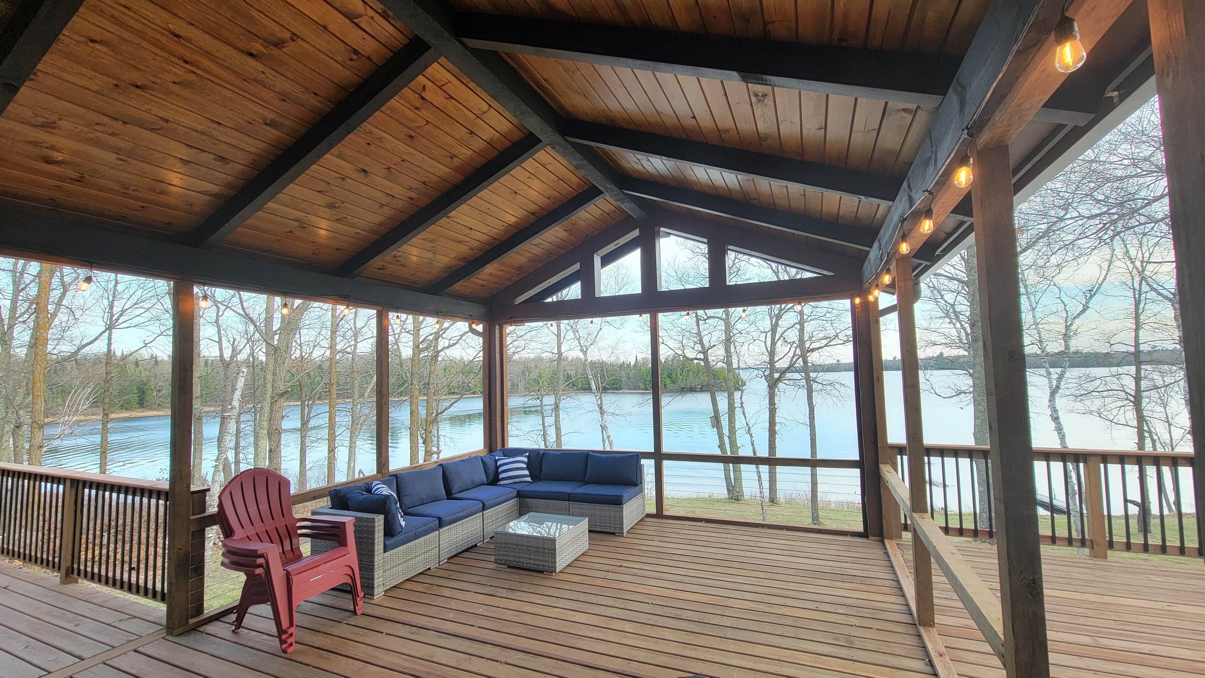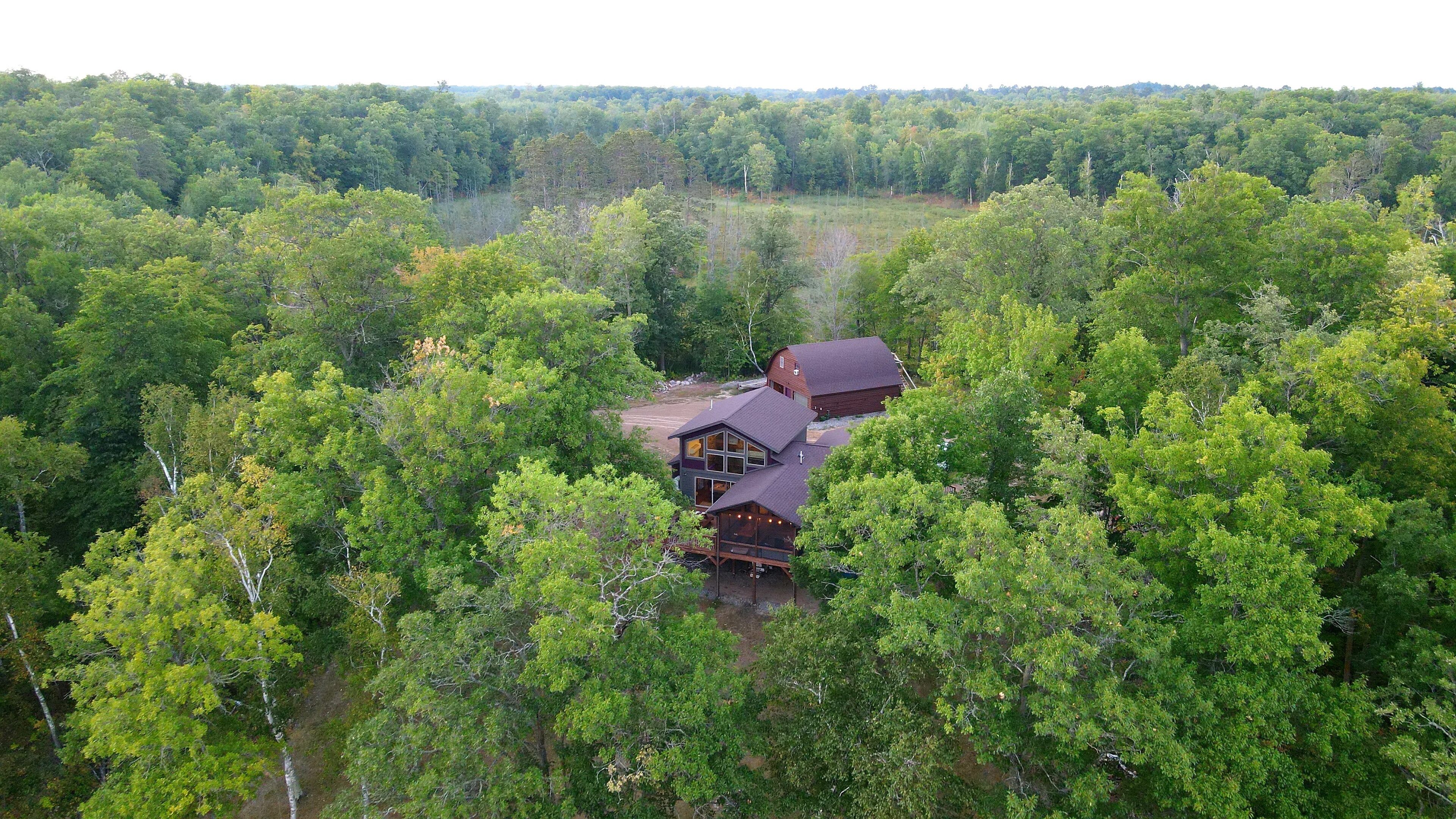 Private Newly Built Woman Lake Cabin with Detached Barn Style Bunk House Mark Twain once wrote that somethings are so difficult to explain, they must be experienced! Privacy and quiet rarely found on a major, pristine lake. Three sides of the property are either protected by a National Forest or the vast expansive lake shore of Women Lake. The other side is a buffer woods to the only other cabin close. Hear the quiet? My brother and I spent two years lovingly remodeling this generational property, adding modern conveniences while still preserving. Beamed screened porch and entry ceilings, expansive deck, two story great room with skip sawn pine with beam ceiling, reading loft with beautiful lake views, two story stone gas fireplace, and converted the curved Amish built barn into an upper deck bunkhouse with full bath including walk in shower. There are three rooms in the main cabin (2 queens and 1 king) with a queen pull out couch. The bunk room has three twin over queen bunks, smart TV’s, wifi. The pictures tell the rest... would sleep 17. We plan to share our treasure a few times each year. Read the reviews as they come as we so welcome them from those who appreciate this beauty! Dan and John