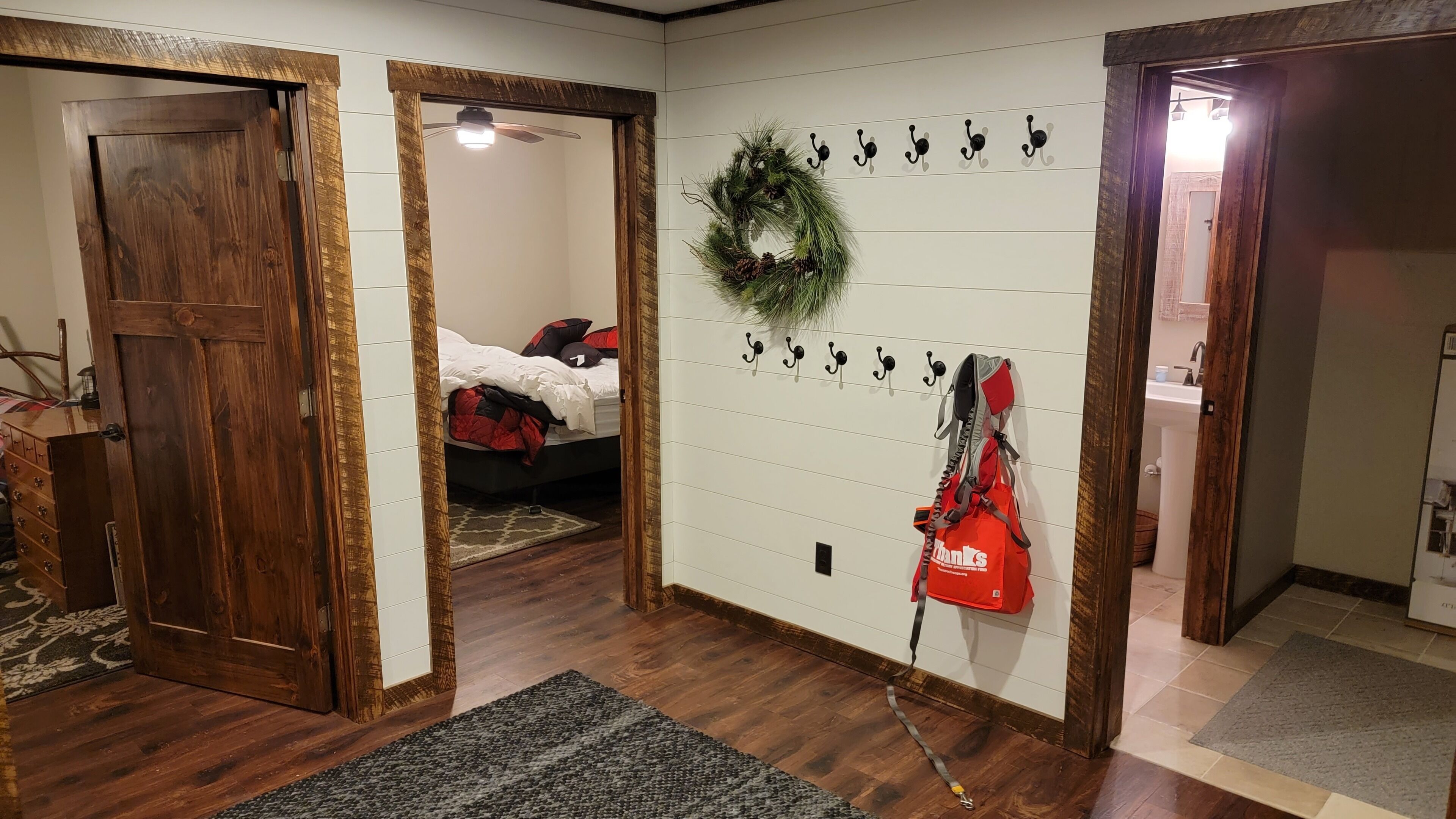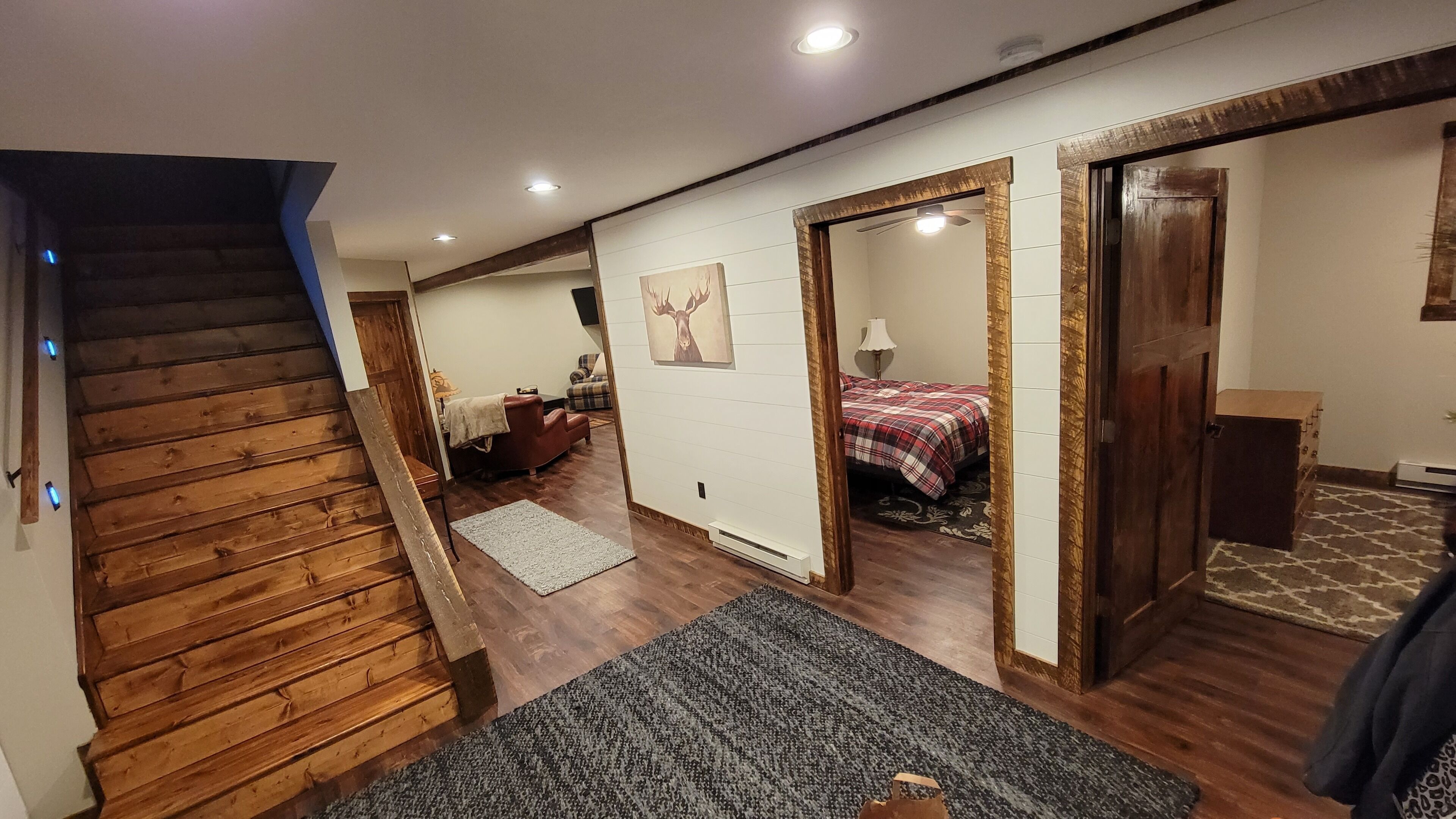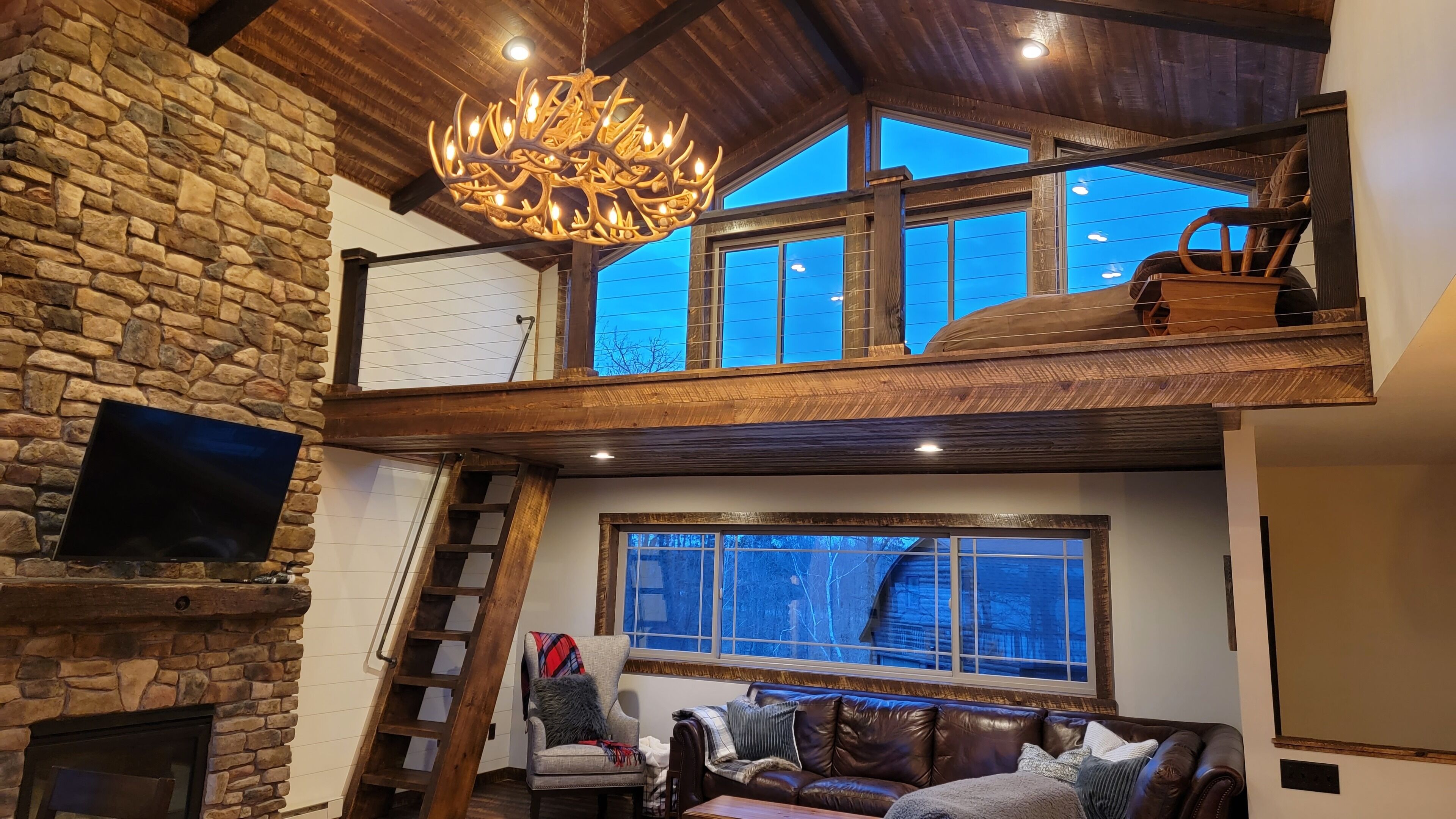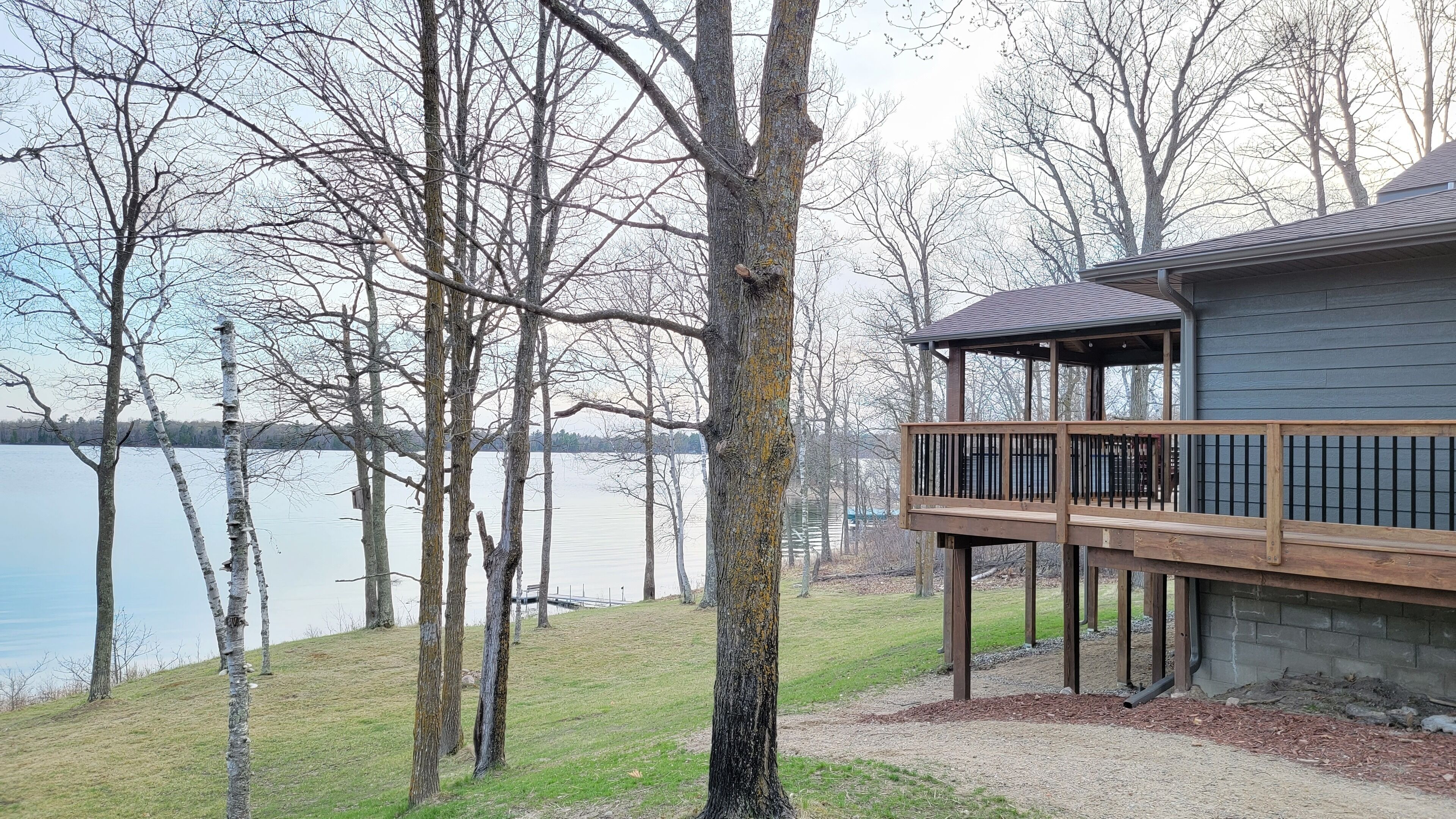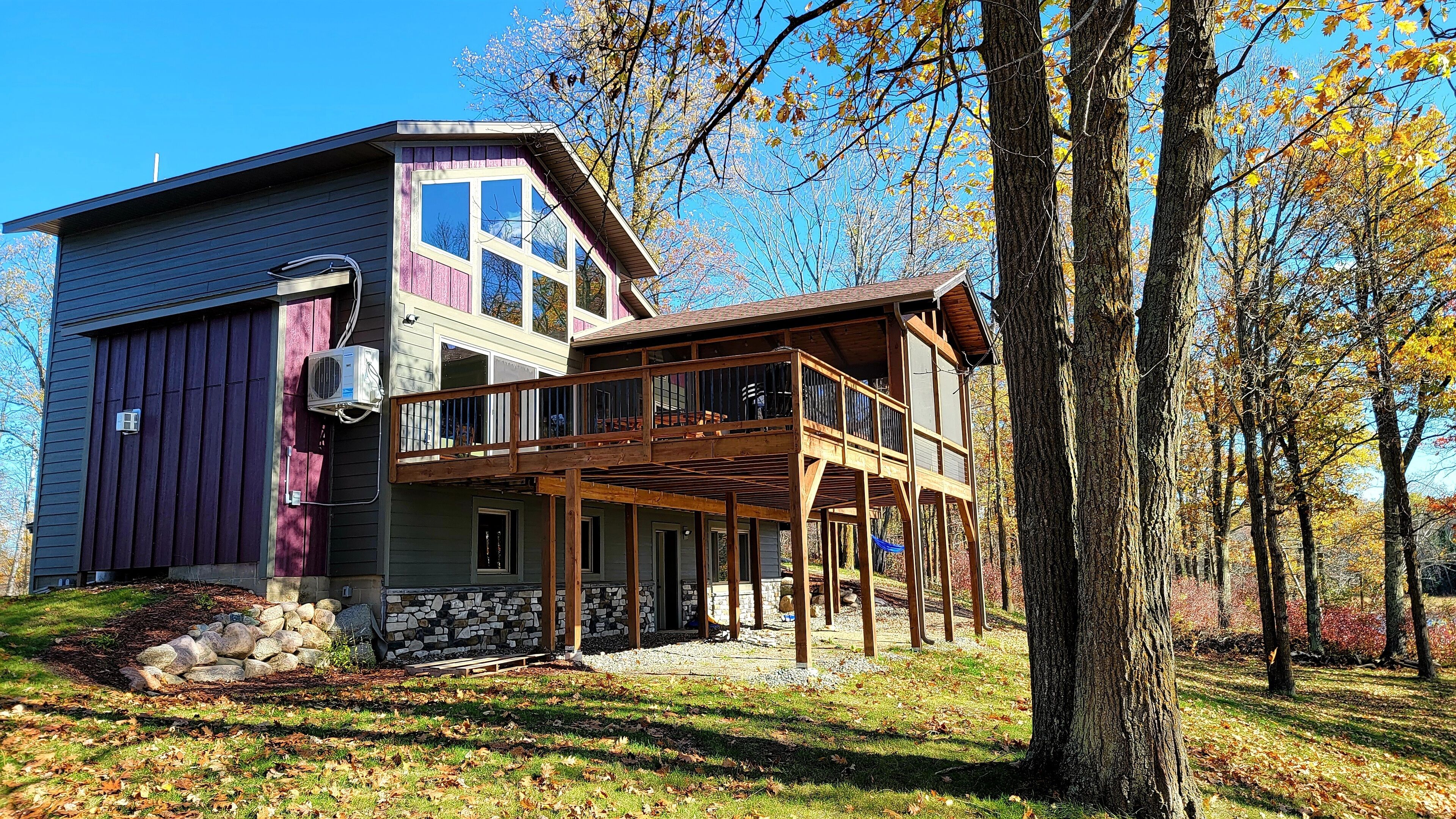 Private Newly Built Woman Lake Cabin with Detached Barn Style Bunk House Mark Twain once wrote that somethings are so difficult to explain, they must be experienced! Privacy and quiet rarely found on a major, pristine lake. Three sides of the property are either protected by a National Forest or the vast expansive lake shore of Women Lake. The other side is a buffer woods to the only other cabin close. Hear the quiet? My brother and I spent two years lovingly remodeling this generational property, adding modern conveniences while still preserving. Beamed screened porch and entry ceilings, expansive deck, two story great room with skip sawn pine with beam ceiling, reading loft with beautiful lake views, two story stone gas fireplace, and converted the curved Amish built barn into an upper deck bunkhouse with full bath including walk in shower. There are three rooms in the main cabin (2 queens and 1 king) with a queen pull out couch. The bunk room has three twin over queen bunks, smart TV’s, wifi. The pictures tell the rest... would sleep 17. We plan to share our treasure a few times each year. Read the reviews as they come as we so welcome them from those who appreciate this beauty! Dan and John