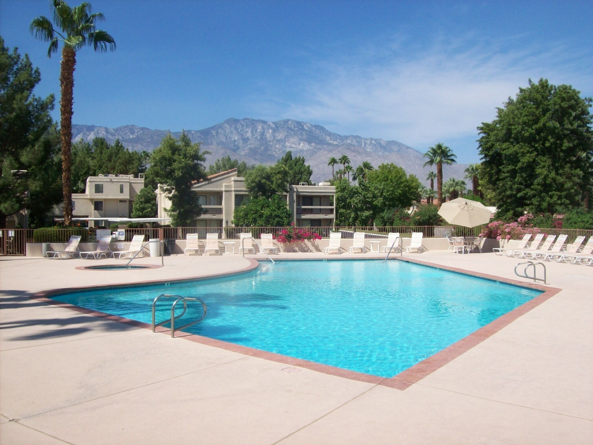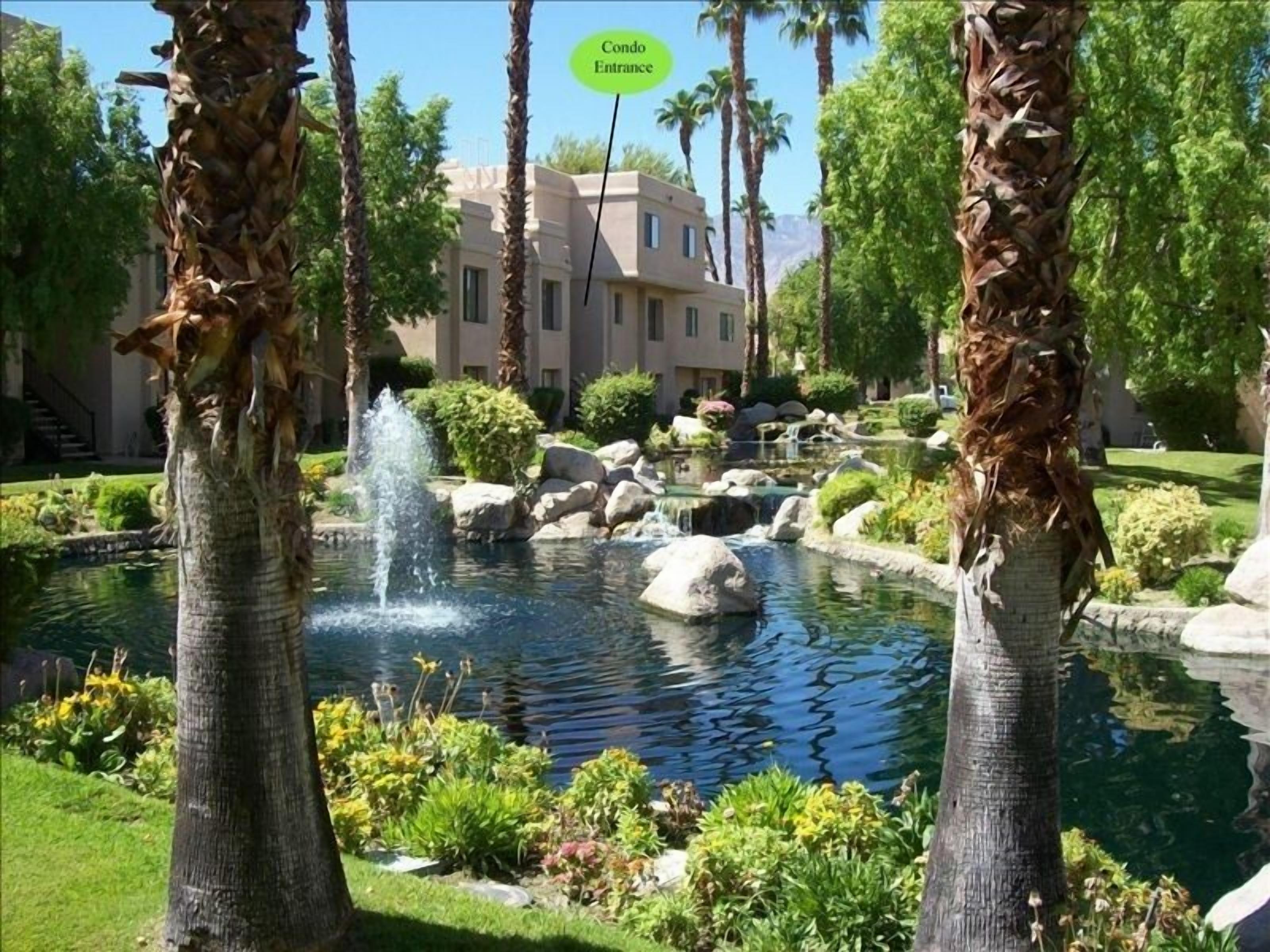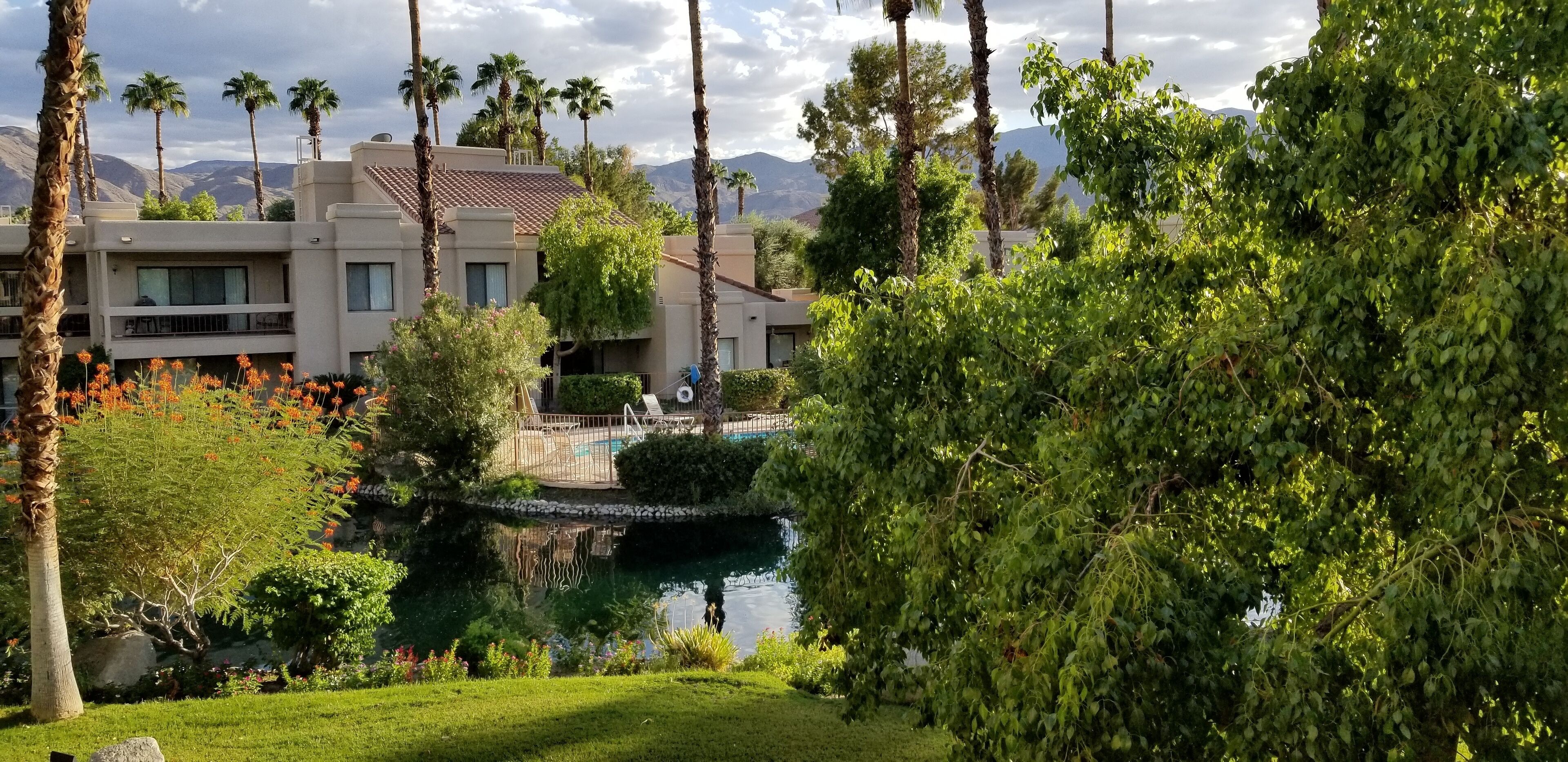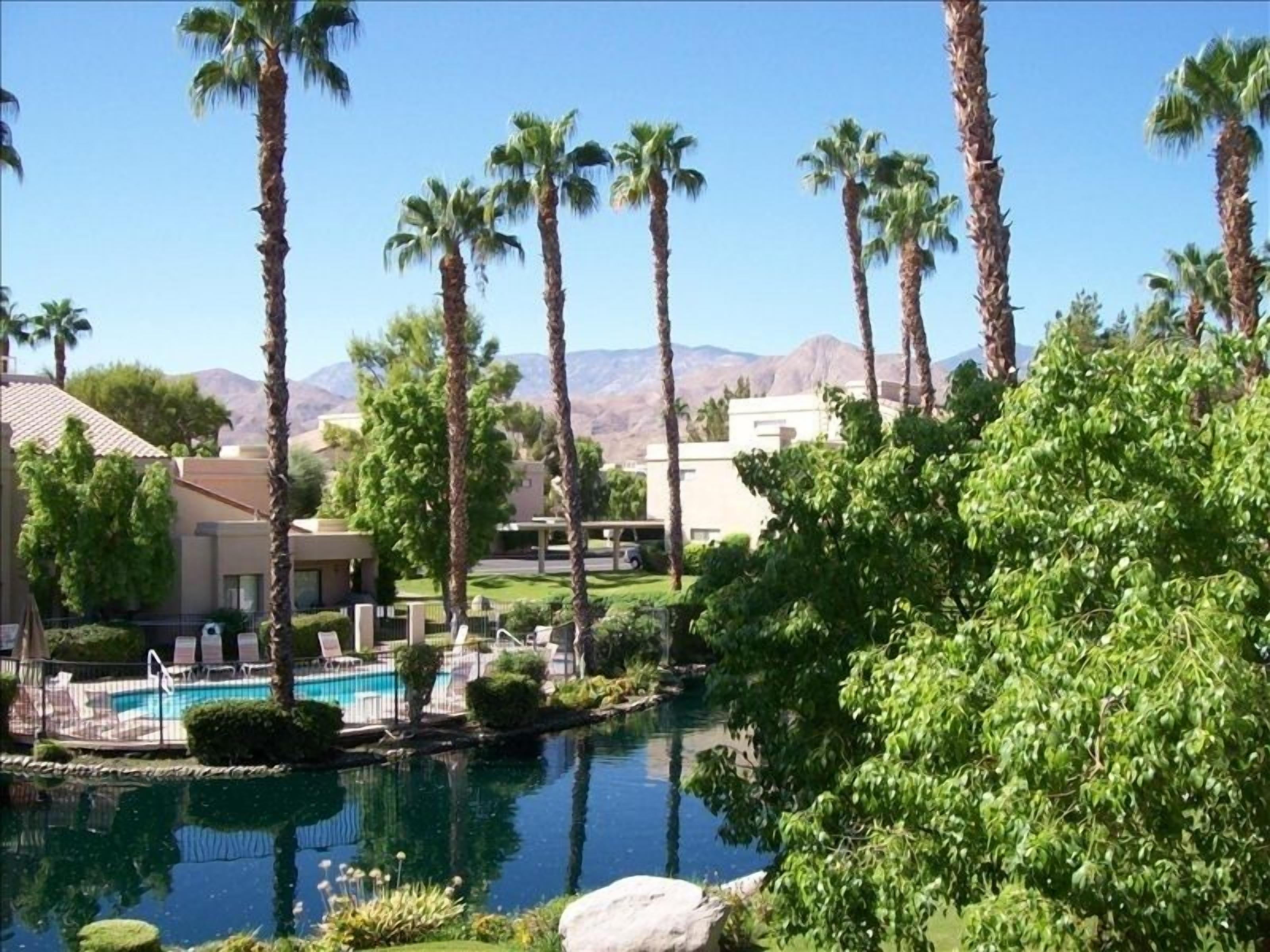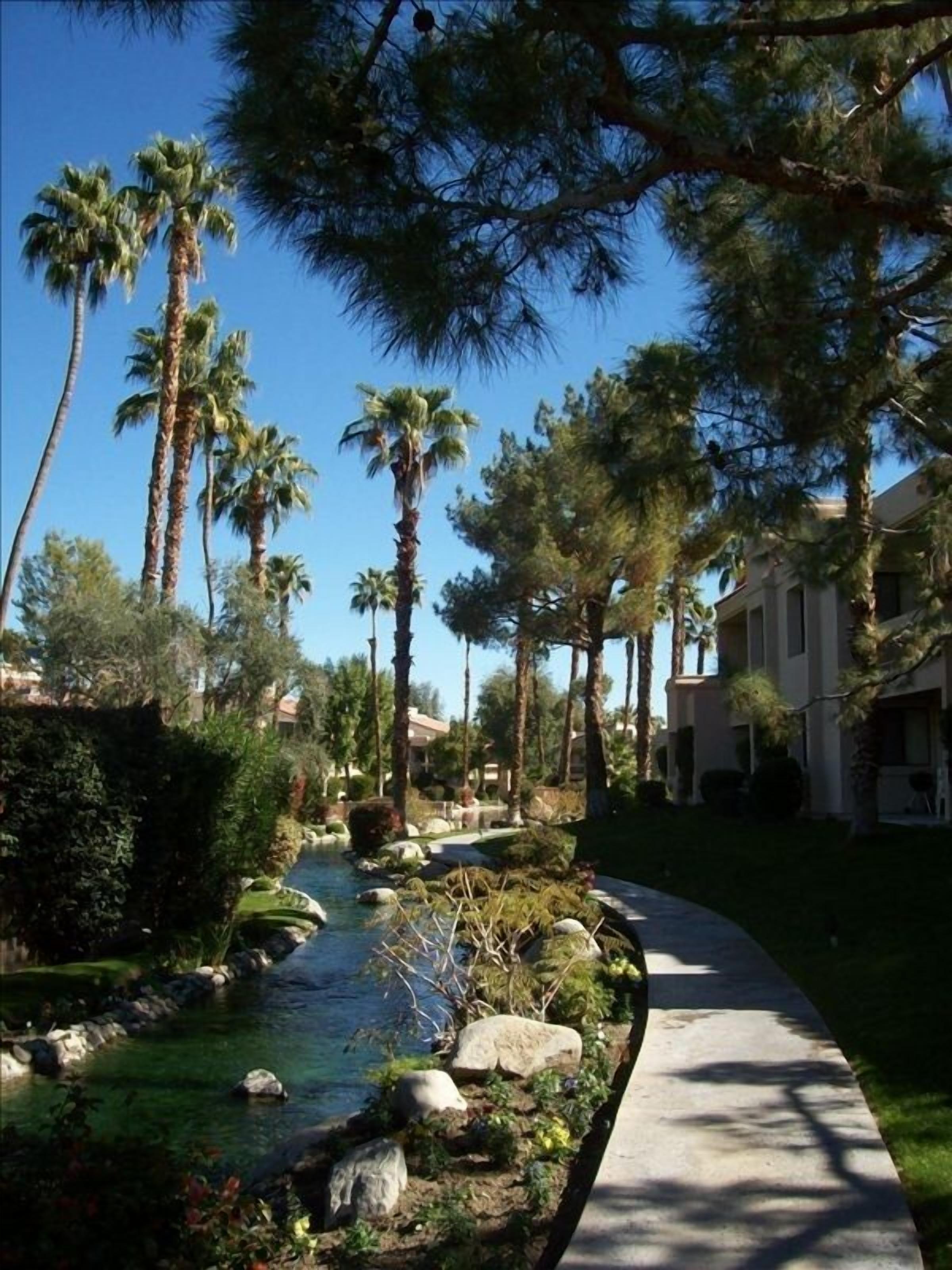 Serene Condo with Intoxicating Mountain, Pool and Pond Views Pastel & Wicker Free!!Make the most of your Palm Springs getaway in this comfortable and modern, 1330 sq. ft., 2 bedroom, 2 bath , 2nd story condominium, conveniently located in Cathedral City - between Palm Springs and Rancho Mirage. Thanks to the premiere location of this condominium within the Canyon Shores complex, your southwest facing balcony boasts a spectacular mountain view. It's also the perfect place to relax with a cool drink and good book while you keep an eye on the kids at the pool - or maybe just watch the ducks enjoy one of the several beautiful ponds. This condo is one of the few units within the complex which enjoy a large pond and fountain view in both the front and back. This feature truly creates an atmosphere of calm relaxation and lush seclusion. From corkscrew to cookie sheet, food preparation will be a breeze in this fully stocked kitchen. Both bedrooms feature plush-top queen-size beds. The master bedroom boasts a full ensuite, while the guest room has the main bath just steps away. If you have additional guests, no worries! The sofa in the living room converts into yet another queen bed. You can easily stay connected with friends and family back home thanks to high-speed wireless internet and free long-distance calling throughout North America. A key-less entry also means you'll never have to worry about keeping track of the keys. One covered parking stall is included with the rental and there are plenty of guest parking spaces just outside your front door.A glass-top table and 2 chairs provides the perfect setting for a relaxing meal on the balcony. Have some guests? 2 more patio chairs are available. A briquette bbq is available for all your grilling needs (HOA doesn't allow propane).
