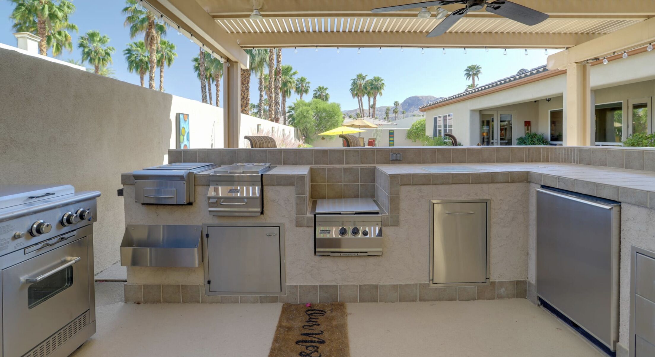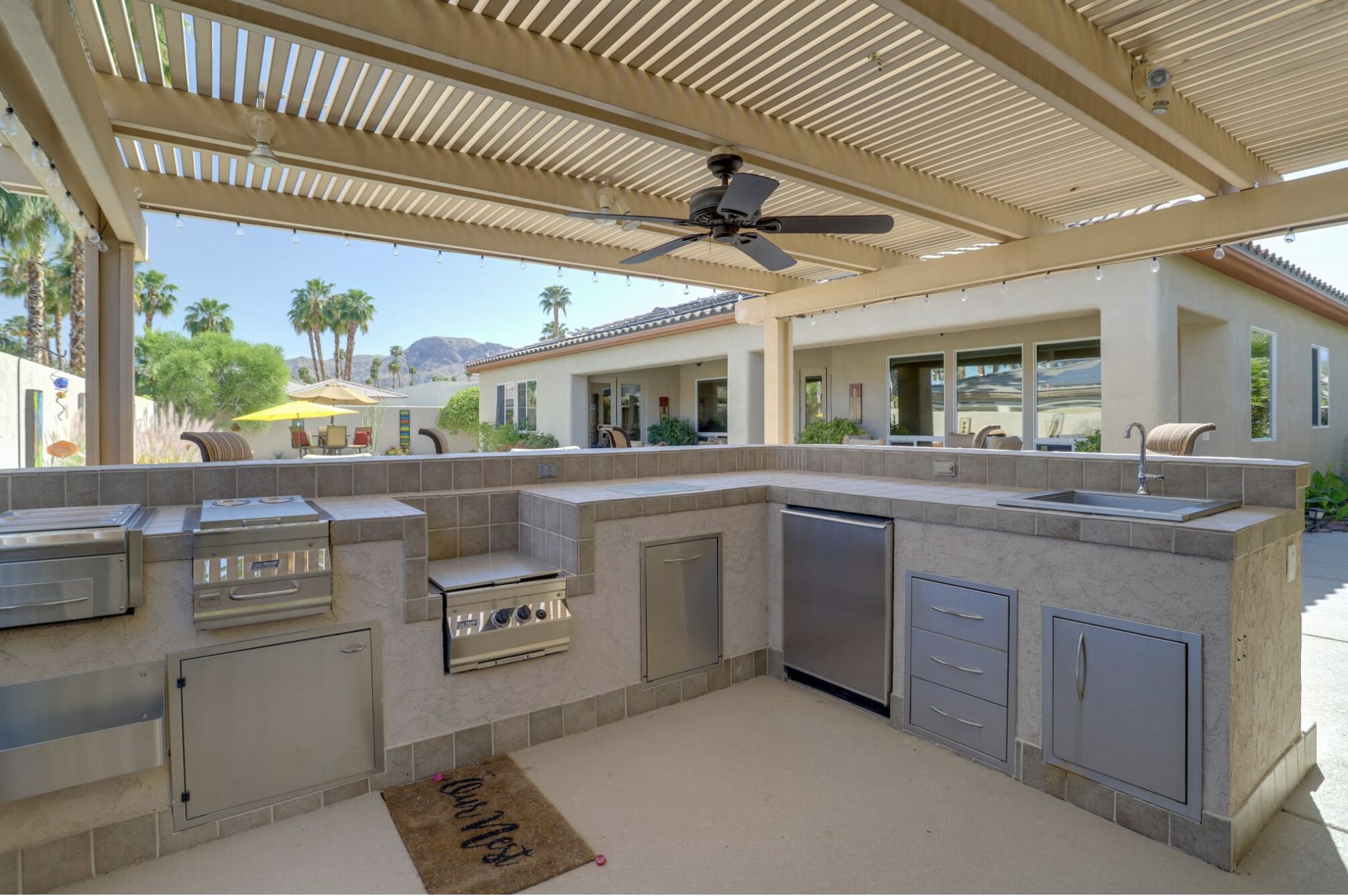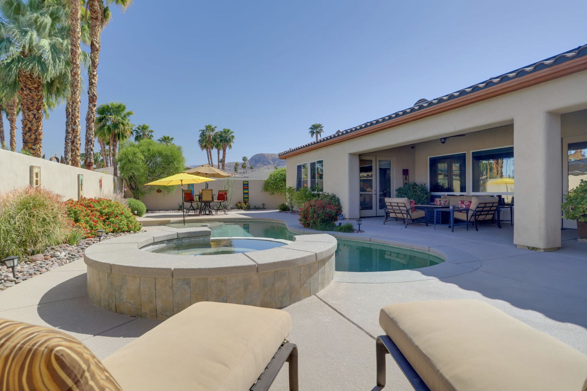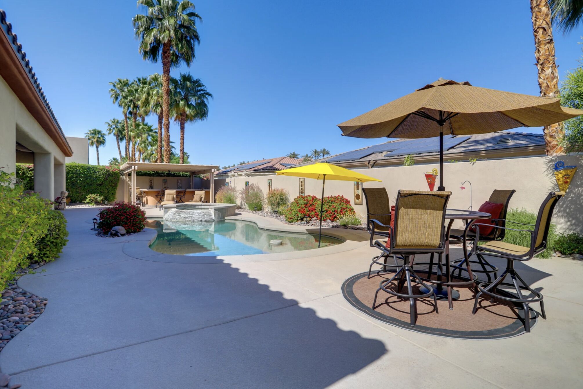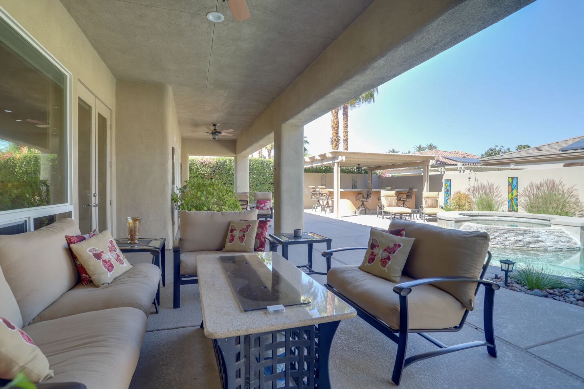 NEW LISTING! Spacious Cathedral City Home w/ Pool - Near Casino by RedAwning Embark on a tranquil escape to this luxurious Cathedral City oasis with your family and furry friends. Boasting an array of upscale amenities and serene mountain views, this elegant 3-bedroom, 3.5-bathroom vacation home offers the perfect blend of relaxation and convenience.Exclusive Features: * Indulge in the sunlit bliss of a private outdoor pool that ranges from 4 to 7 feet in depth. Unwind in the spa, gather around the cozy gas fire pit, or dine al fresco with mountain vistas as your backdrop. * Modern comforts meet smart technology in a home designed with step-free access grant yourself a hassle-free retreat, complete with smart TVs and keyless entry. * Savor the flavors of vacation with a fully equipped outdoor kitchen and indulge in a culinary paradise with a double wall oven, spacious countertops, and state-of-the-art appliances. * Two commodious living areas provide ample space for rest and relaxation, while three convenient workstations offer peaceful nooks for when duty calls.Sumptuous Sleeping Quarters: * Retreat to the elegant bedroom suite with a plush California King Bed and en-suite luxury. Two additional bedrooms, each with a comfortable Queen Bed, promise restful nights for all guests. * The family room doubles as a cozy nook with an additional sleeper sofa, ensuring everyone finds their perfect spot.Local Attractions and Conveniences: * Situated near tantalizing attractions, you're minutes away from The Living Desert Zoo and Gardens and adrenaline-packed casinos. Golf enthusiasts will relish the proximity to several pristine courses. * Stock up on essentials or explore local flavors with nearby grocery stores, offering both convenience and local charm.Thoughtful Touches: * Enjoy peace of mind with amenities such as high-speed Wi-Fi, a laundry suite, central heating and air conditioning, and complimentary toiletries. * Safety is paramount, with exterior security cameras ensuring your stay is secure and undisturbed. * Free garage and driveway parking make coming and going as easy as the desert breeze.Respectful Living: * Abide by the quiet hours between 10:00 PM and 8:00 AM to maintain the tranquil atmosphere that Cathedral City is known for. * Pets are welcome to join the vacation for a nominal fee, ensuring no family member is left behind.Your desert dream vacation awaits at this spacious and serene retreat, where every detail has been crafted for your utmost comfort and enjoyment. Discover your home away from home at this stunning Cathedral City property.Pet friendly w/ $200 fee per pet, per stay (+ fees & taxes) with max 2 pets!!! CATHEDRAL CITY RULES/REGULATIONS: * Occupants shall respect neighbors privacy and peaceful enjoyment of property * Guests are required to comply with Cathedral City's noise and outdoor activity standards and regulations * No outdoor music, radio, musical instrument, amplifiers, karaoke, or devices that produce or reproduce sound can be used outdoors at any time. If used indoors, guests must ensure it cannot be heard beyond the property line * Please observe quiet hours from 10:00 pm to 8:00 am * NOTE: Maximum 1 vehicles are allowed on-site, 2 in the driveway and 1 in the garage * NOTE: This property has a strict maximum occupancy of 6 guests * Pet friendly w/ $200 fee per pet, per stay (+ fees & taxes) with max 2 pets!!! * No events, parties, or large gatheringsYour safety matters. This property features 3 exterior security cameras: 1 camera is located on the front door facing the front entrance, 1 camera is located on the back gate facing the back entrance, and 1 camera is located on the back patio facing the outdoor dining area. The cameras are outward facing and do not look into interior spaces. The cameras are activated by motion and will actively record video and sound while guests are in residence.