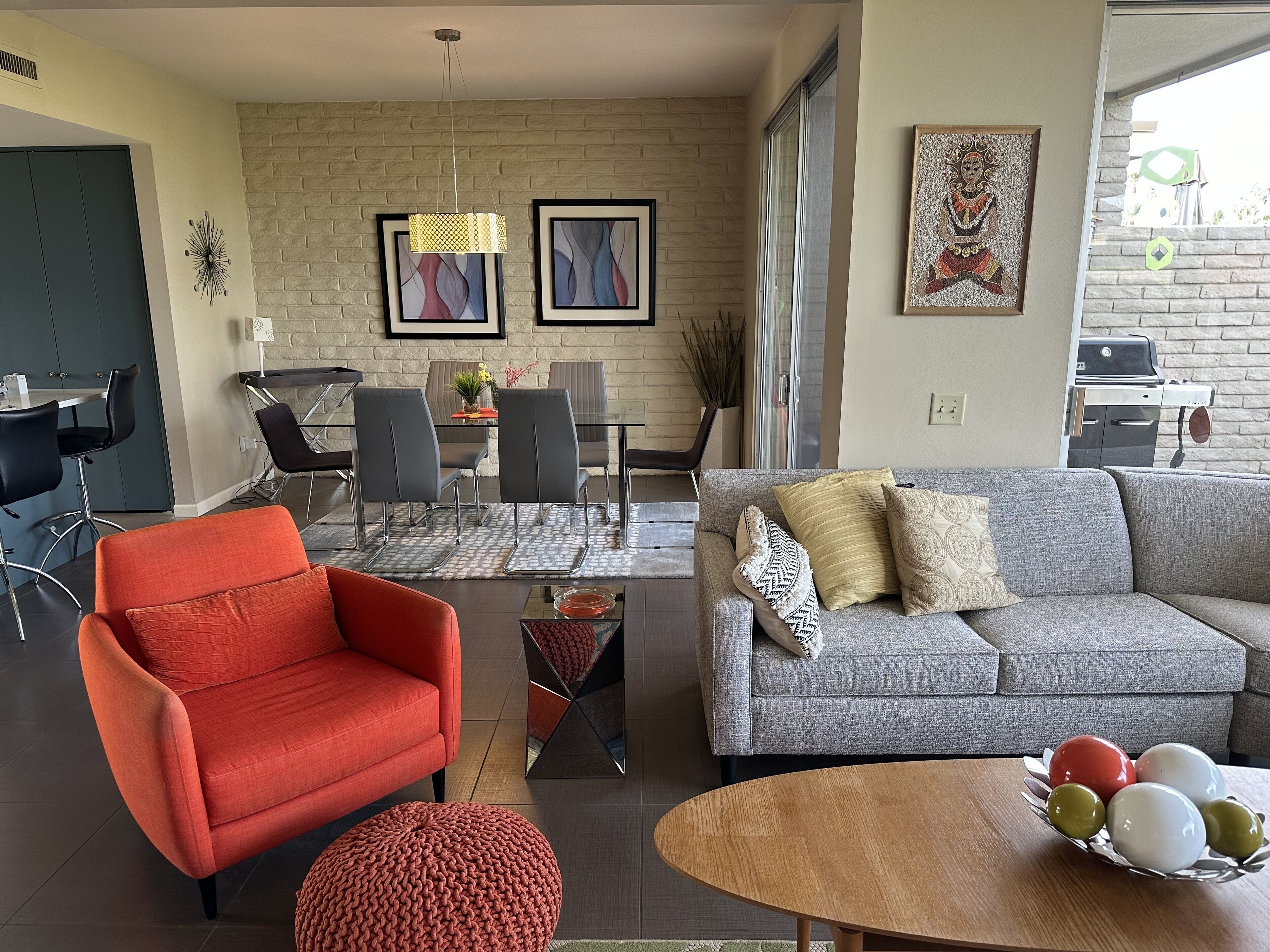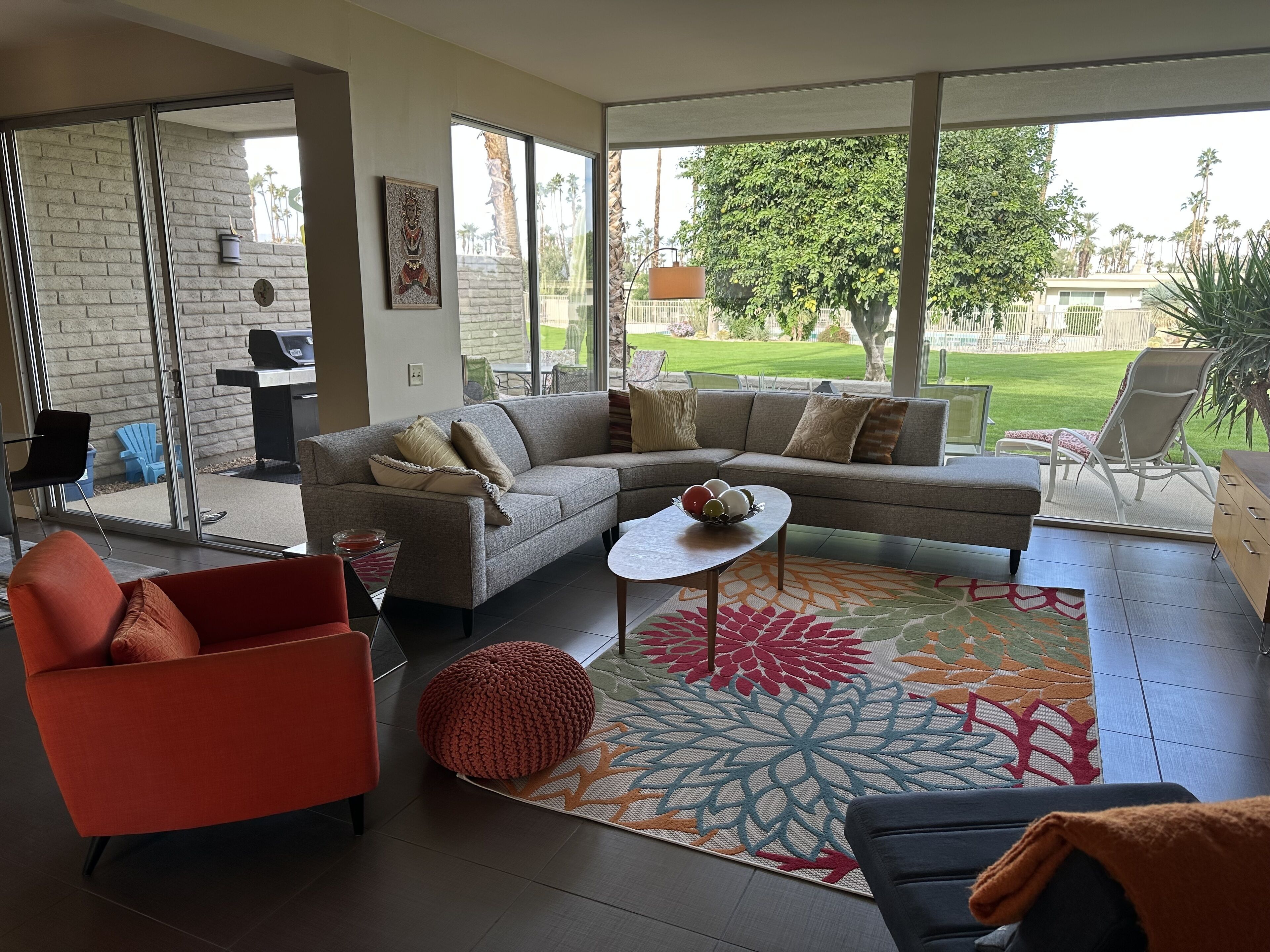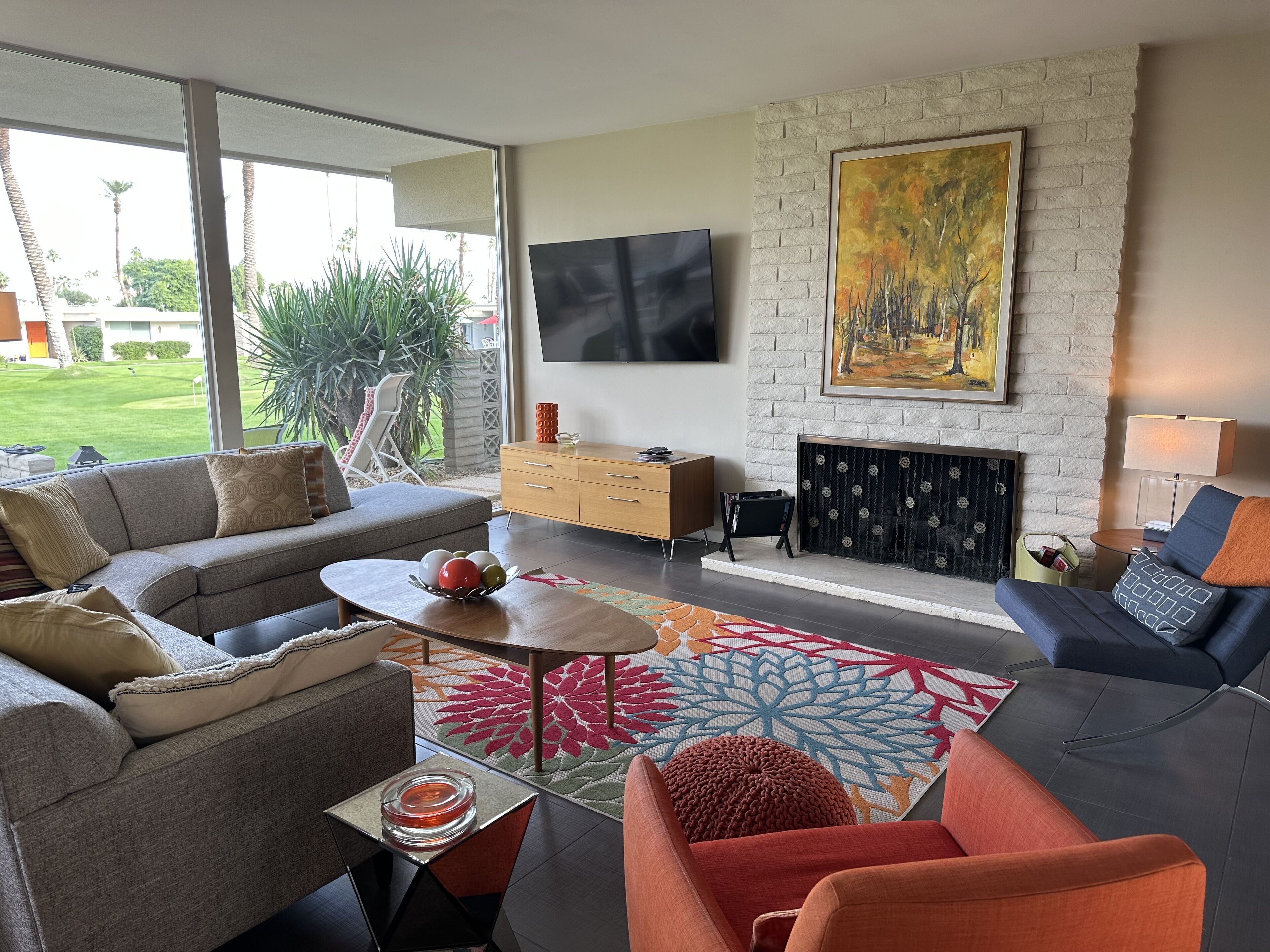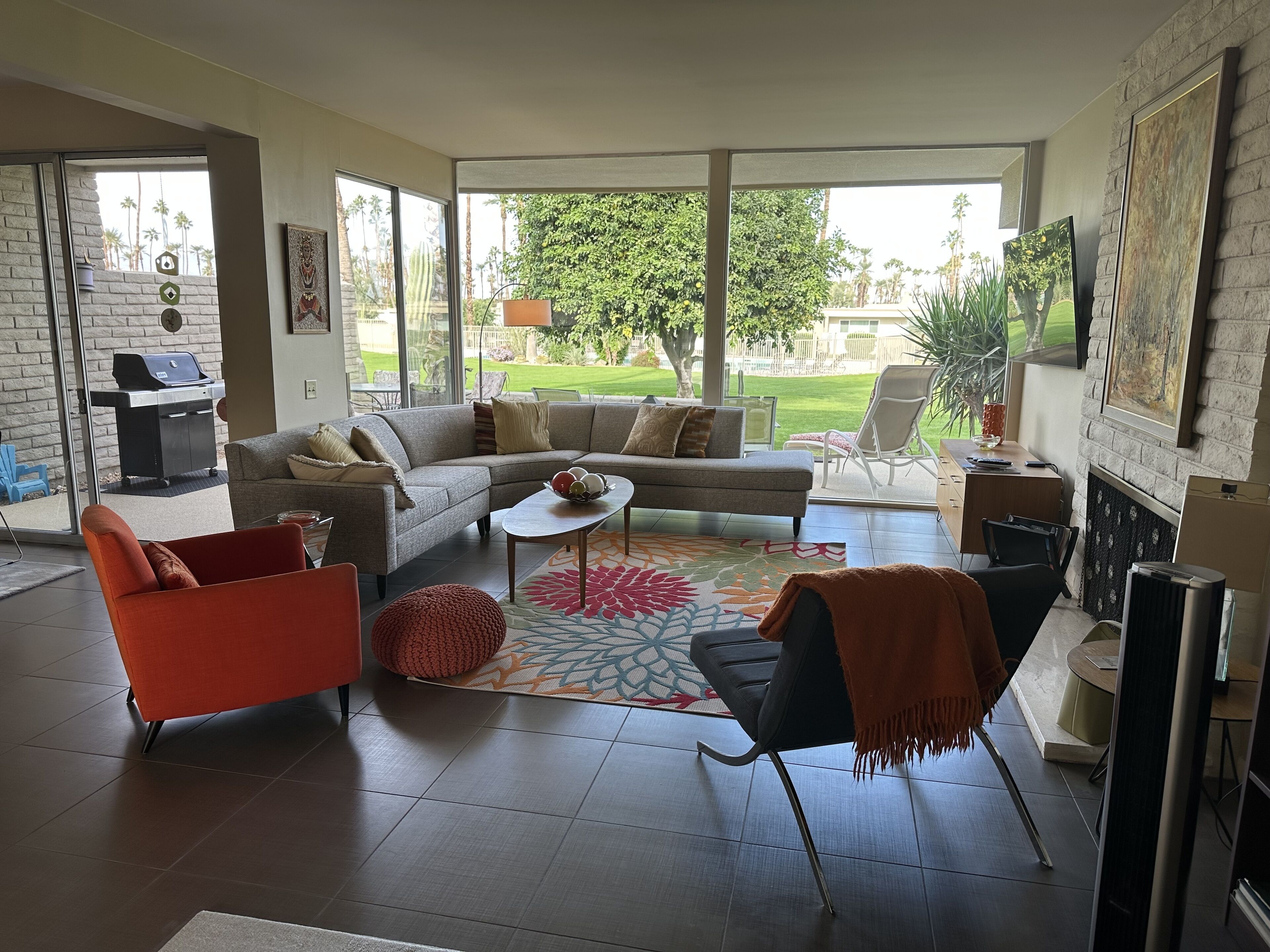 MID CENTURY MODERN IN INDIAN WELLS Built in the Mid Century and recently remodeled to its original era. Just under 2000 square feet of space all on one level with a spacious private patio with BBQ. Large floor to ceiling windows maximize the view of the expansive green space and you're only steps to a large pool & spa. The beautiful bright kitchen is brand new (2022). Loads of cupboard space, quartz countertops and well stocked. Bedrooms are large with 2 King Size Beds in two rooms and twin beds in 3rd room. Tile throughout most of the home, except carpets in Bedrooms. Sliding glass doors in bathrooms lead to inner courtyard. We are continually doing upgrades on our home to make it very comfortable yet preserving the mid century vibe.There are 6 pools and 3 hot tubs to choose from as well as two tennis courts & a pickleball court. The pool behind our home is the largest and has a 14 person hot tub. Fabulous location close to Indian Wells Club, the Hyatt Hotel & numerous restaurants. A short drive takes you to El Paseo's world class shopping & restaurants.We love our home in Casa Dorado and are sure you will enjoy it as much as we do.