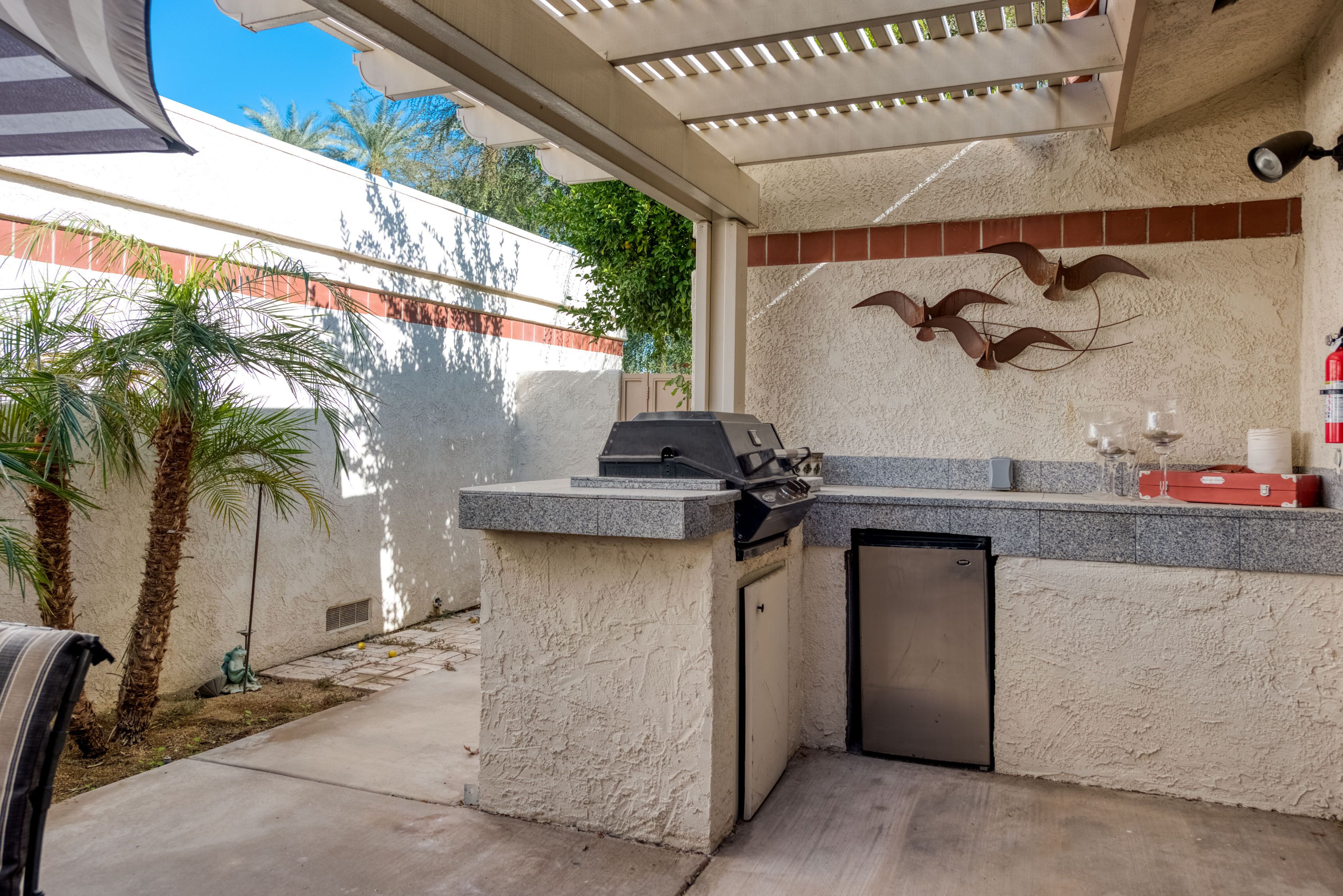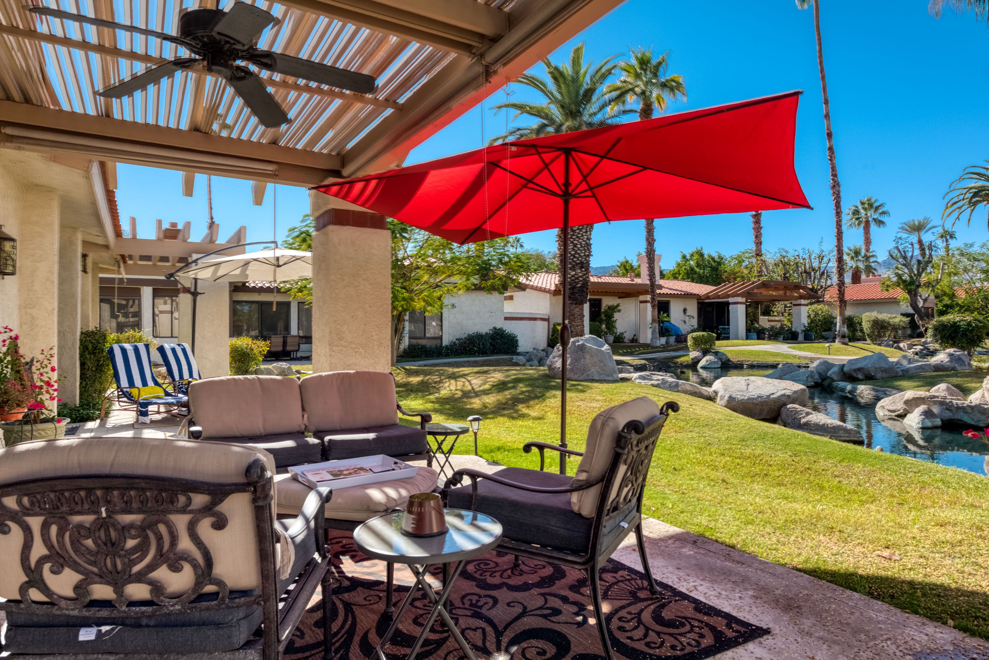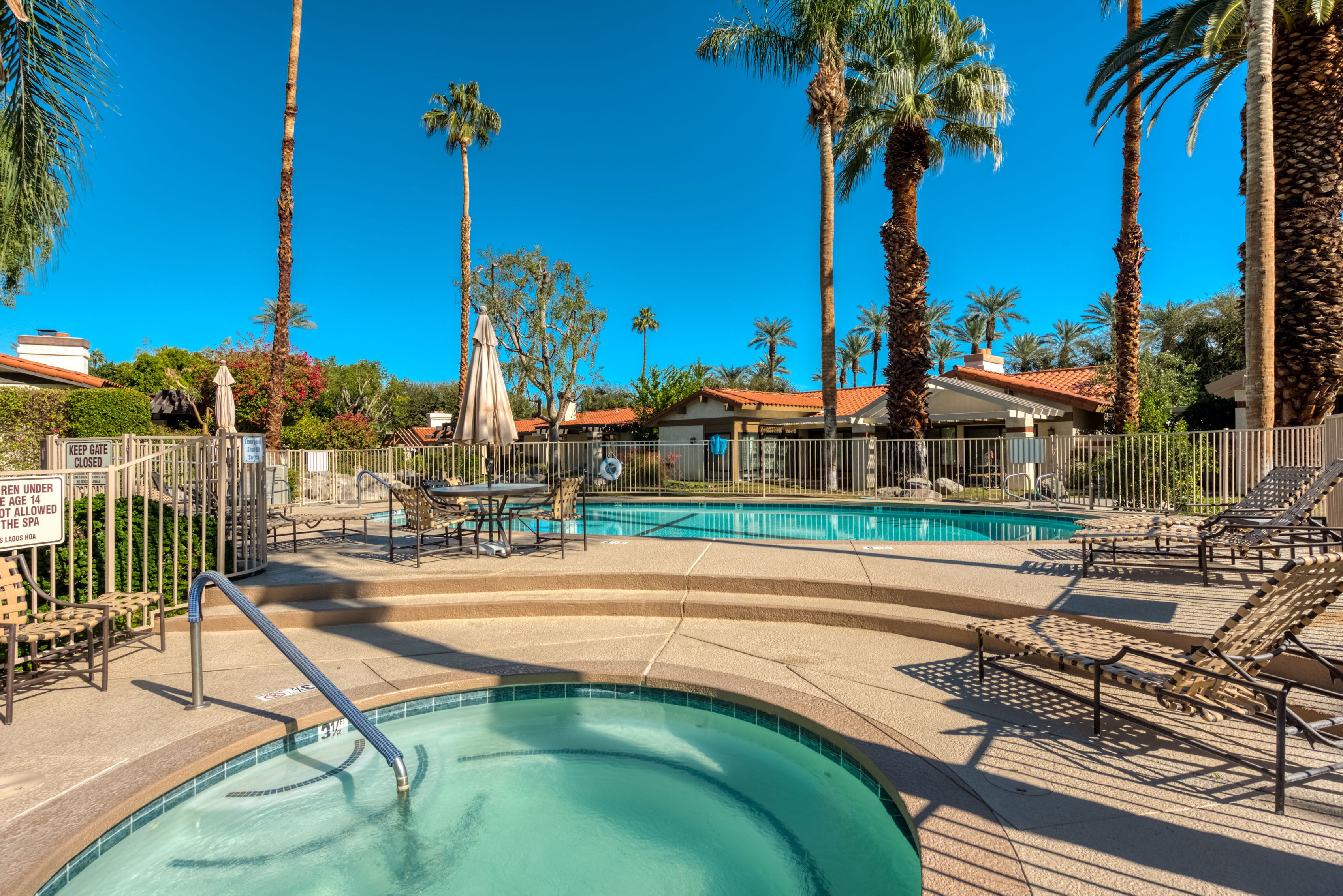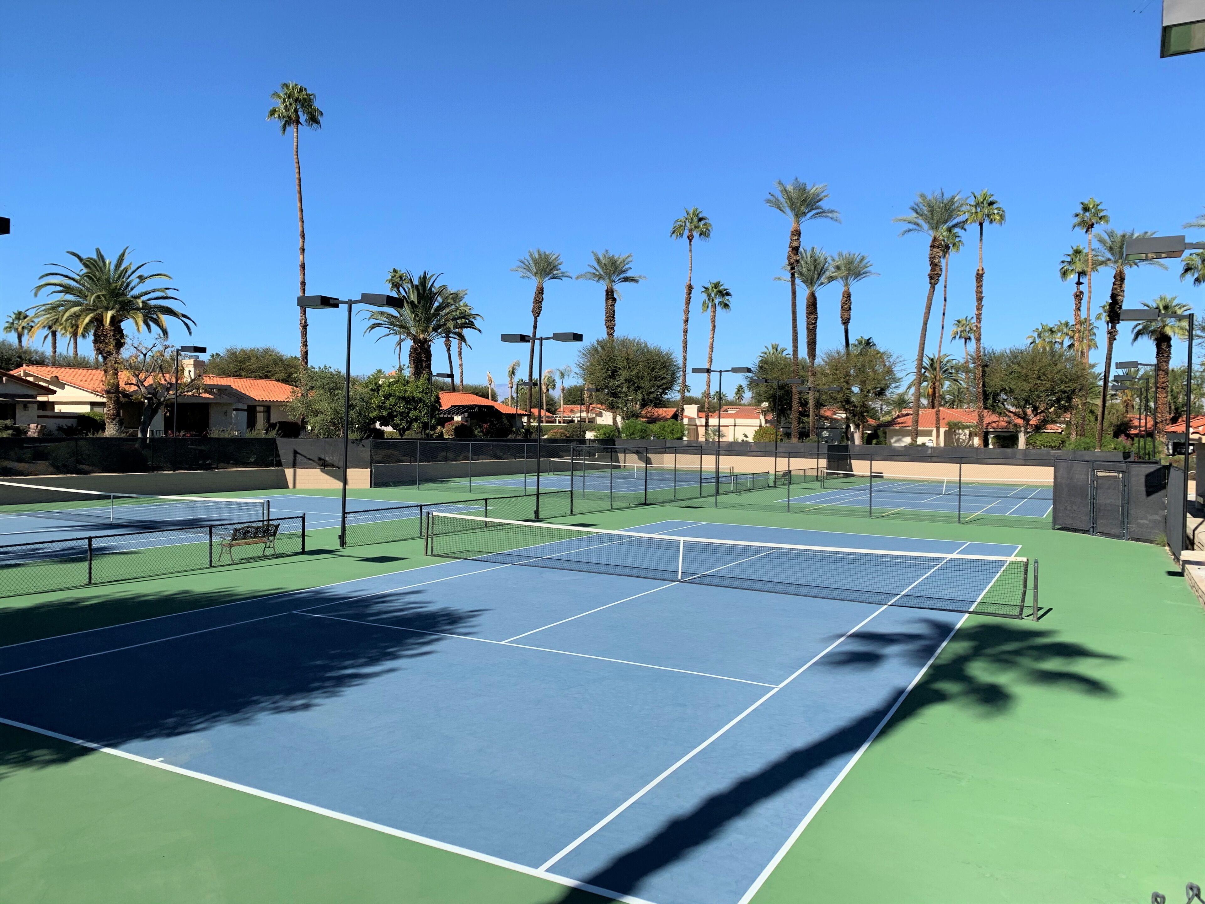 Indian Wells Pools and Streams Art Home w/ Tennis Elegant and spacious fully furnished 3 bedroom, 3 bath house located behind the gates of Los Lagos in the prestigious city of Indian Wells. The property sits steps from the year round heated pool and jacuzzi and a very short scenic walk through meandering streams and waterfalls to the tennis and pickleball courts. The house has a wet bar, 3 Sonos speakers, 2 fireplaces, and 5 flat screen TVs. In close proximity to El Paseo, Palm Springs, Indian Wells Tennis Gardens, and other area attractions.Entire home including two car garage is available for your next desert vacation! There are three bedrooms all with Smart TVs and the following bed setup: Master has a king mattress with large closet and private bathroom featuring a shower, oversized tub, and double vanity. Master has a 60" LG Smart TV and a private exit to the outdoor pool patio and pool areas. Bedroom #2 features a king mattress with closet and a 50" Vizio Smart TV. Bedroom #3 features a two extra-long twin beds pushed together as a king configuration along with a 50" TCL TV. Bathroom #2 features a shower/tub setup. Bathroom #3 has a shower. Living room features tall cathedral ceilings, an atmospheric fire place, comfy sofas, a game desk, 3 Sonos speakers, and a 60" Samsung Smart TV. It also has views of the pool area, indoor dining table, and kitchen in the open floor plan. Nice chess and backgammon sets are available for guest use and fun. High speed w-ifi internet and basic Spectrum cable are included. The den facing the street has a gas fireplace and 40" TV along with comfy sofa and reading chair. Kitchen is modern and well stocked with drip coffee maker, nespresso coffee maker, microwave, dishwasher, disposal, blender, warming drawer, pots, pans, glasses (wine, mugs, cups), plates, bowls, oven, stove, utensils, silverware, fridge with ice in door with water dispenser, extra fridge in garage, cooking basics: oil, salt & pepper. Many more kitchen items provided not listed. Guest starter kit includes coffee, dishwasher detergent, dish soap, shampoo, conditioner. Indoor dining room table seats eight. There is a large granite work desk between the kitchen and den with a printer. Side outdoor patio area features a propane BBQ grill island with small fridge and three tables with chairs for outdoor dining. There are tables and lounge chairs outside of the living and master rooms for morning coffee or laying out on a towel in the warm sun. Two car garage and washer/dryer are available for guest use. Ironing board and iron in garage.Log Lagos contains four tennis courts with night lighting, two paddle ball courts, pool, jacuzzi, and walking paths along meandering streams and lagoons.