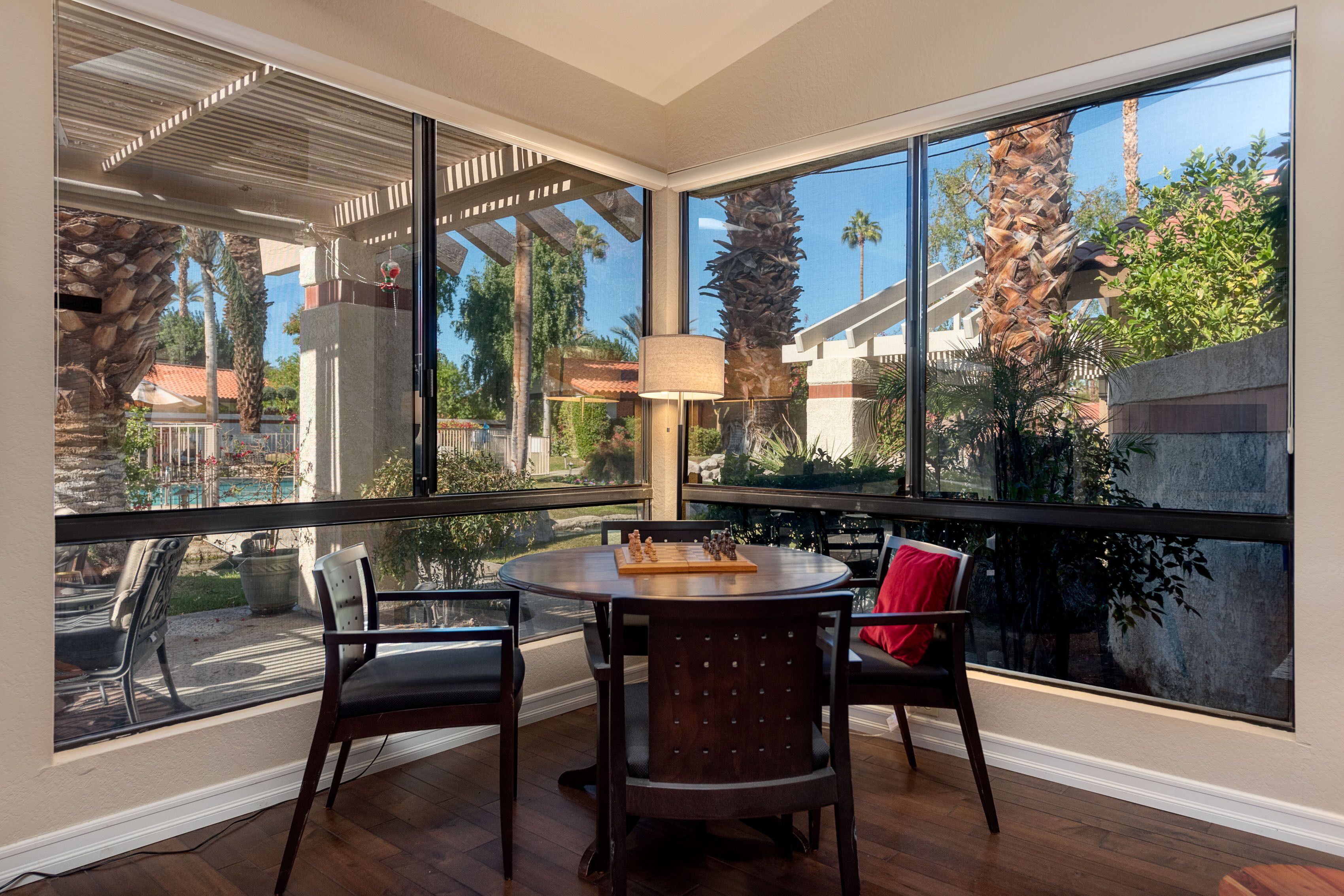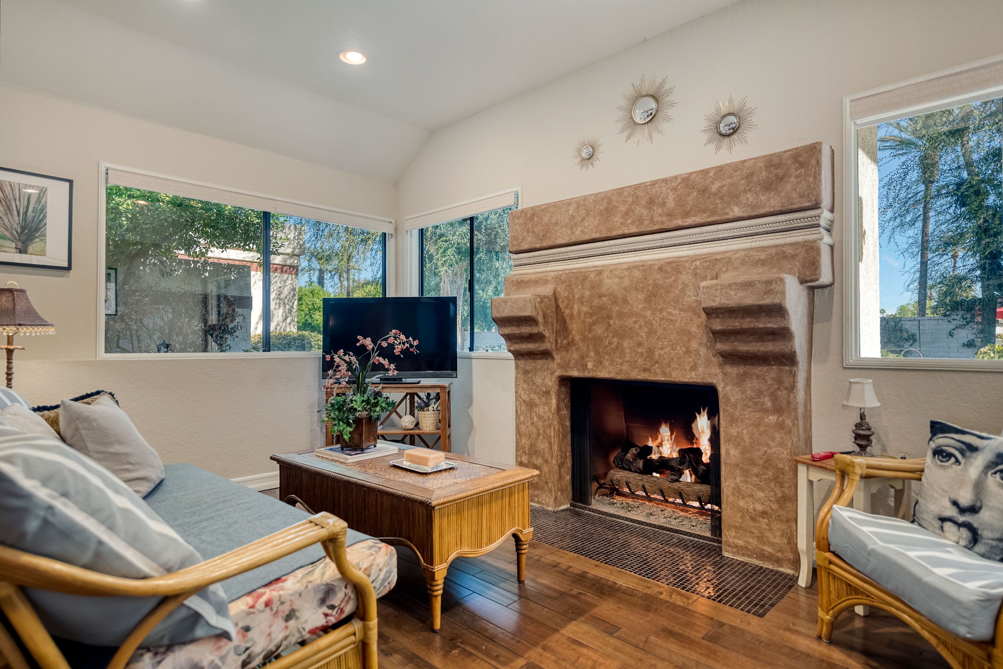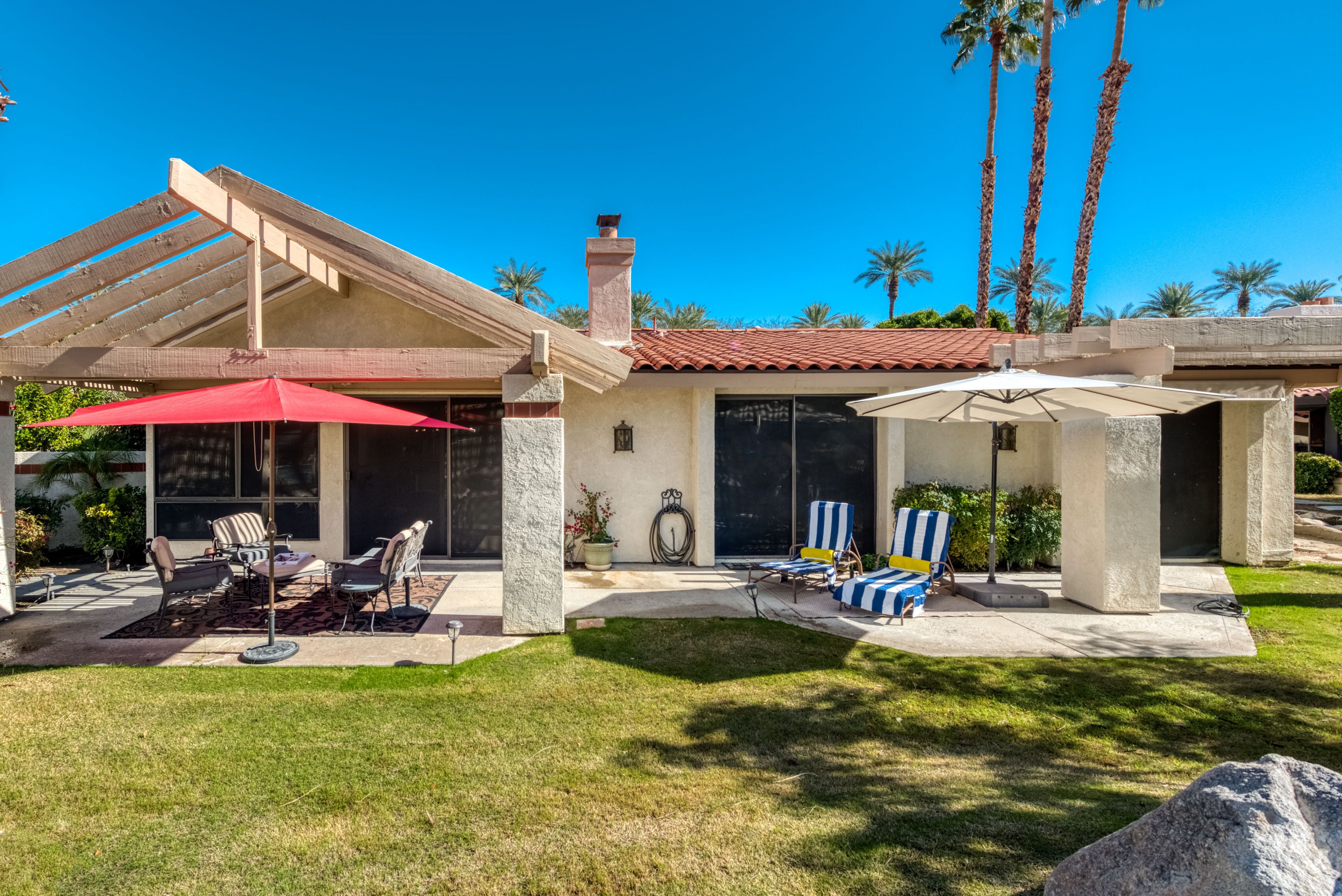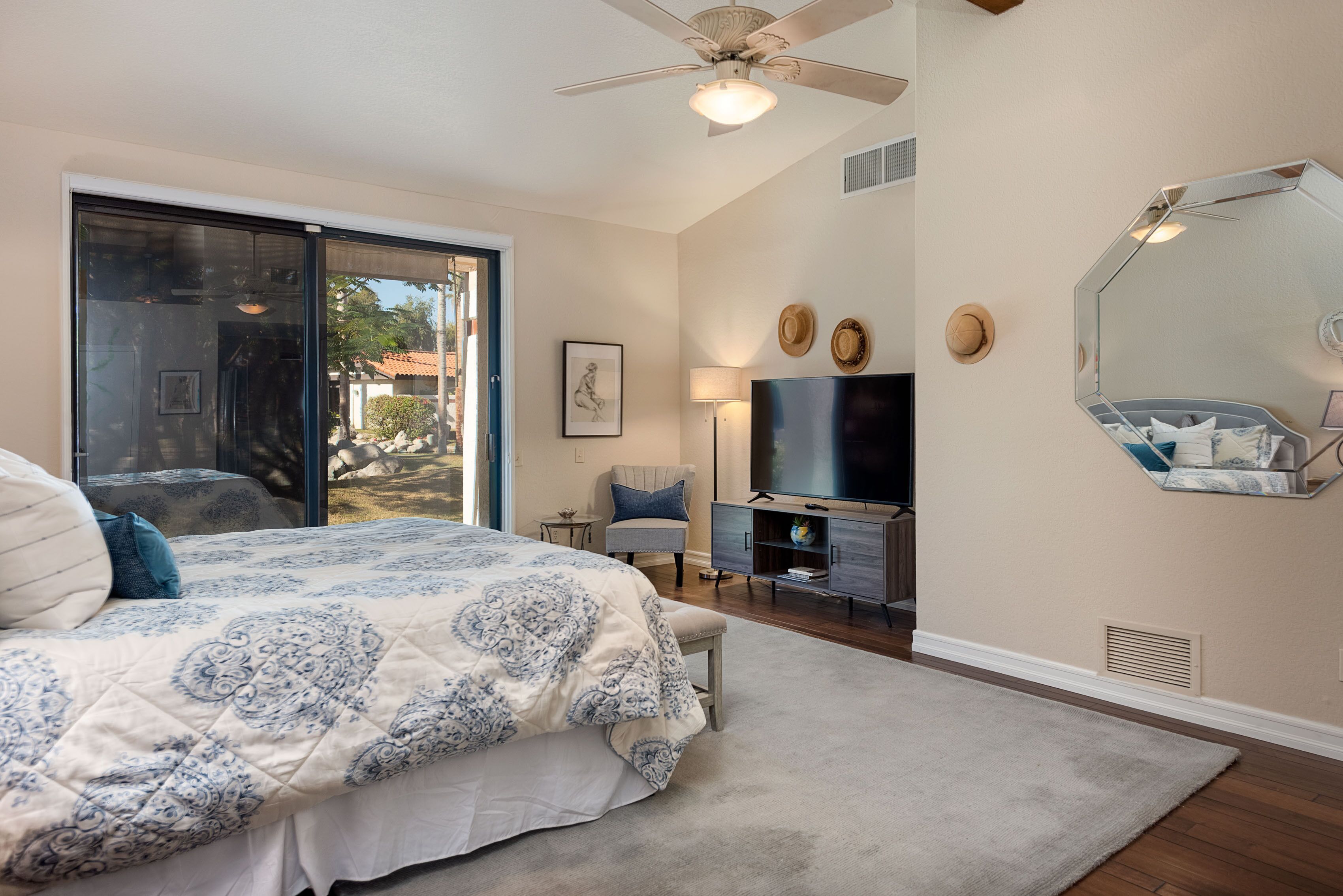 Indian Wells Pools and Streams Art Home w/ Tennis Elegant and spacious fully furnished 3 bedroom, 3 bath house located behind the gates of Los Lagos in the prestigious city of Indian Wells. The property sits steps from the year round heated pool and jacuzzi and a very short scenic walk through meandering streams and waterfalls to the tennis and pickleball courts. The house has a wet bar, 3 Sonos speakers, 2 fireplaces, and 5 flat screen TVs. In close proximity to El Paseo, Palm Springs, Indian Wells Tennis Gardens, and other area attractions.Entire home including two car garage is available for your next desert vacation! There are three bedrooms all with Smart TVs and the following bed setup: Master has a king mattress with large closet and private bathroom featuring a shower, oversized tub, and double vanity. Master has a 60" LG Smart TV and a private exit to the outdoor pool patio and pool areas. Bedroom #2 features a king mattress with closet and a 50" Vizio Smart TV. Bedroom #3 features a two extra-long twin beds pushed together as a king configuration along with a 50" TCL TV. Bathroom #2 features a shower/tub setup. Bathroom #3 has a shower. Living room features tall cathedral ceilings, an atmospheric fire place, comfy sofas, a game desk, 3 Sonos speakers, and a 60" Samsung Smart TV. It also has views of the pool area, indoor dining table, and kitchen in the open floor plan. Nice chess and backgammon sets are available for guest use and fun. High speed w-ifi internet and basic Spectrum cable are included. The den facing the street has a gas fireplace and 40" TV along with comfy sofa and reading chair. Kitchen is modern and well stocked with drip coffee maker, nespresso coffee maker, microwave, dishwasher, disposal, blender, warming drawer, pots, pans, glasses (wine, mugs, cups), plates, bowls, oven, stove, utensils, silverware, fridge with ice in door with water dispenser, extra fridge in garage, cooking basics: oil, salt & pepper. Many more kitchen items provided not listed. Guest starter kit includes coffee, dishwasher detergent, dish soap, shampoo, conditioner. Indoor dining room table seats eight. There is a large granite work desk between the kitchen and den with a printer. Side outdoor patio area features a propane BBQ grill island with small fridge and three tables with chairs for outdoor dining. There are tables and lounge chairs outside of the living and master rooms for morning coffee or laying out on a towel in the warm sun. Two car garage and washer/dryer are available for guest use. Ironing board and iron in garage.Log Lagos contains four tennis courts with night lighting, two paddle ball courts, pool, jacuzzi, and walking paths along meandering streams and lagoons.