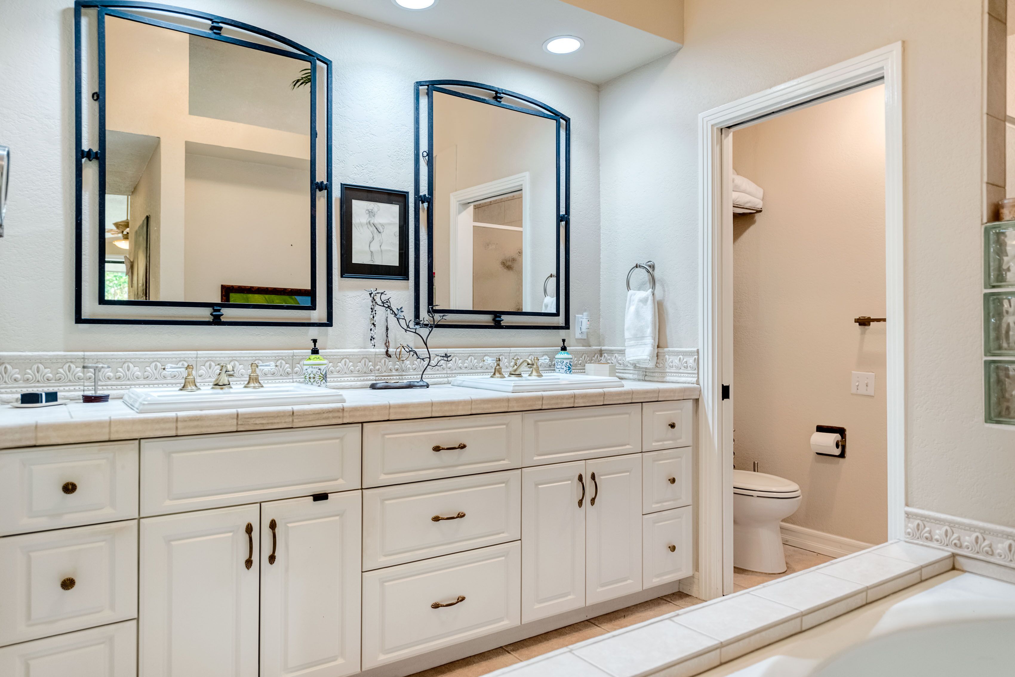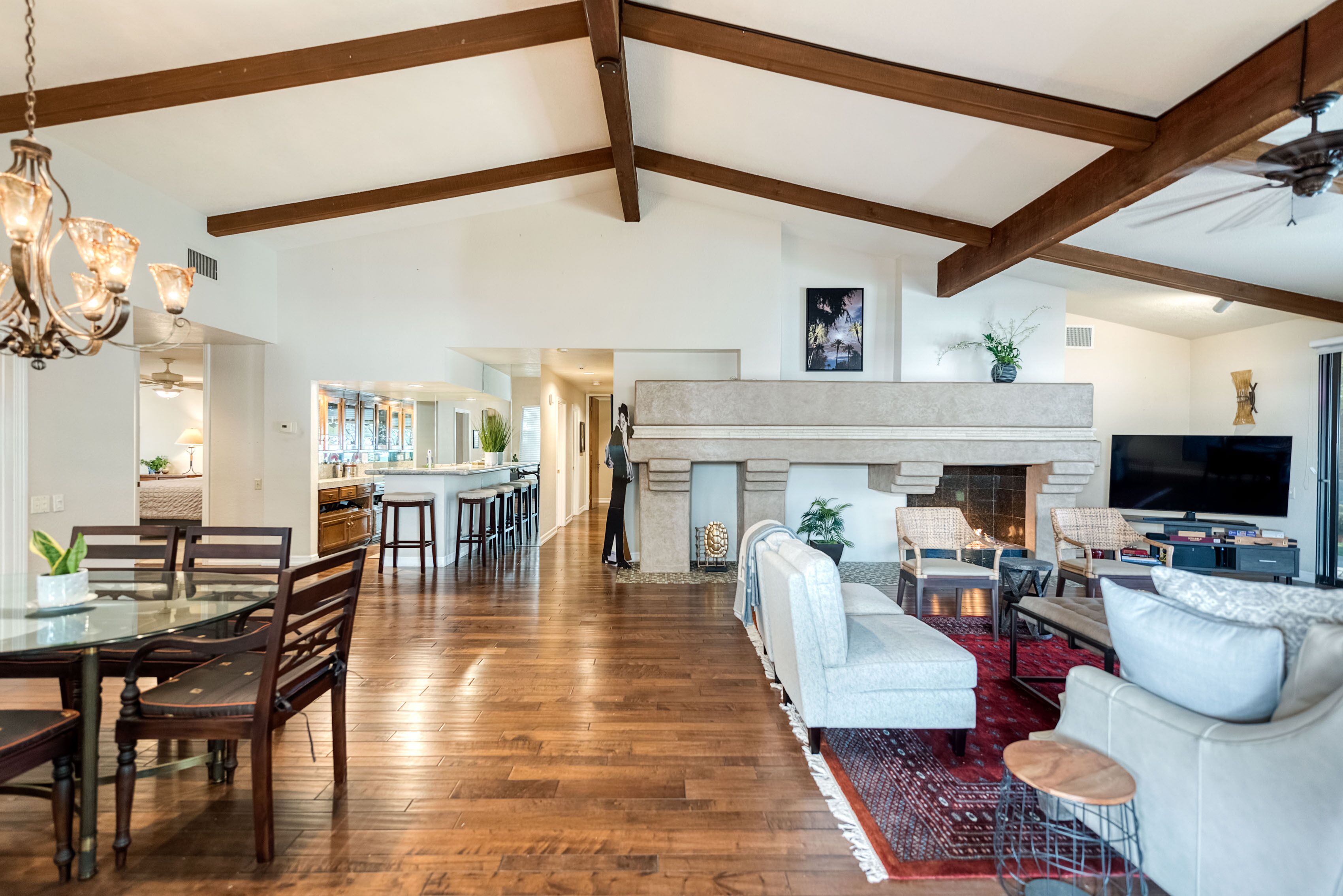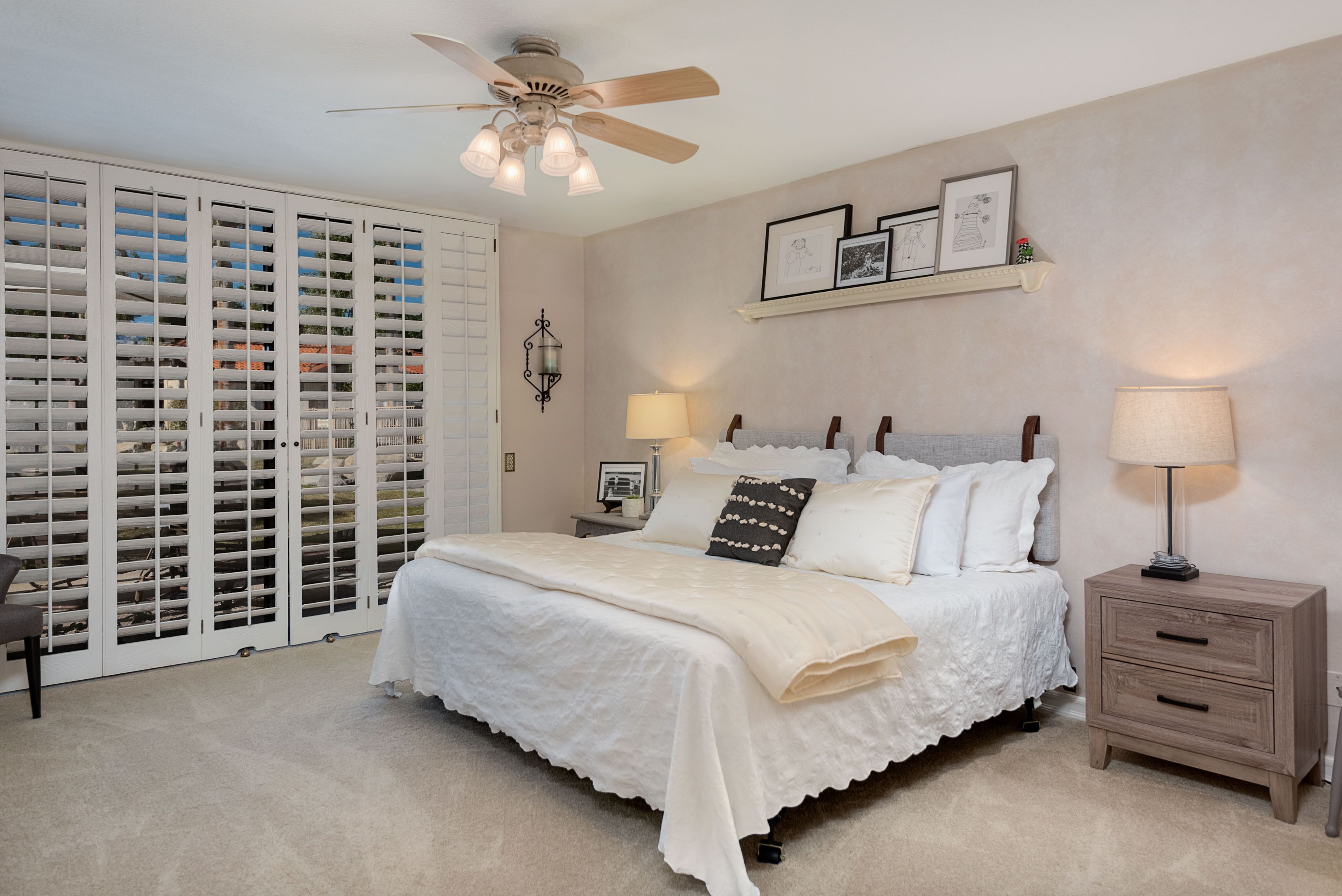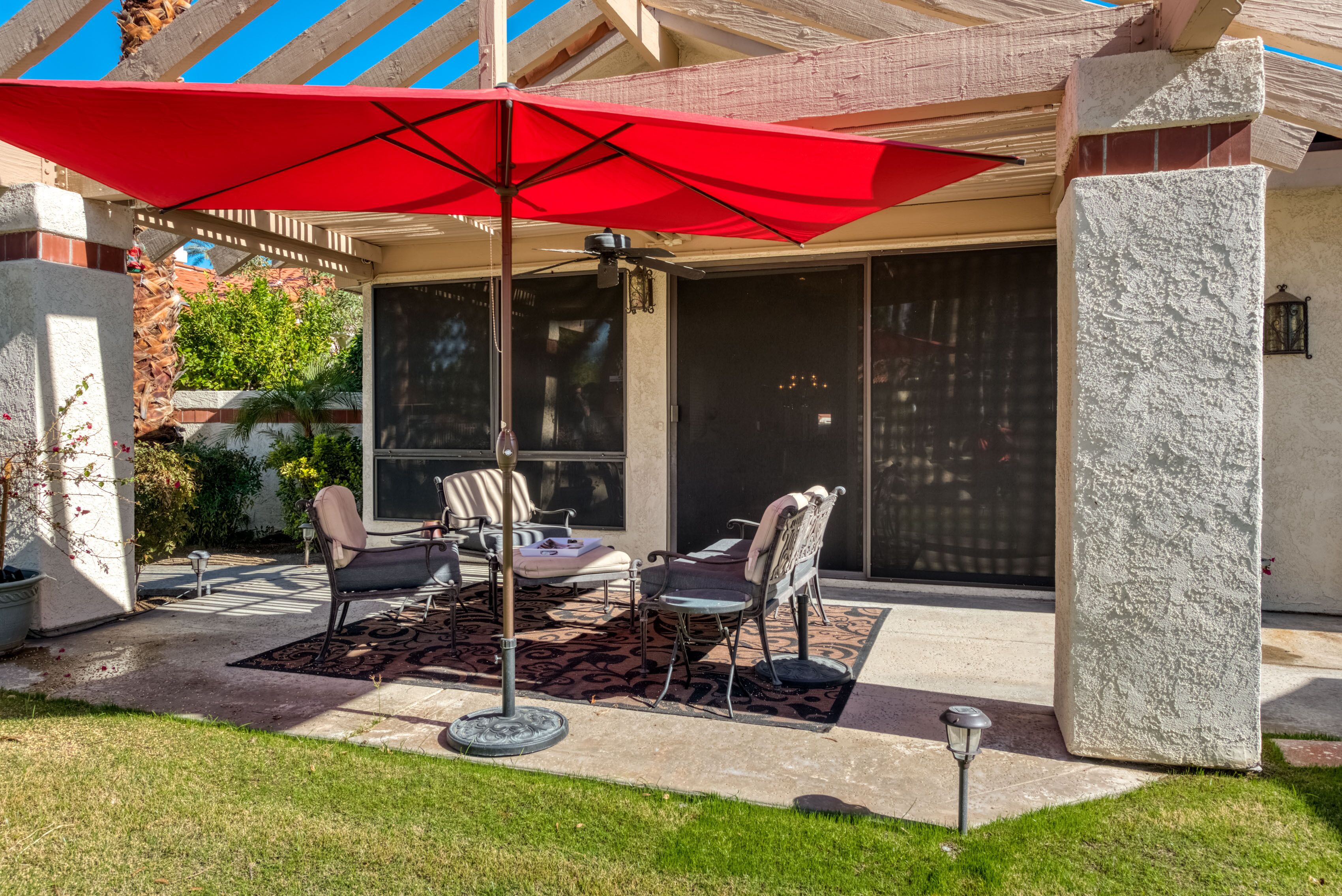 Indian Wells Pools and Streams Art Home w/ Tennis Elegant and spacious fully furnished 3 bedroom, 3 bath house located behind the gates of Los Lagos in the prestigious city of Indian Wells. The property sits steps from the year round heated pool and jacuzzi and a very short scenic walk through meandering streams and waterfalls to the tennis and pickleball courts. The house has a wet bar, 3 Sonos speakers, 2 fireplaces, and 5 flat screen TVs. In close proximity to El Paseo, Palm Springs, Indian Wells Tennis Gardens, and other area attractions.Entire home including two car garage is available for your next desert vacation! There are three bedrooms all with Smart TVs and the following bed setup: Master has a king mattress with large closet and private bathroom featuring a shower, oversized tub, and double vanity. Master has a 60" LG Smart TV and a private exit to the outdoor pool patio and pool areas. Bedroom #2 features a king mattress with closet and a 50" Vizio Smart TV. Bedroom #3 features a two extra-long twin beds pushed together as a king configuration along with a 50" TCL TV. Bathroom #2 features a shower/tub setup. Bathroom #3 has a shower. Living room features tall cathedral ceilings, an atmospheric fire place, comfy sofas, a game desk, 3 Sonos speakers, and a 60" Samsung Smart TV. It also has views of the pool area, indoor dining table, and kitchen in the open floor plan. Nice chess and backgammon sets are available for guest use and fun. High speed w-ifi internet and basic Spectrum cable are included. The den facing the street has a gas fireplace and 40" TV along with comfy sofa and reading chair. Kitchen is modern and well stocked with drip coffee maker, nespresso coffee maker, microwave, dishwasher, disposal, blender, warming drawer, pots, pans, glasses (wine, mugs, cups), plates, bowls, oven, stove, utensils, silverware, fridge with ice in door with water dispenser, extra fridge in garage, cooking basics: oil, salt & pepper. Many more kitchen items provided not listed. Guest starter kit includes coffee, dishwasher detergent, dish soap, shampoo, conditioner. Indoor dining room table seats eight. There is a large granite work desk between the kitchen and den with a printer. Side outdoor patio area features a propane BBQ grill island with small fridge and three tables with chairs for outdoor dining. There are tables and lounge chairs outside of the living and master rooms for morning coffee or laying out on a towel in the warm sun. Two car garage and washer/dryer are available for guest use. Ironing board and iron in garage.Log Lagos contains four tennis courts with night lighting, two paddle ball courts, pool, jacuzzi, and walking paths along meandering streams and lagoons.