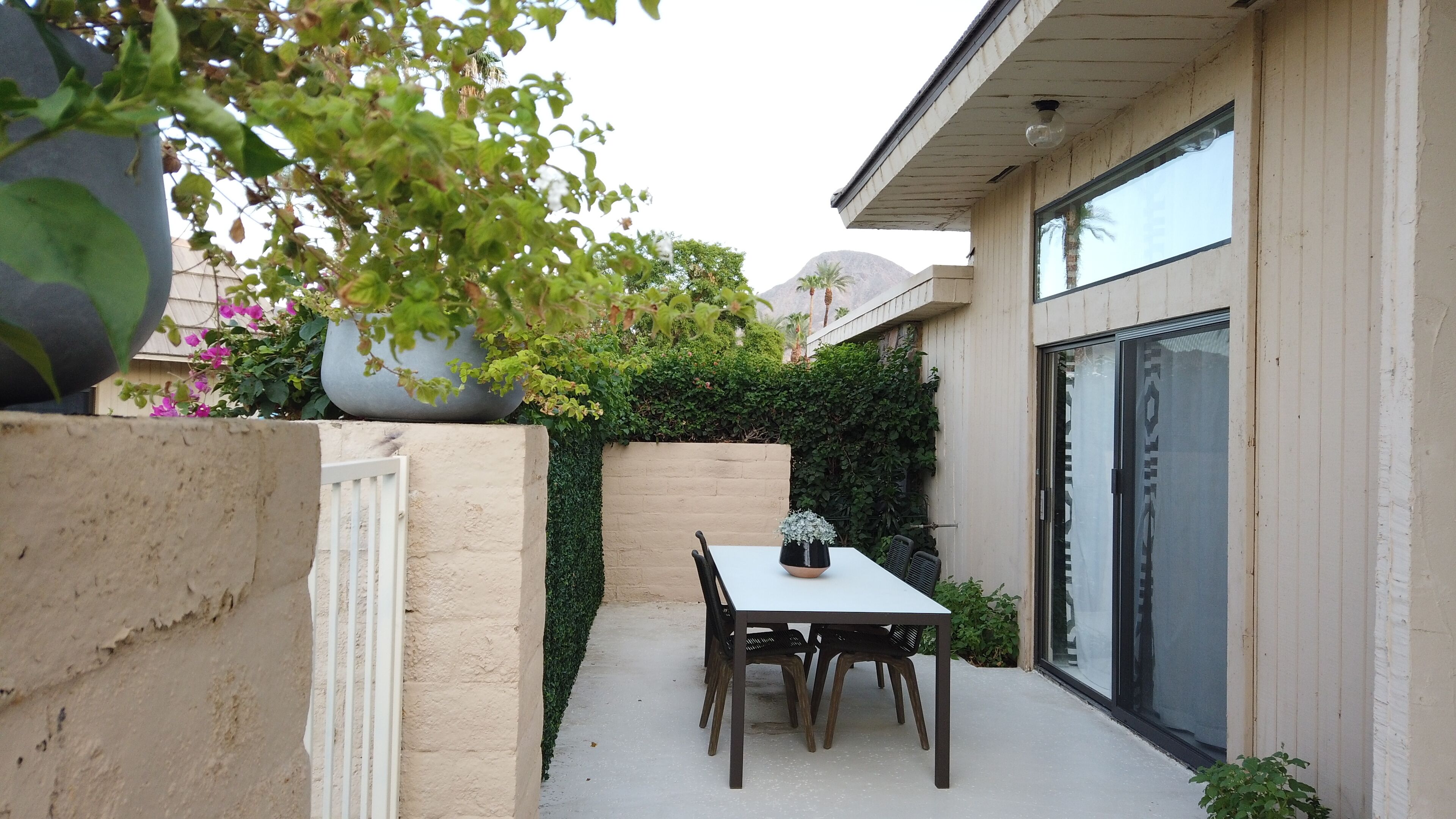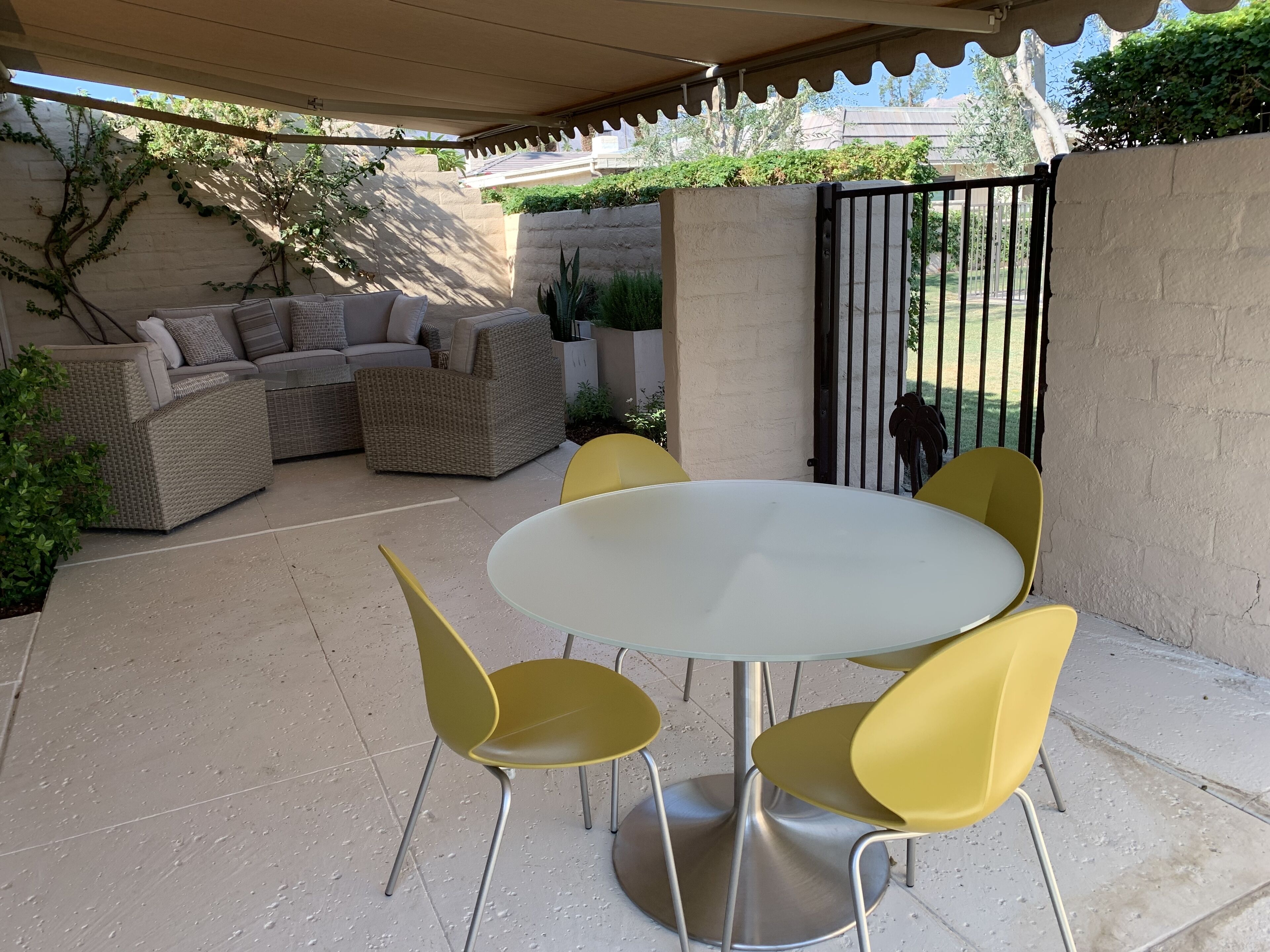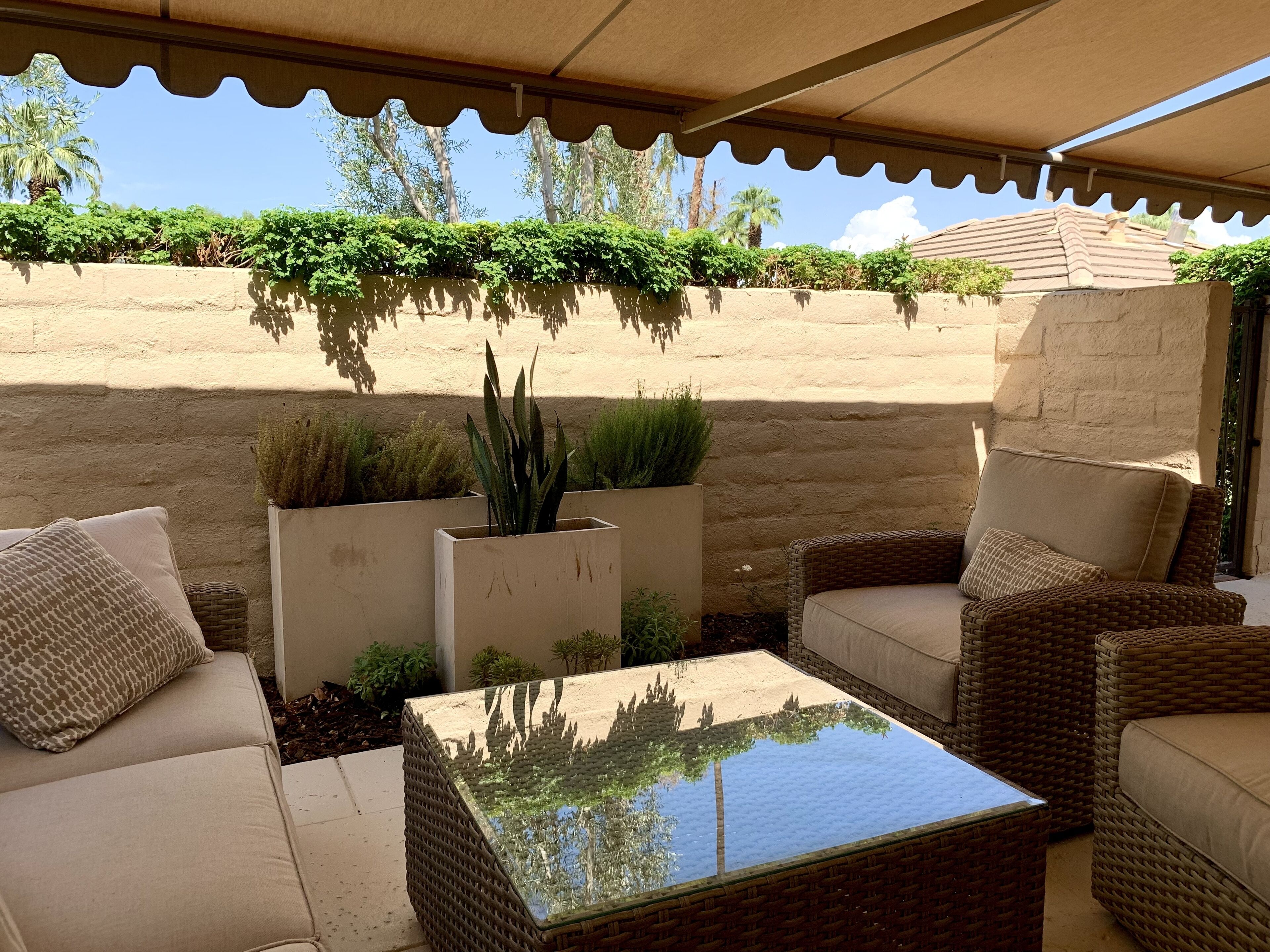 Enjoy the charms of La Rocca The condo is located in the quiet, private community of La Rocca. The small enclave of condos embraces green space created by a 9 hole par 3 course at it's heart. Mountain views enchant.An open floor plan and comfortable furnishings make this an easy living, relaxed, single floor home. Grab a bottle of wine from the wine fridge and sip a glass in your favorite chair - indoors or out. Kitchen has everything you need if cooking is your thing. Enjoy breakfast in the cozy nook. Gather your friends for a diner party - indoor or alfresco, there is seating for 6. Embrace the California weather in the privacy of your indoor atrium or out on the wrap around patios. There is a retractable awning to give you just the amount of sun you desire. Steps from the back patio and you are at one of 6 pools. Tennis courts, shuffle board and the golf course will keep you active and entertained.An expansive owner's suite offers king sleeping, a desk for office tasks and a sitting area for tv or a good book. Sliding patio doors adjoin the rear patio. The owner's en suite has a soaking tub, dual vanity and zero entry shower.The second and third bedrooms offer queen sleeping and share a hall entry bath with zero entry shower.Tech touches - wireless internet, large screen tv's, Echo speakers and a wireless laser printer.With Indian Wells as home base you can explore the Coachella Valley and more. What's nearby - shopping along El Paseo, Great golf at PGA West, hike the bump and grind trail or feast with amazing dining choices. Plan a day trip to Joshua tree or Temecula wine country.