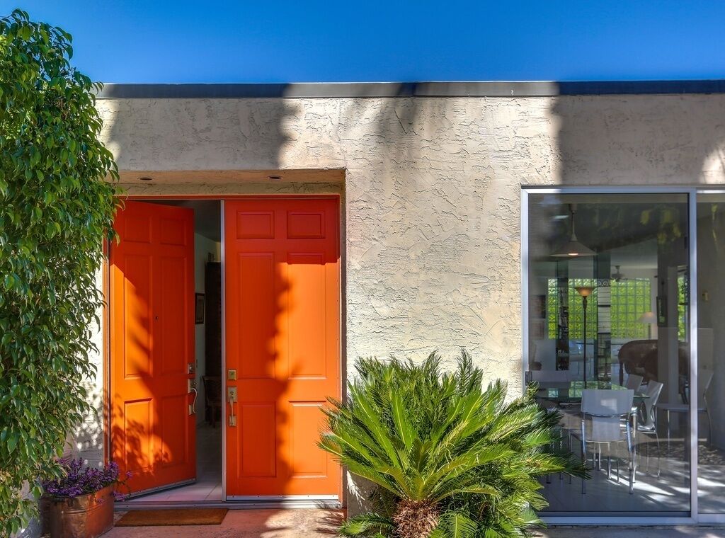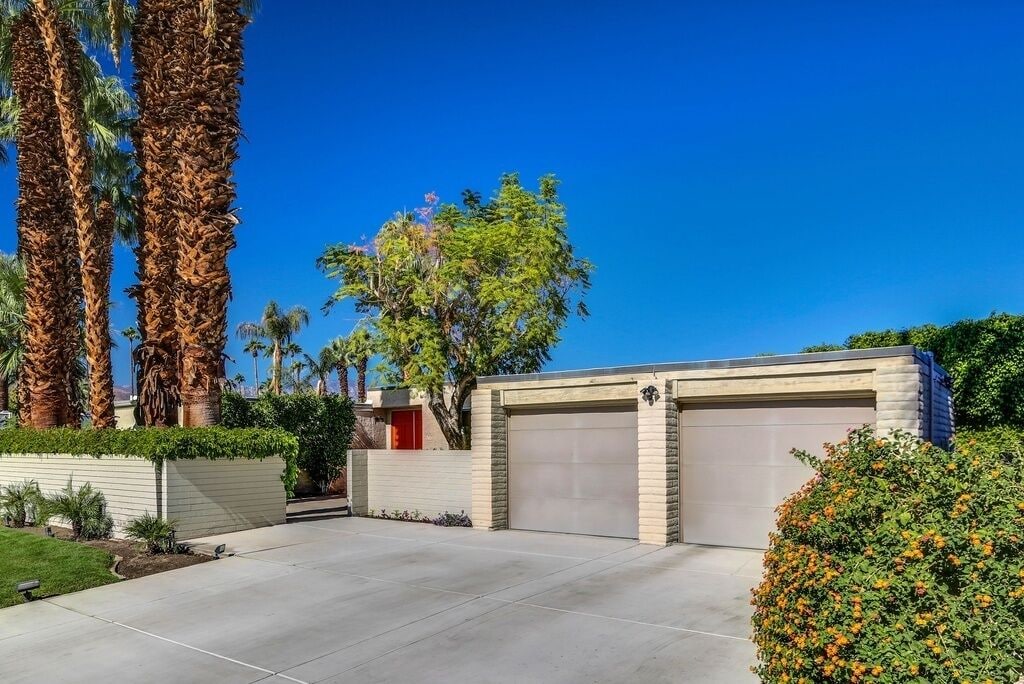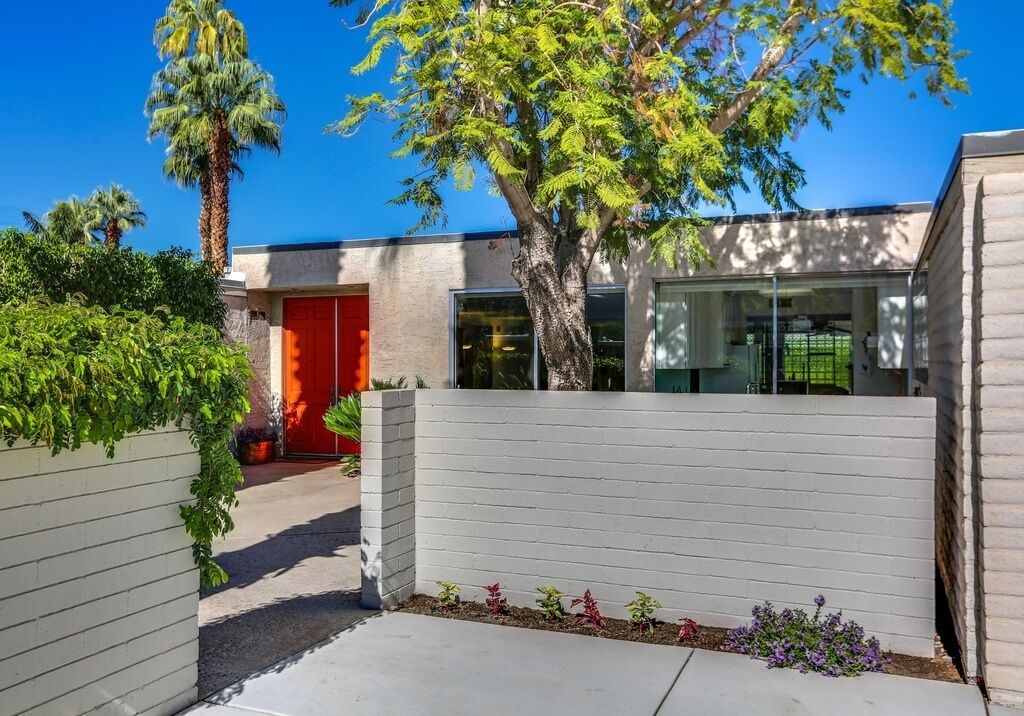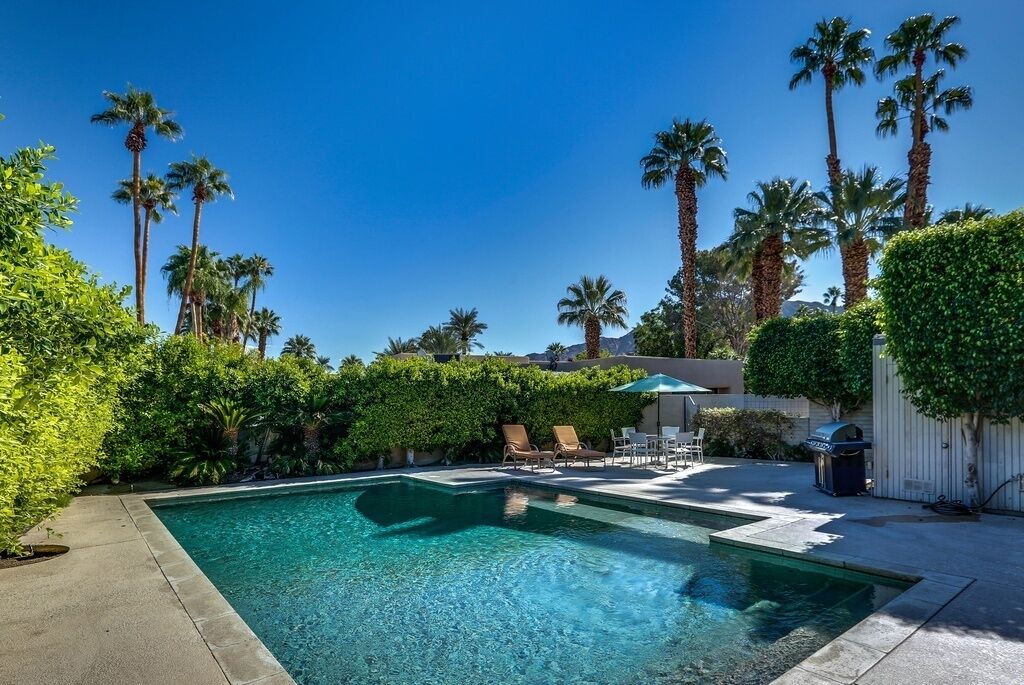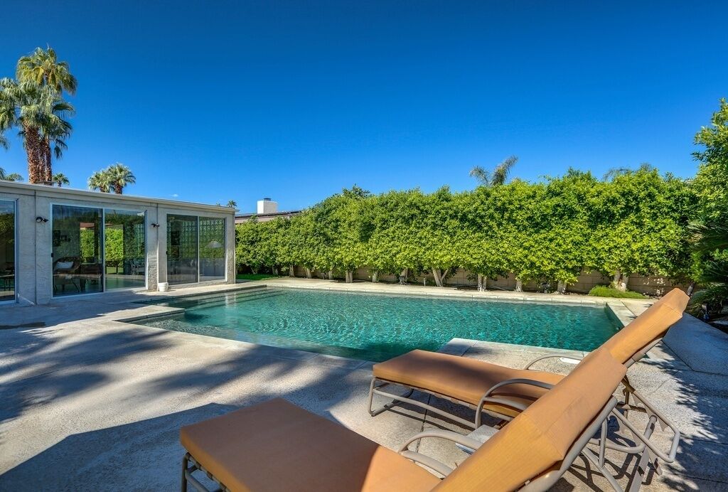 Beautiful home in Indian Wells William F. Cody designed home. The living room is filled with natural light that comes through walls of sliding glass doors and glass bricks. The patio and PebbleTec pool add to the serenity of the property. The fireplace is surrounded by floor-to-ceiling mirrors. White tiled floors extend into the dining area and kitchen, both of which have lovely views of Mt. Eisenhower. Two guest suites, each with sliding glass doors and glass brick walls that separate the bath/dressing area from the bedroom, are wonderful accommodations for guests. The Master Suite is enhanced by views of Mt. Eisenhower and the Cove Mountains. Double doors open to a remarkable walk-in closet with adjustable hanging rods & shelves and a massive built-in center dresser. The Master Bath features double basins, a white-tiled sunken tub, and a separate shower. Additional features include a laundry room, two-car garage, and grassy backyard.