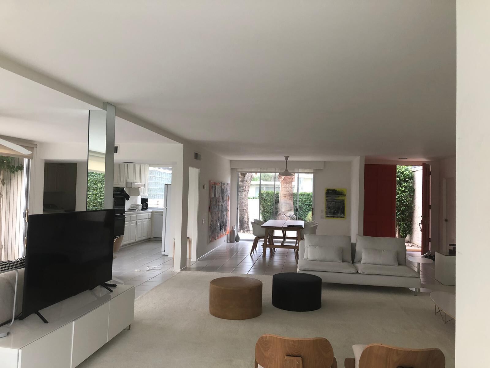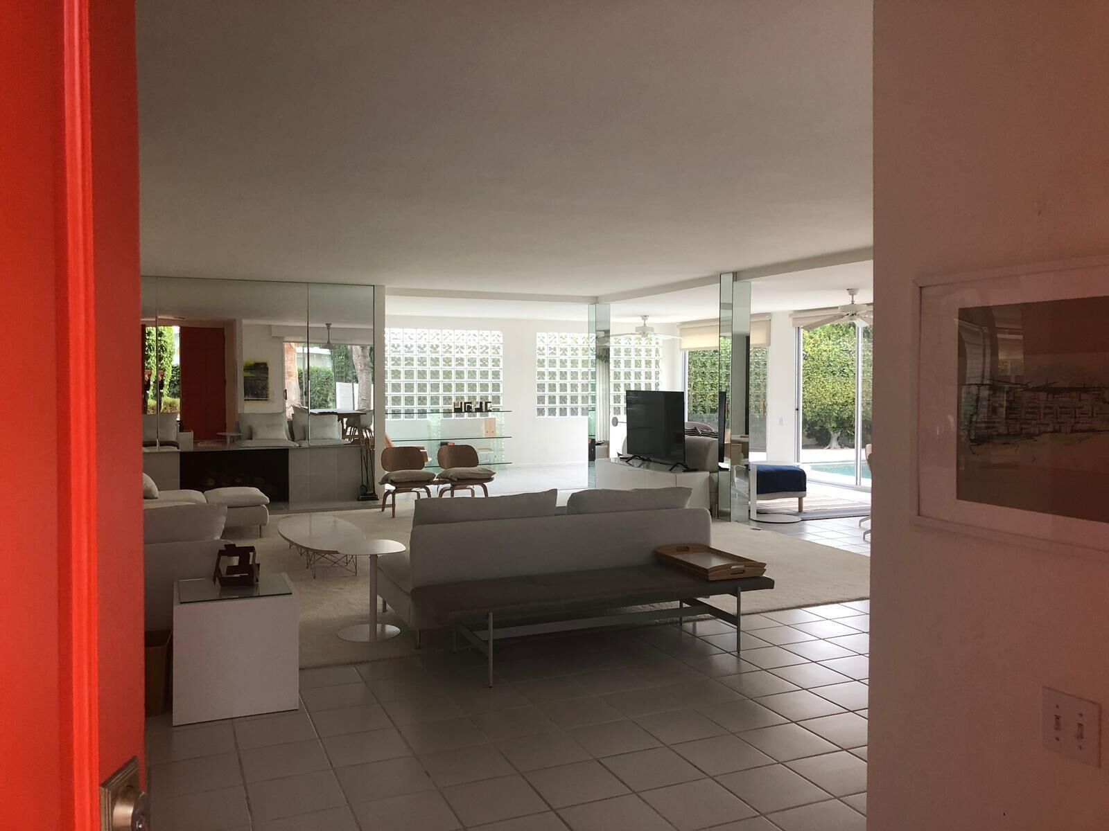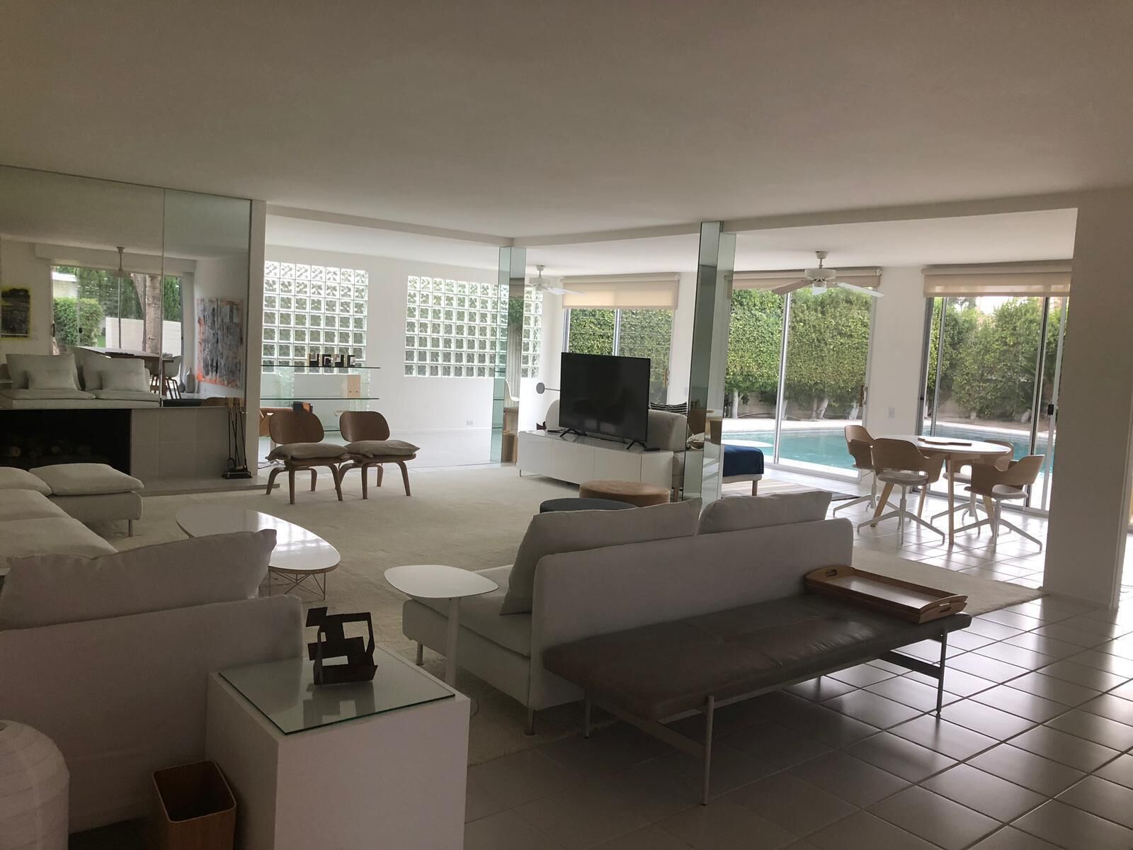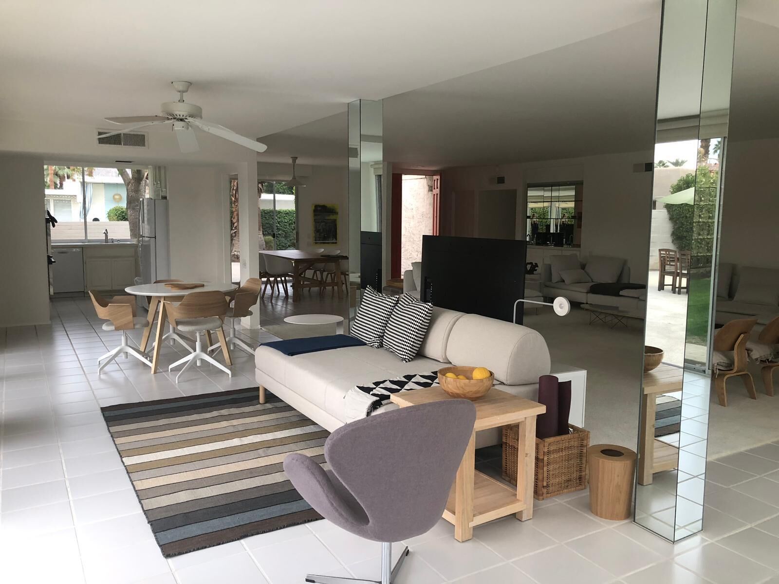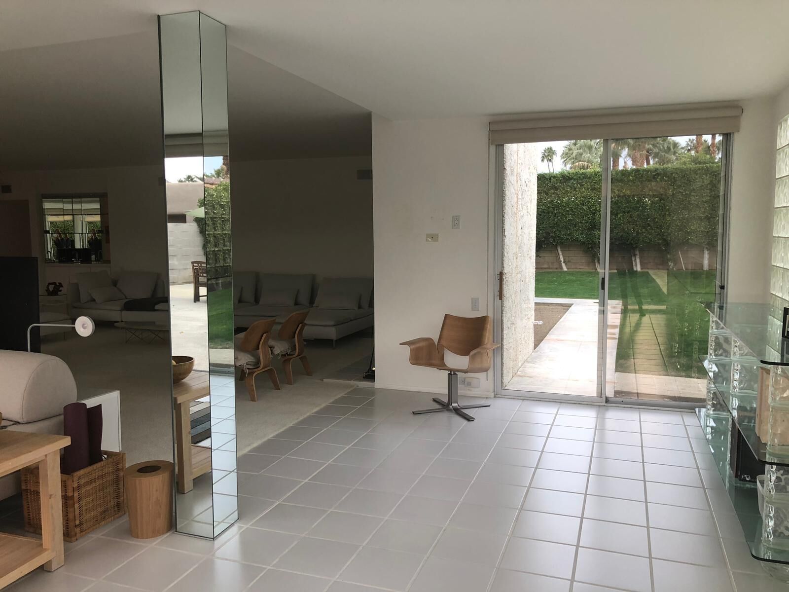 Beautiful home in Indian Wells William F. Cody designed home. The living room is filled with natural light that comes through walls of sliding glass doors and glass bricks. The patio and PebbleTec pool add to the serenity of the property. The fireplace is surrounded by floor-to-ceiling mirrors. White tiled floors extend into the dining area and kitchen, both of which have lovely views of Mt. Eisen...