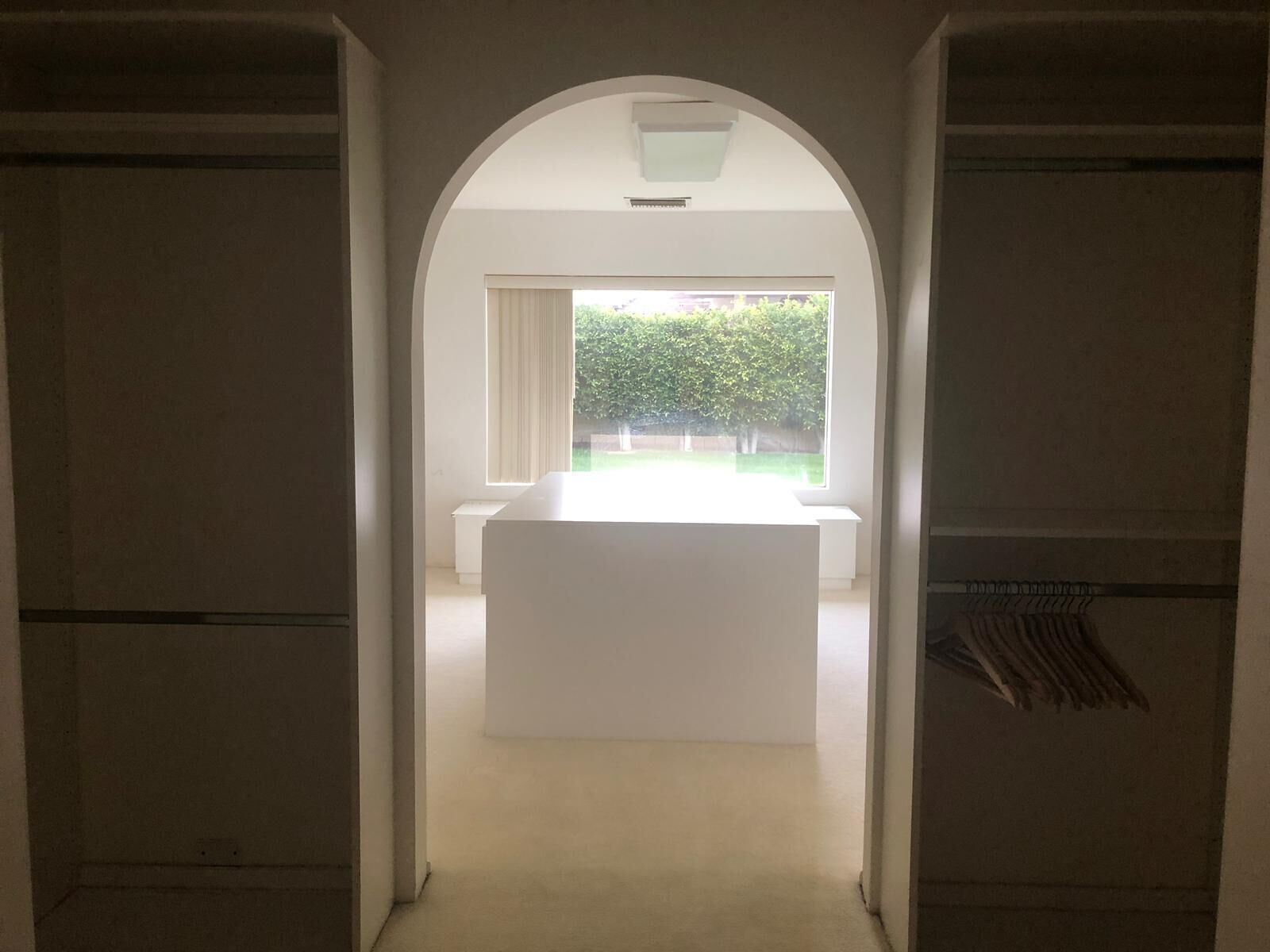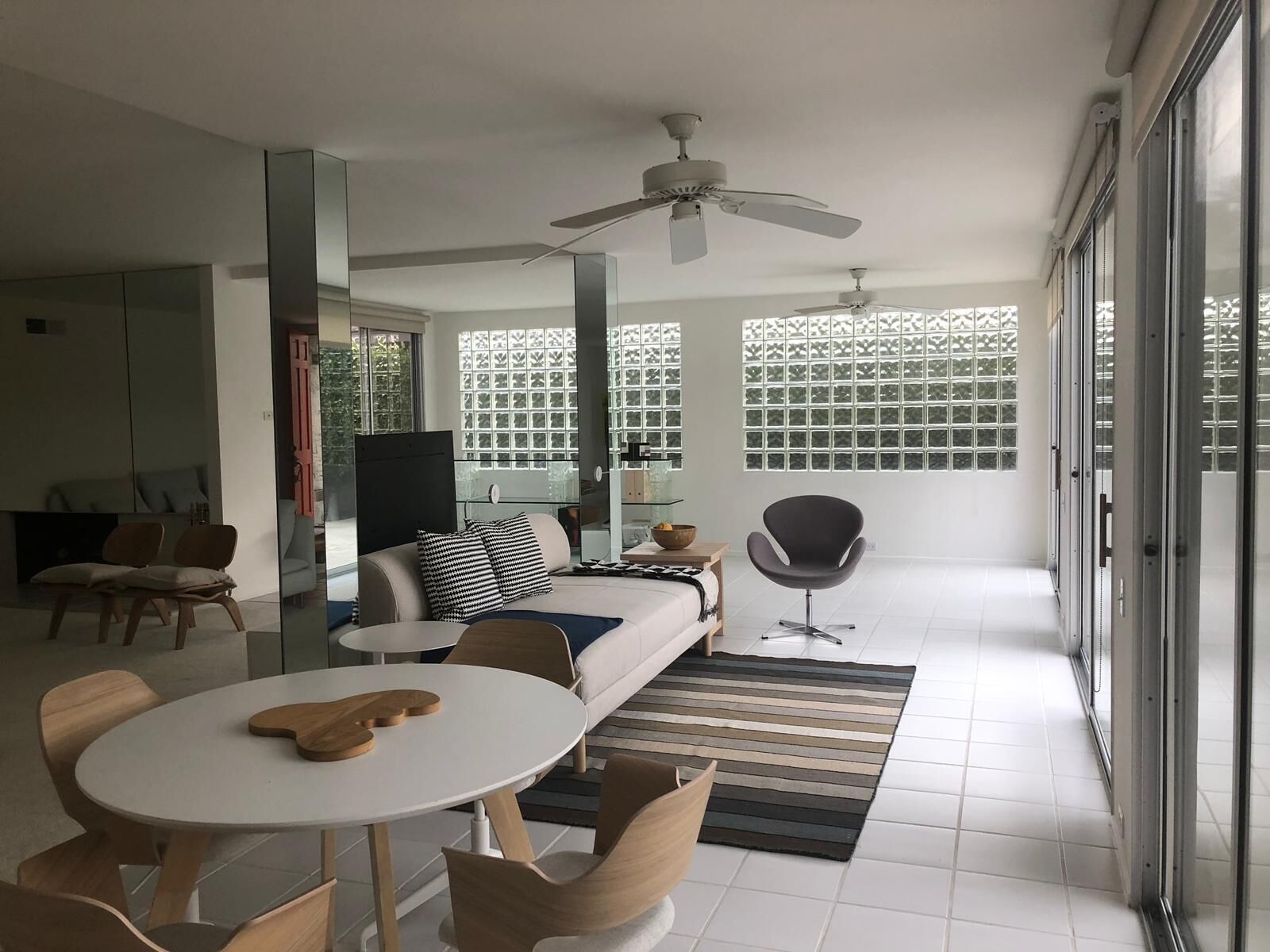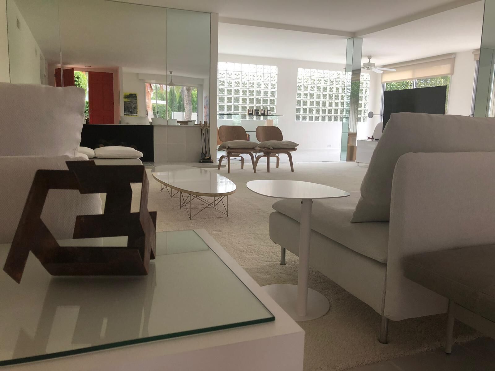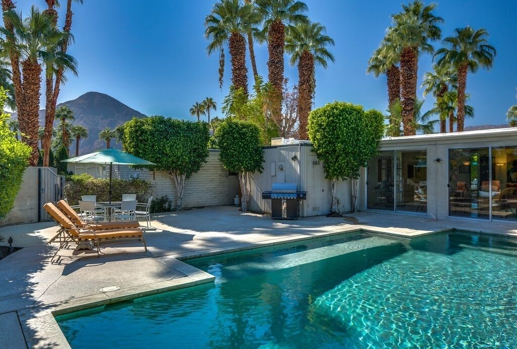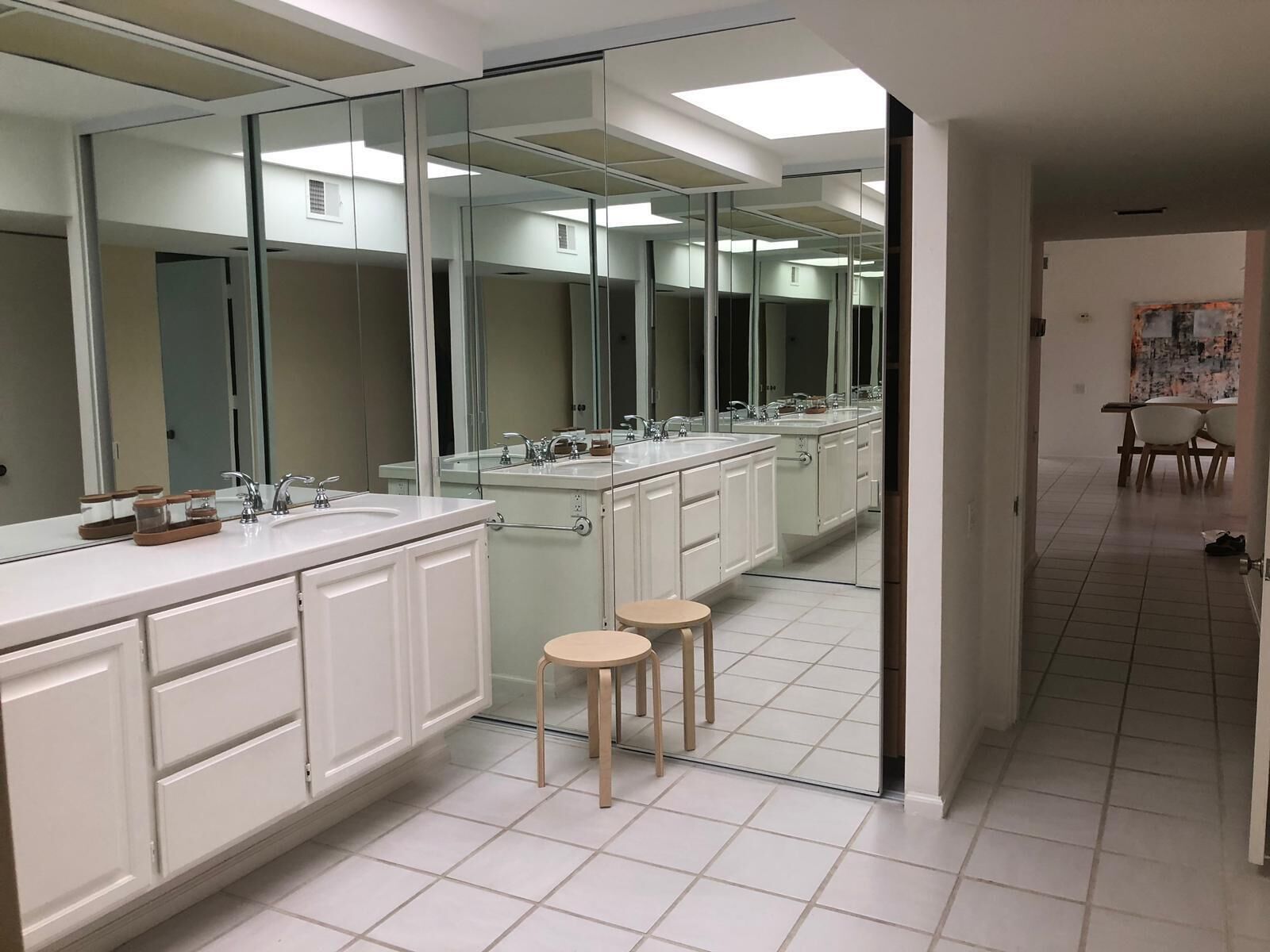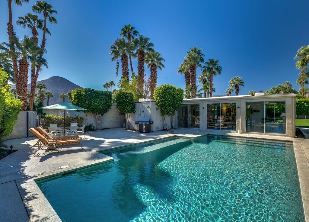 Beautiful home in Indian Wells William F. Cody designed home. The living room is filled with natural light that comes through walls of sliding glass doors and glass bricks. The patio and PebbleTec pool add to the serenity of the property. The fireplace is surrounded by floor-to-ceiling mirrors. White tiled floors extend into the dining area and kitchen, both of which have lovely views of Mt. Eisen...