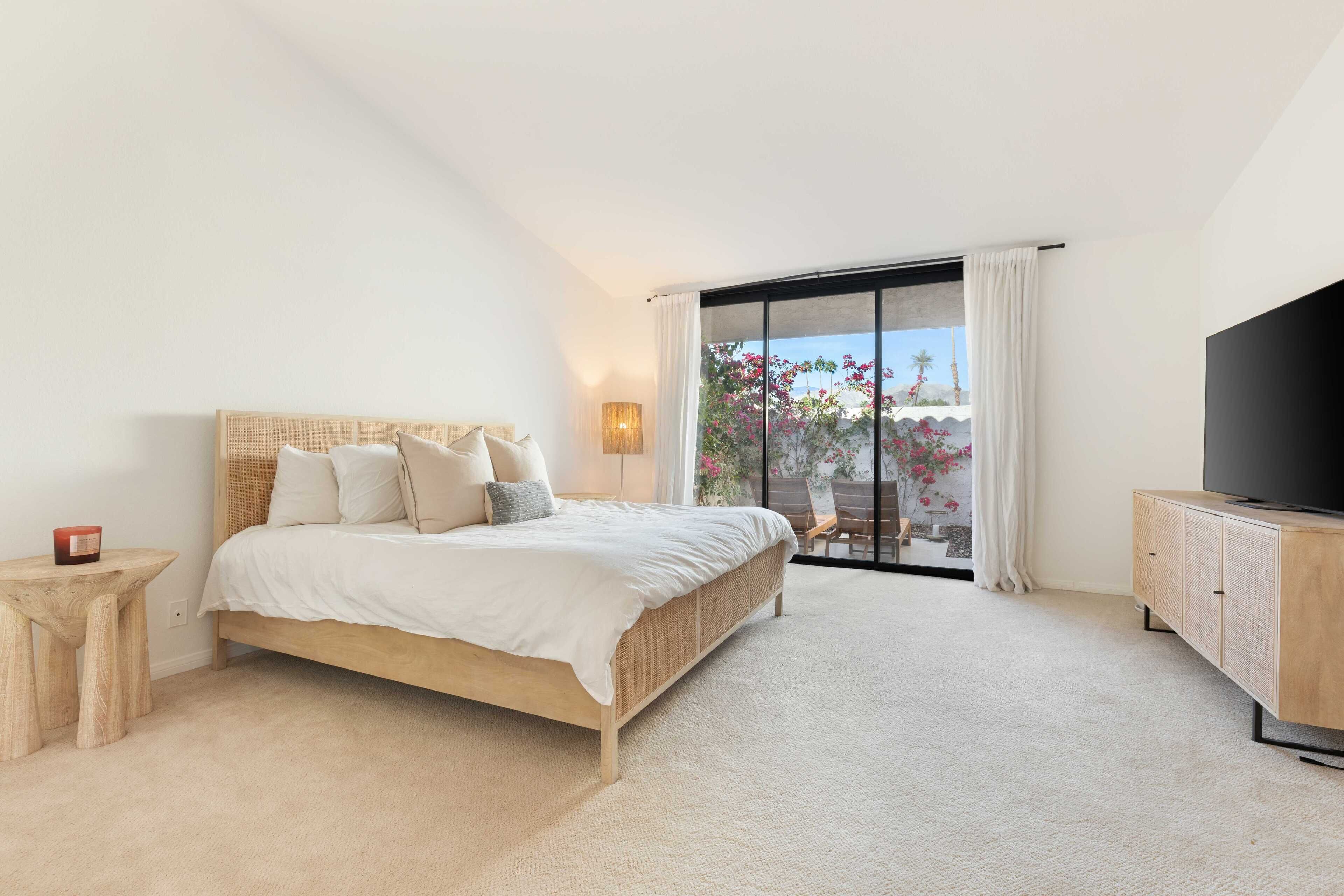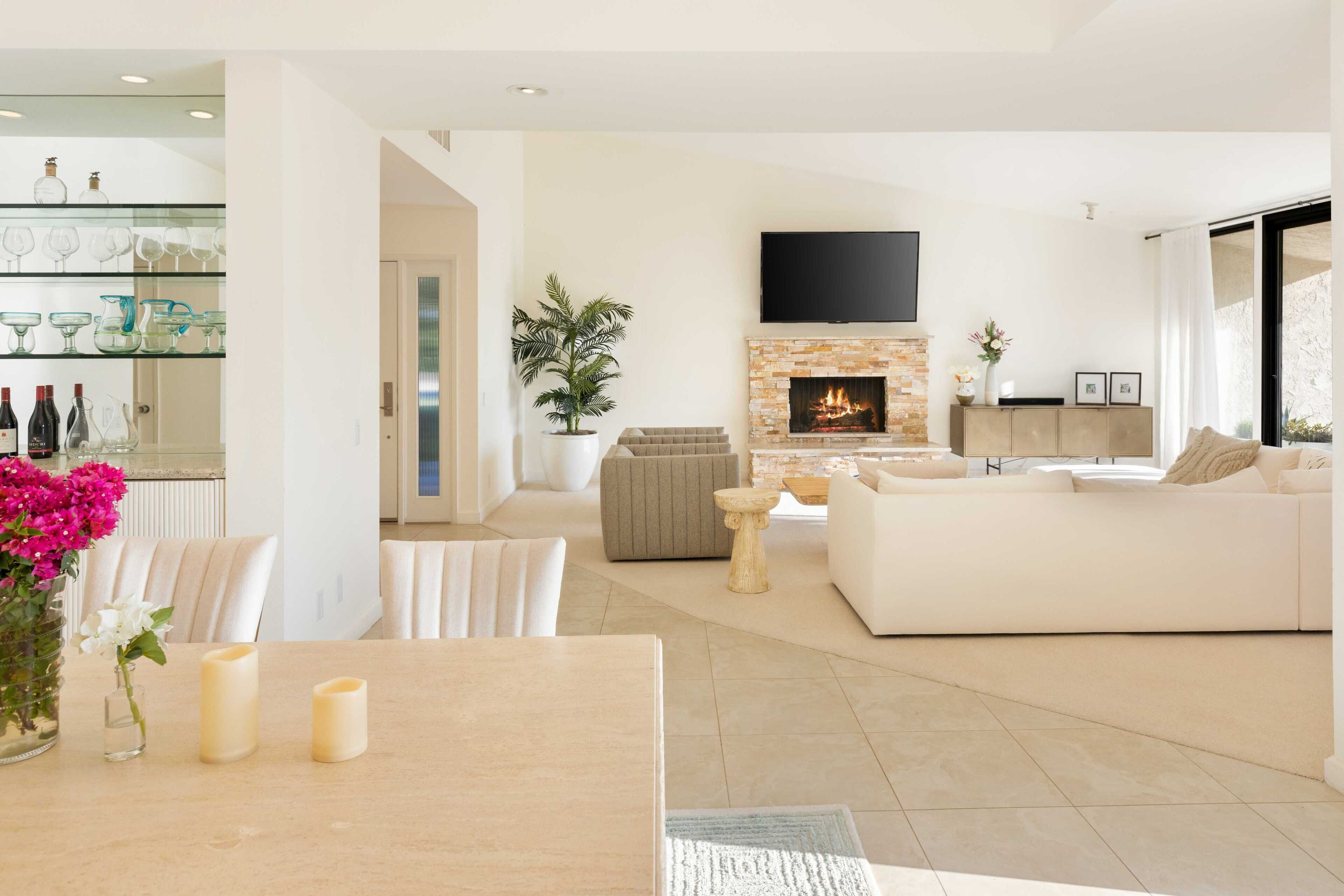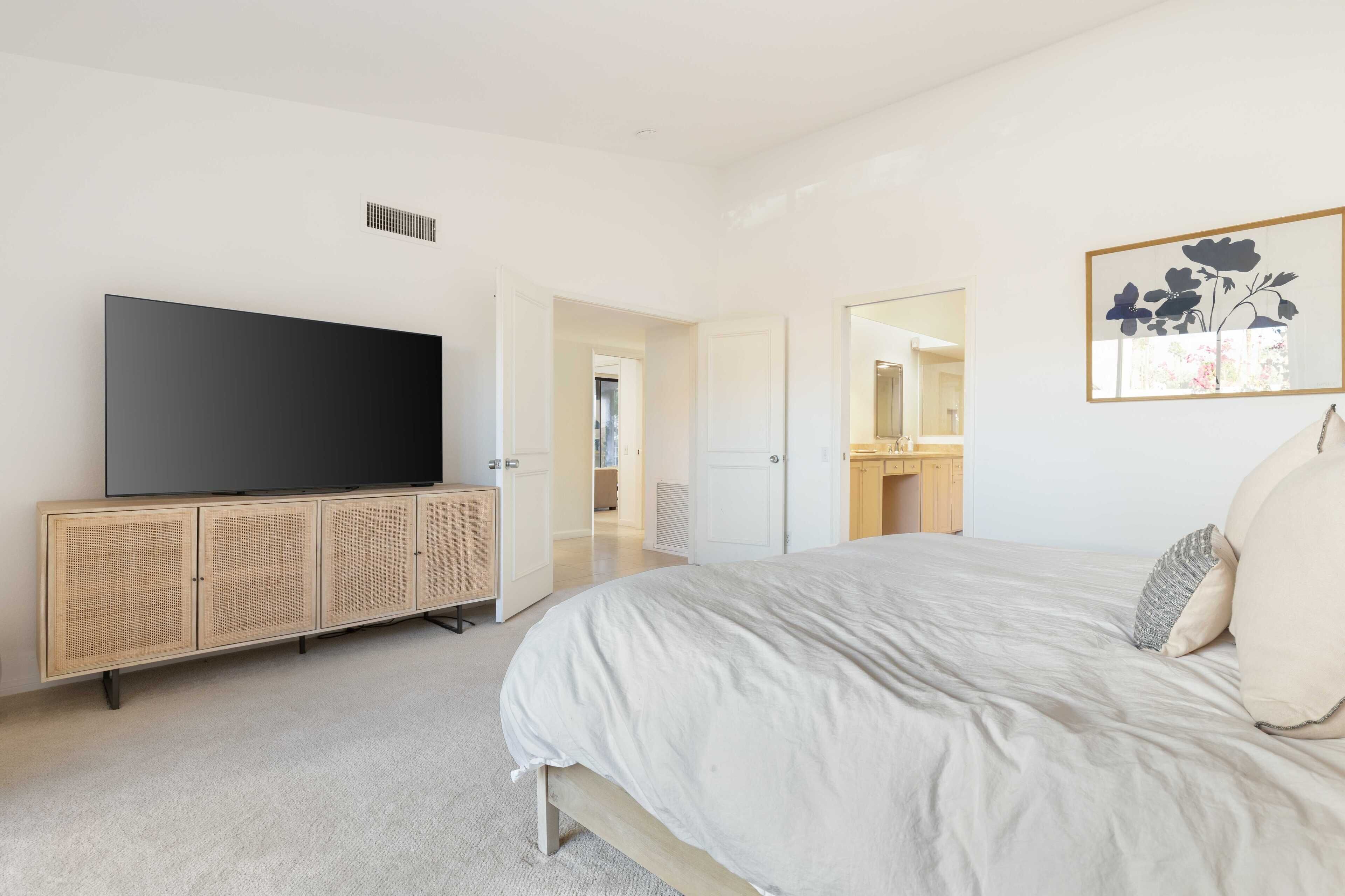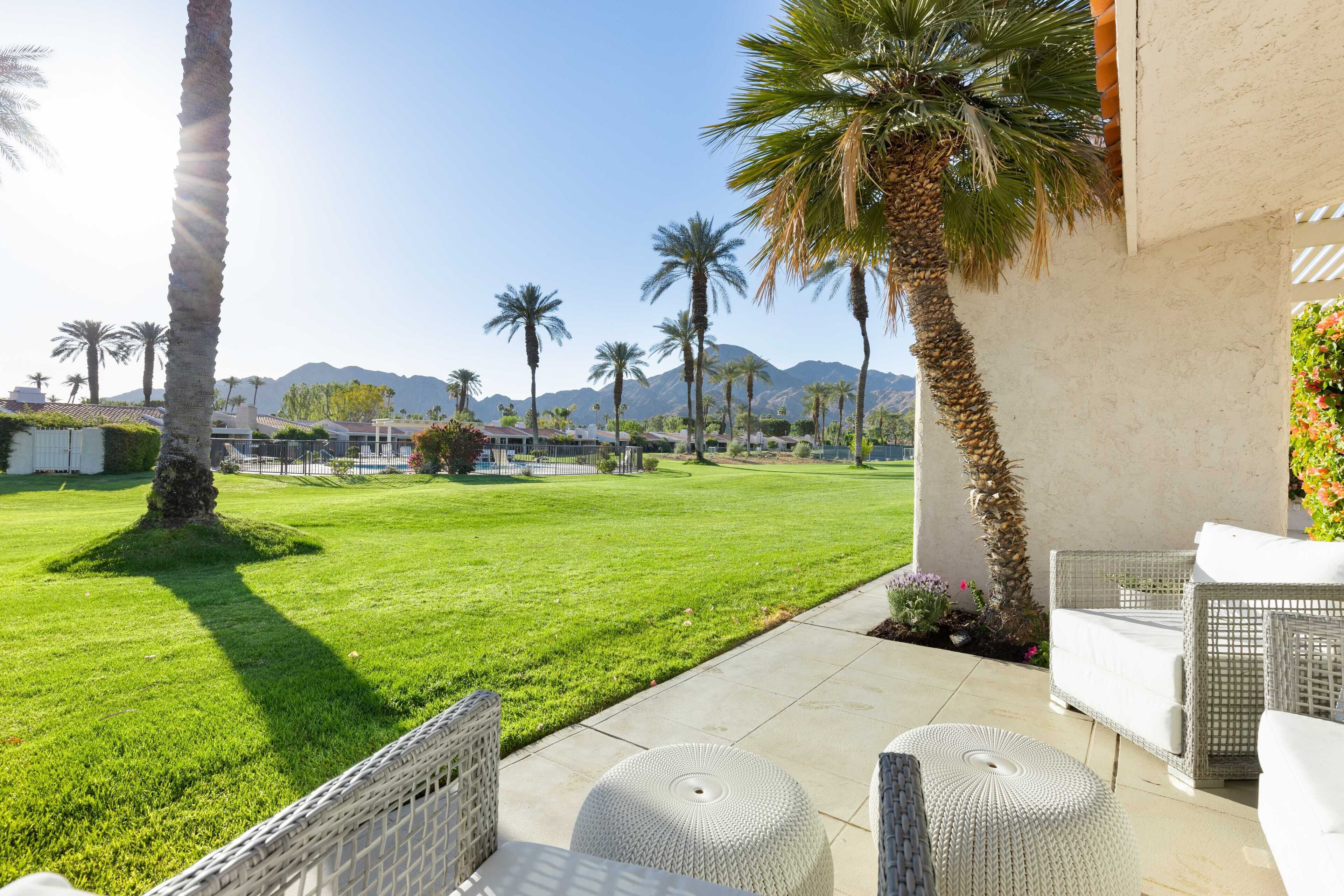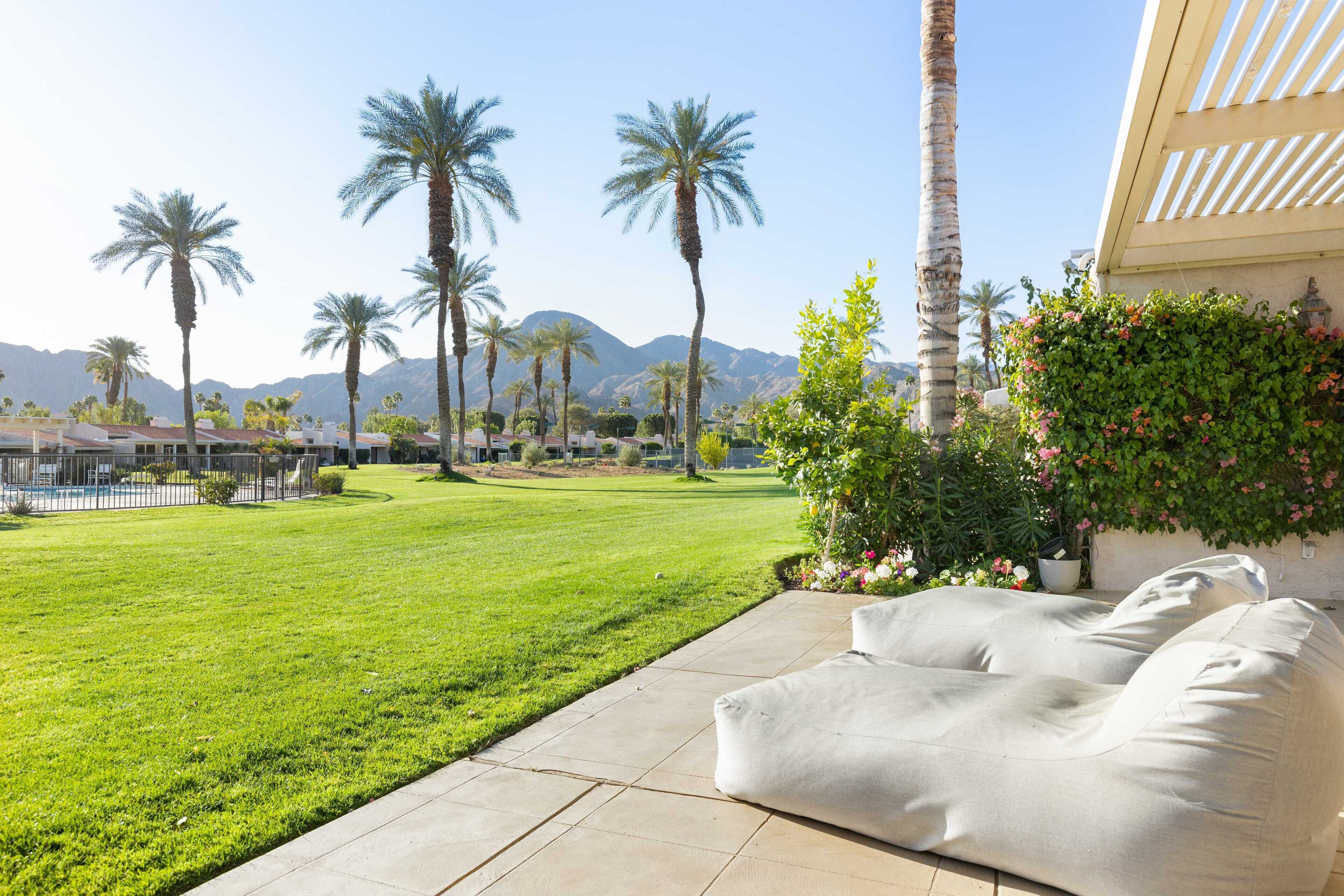 3 Bedroom Home in Indian Wells w/ Pools & Tennis Courts Located in the heart of Indian Wells, this spacious 3 bedroom, 3 bathroom home is the perfect place to relax and recharge in a community with multiple pools and tennis courts.The community features multiple pools and tennis courts, and is situated just minutes away from El Paseo shops, Indian Wells Tennis Garden, and multiple golf clubs.The spaceThe home features 3 bedrooms and 3 full bathrooms. Each bedroom enjoys its own en suite full bathroom, allowing for plenty of privacy. Each bedroom also has its own access to a patio area (the primary suite enjoys its own patio).The home's living room and dining area are spacious and light filled, with tall ceilings and neutral tones. It's the perfect place to lounge and relax. The living room also features a large flat screen TV (no cable, but you can sign into Netflix, HBO and other streaming services).The living room, dining room and kitchen are all open concept and provide access to the back back patio where you can enjoy the incredible desert view. The home makes for great indoor/outdoor living and is only steps away from one of the many community pools and hot tubs. And for those that play tennis, there are multiple tennis courts in the community to enjoy - also just steps from the back door.The back patio also features a gas grill, outdoor seating area, and 2 bean bag lounge chairs that are the best place to enjoy a cocktail or coffee.The kitchen is stocked with cooking utensils and equipment plus a Keurig for those that make coffee at home.Bedroom #1: The primary suite has a king bed with premium mattress, en suite bathroom with dual sinks and large shower, and an oversized walk in closet. The primary bedroom also has a large flat screen TV and a nice private patio with chaise lounges, misters, and is accented with beautiful pink bougainvillea plants.Bedroom #2: The guest bedroom pays homage to the fun Palm Springs vibe, with tastefully vibrant wallpaper and a stunning rose colored sofa. The bedroom also has a king bed with premium mattress and has an en-suite bathroom. All our guests have complimented how wonderful the shower is in this bathroom! The bedroom also overlooks a patio with a charming tree that attracts all the hummingbirds... you're sure to see a few if the weather is right!Bedroom #3: The third bedroom can function as an office space or bedroom. It features a premium pull out sofa from West Elm, a beautiful desk, and clothing rack with storage for all of your outfits and personal items. This bedroom/office also has an en-suite bathroom with spacious countertops, oversized mirror, and a shower with tub. The home has a 2 car garage plus driveway parking.