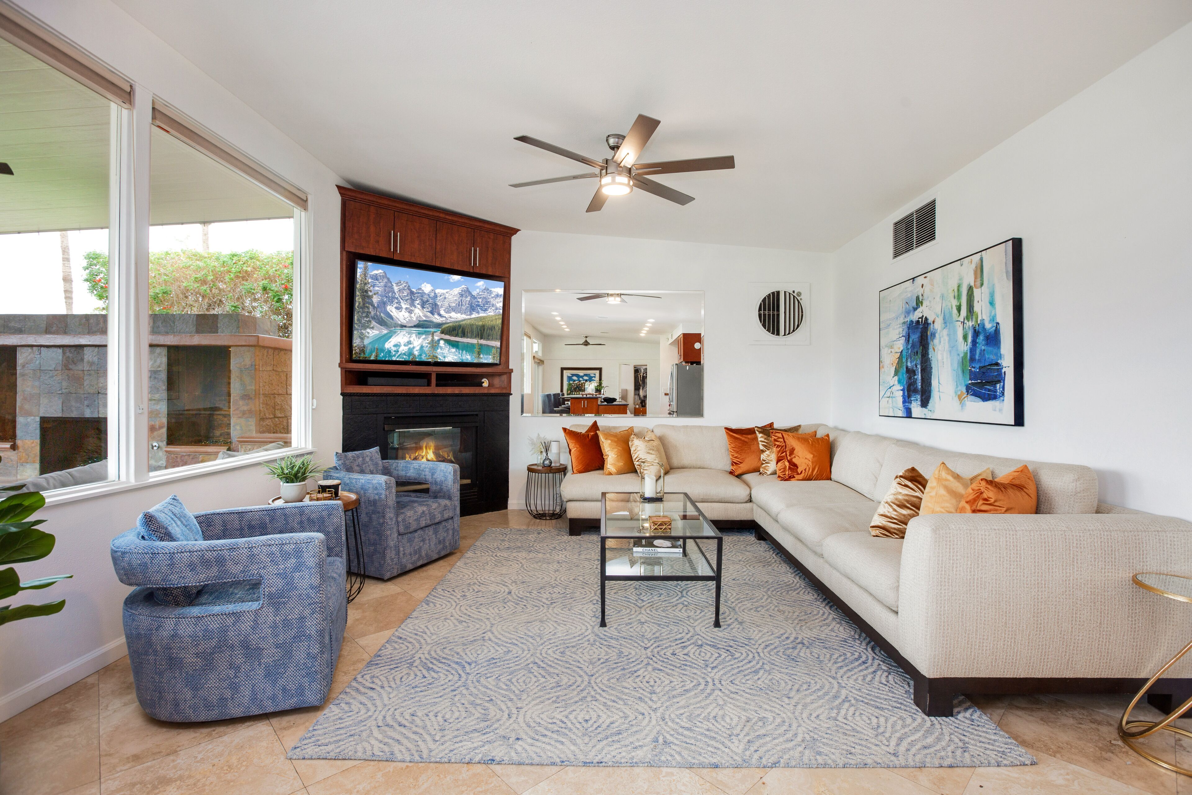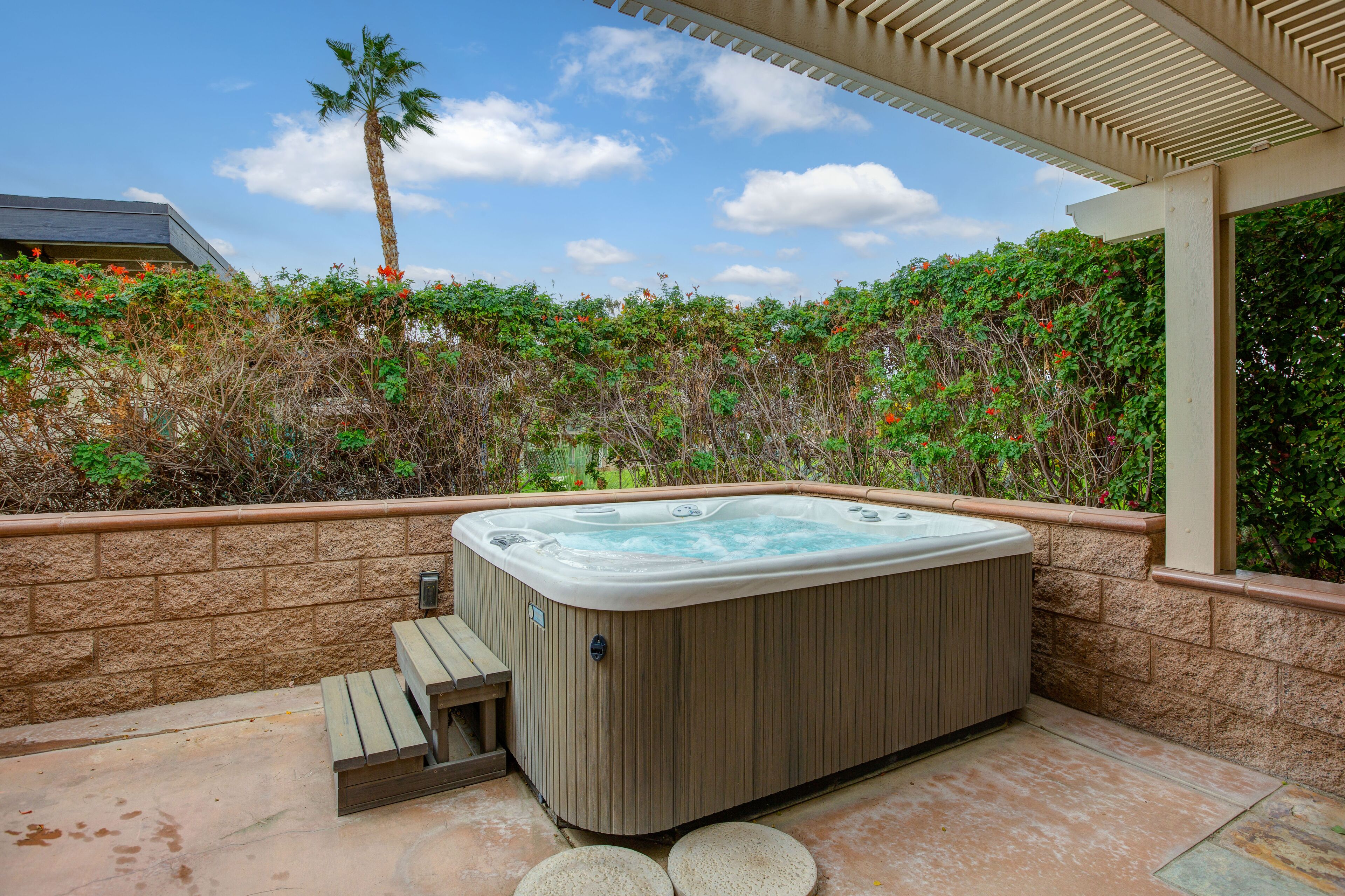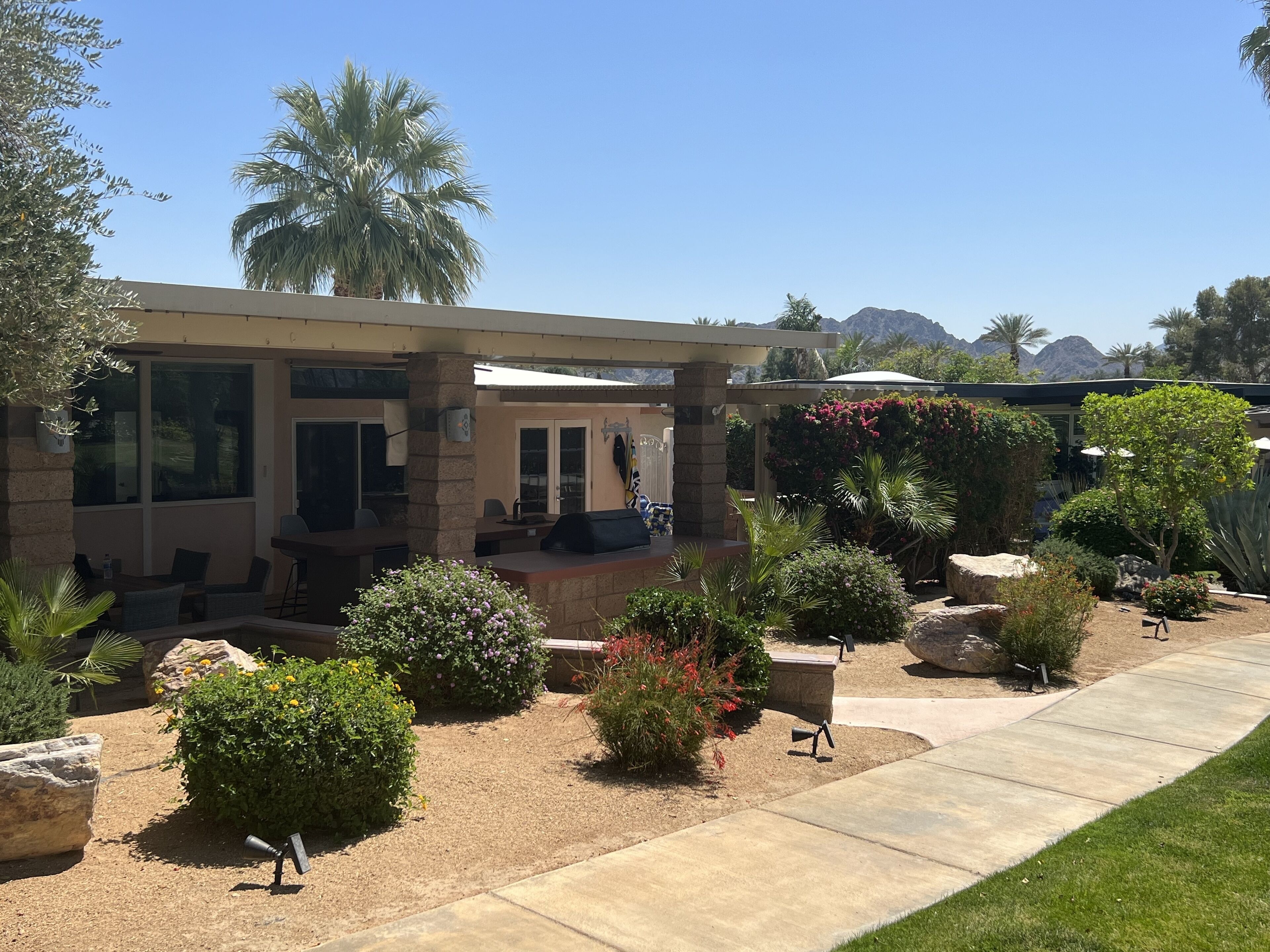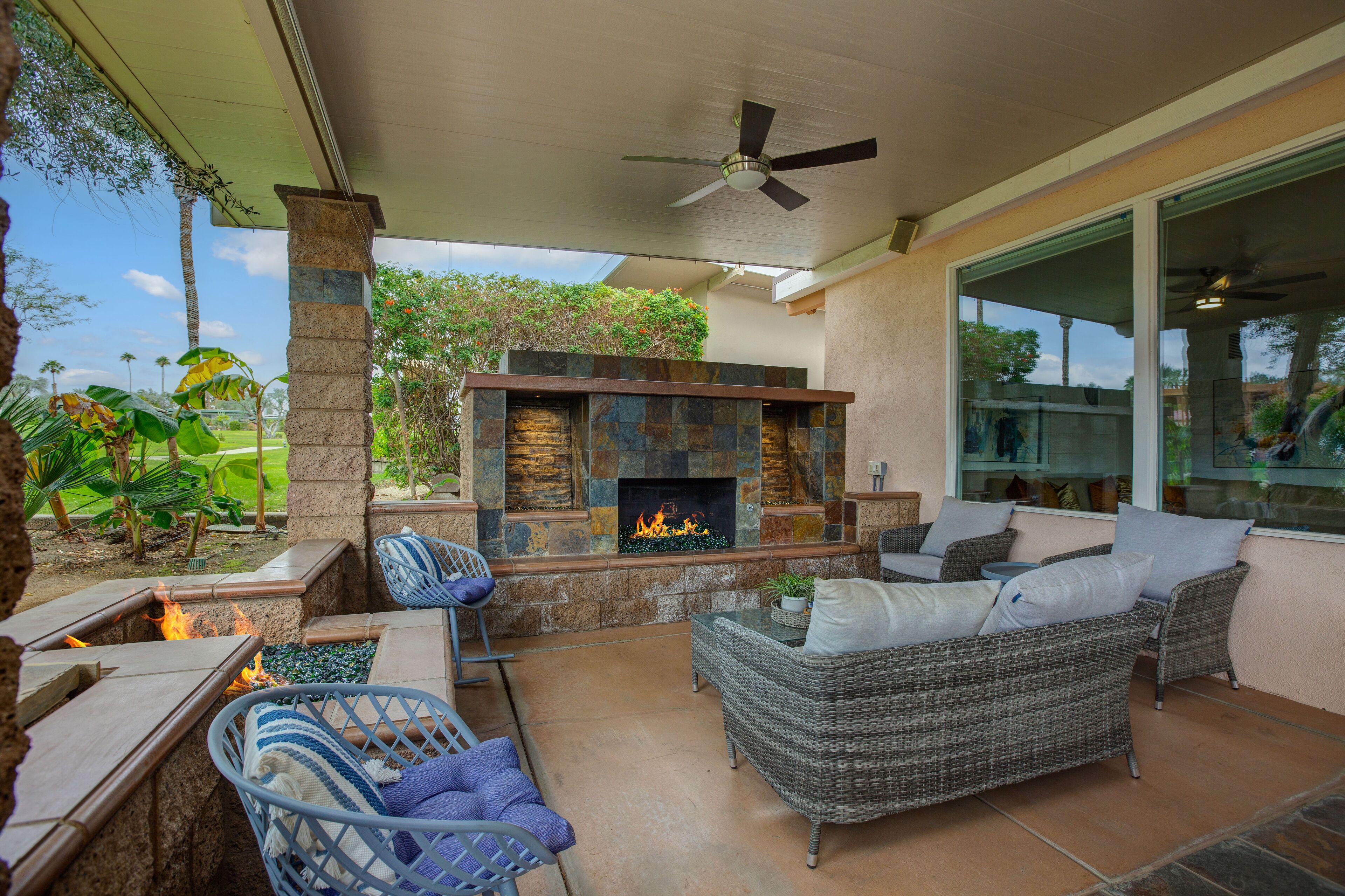 Stunning Mountain View, Entertainers Patio, Pool Your Desert Happy Place! Perfect for Coachella,Stagecoach, Polo & Tennis Tournaments. Next to the Indian Wells Golf Resort and 2 blocks from the Indian Wells Tennis Garden. Event Shuttle across the street. Open floor plan with stunning views of the Mountain ranges and pool. Outdoor bar, bbq, fireplace, water feature, dining and cozy lounge area. Close to Hwy 111, world class restaurants, golf courses,tennis, grocery stores and all other conveniences. This Desert treasure had us at Hello! For Steve and I it was love at first sight. From the unique setting of this communities 24 homes surrounding a 3+ acre green belt with a sparkling pool, Volleyball court, horseshoe pit and basketball hoop. To this single story up to date fully furnished 3 bedroom 2 bath home. The 2 bedrooms and bath located on one side of the home and the Master en suite located on the other side providing the perfect balance for privacy. The Master French doors provide direct access to a private jacuzzi. The private patio is a Entertainers Dream. Featuring a gorgeous outdoor fireplace with water feature, Cozy lounge area, fire pit, built in bar with BBQ. Outdoor dining table, private jacuzzi, Misters all surrounded by gorgeous landscape and forever views. The family room is open concept with a huge yummy couch, seating for everyone, 65 inch 4k HD smart TV, fireplace and breathtaking views overlooking the green belt and mountain ranges. The Kitchen is a chefs delight featuring a 12 foot Bar, fully stocked and equipped with state of the art appliances. Wolf stove and oven, Kitchen Aid micro/convection, Bosch dishwasher. Kitchen dining area. THE SPACE- PLEASE NOTE: POOL HEATED! Community volleyball/badminton court & horseshoe pit.- Free Wi-Fi -NEW ULTRA HD/4K SMART TVS IN EVERY ROOM! Enjoy free HBO, Netflix, Roku TV and Amazon Prime Video.Permit NO. STRU-000255-2022