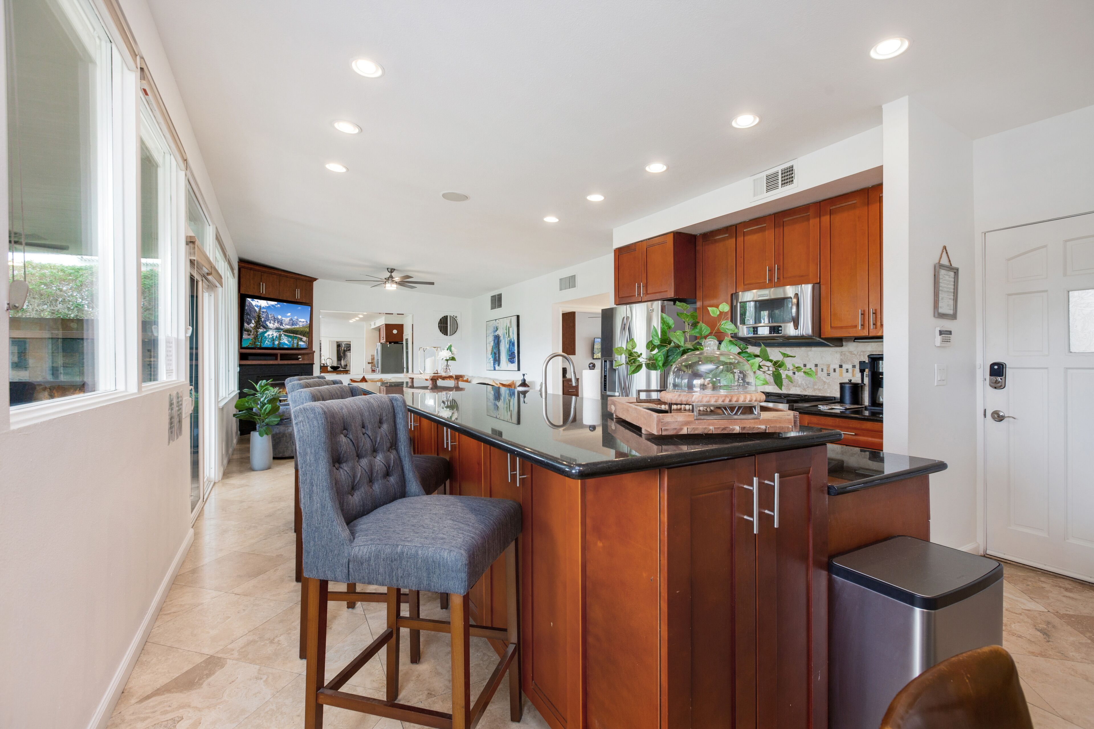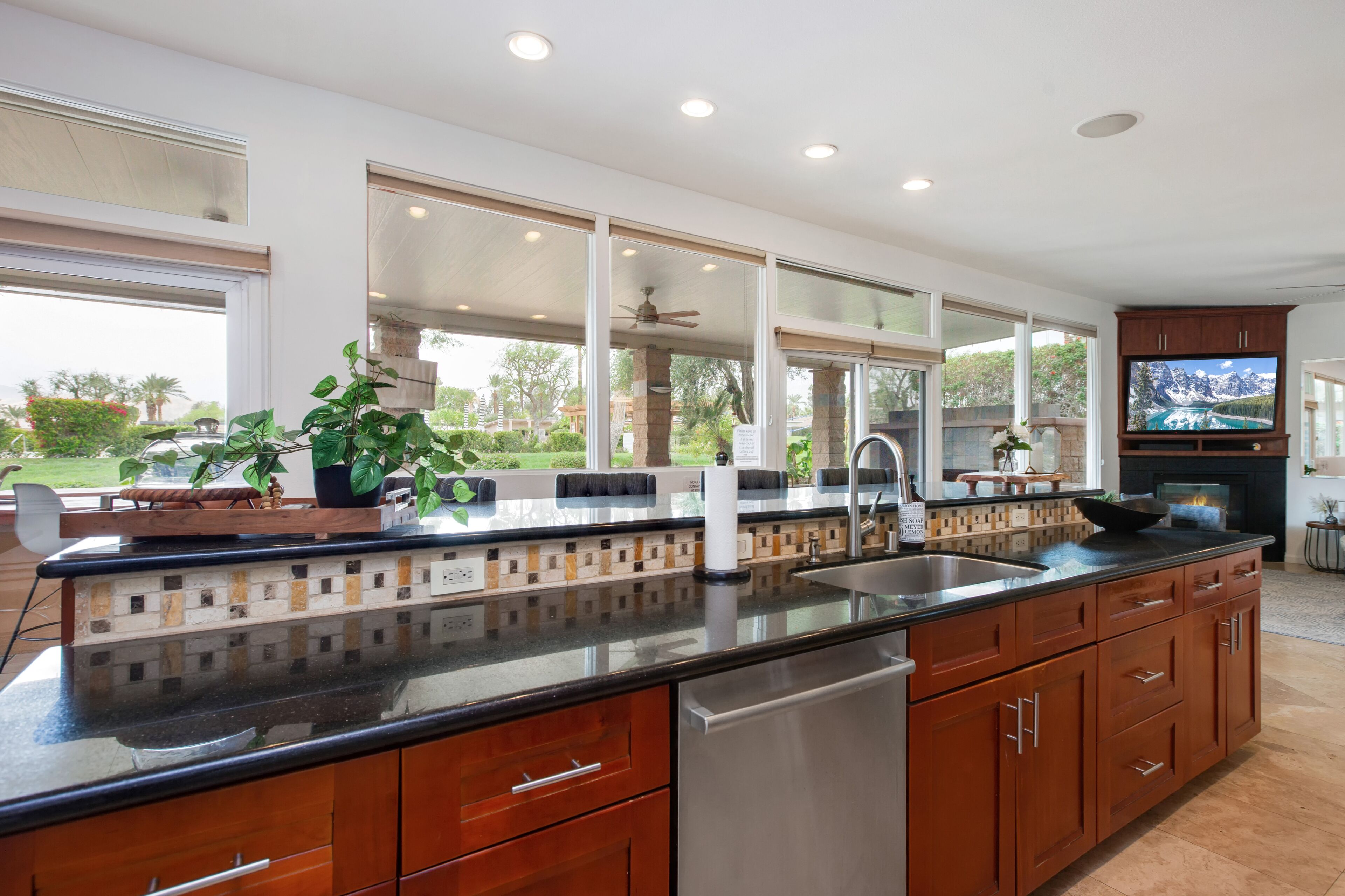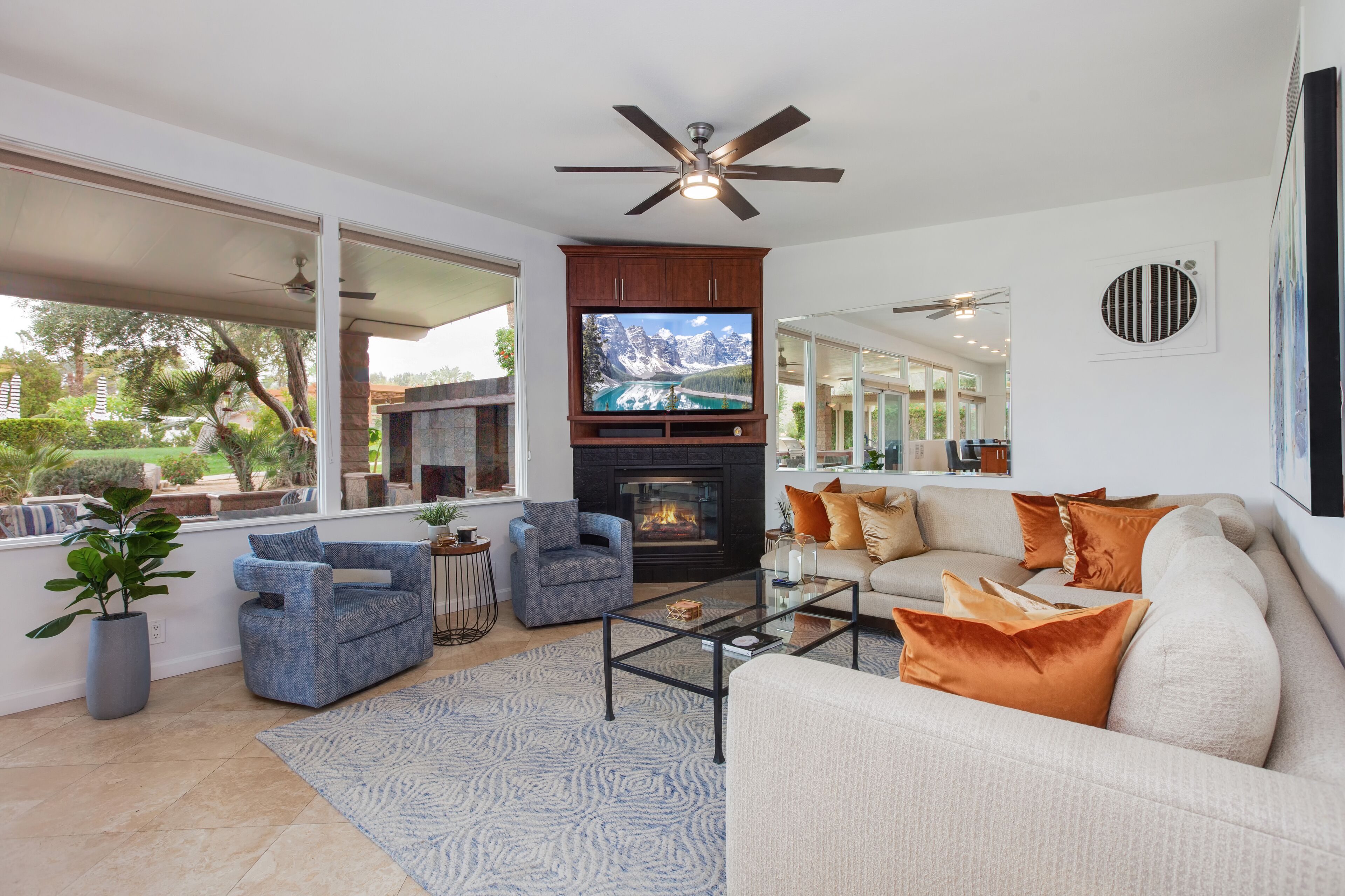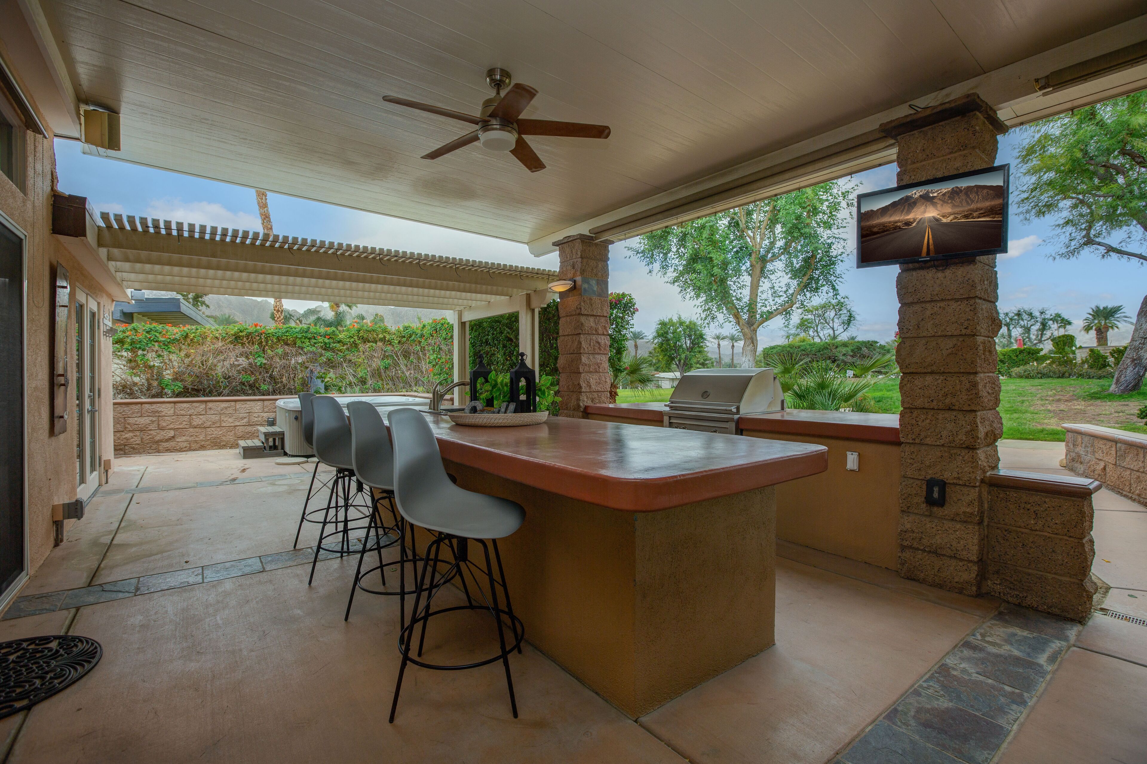 Stunning Mountain View, Entertainers Patio, Pool Your Desert Happy Place! Perfect for Coachella,Stagecoach, Polo & Tennis Tournaments. Next to the Indian Wells Golf Resort and 2 blocks from the Indian Wells Tennis Garden. Event Shuttle across the street. Open floor plan with stunning views of the Mountain ranges and pool. Outdoor bar, bbq, fireplace, water feature, dining and cozy lounge area. Close to Hwy 111, world class restaurants, golf courses,tennis, grocery stores and all other conveniences. This Desert treasure had us at Hello! For Steve and I it was love at first sight. From the unique setting of this communities 24 homes surrounding a 3+ acre green belt with a sparkling pool, Volleyball court, horseshoe pit and basketball hoop. To this single story up to date fully furnished 3 bedroom 2 bath home. The 2 bedrooms and bath located on one side of the home and the Master en suite located on the other side providing the perfect balance for privacy. The Master French doors provide direct access to a private jacuzzi. The private patio is a Entertainers Dream. Featuring a gorgeous outdoor fireplace with water feature, Cozy lounge area, fire pit, built in bar with BBQ. Outdoor dining table, private jacuzzi, Misters all surrounded by gorgeous landscape and forever views. The family room is open concept with a huge yummy couch, seating for everyone, 65 inch 4k HD smart TV, fireplace and breathtaking views overlooking the green belt and mountain ranges. The Kitchen is a chefs delight featuring a 12 foot Bar, fully stocked and equipped with state of the art appliances. Wolf stove and oven, Kitchen Aid micro/convection, Bosch dishwasher. Kitchen dining area. THE SPACE- PLEASE NOTE: POOL HEATED! Community volleyball/badminton court & horseshoe pit.- Free Wi-Fi -NEW ULTRA HD/4K SMART TVS IN EVERY ROOM! Enjoy free HBO, Netflix, Roku TV and Amazon Prime Video.Permit NO. STRU-000255-2022