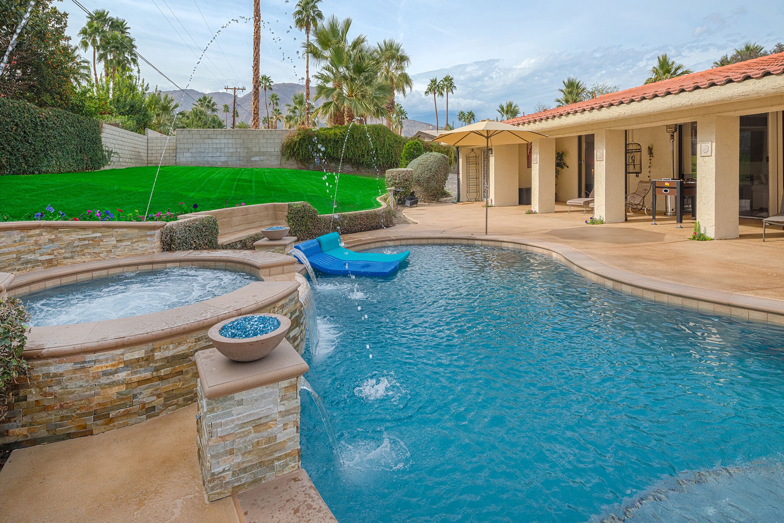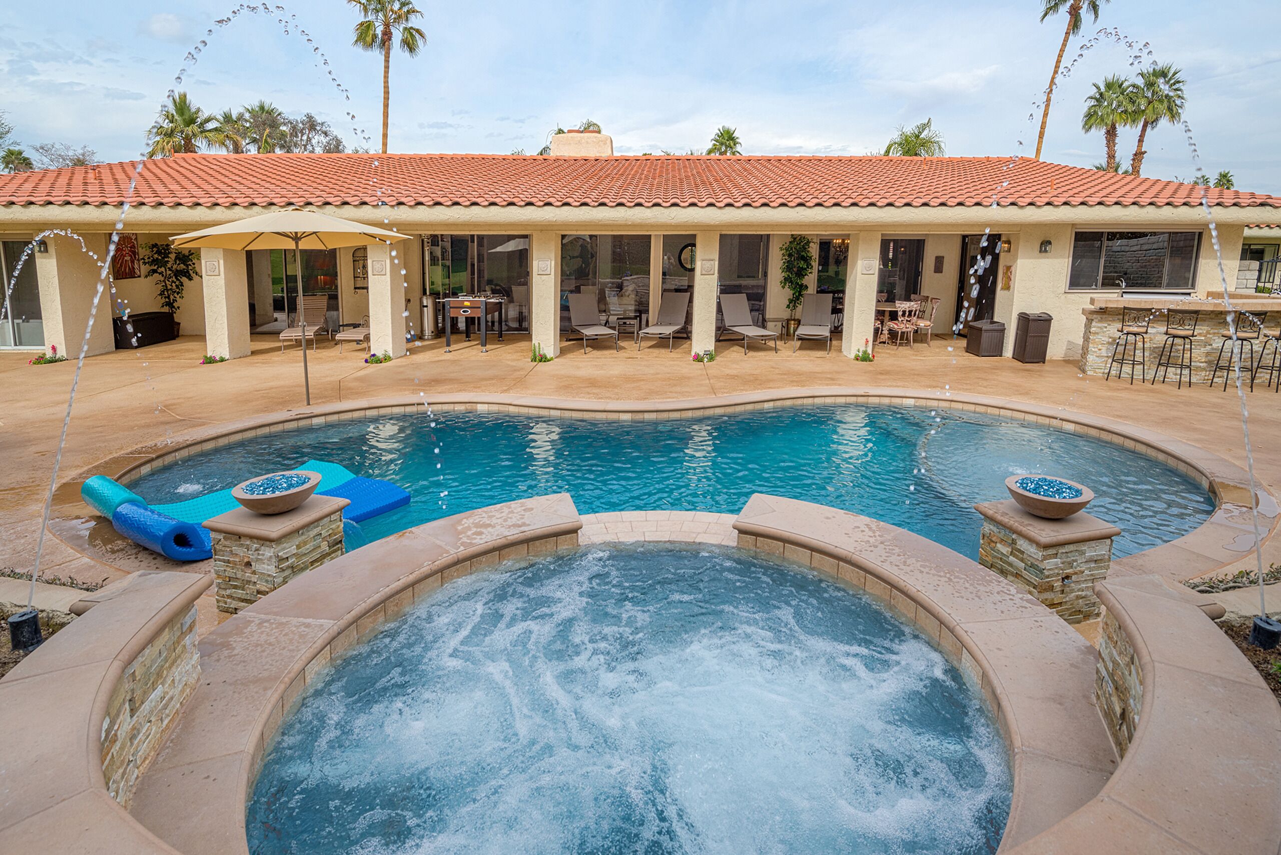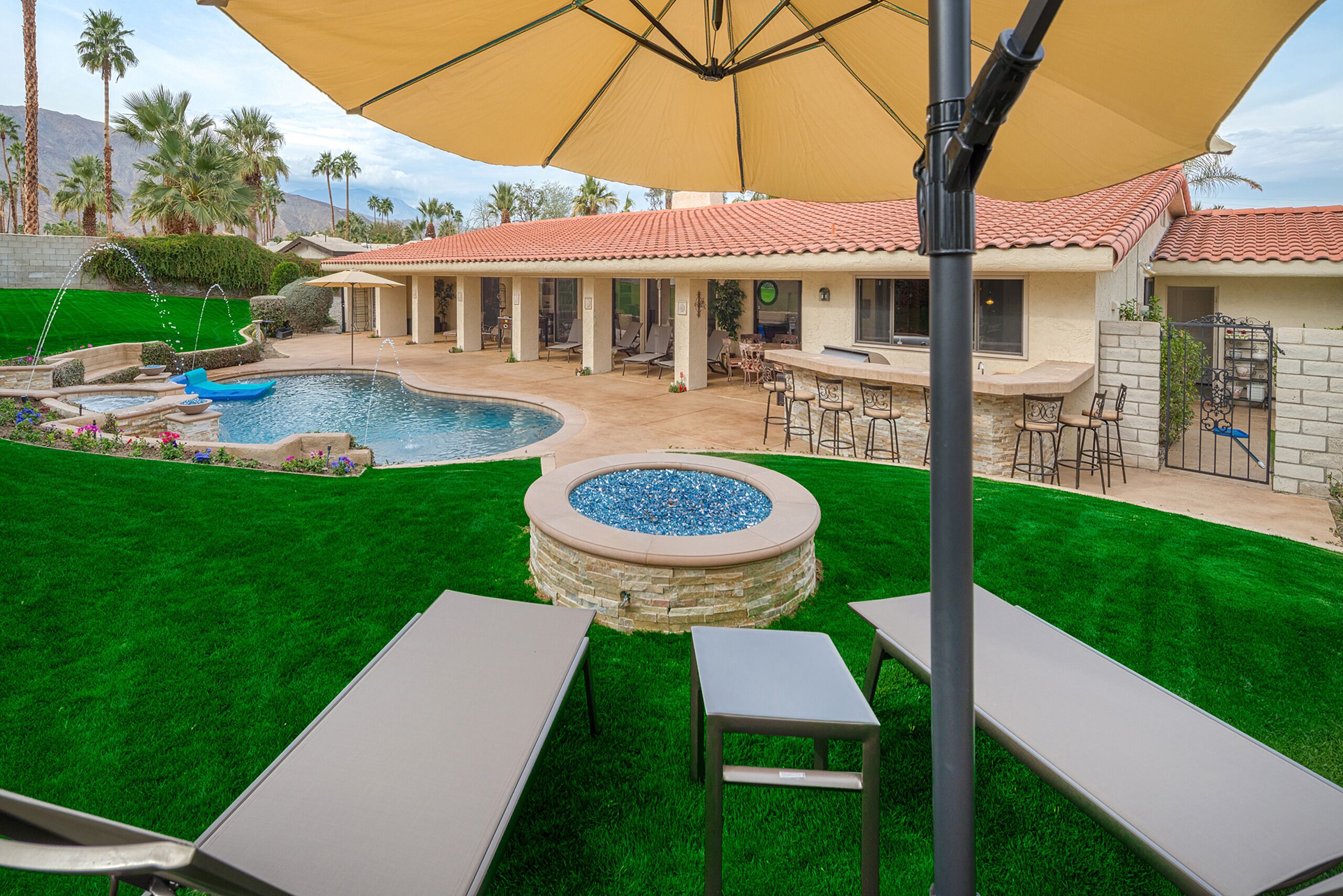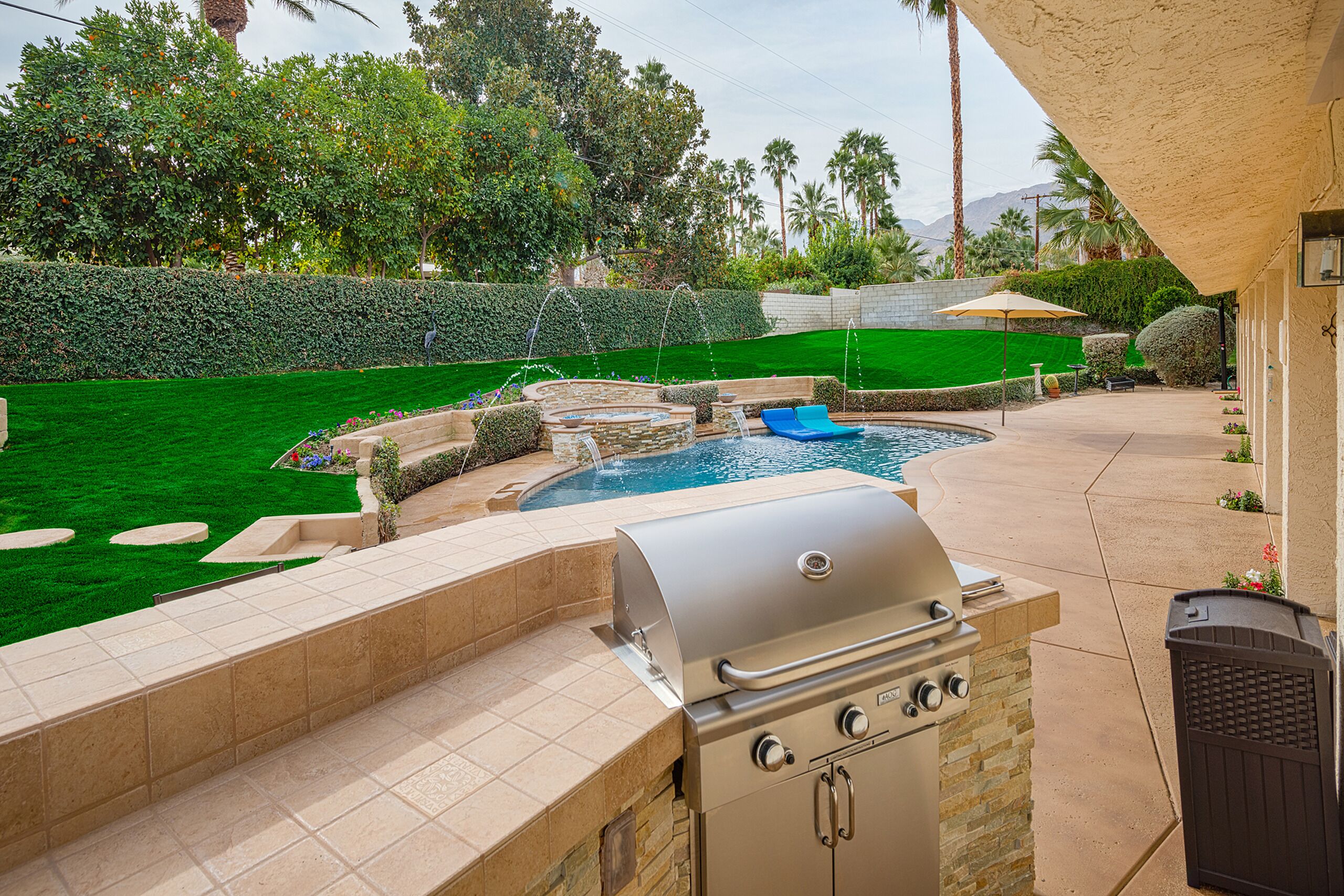 Desert Paradise Vacations - Steps to El Paseo W/ Pool, Spa, Fire Pit, Bbq *Note* This is a Fun House not a Party House. Please be respectful of our neighbors - the City of Palm Desert, Palm Springs, Rancho Mirage and La Quinta ordinances require No Outdoor Music from 10PM-10AM, No overnight parking in the street and a maximum of 2 overnight guests per room (8 for us) and they are strictly enforcing it. Any violations will potentially result in a loss of your full damage deposit plus any City fines. Have a blast but be responsible and respectful! UPDATES!!!!: THE SOFA PICTURED IS NO LONGER AT THE PROPERTY AND HAS BEEN REPLACED WITH A NEWER TAN SOFA. The property is located in the desert. It can be very hot in the desert during the summer. From May to August expect outdoor temperatures from 100-120 degrees and indoor temperatures from 75-80 degrees. The pool water temperature can also exceed 90 degrees and cannot be controlled. The rates during these periods reflect significant discounts due to the hotter temperatures. Recently upgraded with all of the entertainment features you could imagine, this spectacular single level private home in the Shadow Mountain area of south Palm Desert is your Desert Paradise Vacation. (Please note the location noted on the map is approximate and not exact for security purposes - if you go to the location noted you will not find this vacation rental)Highlights:o Steps away from the many luxurious shopping and dining options on El Paseoo Short walk to a round of golf or tennis match at the Shadow Mountain Country Clubo Newer refinished heatable pool with mini pebble finish, state-of-the-art LED colored lighting, 4 stylish streaming deck jets and 2 fire pillarso Newer constructed in ground spa with cascading water fall and resort quality 8 jet configuration w 2 dedicated pumps to ensure just the right amount of pressureo Newer constructed fire pit with fire glass, spacious lawn, and mountain and starlight viewso Newer constructed outdoor BBQ with built-in 36” AOG by Firemagic grill, side burner, sink, cabinet, drawers and surrounding raised countertop with seating for up to 8 o Outdoor dining table seating up to 6, newer commercial grade misting system, and 2 newer large patio heaters for evening diningo Newer Brunswick pool tableo Home Theatre and Outdoor Speakers have been taken out of service because no one can understand how to use them. : ) We have an outdoor bluetooth speaker you can connect to or feel free to bring your own. o Home office with docking station and laser printer/fax/copier/scanner Other Features of this spectactular property include: Expansive and Charming Living and Dining Area with:o 52” HD flat screen TVo Multi room DVR, Blu Ray Player, CD/DVD changer, and Iphone dock. o Programming provided by Spectrum, and includes HD programming, over 300 channels of live TV, over 4,000 On Demand programs, and Music Choice. HBO, Showtime, TMC, Starz, Cinemax, and TWC Sports Pass available upon request for an additional fee. o Newer 8 foot Brunswick pool tableo Wall-to-wall sliding glass doors, vaulted ceilings, 2 ceiling fans, Spanish saltino tile floors and a full view of the beautiful new pool and spao Casual living area where you can chat, enjoy some cocktails or appetizers, or curl up next to the newly upgraded fireglass fireplaceo Charming large bookcase filled with hundreds of fiction and nonfiction books designed to not only enlighten but entertaino Extendable dining table ready to serve 6-8 hungry guests Cozy Kitchen o Wooden floors, 4 burner gas stovetop, refrigerator, dishwasher, microwave, 13” flat screen TVo Breakfast table that seats up to 4 and overlooks the pretty grass side yardo Mini bar Luxurious Master Bedroom and Full Batho California King bed, vaulted ceilings, ceiling fan, huge walk in closeto 40 inch flat screen HD TV, blu ray player, digital cable boxo Bathroom has a mountain view, dual vanities, exquisite wooden cabinets, and a romantic sunken whirlpool tub w 8 jetso Sliding glass doors open directly to the spectacular outdoor entertainment center 3 Additional Classy Guest Bedrooms and 2 Full Bathso Second bedroom featuring two extra long twin beds that can be connected to create a King bed, and private bathroom with combination tub/showero Third bedroom features a Queen bed, large walk in closet and Jack-and-Jill bathroom shared with the fourth bedroom and includes a combination tub/shower o Fourth bedroom is a combination den/home office/bedroom and includes a Queen-size bed o All guest rooms include a flat screen HD TV (32”-36”), DVD player, digital cable box, landline phone, and ceiling fan Den/Home Officeo Integrated into one of the guest bedrooms and includes a wooden desk, laptop USB docking station, dual monitors, newer Dell all-in one color laser printer w copy/fax/scan capabilities and print speeds up to 24PPM Sweeping Driveway and 2 Car Garage o Stylish epoxy flooring, automatic opener, and view of grass yard and fruit trees Additional Features:o Full size washing machine/dryer o Poker table cover, assortment of board and card games, croquet and horse shoe seto Baby friendly with locking cabinets upon request and a removable 5 foot tall self-closing gate which can be added around the pool and spao Standard baby crib, optional side bed rails, and step stoolso A removable assist rail is available for the entrance into the poolo Permanently fixed assist rails are installed in the second bedroom toilet and tub and master bedroom toilet.Pet Notice: Unfortunately no cats are allowed due to owner allergies and challenges with scratching things. Also due to insurance restrictions we cannot accept the following dog breeds: Pure or mixed breed or pure or mixed type of dogs including (1) any pit bull type of dog (which may be known as American Pit Bull Terrier, American Staffordshire Terrier, Staffordshire Bull Terrier, Bull Terrier, Miniature Bull Terrier, American Bulldog, Dogo Argentino, or Alpha Blue Bulldog; (