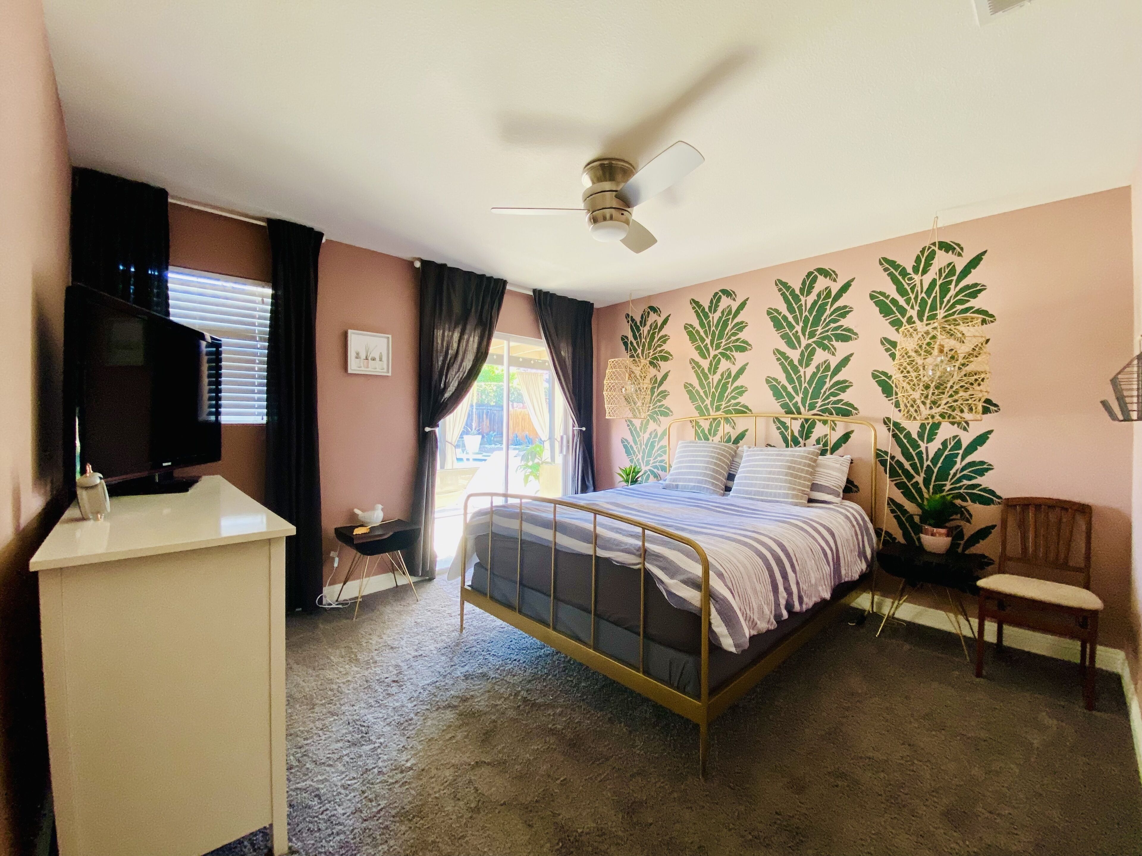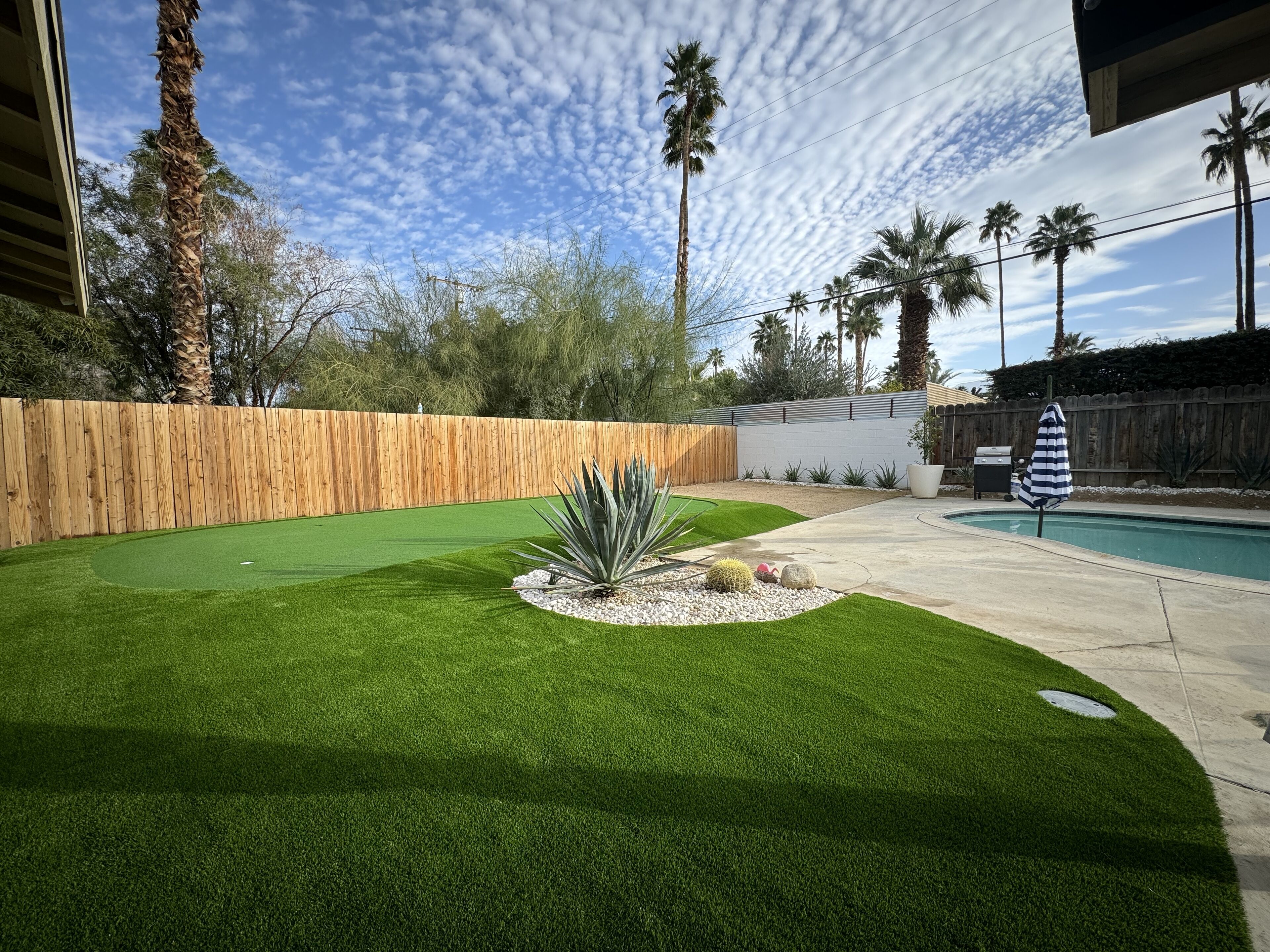 Desert Golf Retreat - Private Putting Green, Pool, Universal Tesla EV Charger The perfect blend of greenery and serenity. Indulge in a desert golf lifestyle with a full private putting green and pool. This golf retreat home is located a short drive to world class golf courses and the BNP Paribas Open, walking distance to premium shopping and dining on El Paseo, and near Coachella & Stagecoach shuttle lines. The backyard features mountain views, unforgettable sunsets, and the occasional shooting star while stargazing.After a round or two of golf, unwind in the backyard in the pool (not heated) or inside the comfort of home with a reliable solar powered HVAC system for interior heating & cooling year round. The two car garage features a Universal Tesla EV Charger. Goodbye range anxiety! Speedy WIFI for remote working and streaming.By booking this space, Guest and Entire Party agree to hold harmless property owner from all damages and injuries arising from or related to Guest’s stay at the property29 days minimum rental.