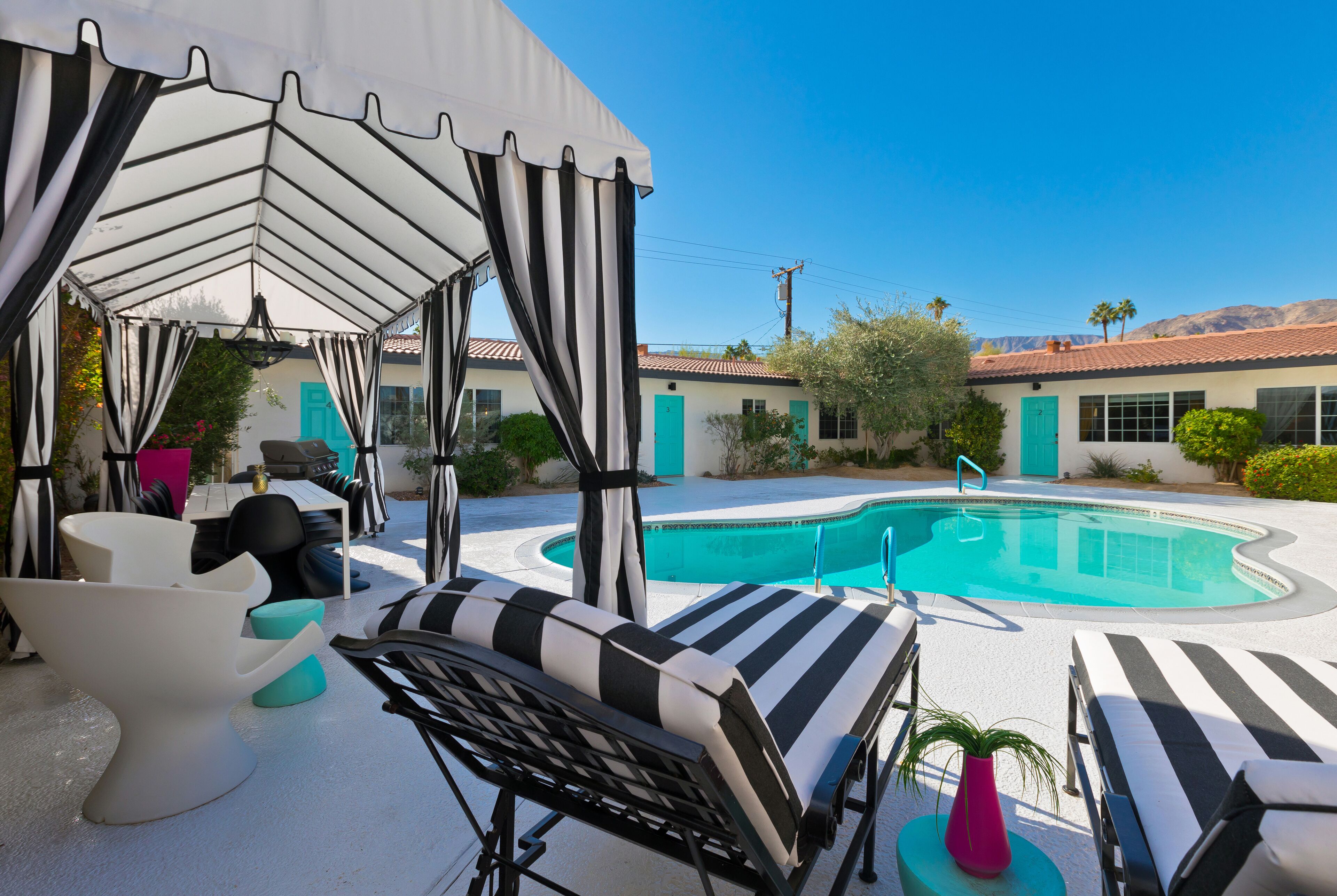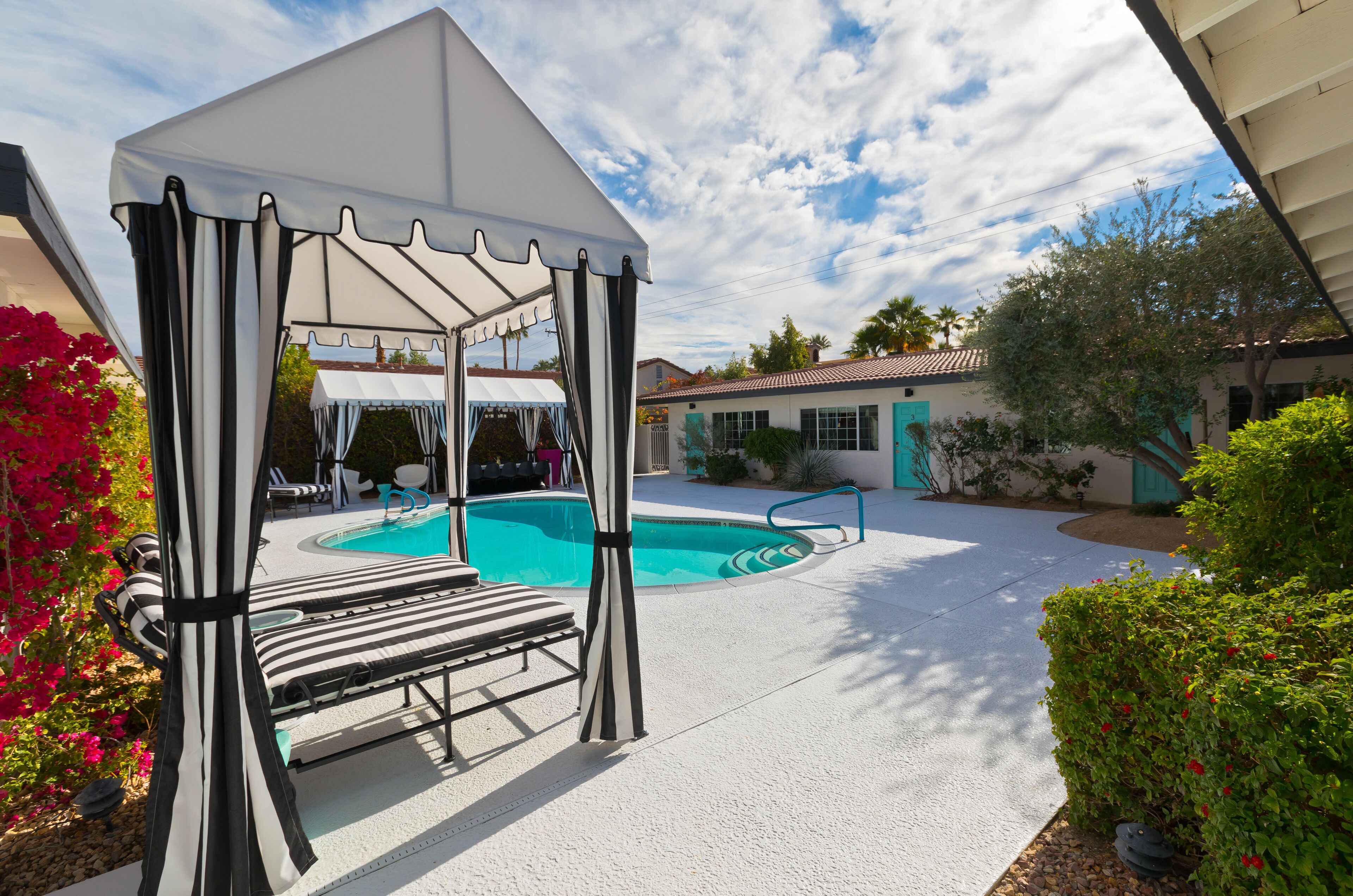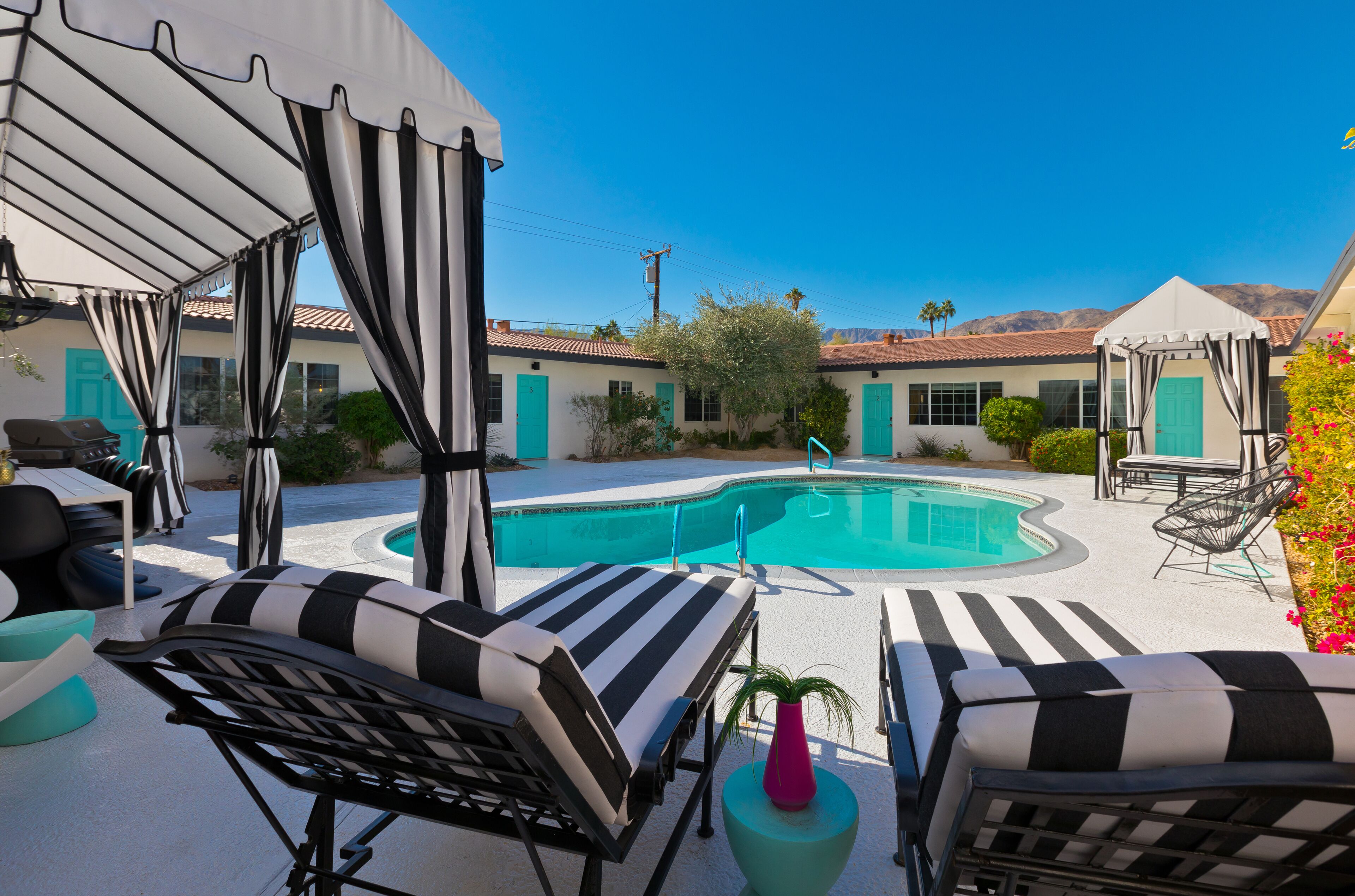 Luxury Private Resort - 1 Block to El Paseo! Sleeps 12! Love boutique hotels, but hate what happens once they're discovered? Here's the ideal hideaway for you. Designed for large group stays, we have three completely new, bungalow style units (6 bedrooms/6 baths) that offer a fun, Cali boho style. Three separate casitas within the walled grounds feature a large pool, elegant cabanas, Bocce Ball co...