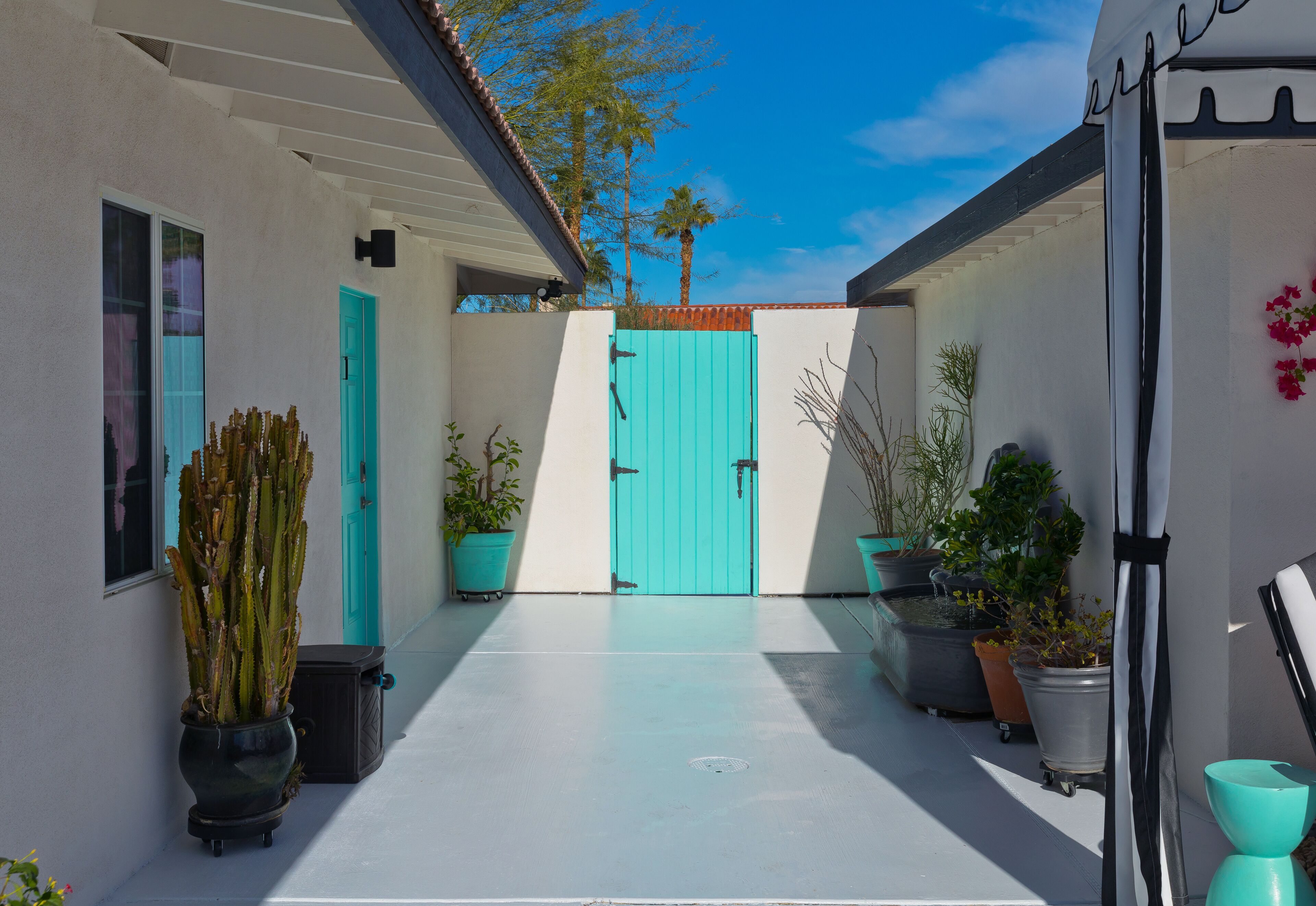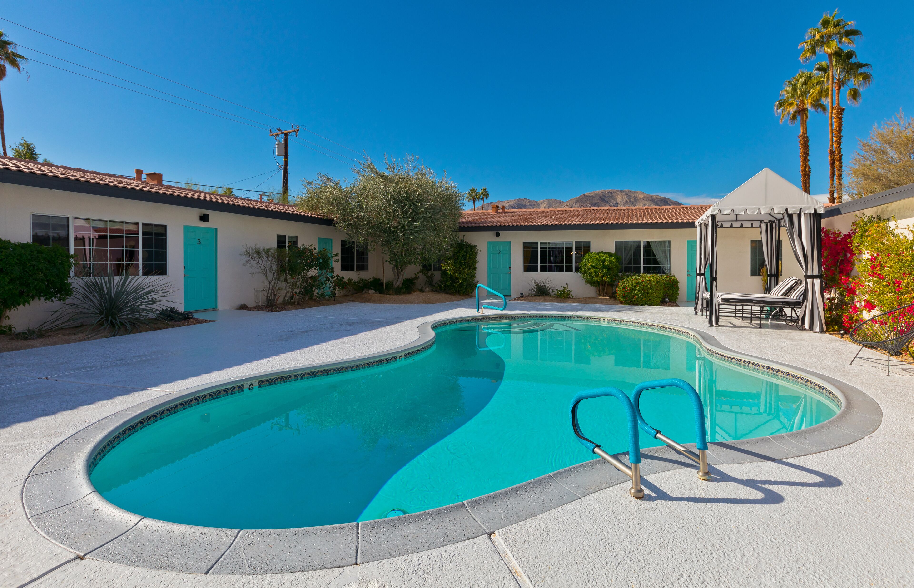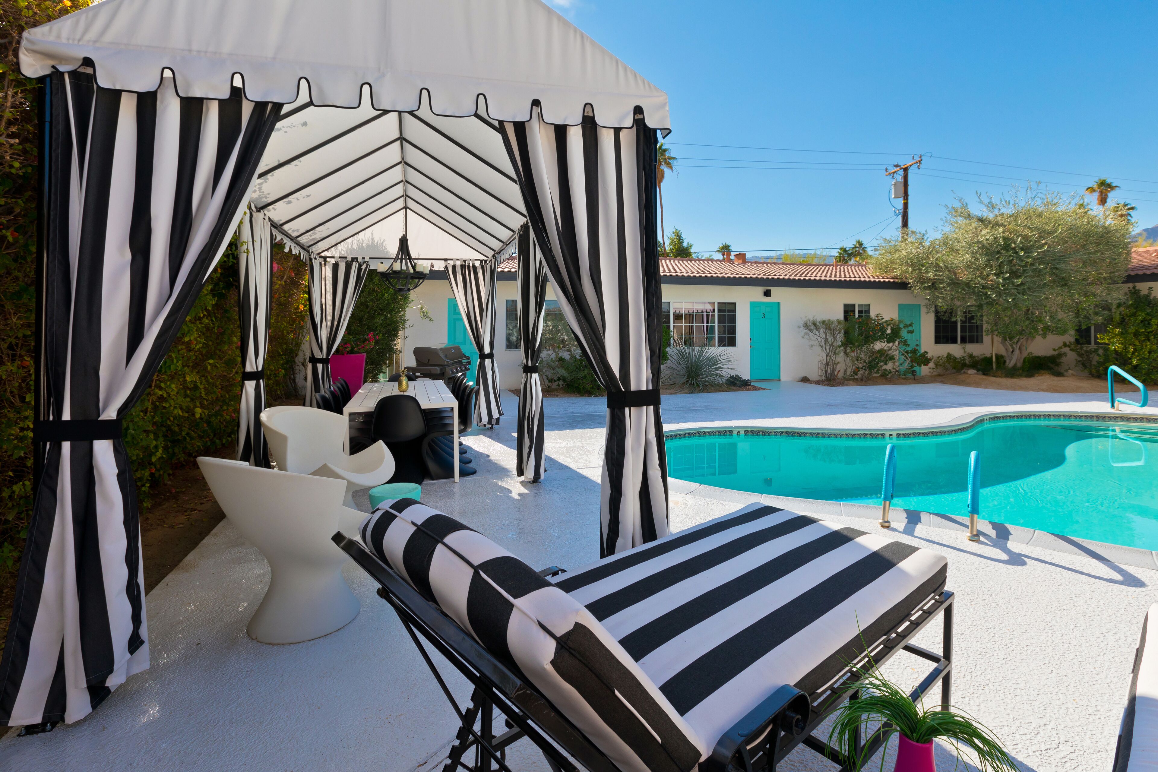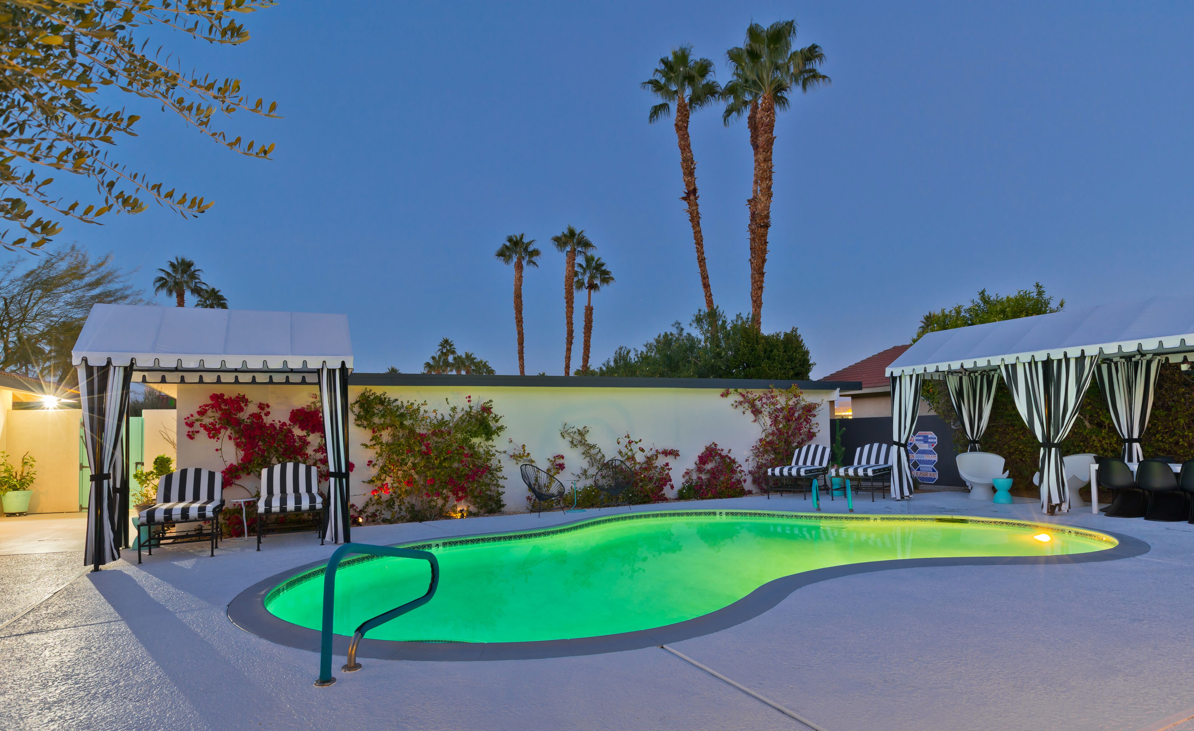 Luxury Private Resort - 1 Block to El Paseo! Sleeps 12! Love boutique hotels, but hate what happens once they're discovered? Here's the ideal hideaway for you. Designed for large group stays, we have three completely new, bungalow style units (6 bedrooms/6 baths) that offer a fun, Cali boho style. Three separate casitas within the walled grounds feature a large pool, elegant cabanas, Bocce Ball co...